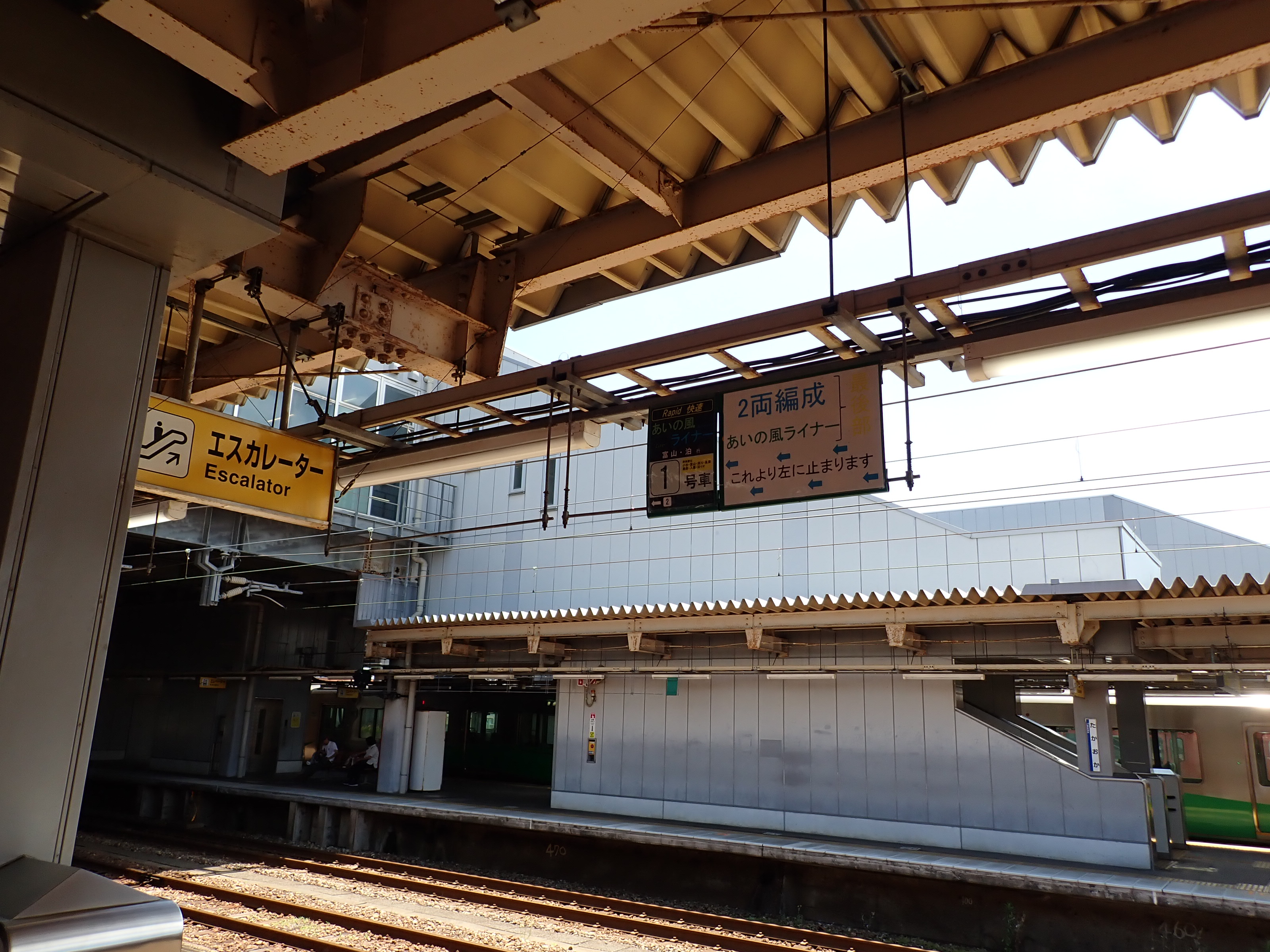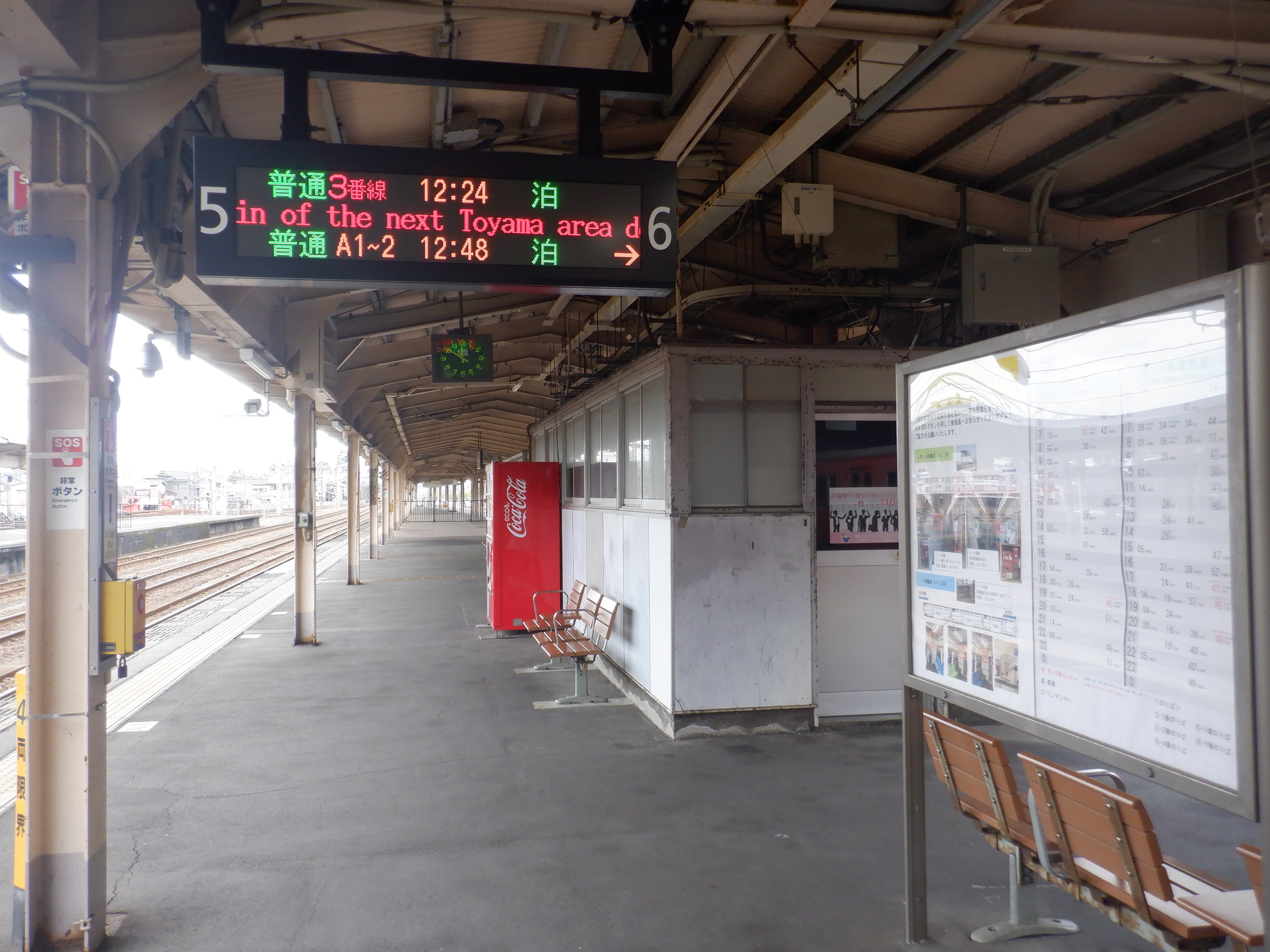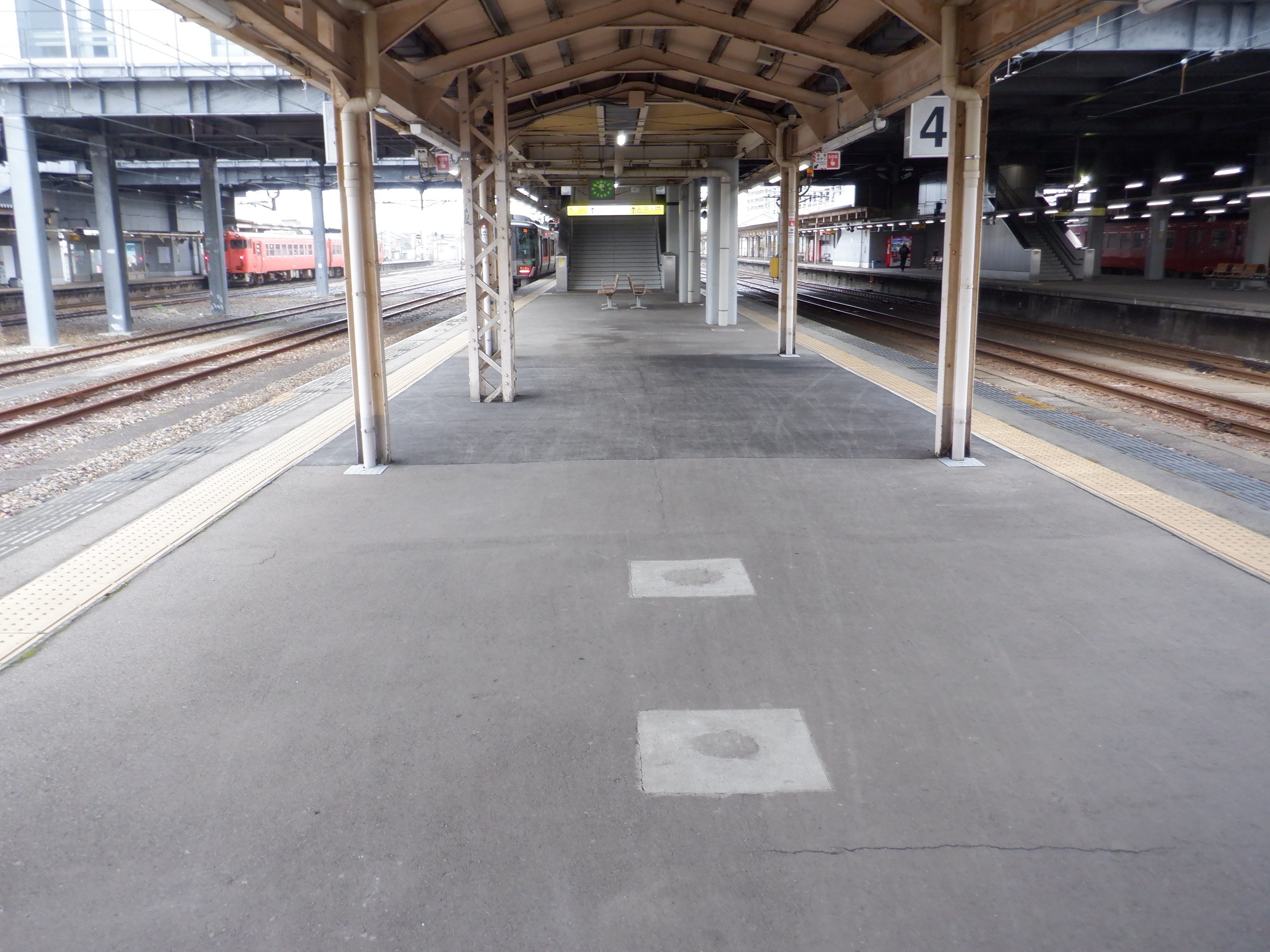 3・4番のりばの越中大門駅側。ホーム面に何か印がありますが、特段このあと何もなかったようです。