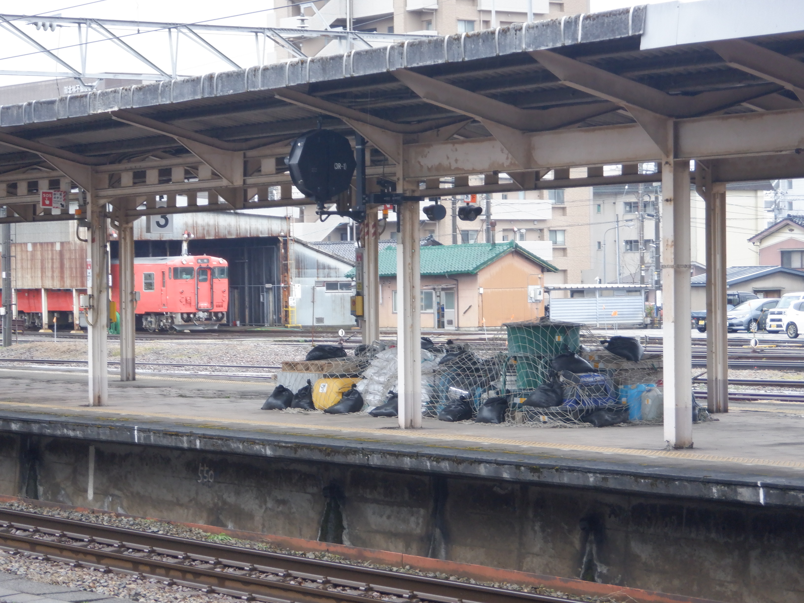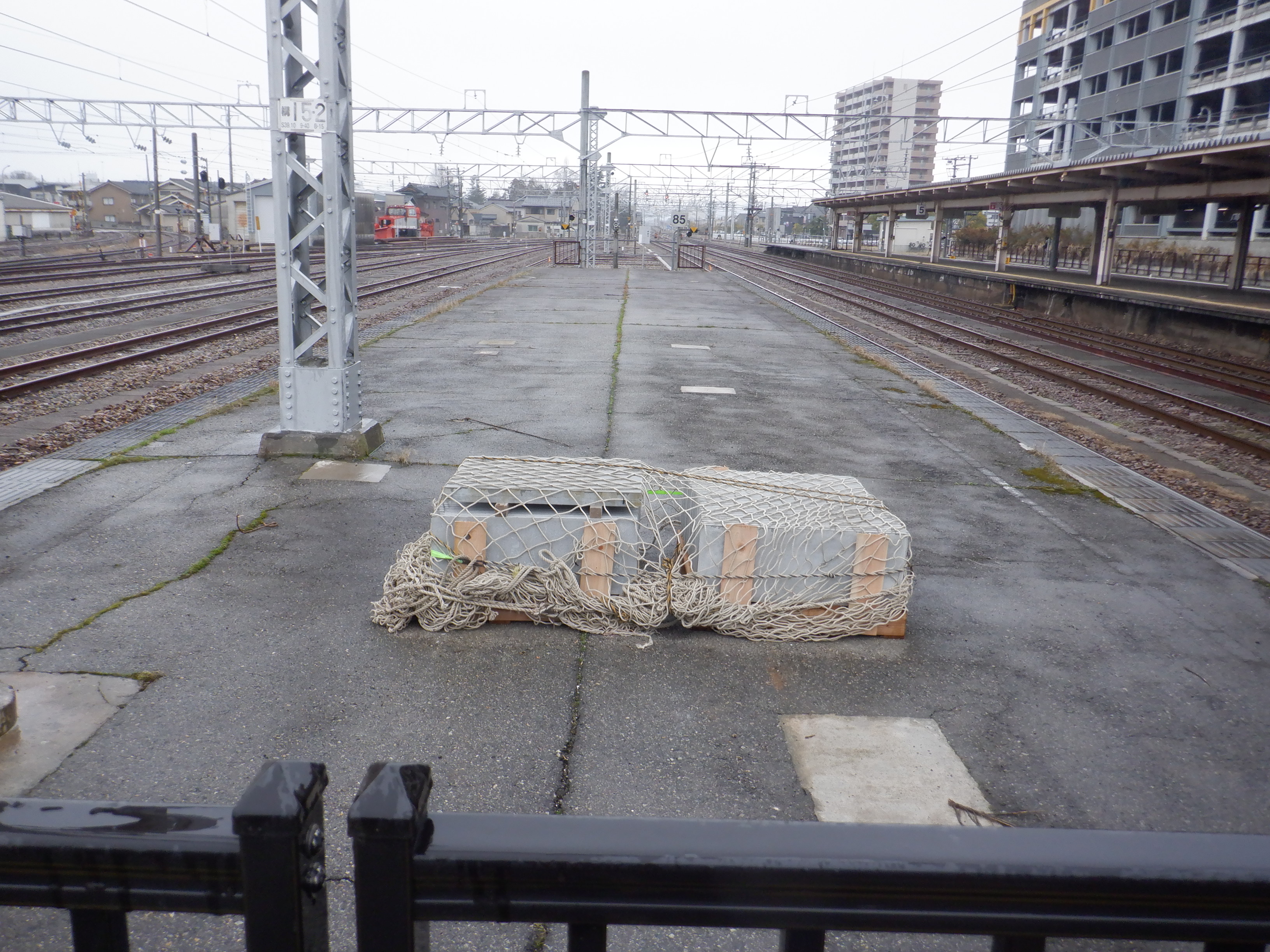 3・4番のりばの柵より高岡やぶなみ駅側。こちらにも資材が置かれています。