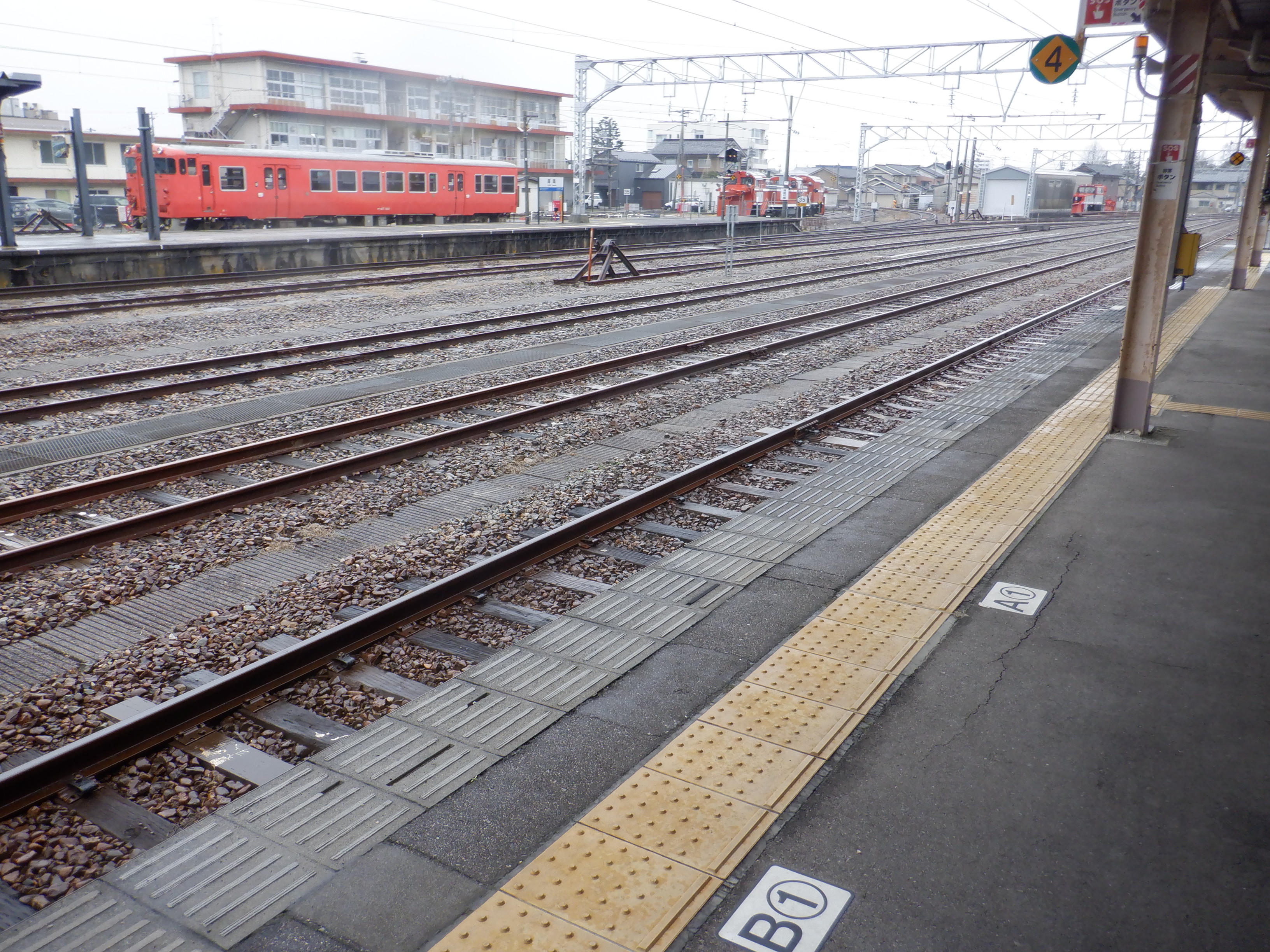 前回見ていた4番のりばの線路側(縁部)の工事は、越中大門側、4両編成の最後尾のもう少し後ろまで達していました。