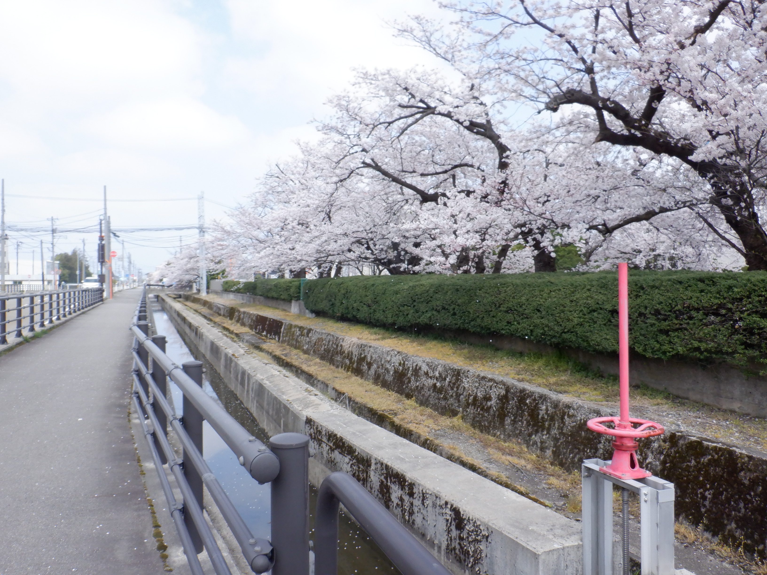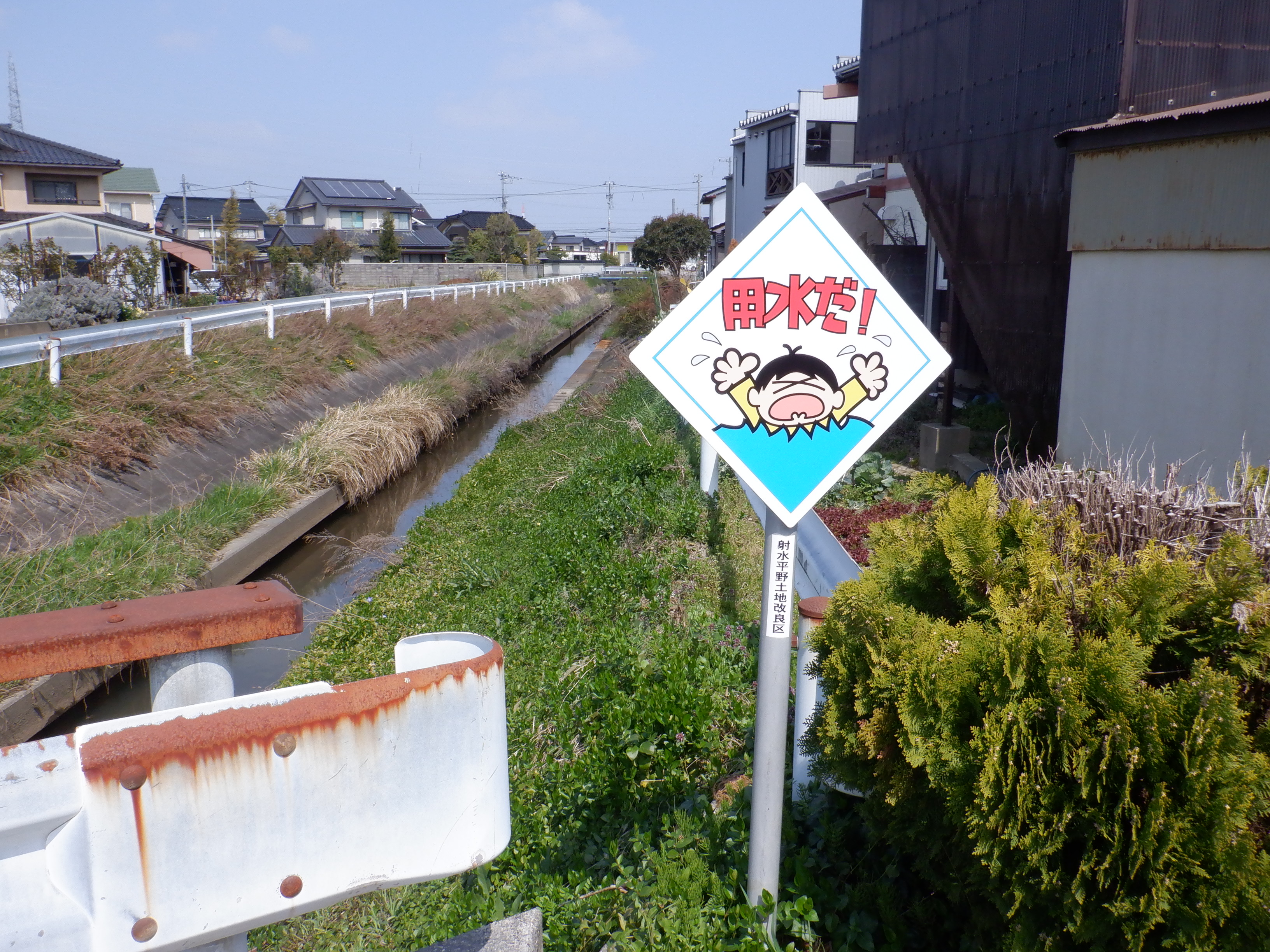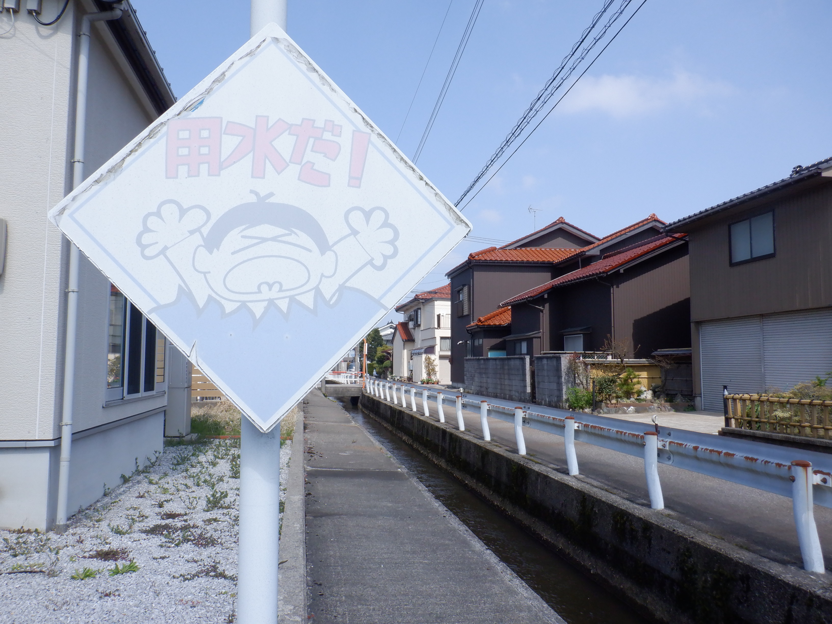 踏切を渡ってしばらく進んだところにも「用水だ!」の看板があります。