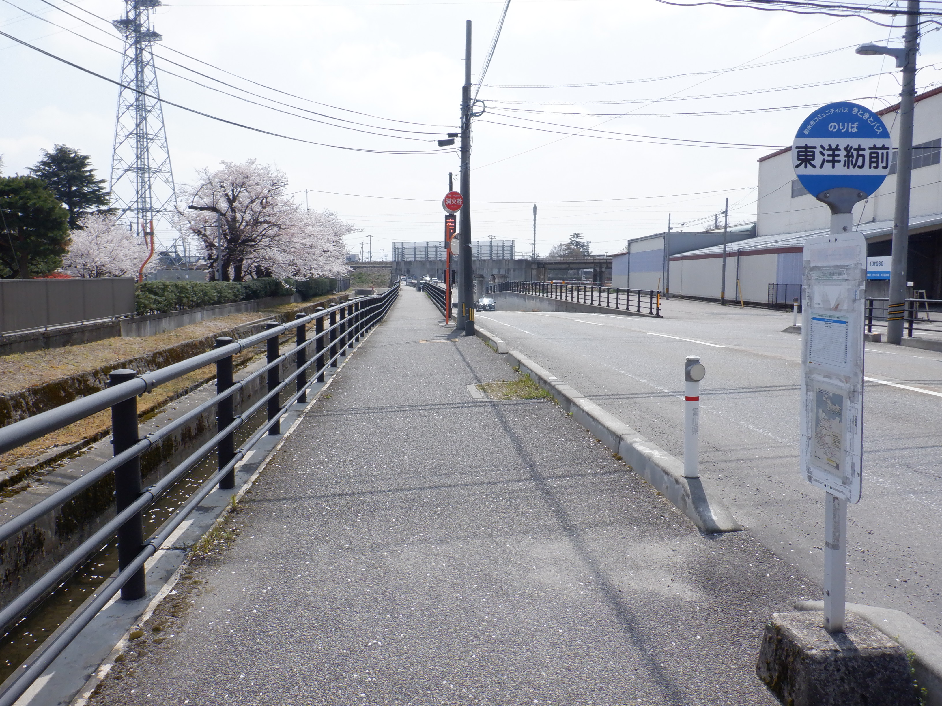 線路の下をくぐり、東洋紡の工場のまわりの桜を見ながら歩きます。