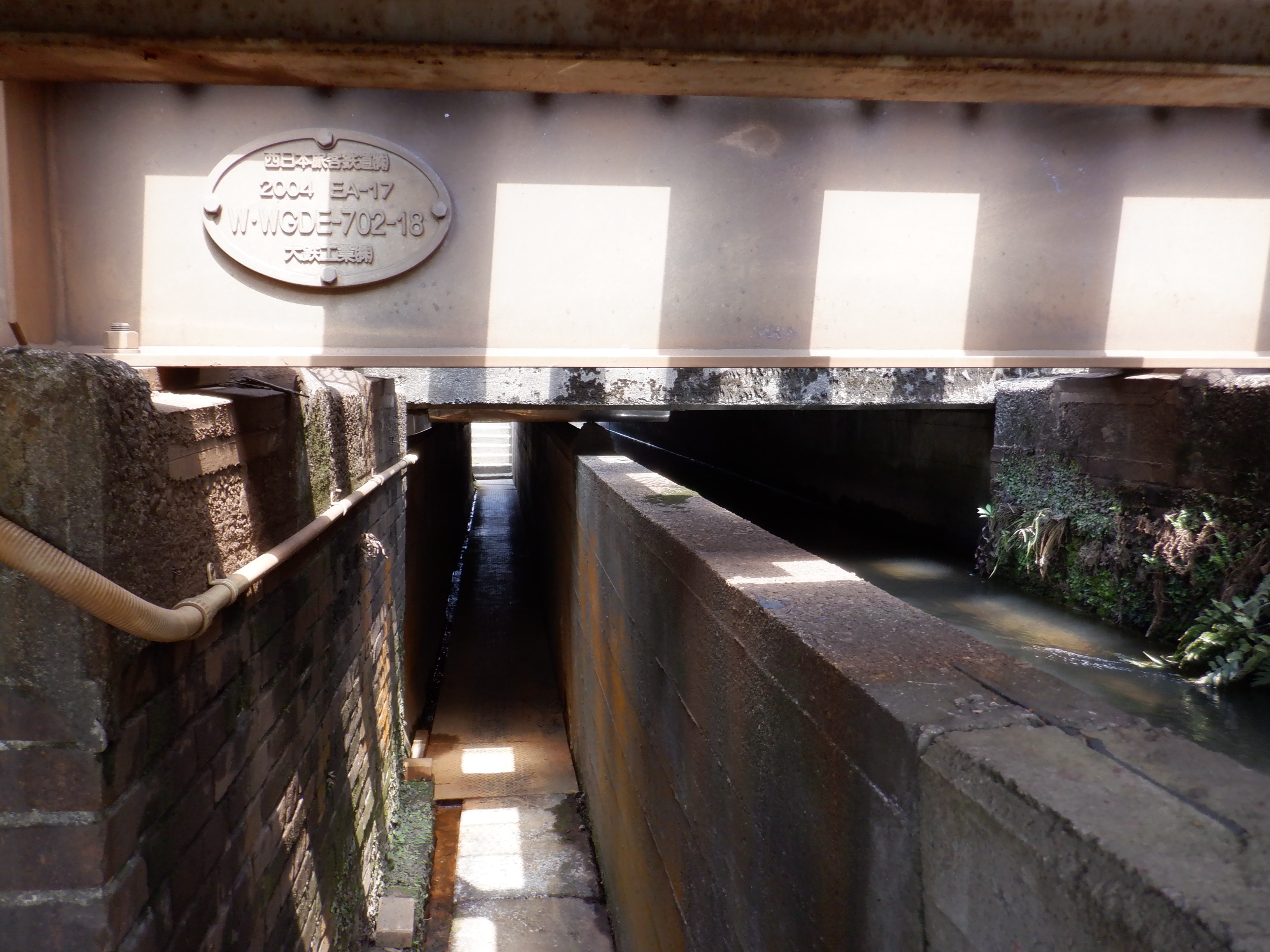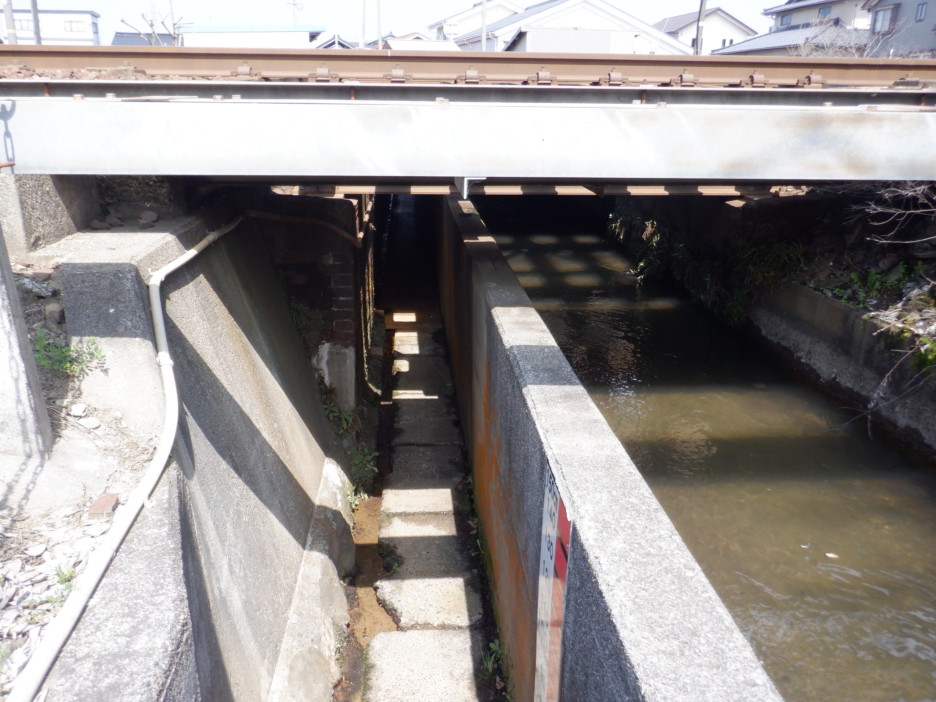 しばらく進むと線路の下を用水と一緒にくぐるところがあります。両側に独特な表式があります。