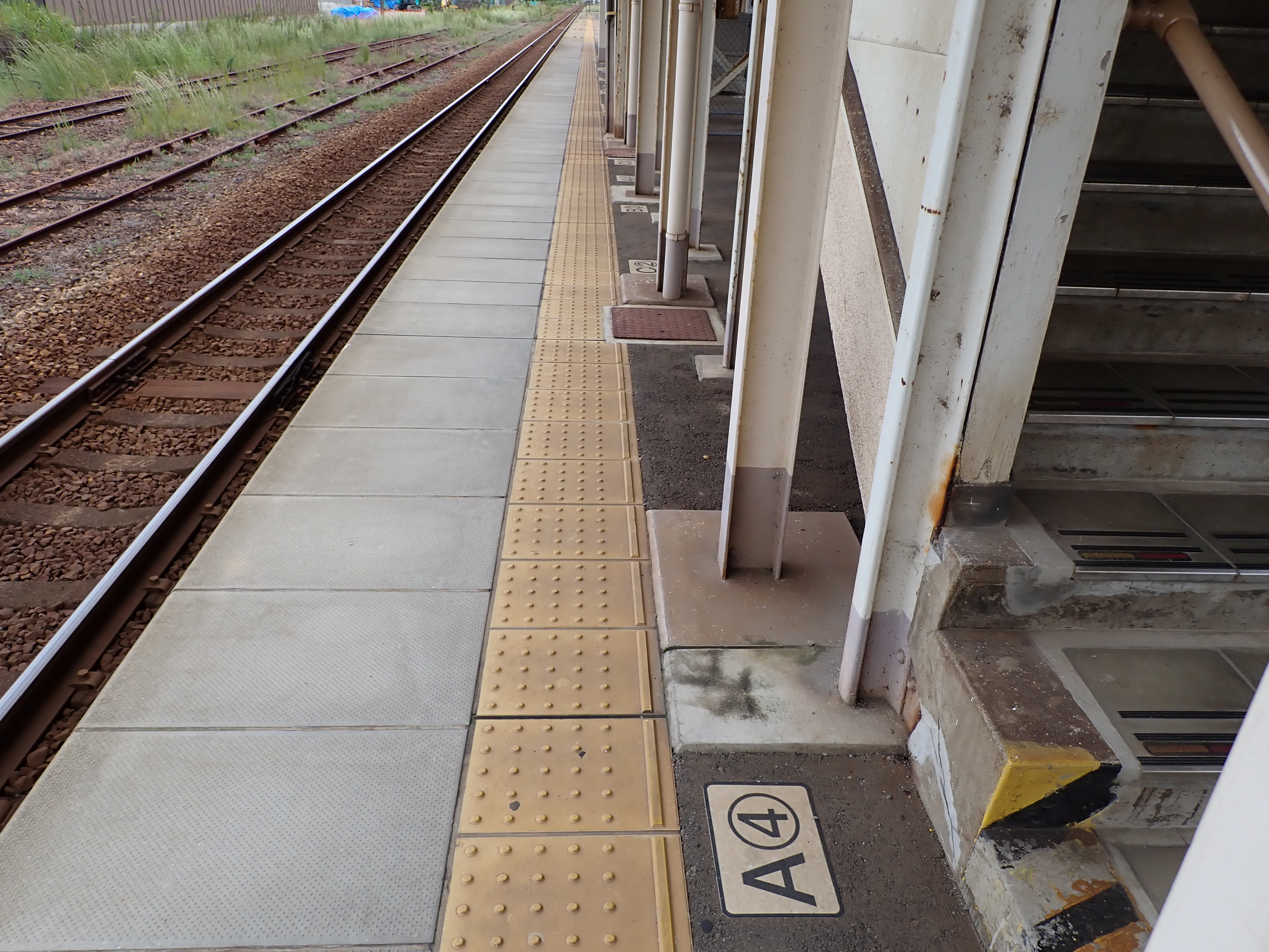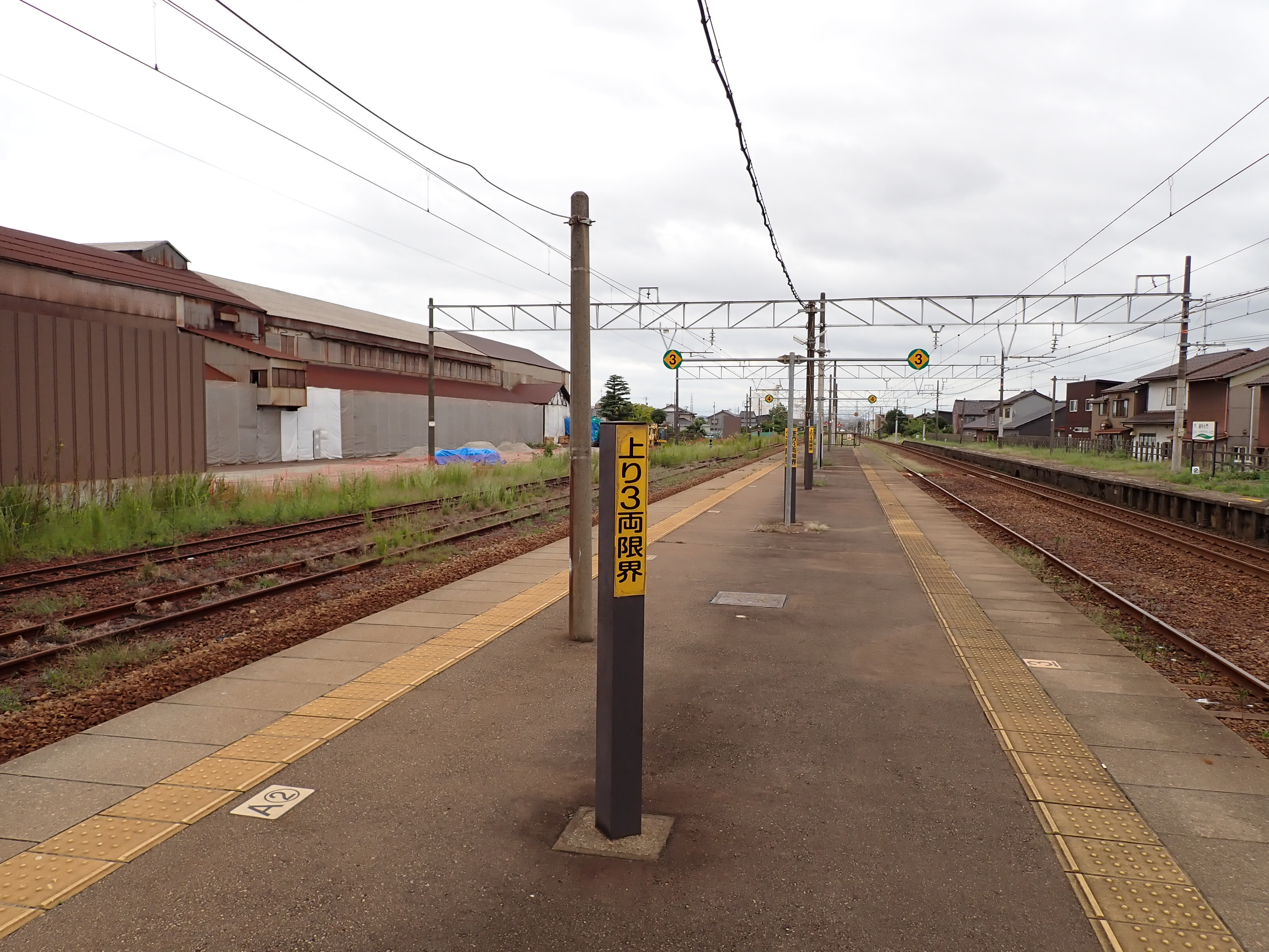 3番のりばの高岡駅側。2両編成の最後尾の方が4両編成の最後尾よりも高岡駅側にあります。また、2両と4両でドアの位置が異なるためCの乗車位置が存在します。