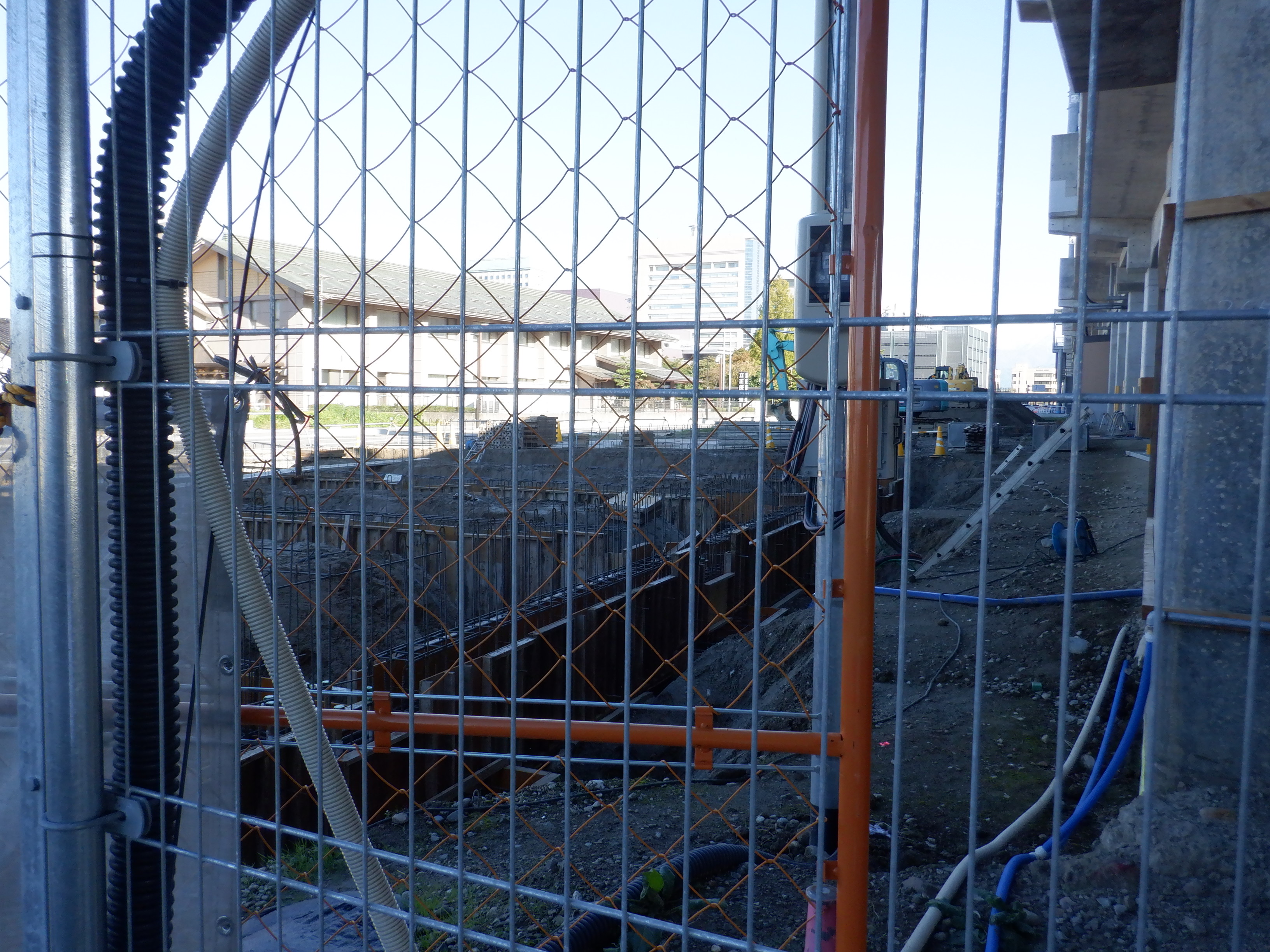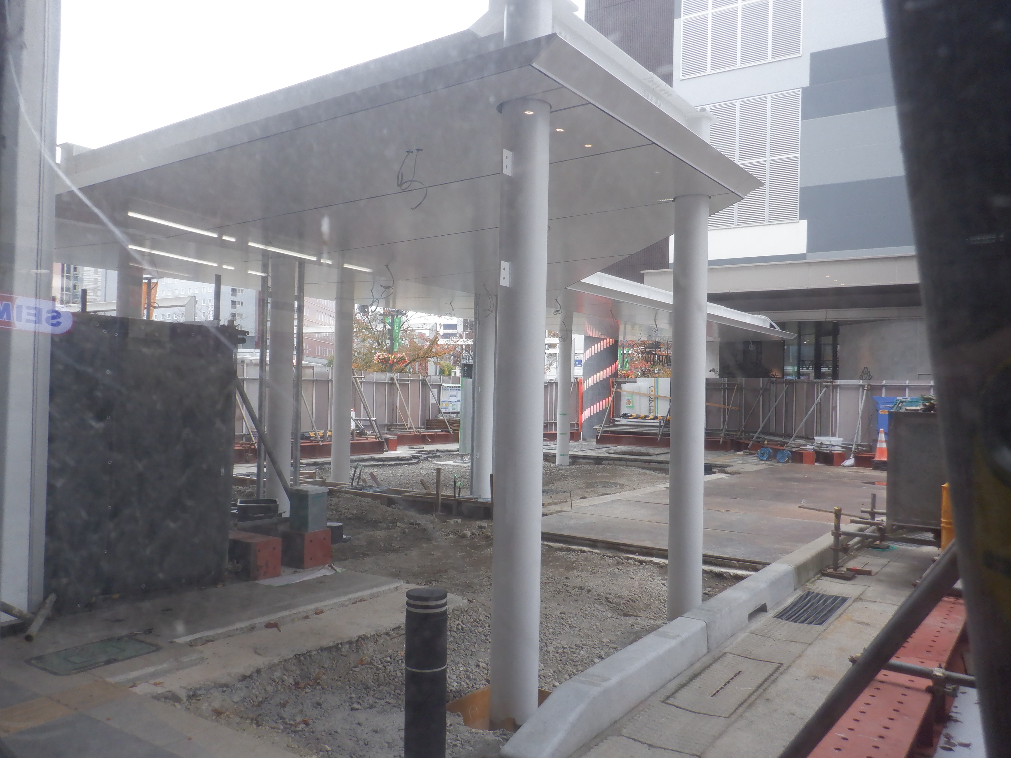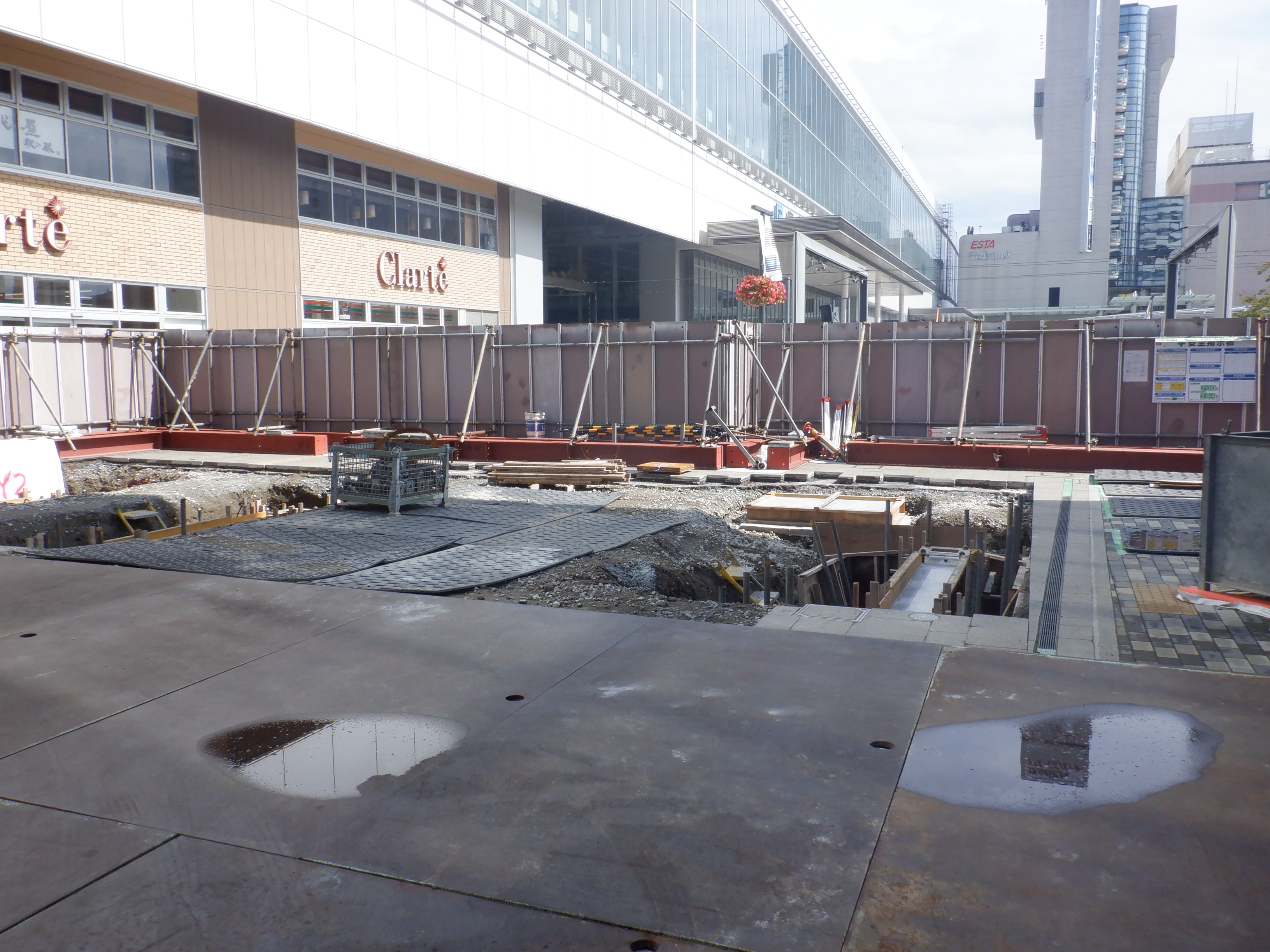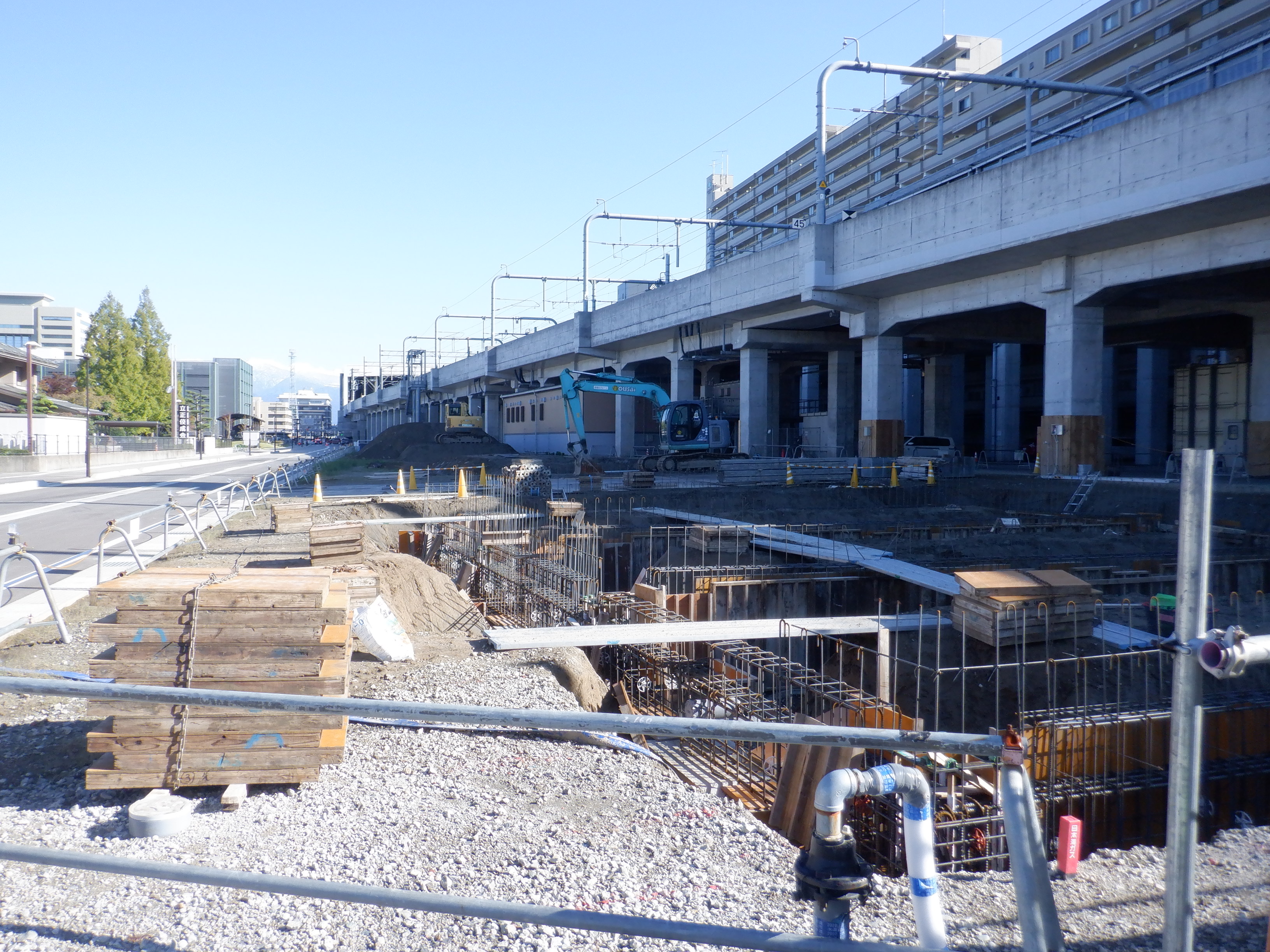 東口とマルートとの間のシェルター建設中のところは支柱の基礎の工事が行われていました。また、商業施設のところも建設が始まっています。