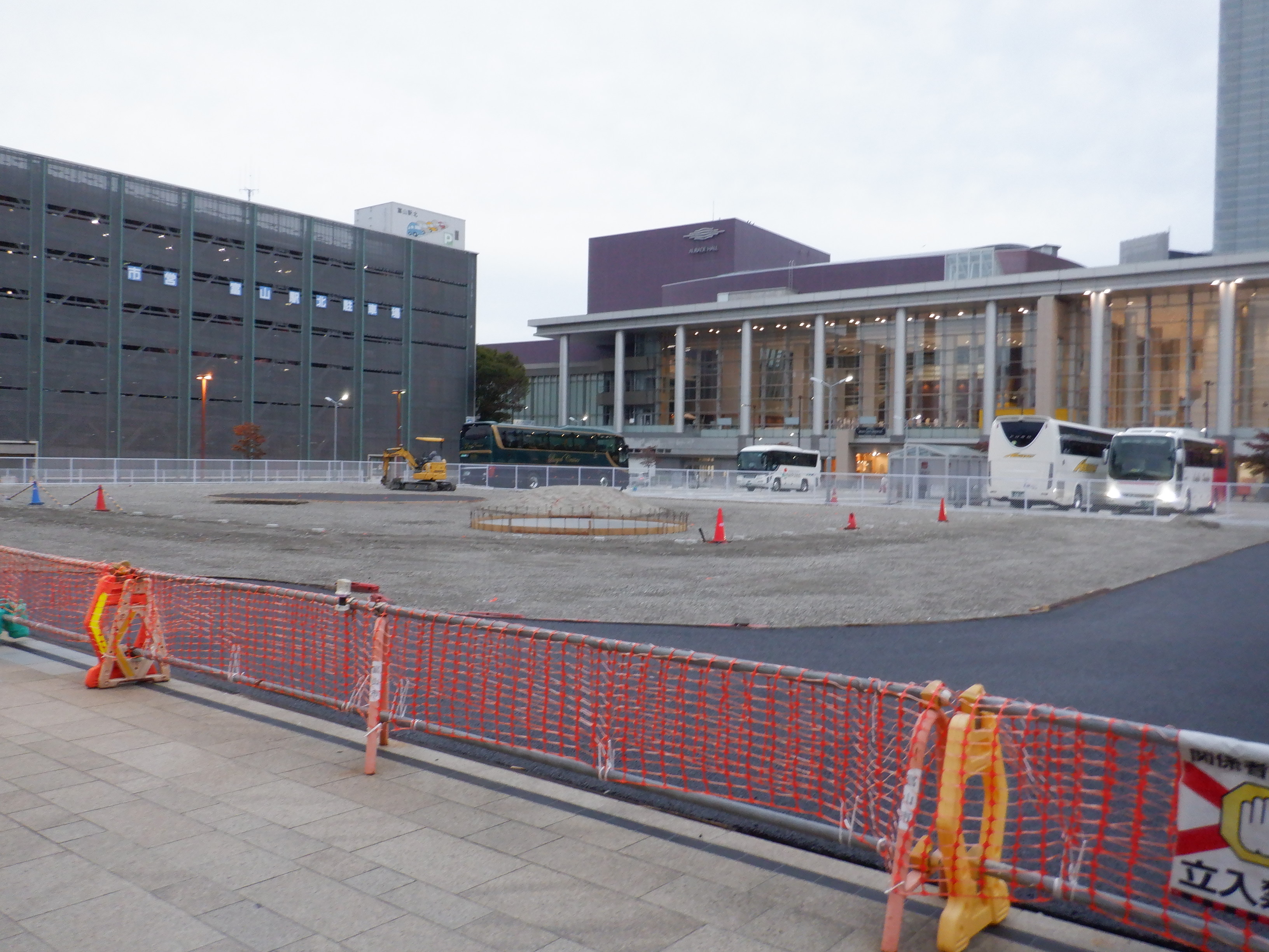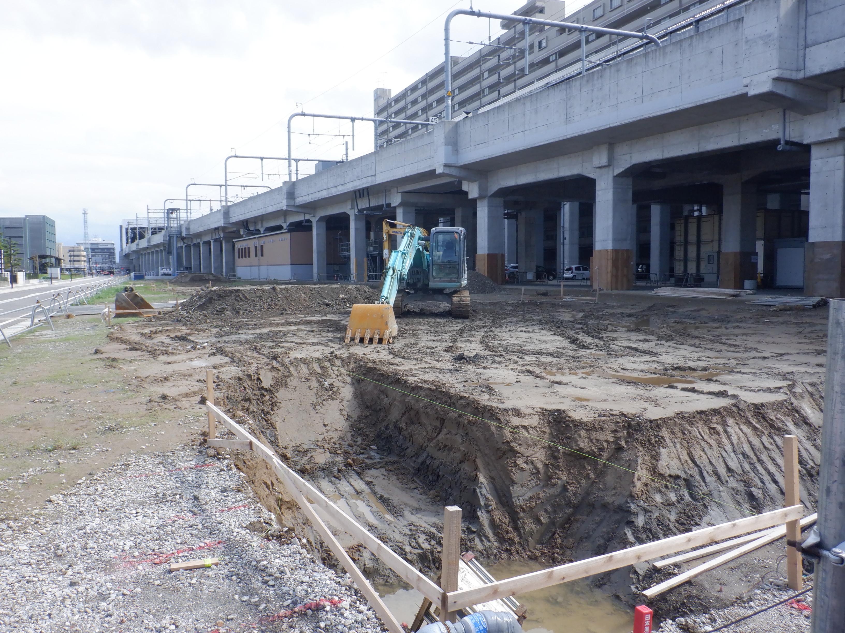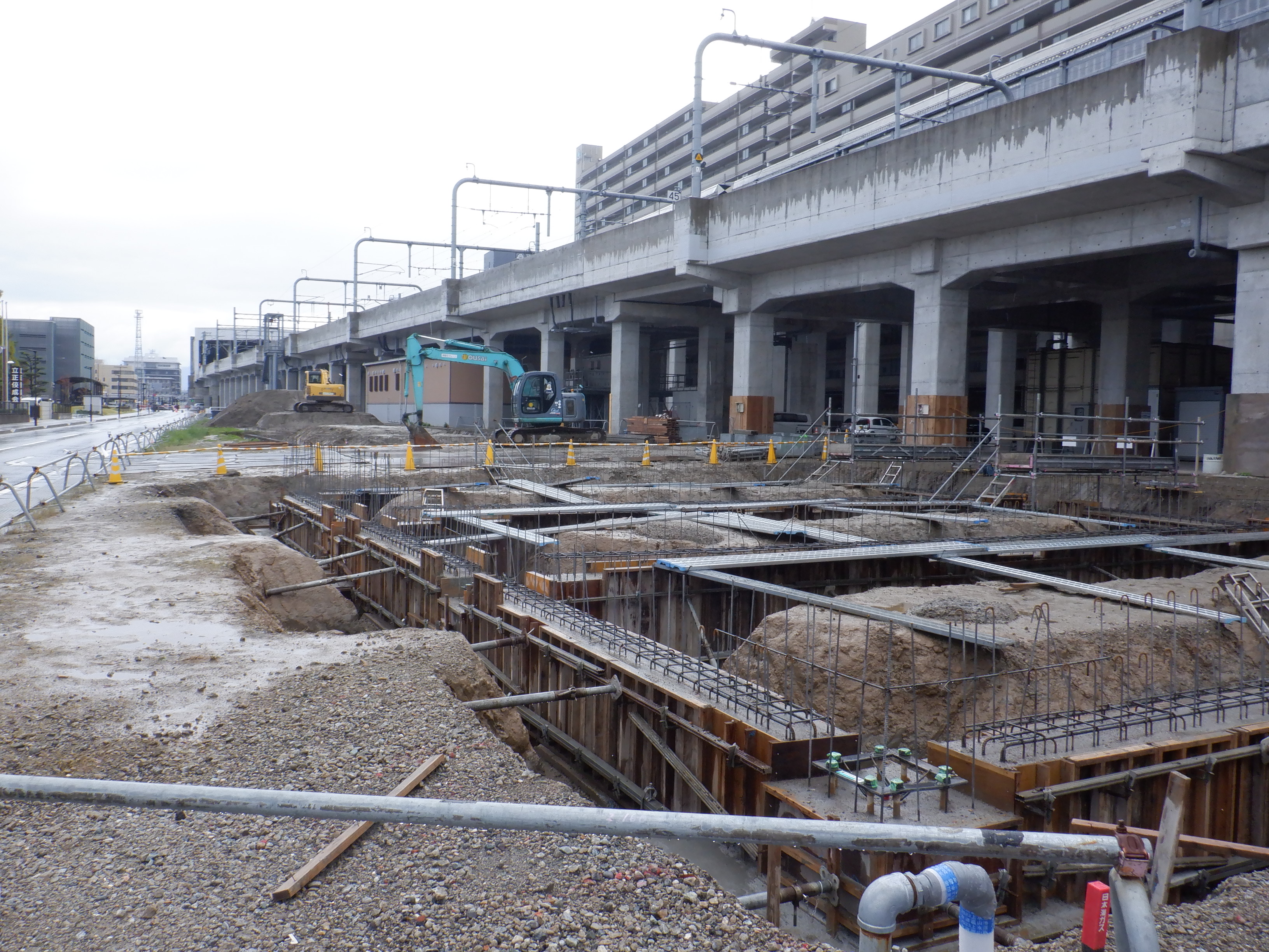 東口とマルートとの間のシェルター建設中のところは支柱の基礎の工事が行われていました。また、商業施設のところも建設が始まっています。