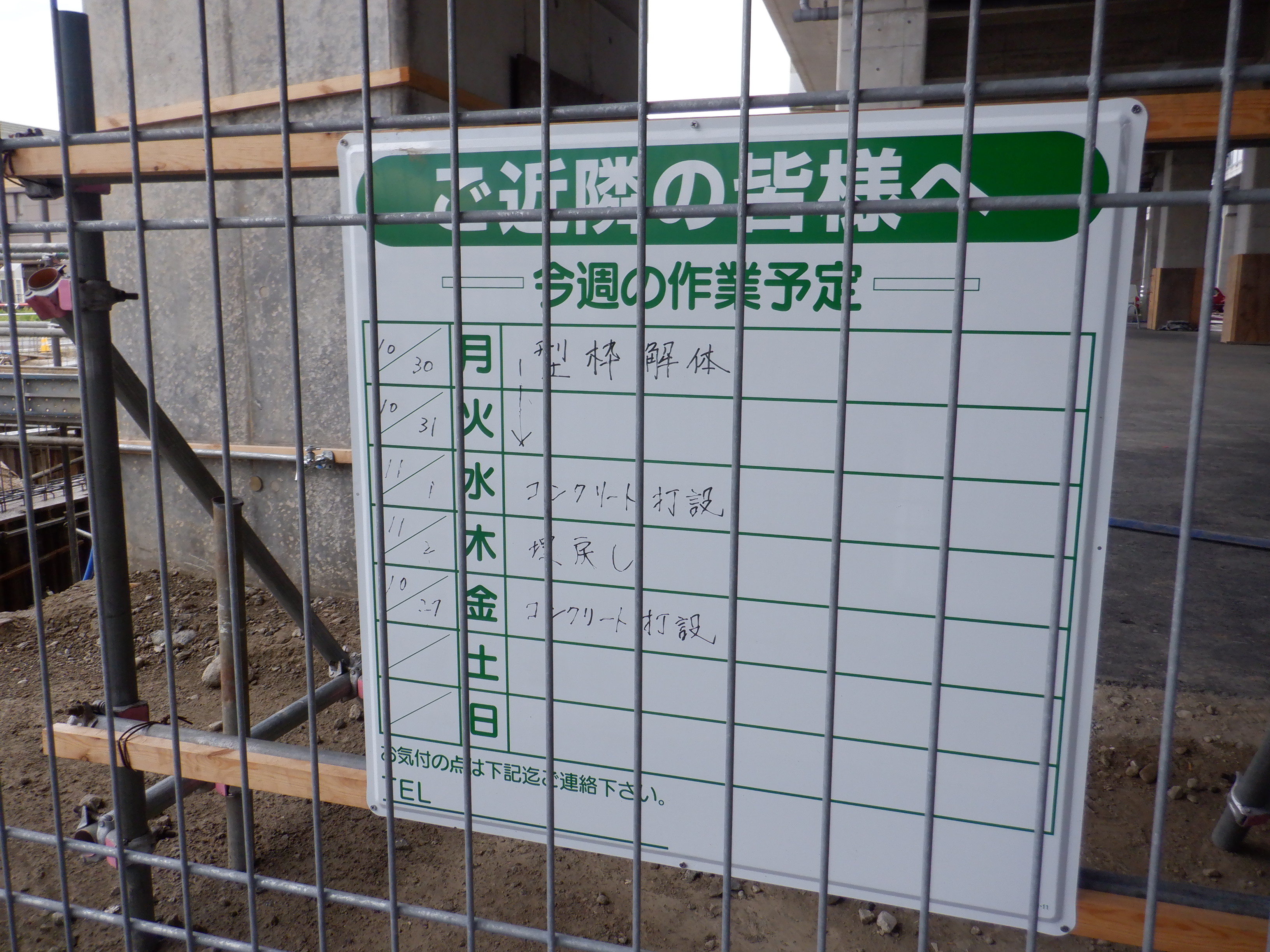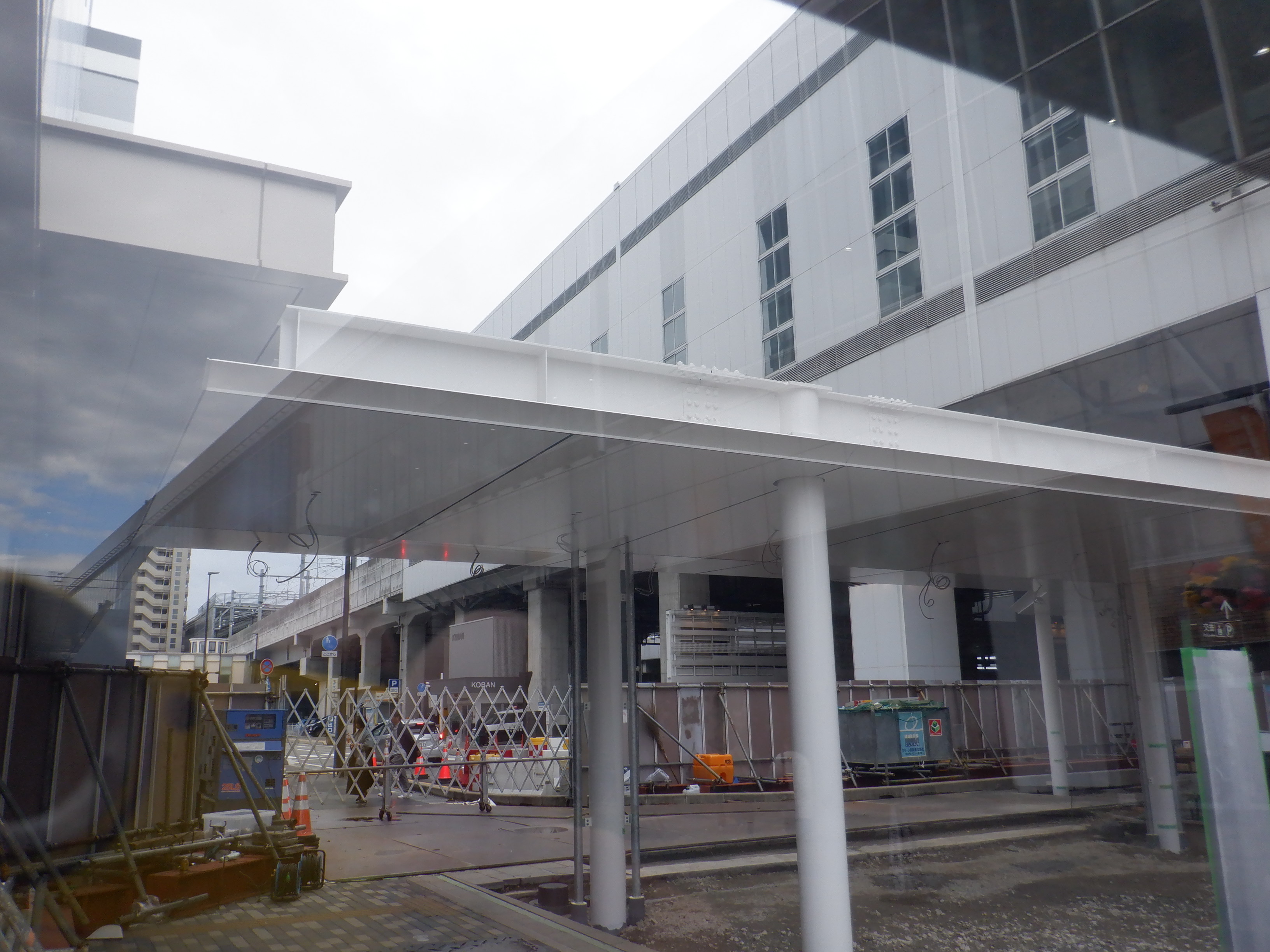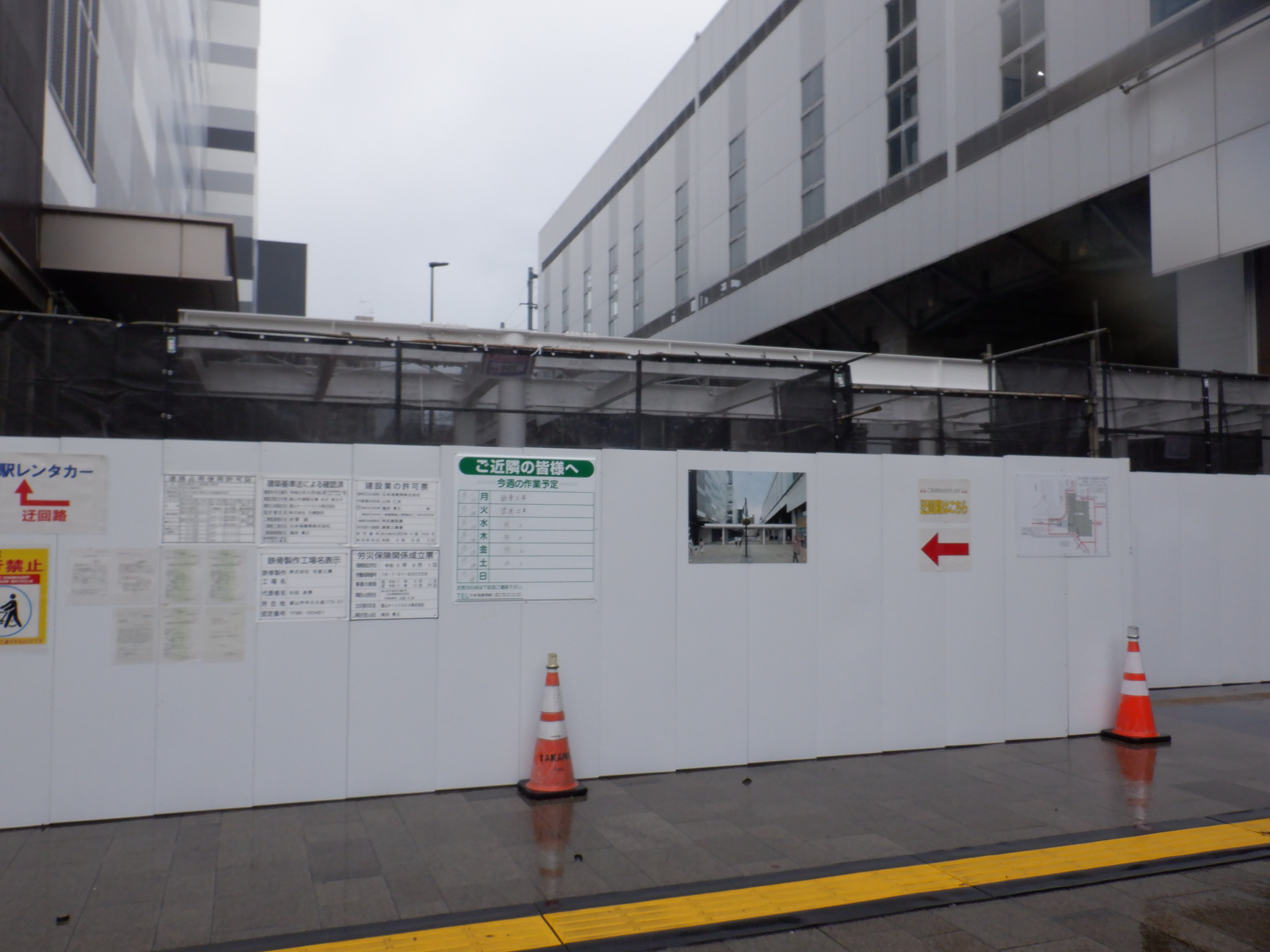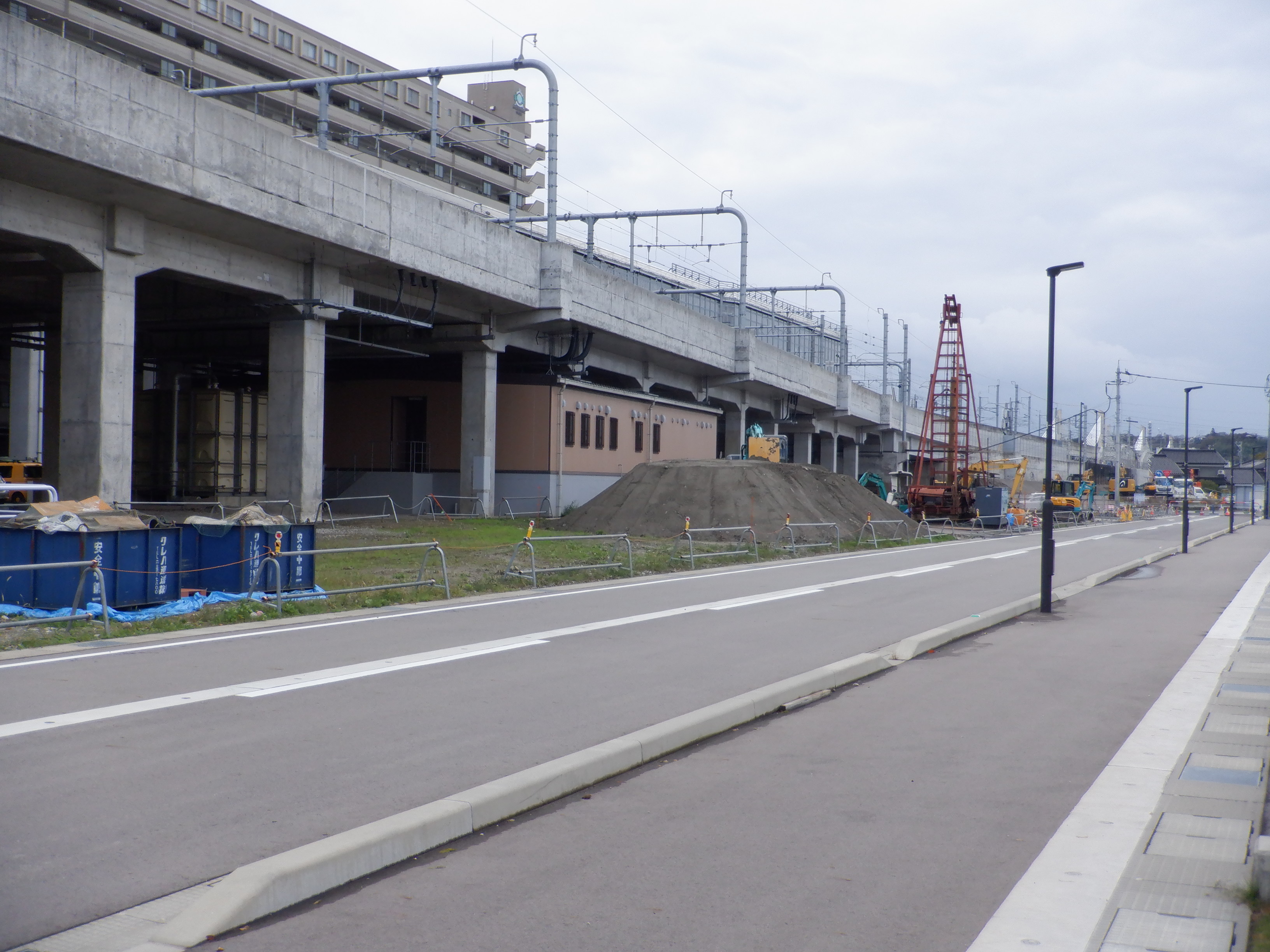 東口とマルートとの間のシェルター建設中のところは支柱の基礎の工事が行われていました。また、商業施設のところも建設が始まっています。