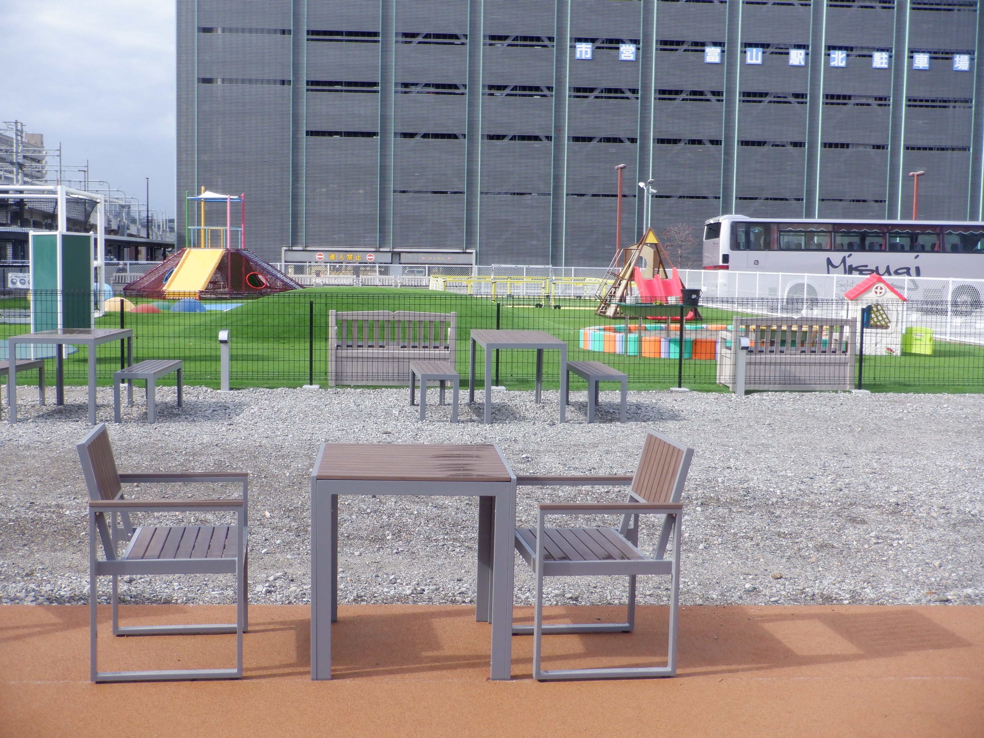 東口とマルートとの間のシェルター建設中のところは屋根の骨組みが立ちました。また、「ごっこぱーく」の建設も進んでいました。