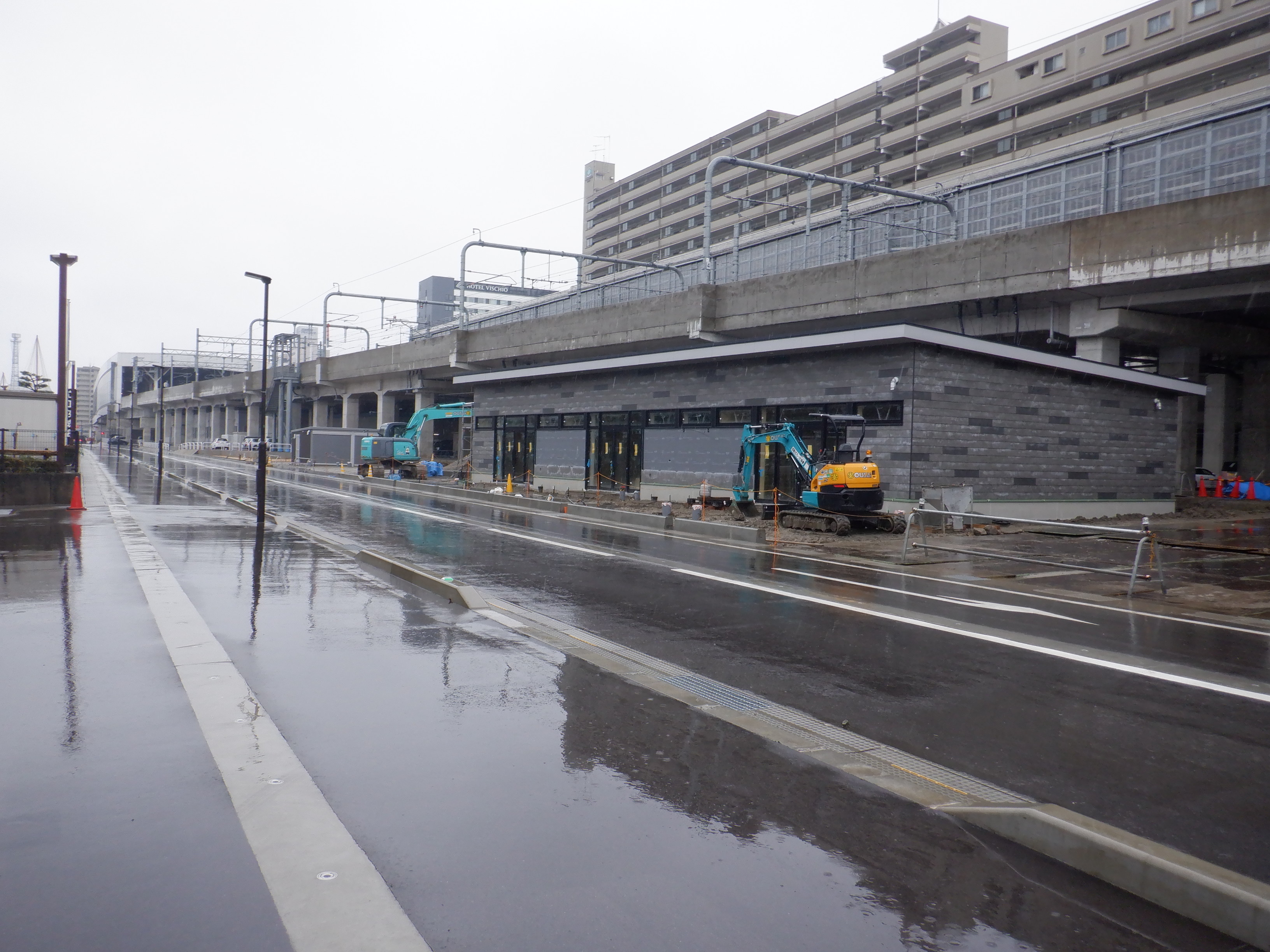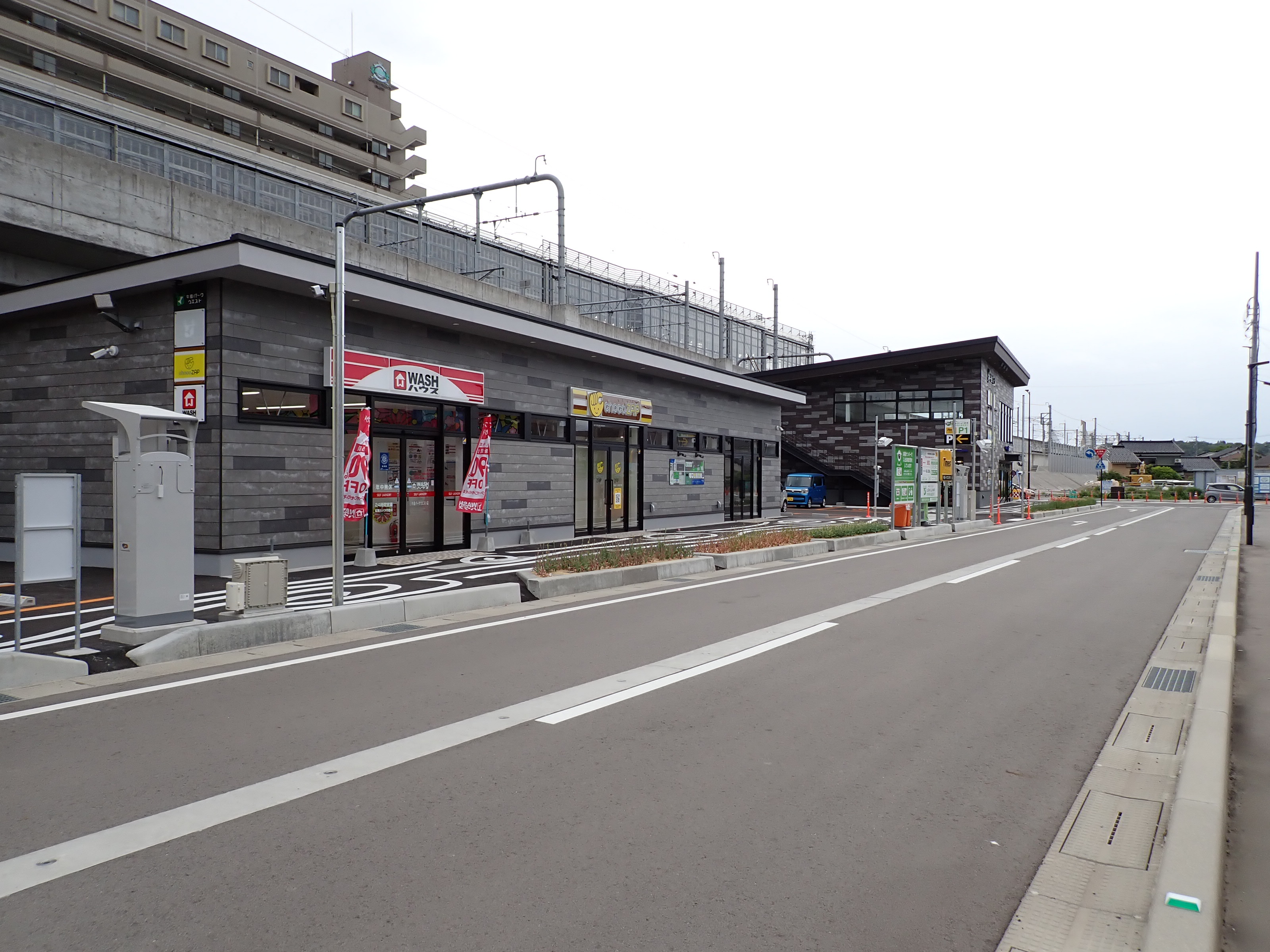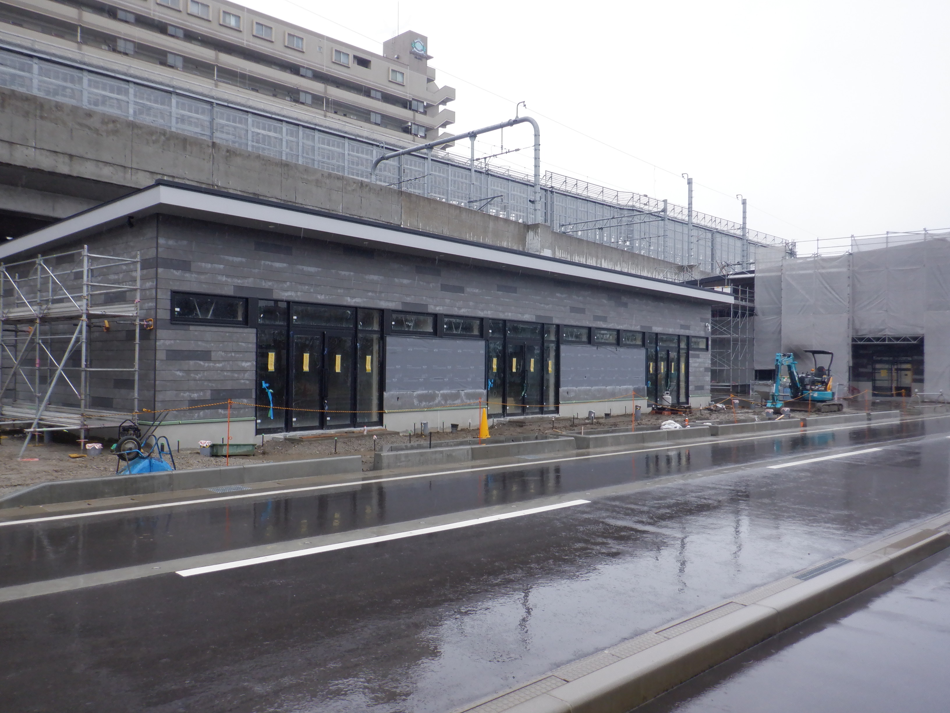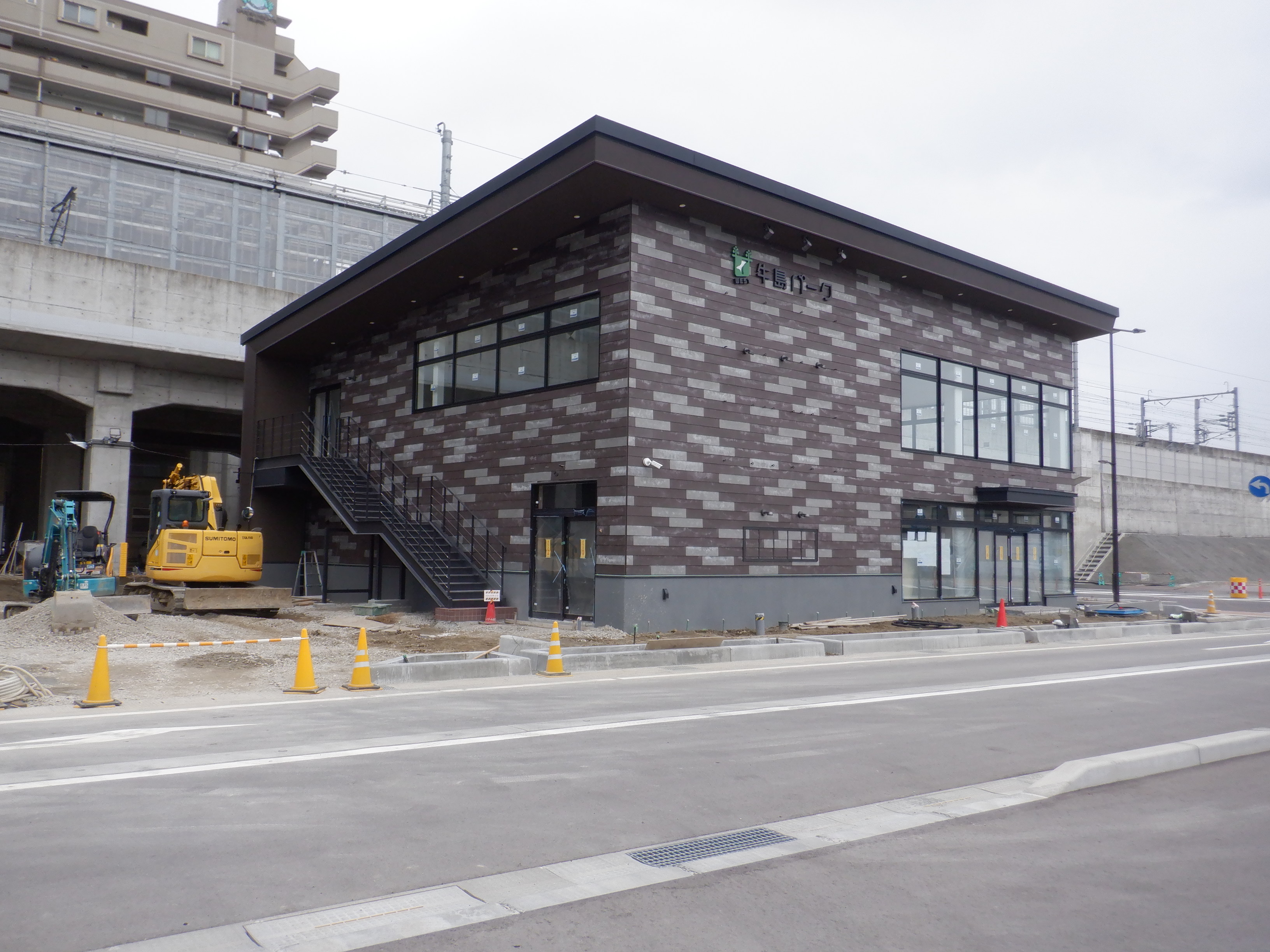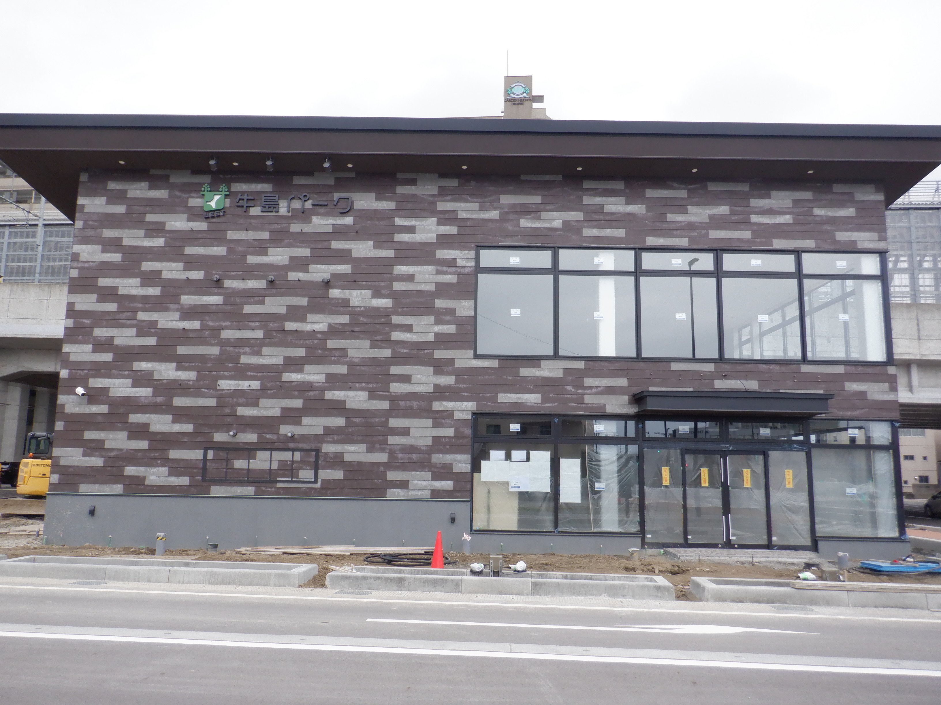仮設線路があったところに建設中だった商業施設(牛島パークウエスト)の足場が取れ、外観が見えていました。