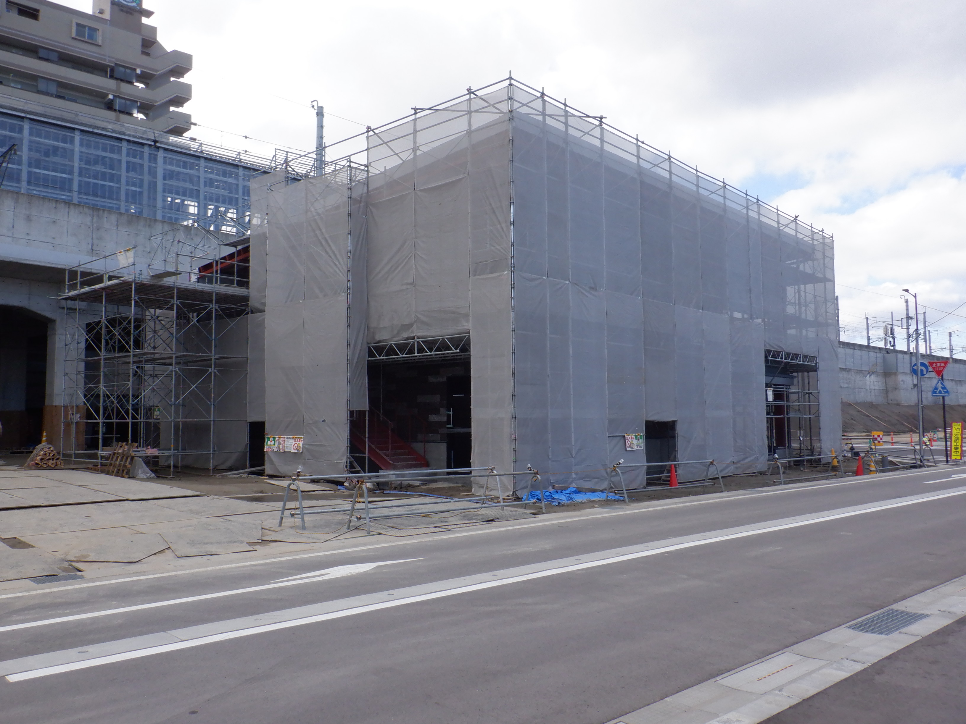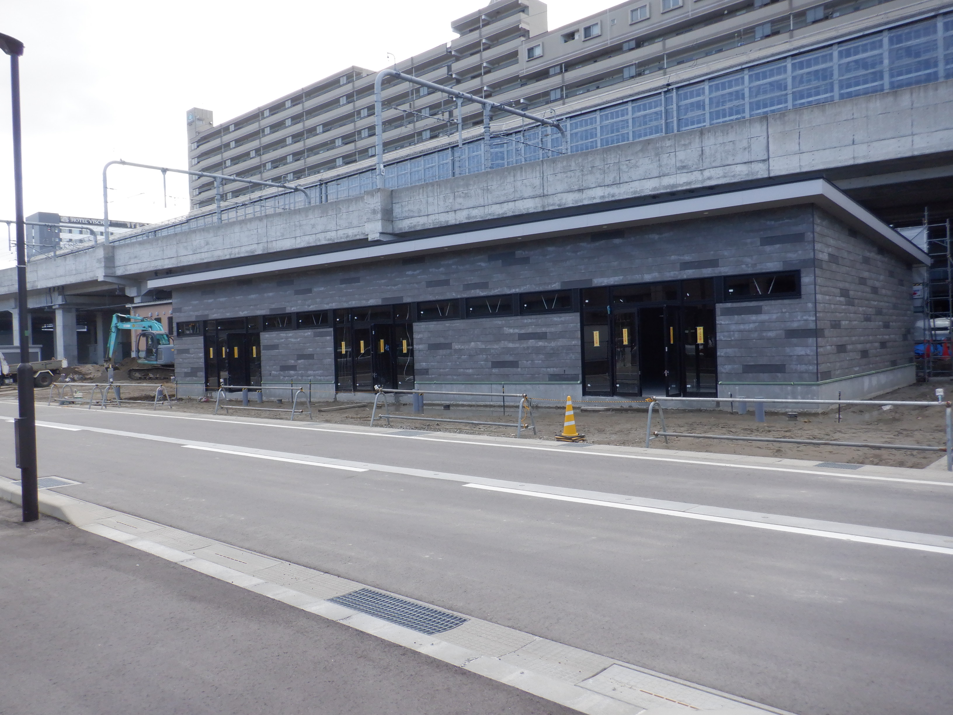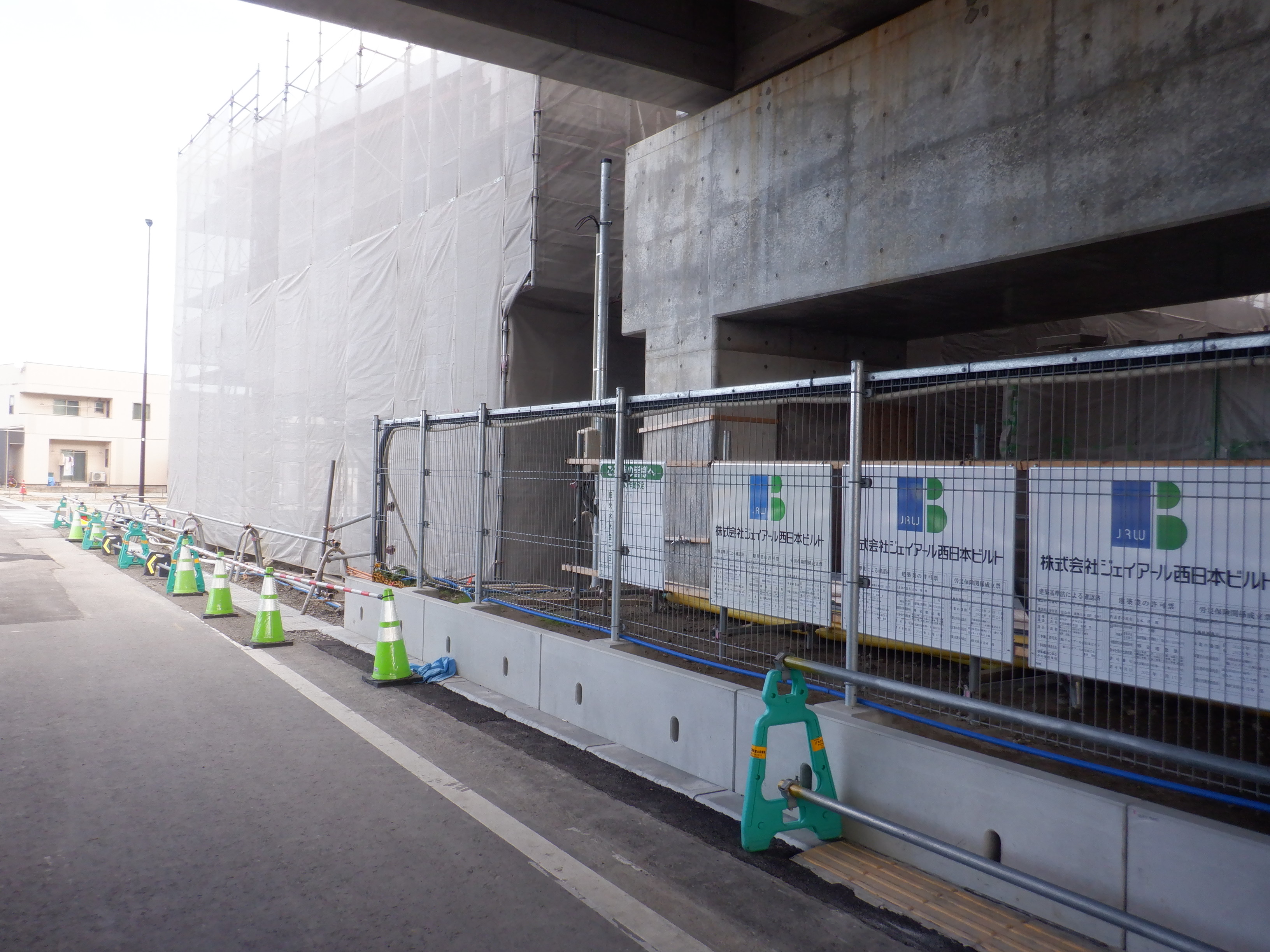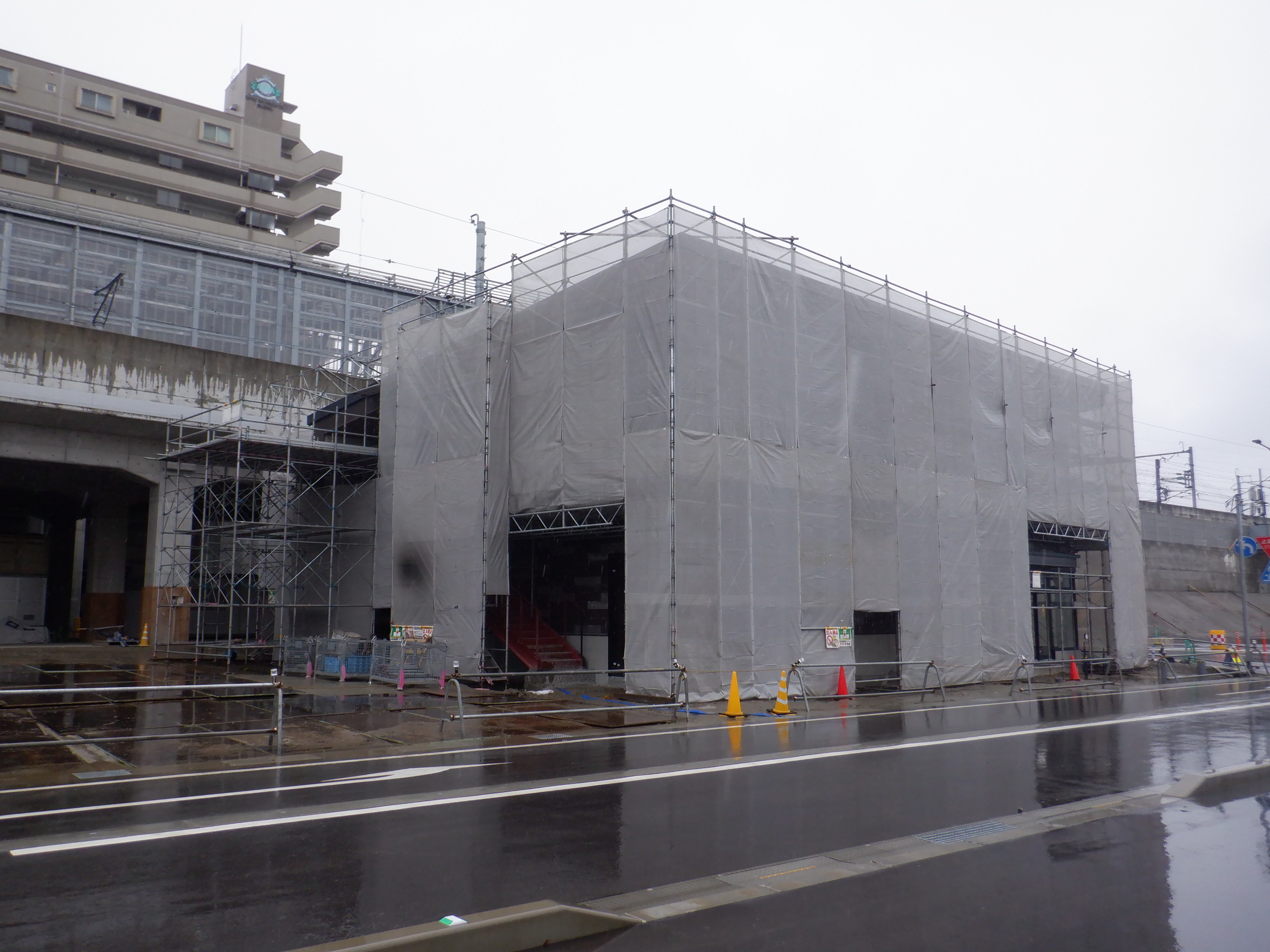 仮設線路があったところに建設中だった商業施設(牛島パークウエスト)の足場が取れ、外観が見えていました。