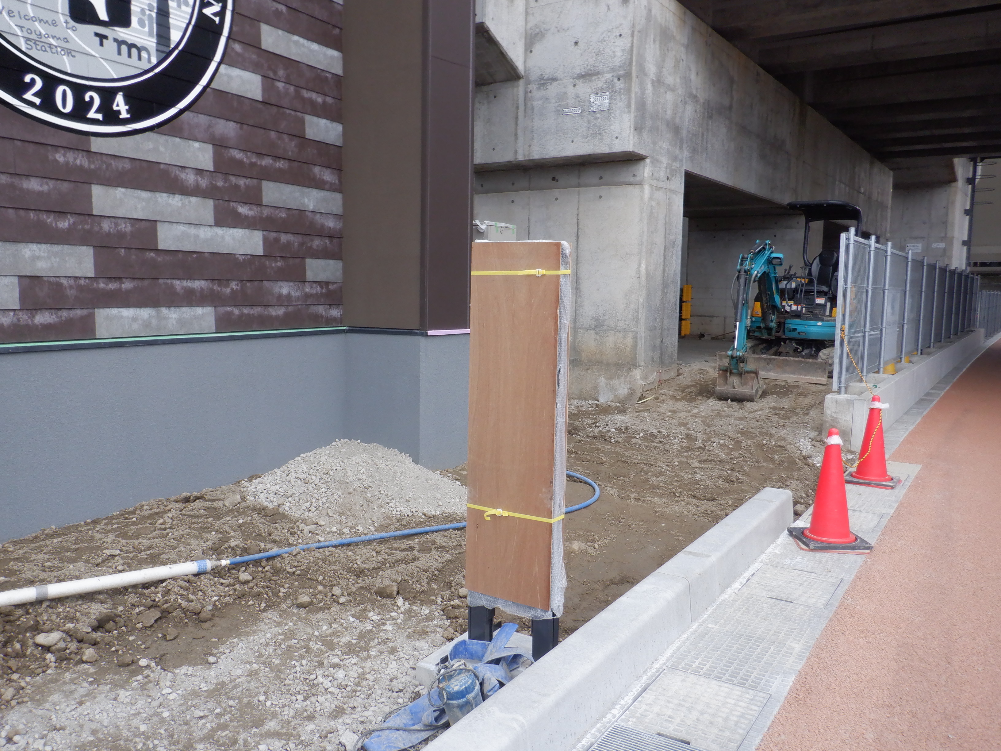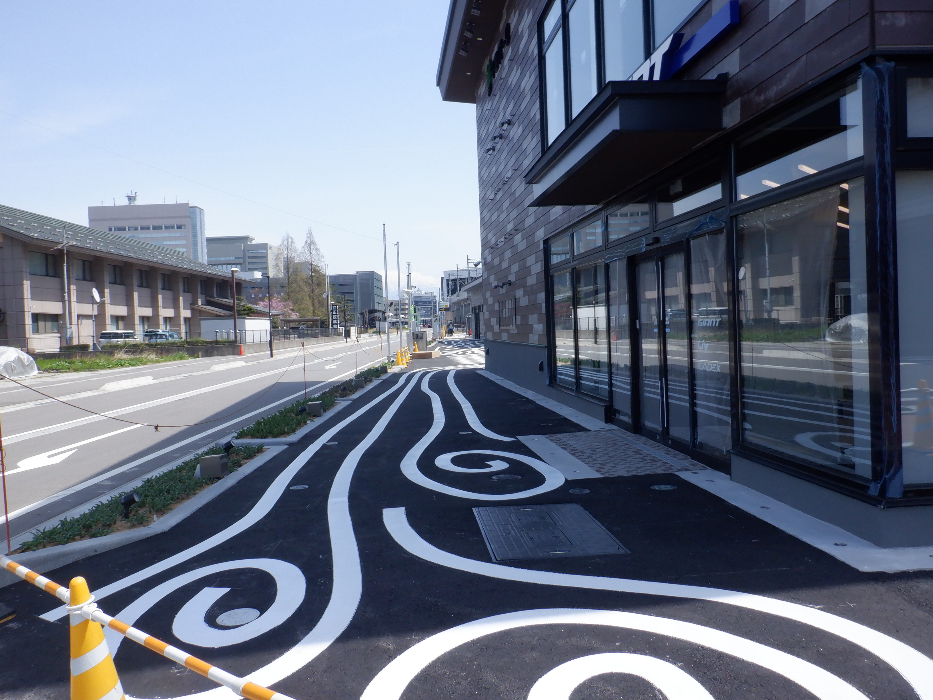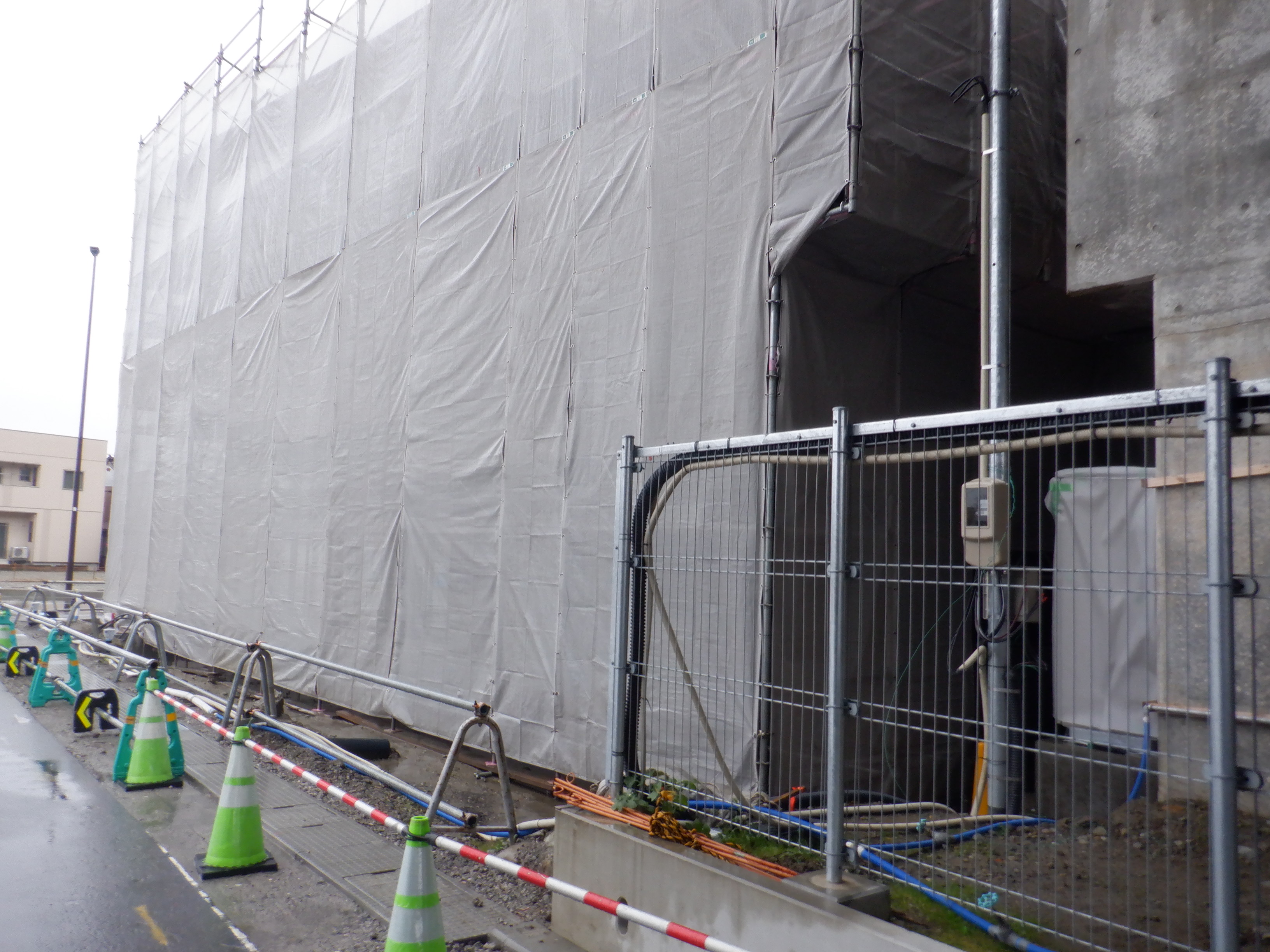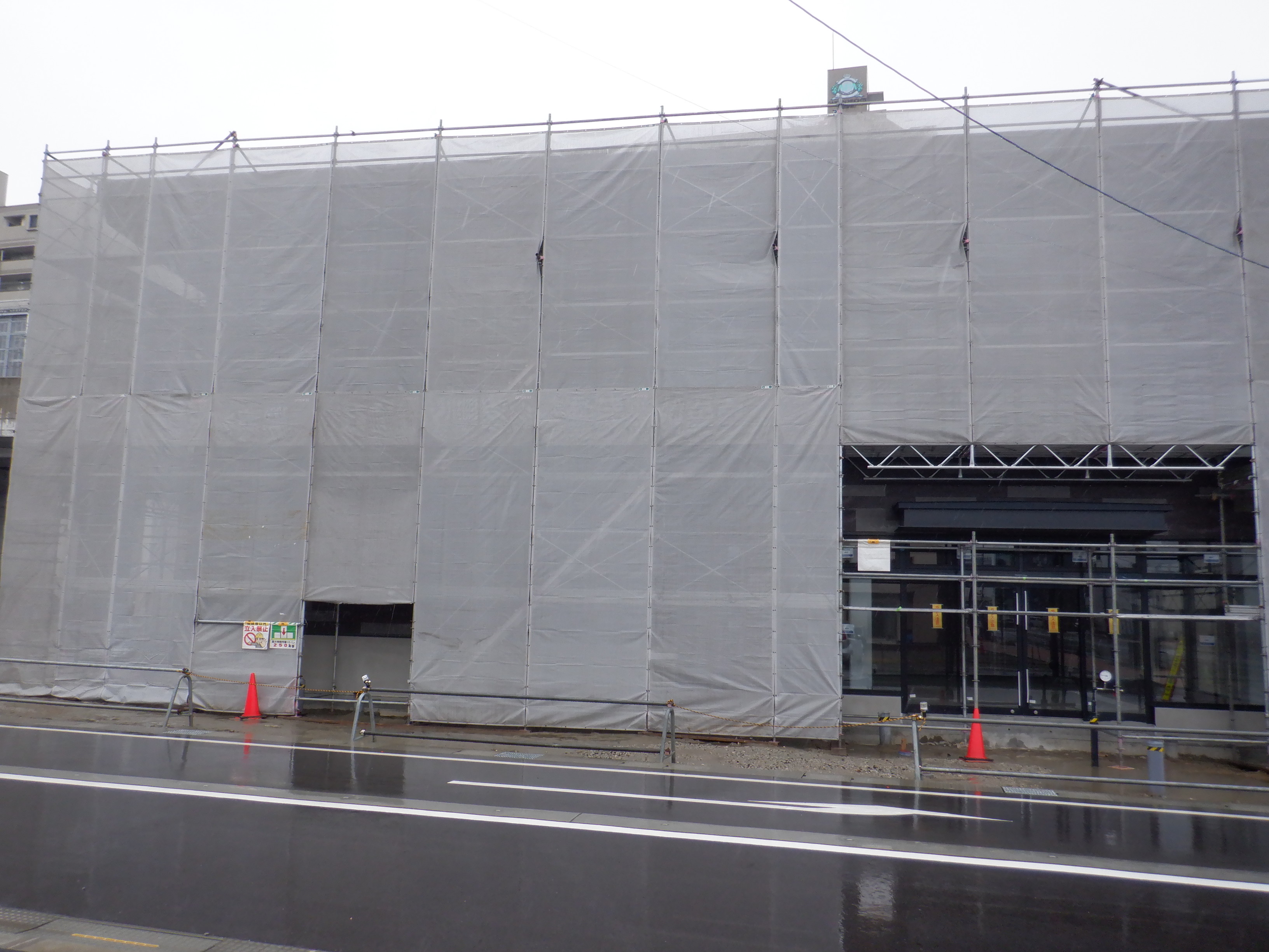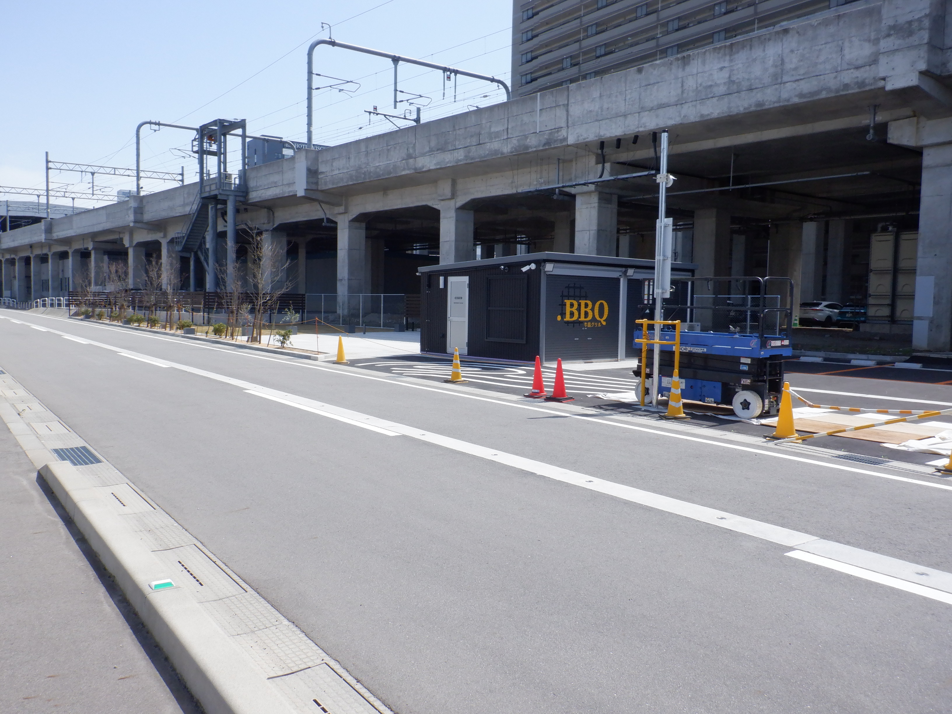 仮設線路があったところに建設中だった商業施設(牛島パークウエスト)の足場が取れ、外観が見えていました。
