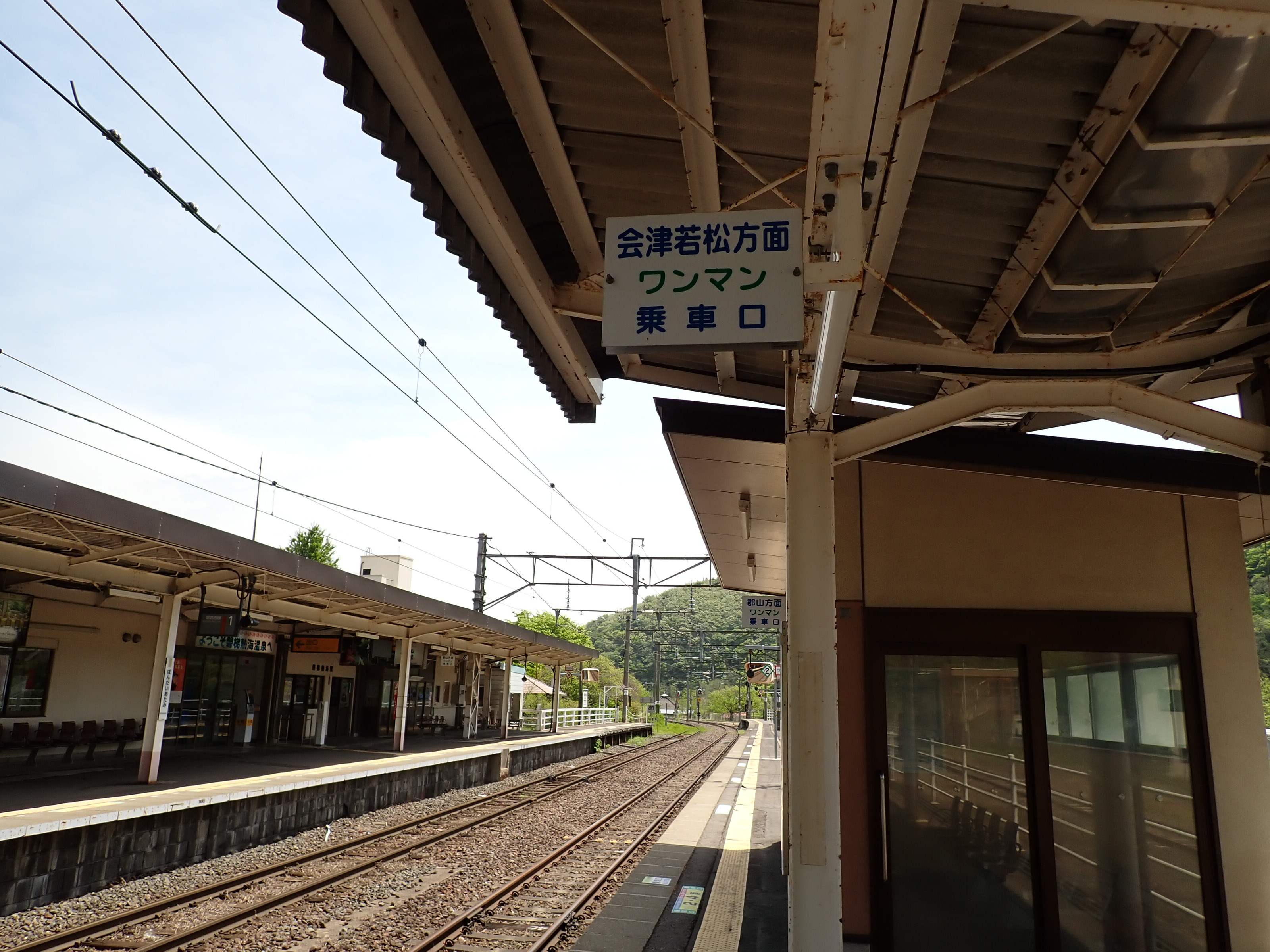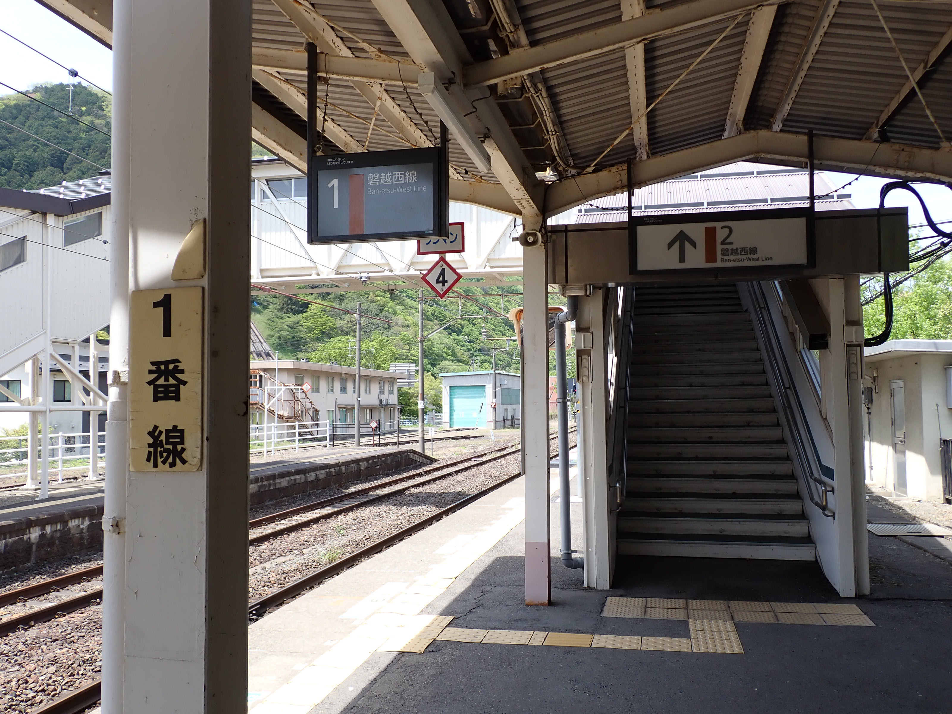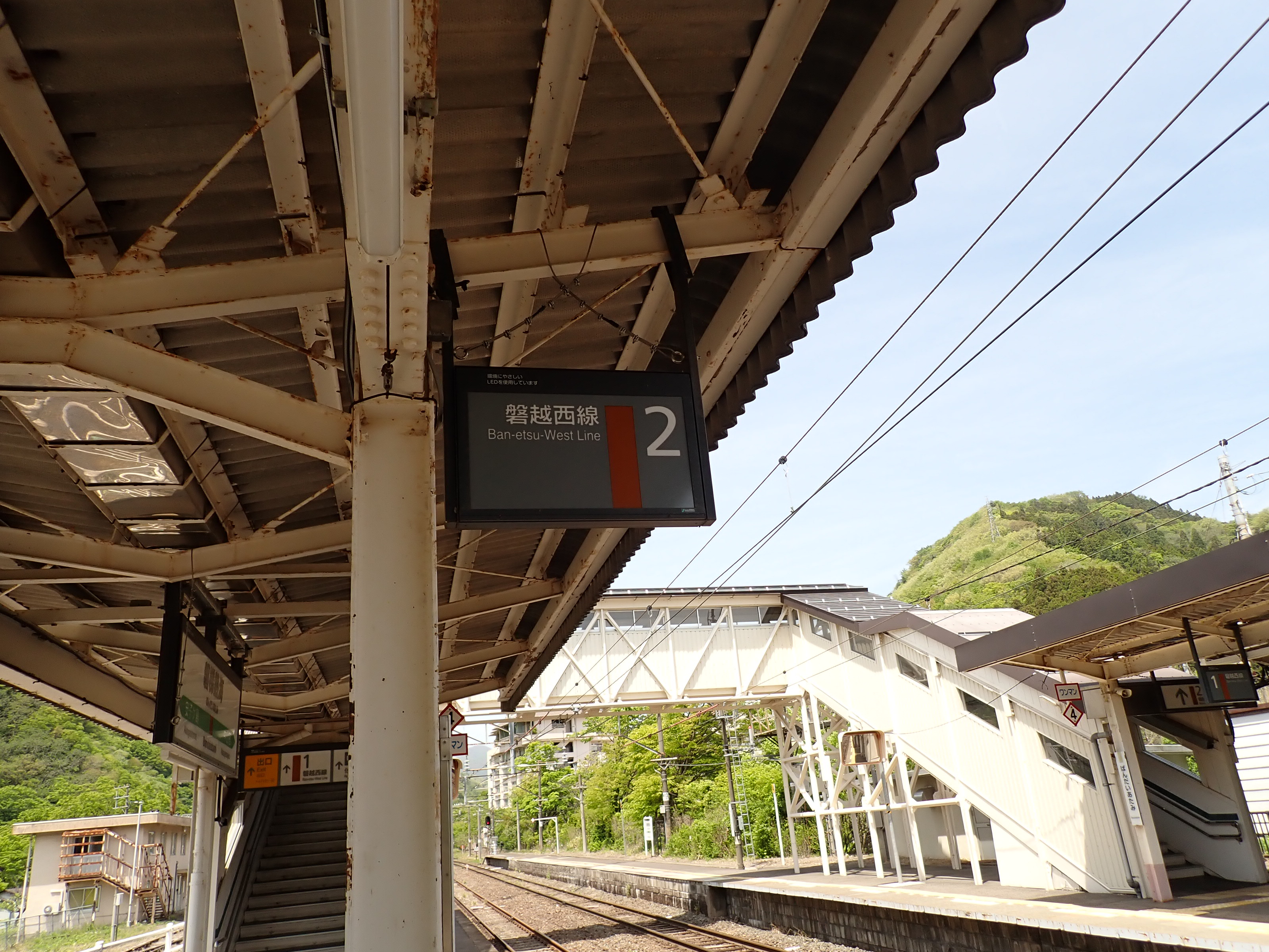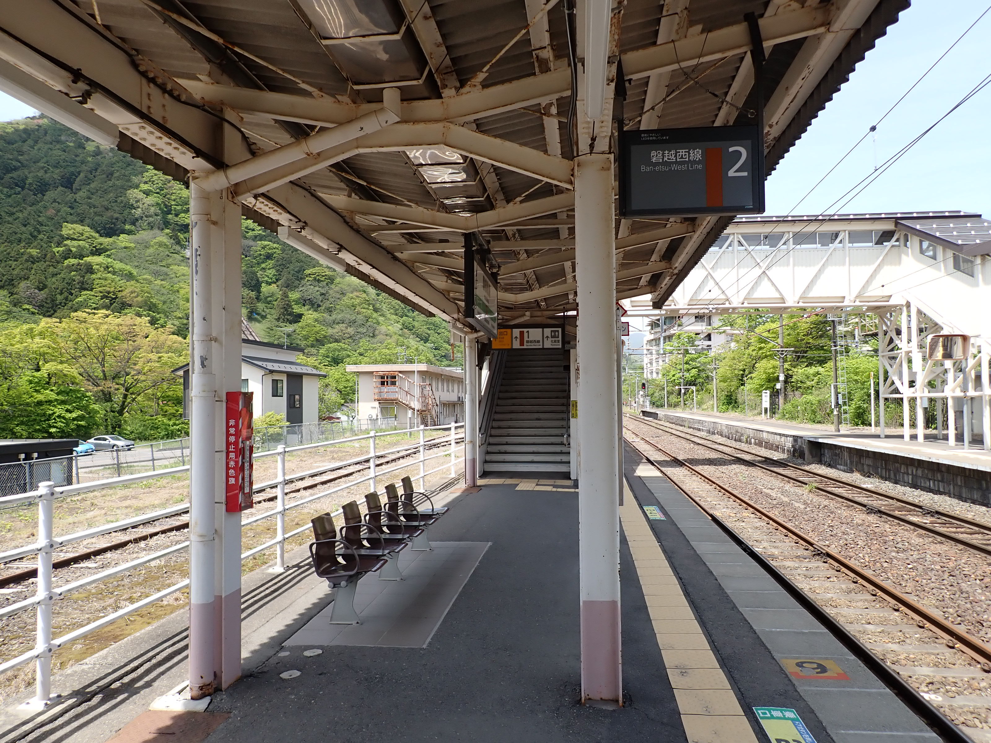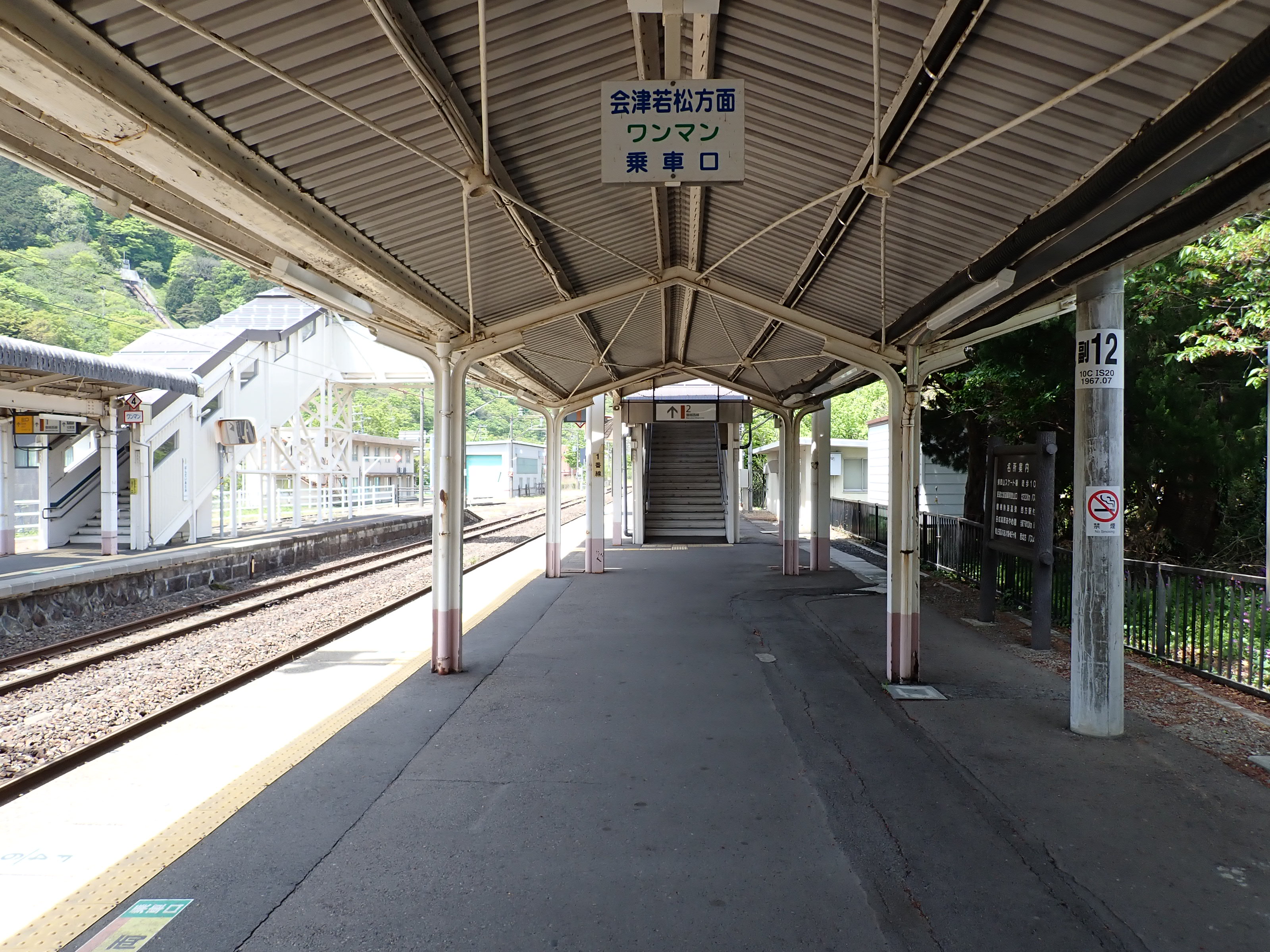会津若松駅から来ると、この駅近くから開けてきて、この駅を過ぎると急激に広がってくる印象です。駅のそばに磐梯熱海温泉の温泉街が少しありますが、さらに中山宿駅側に進んだ五百川沿いに温泉街が広がっています。跨線橋が印象的な駅です。