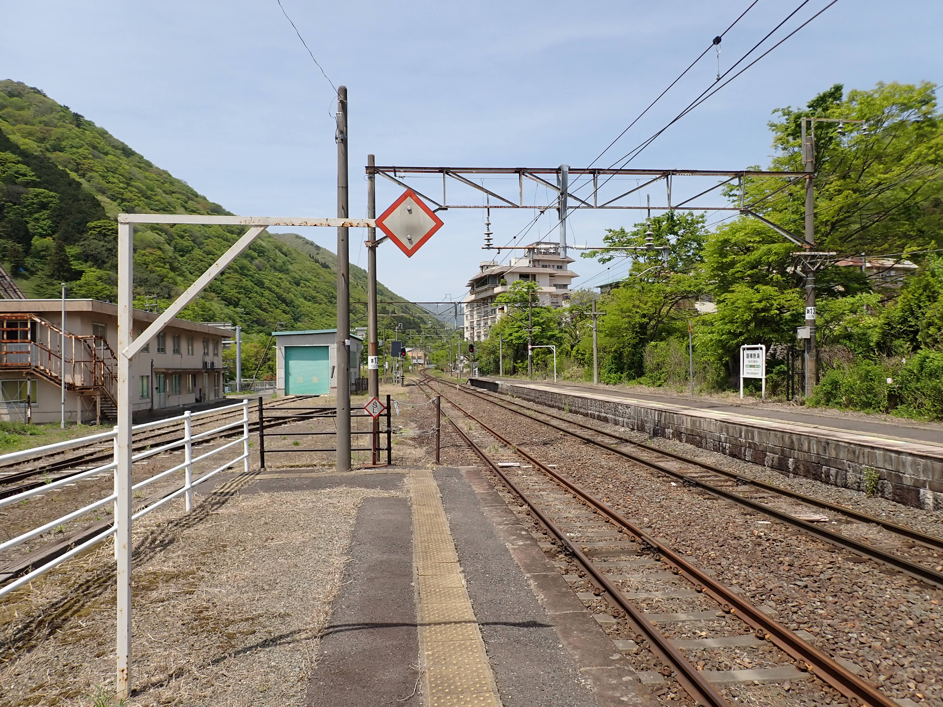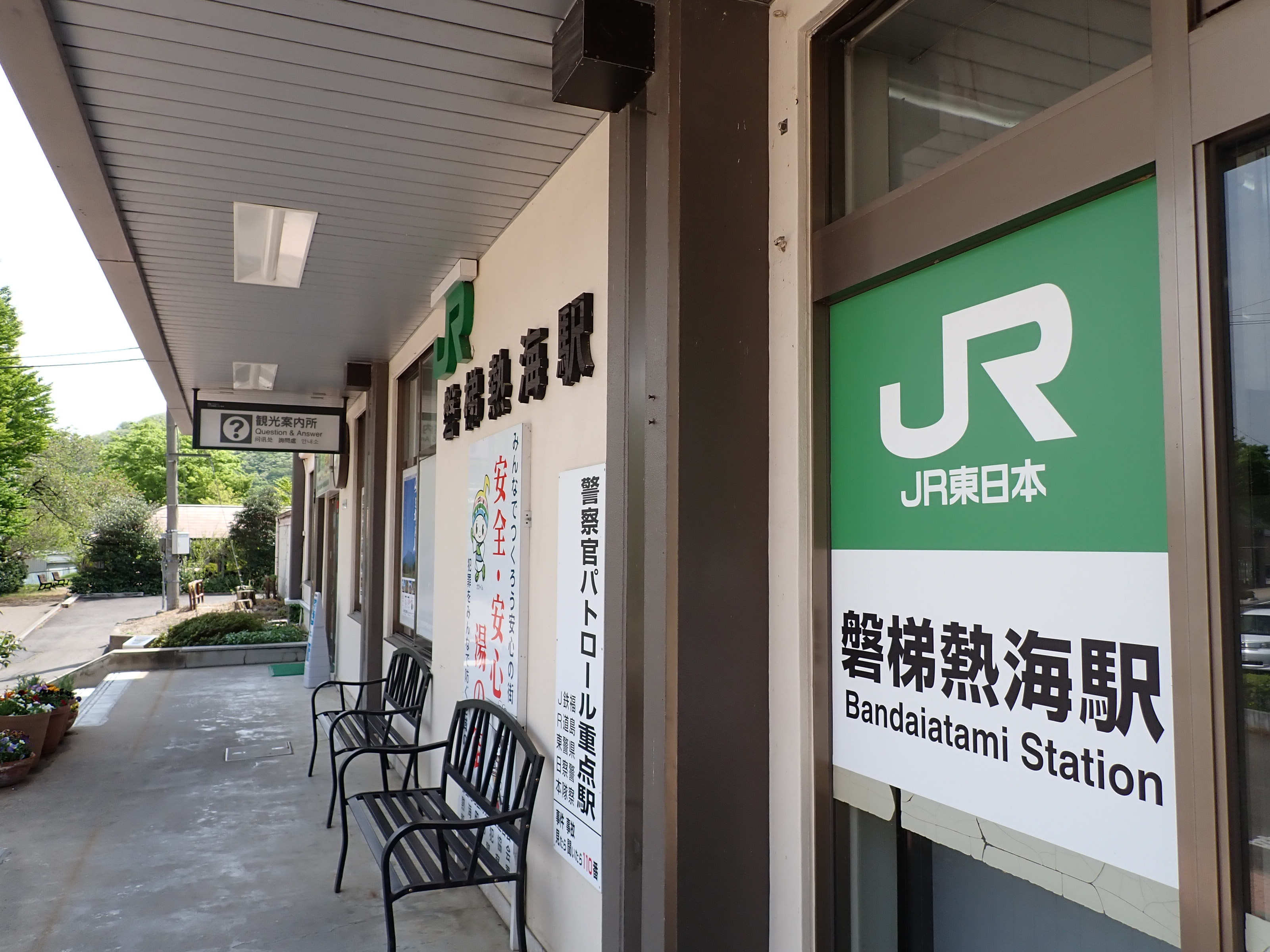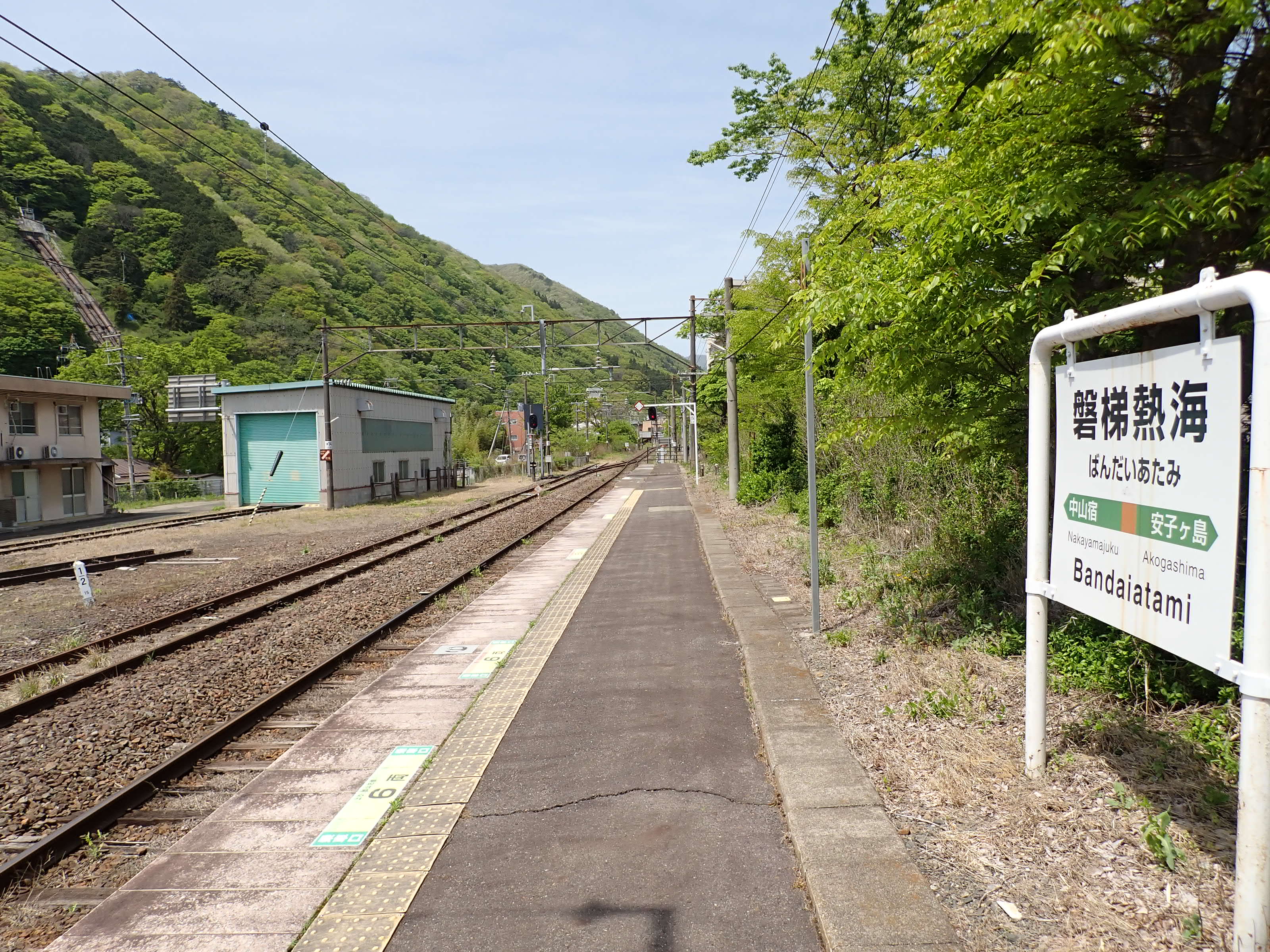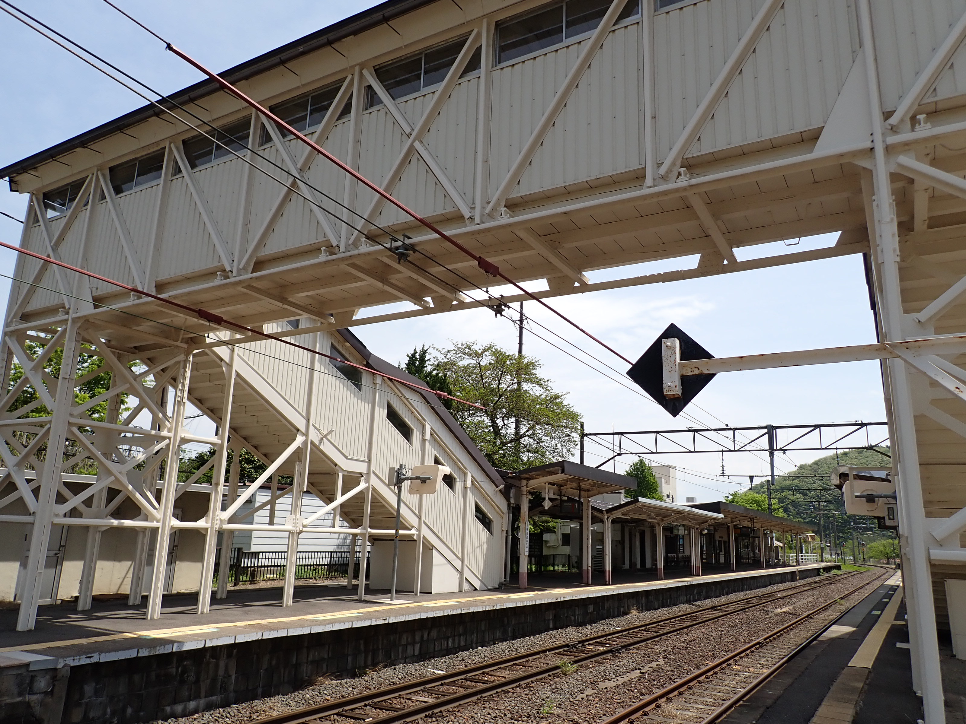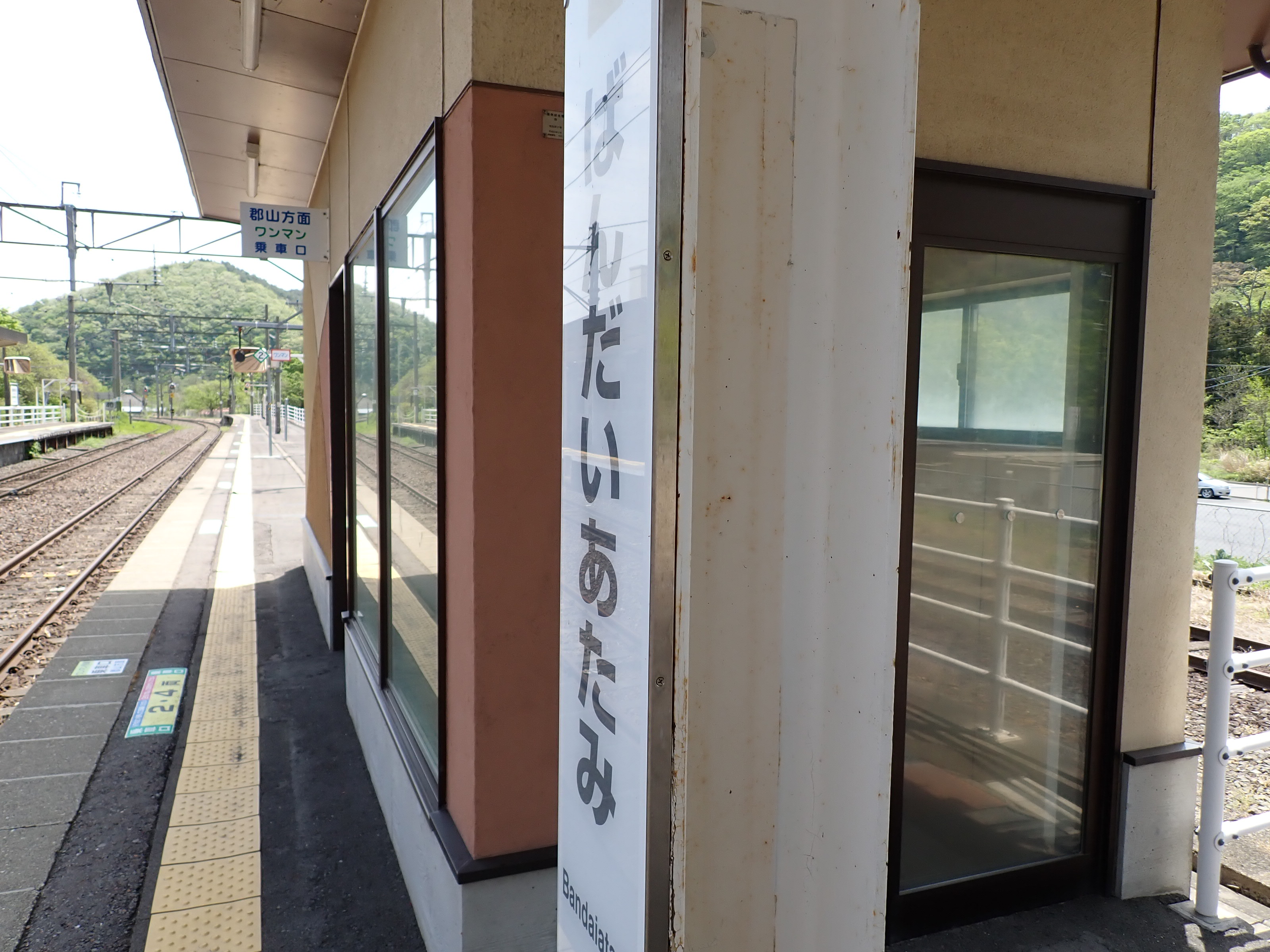 会津若松駅から来ると、この駅近くから開けてきて、この駅を過ぎると急激に広がってくる印象です。駅のそばに磐梯熱海温泉の温泉街が少しありますが、さらに中山宿駅側に進んだ五百川沿いに温泉街が広がっています。跨線橋が印象的な駅です。