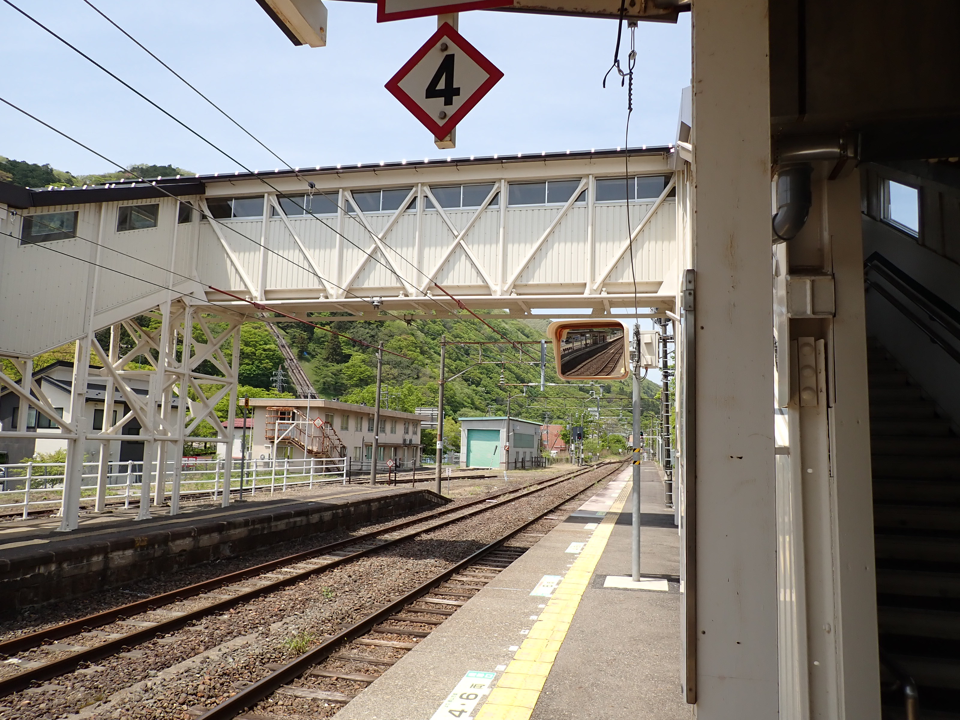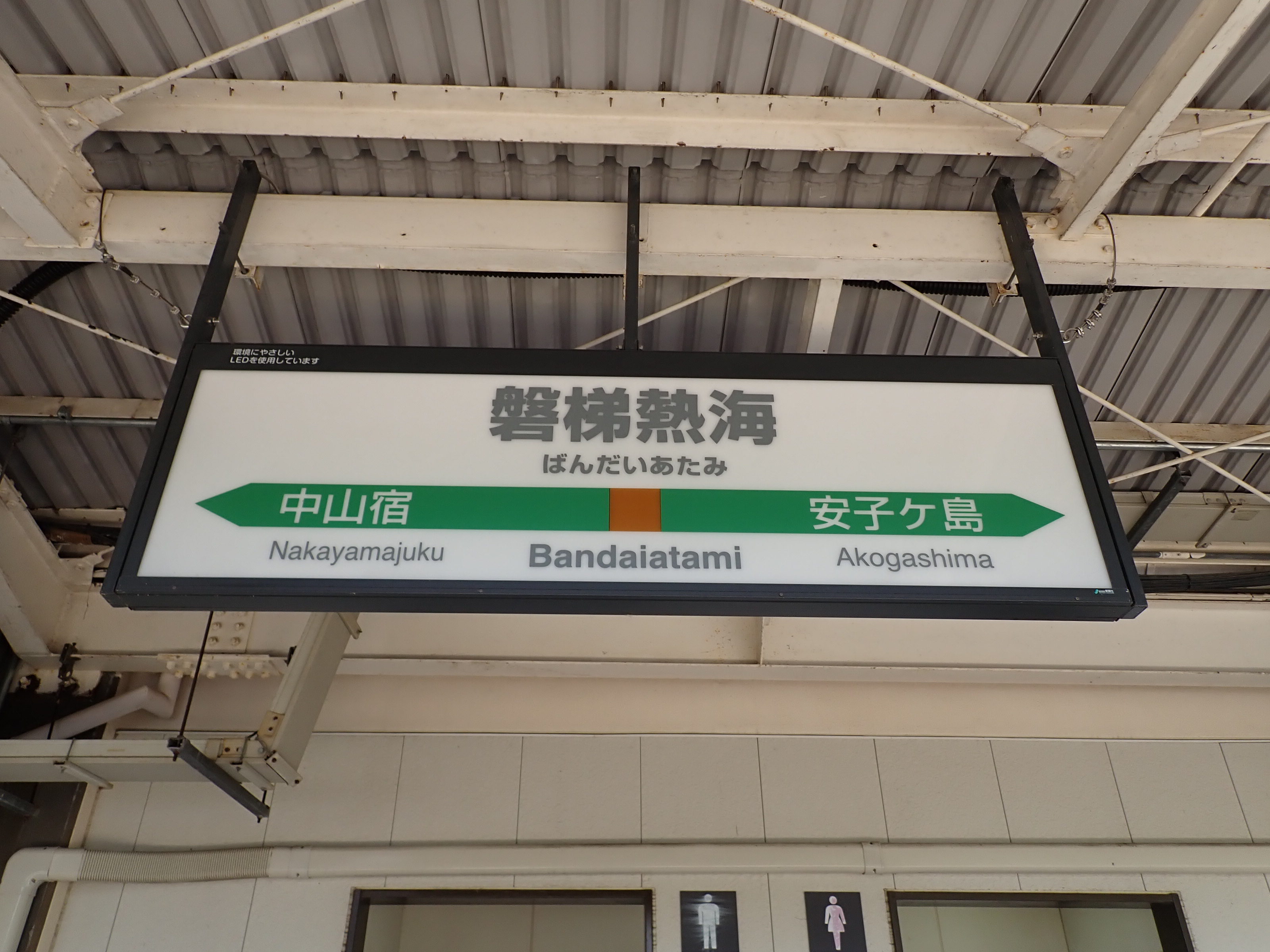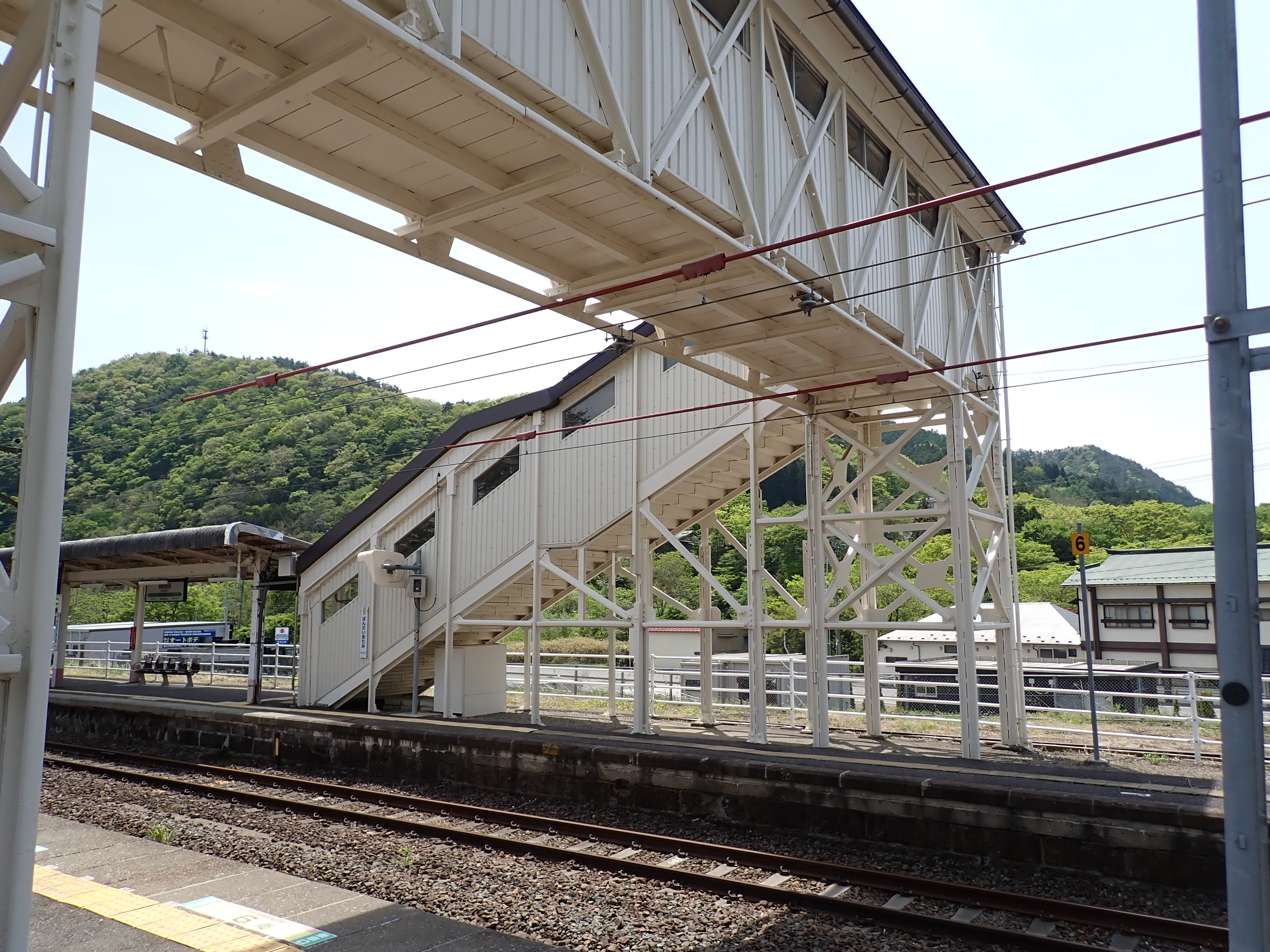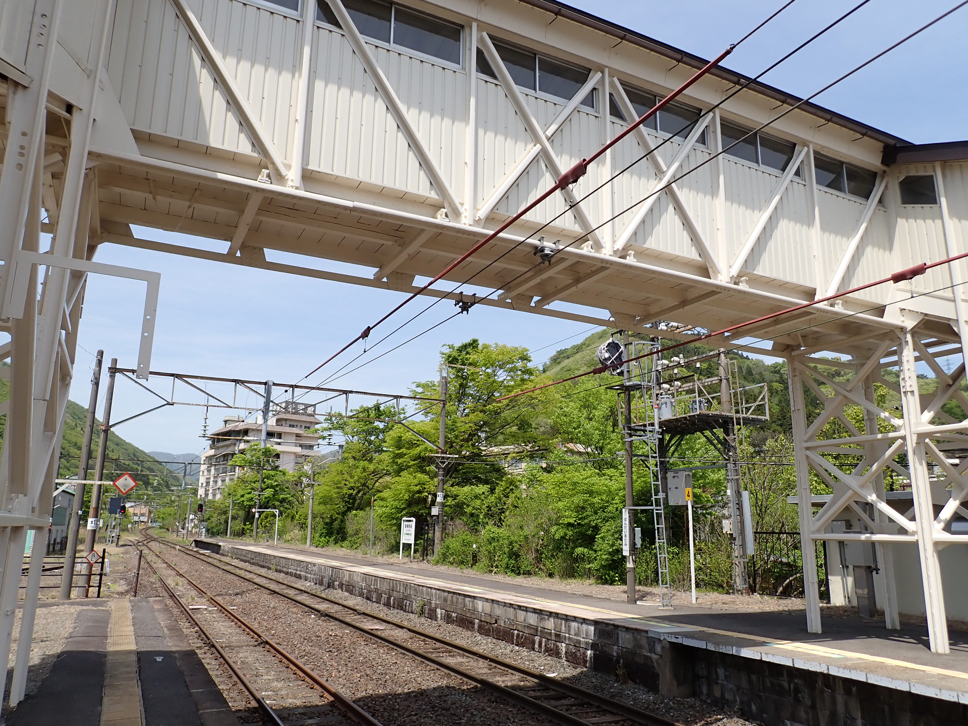 会津若松駅から来ると、この駅近くから開けてきて、この駅を過ぎると急激に広がってくる印象です。駅のそばに磐梯熱海温泉の温泉街が少しありますが、さらに中山宿駅側に進んだ五百川沿いに温泉街が広がっています。跨線橋が印象的な駅です。