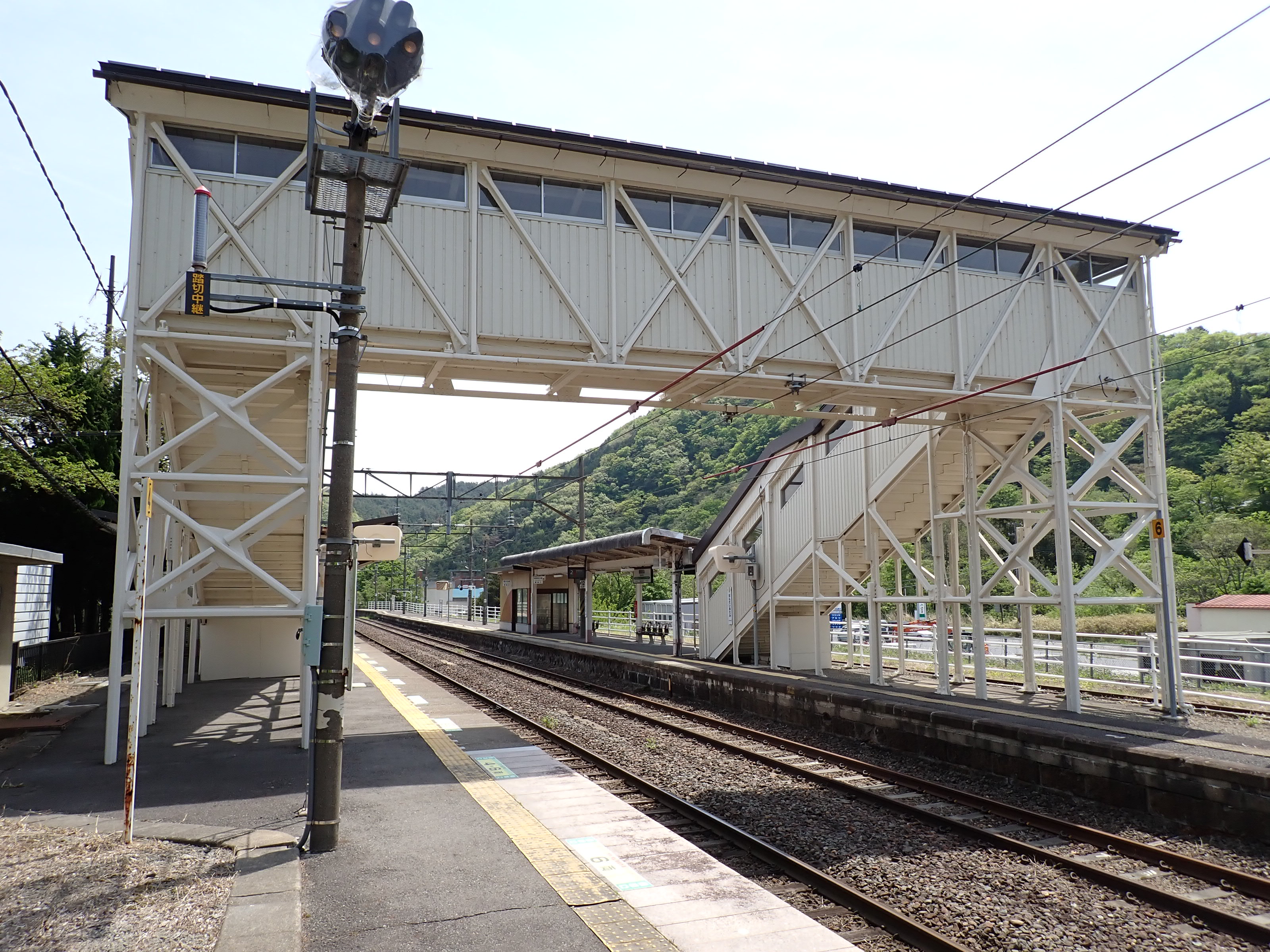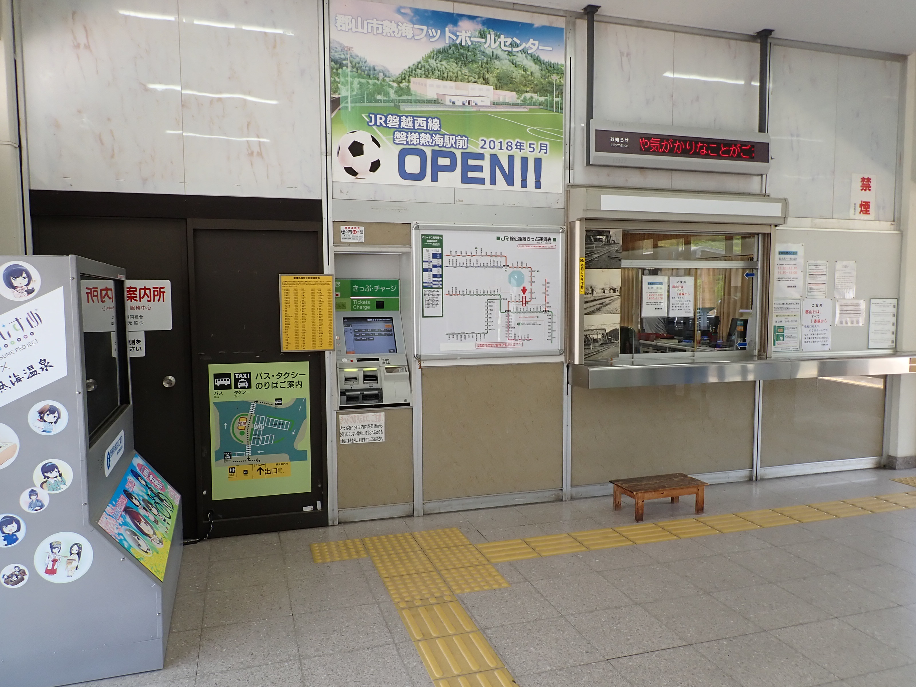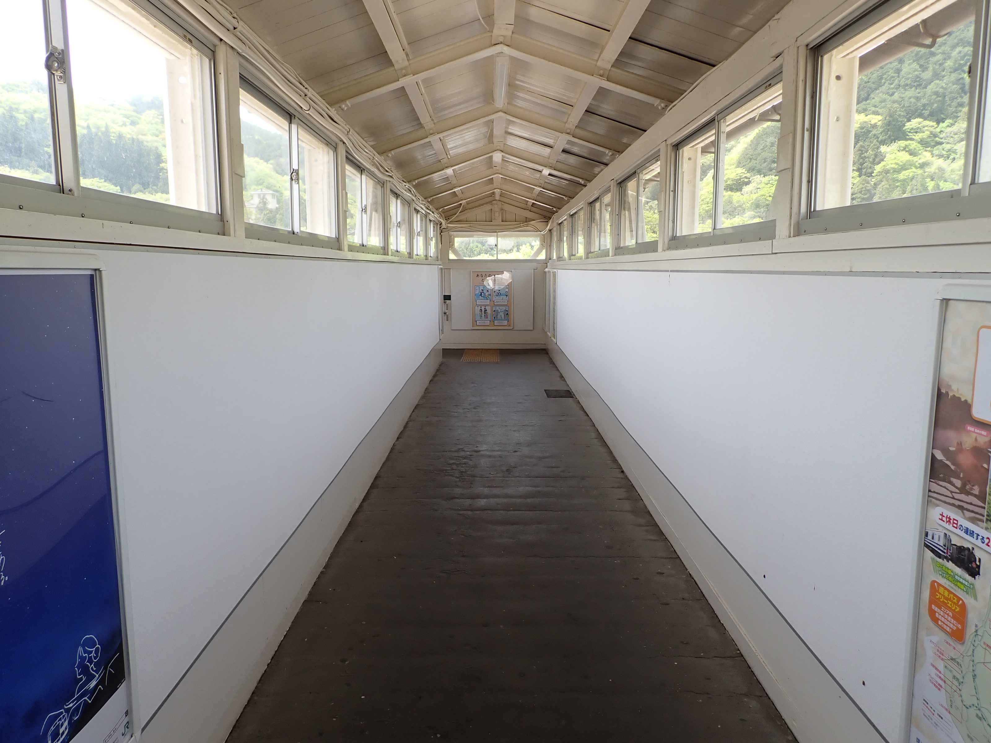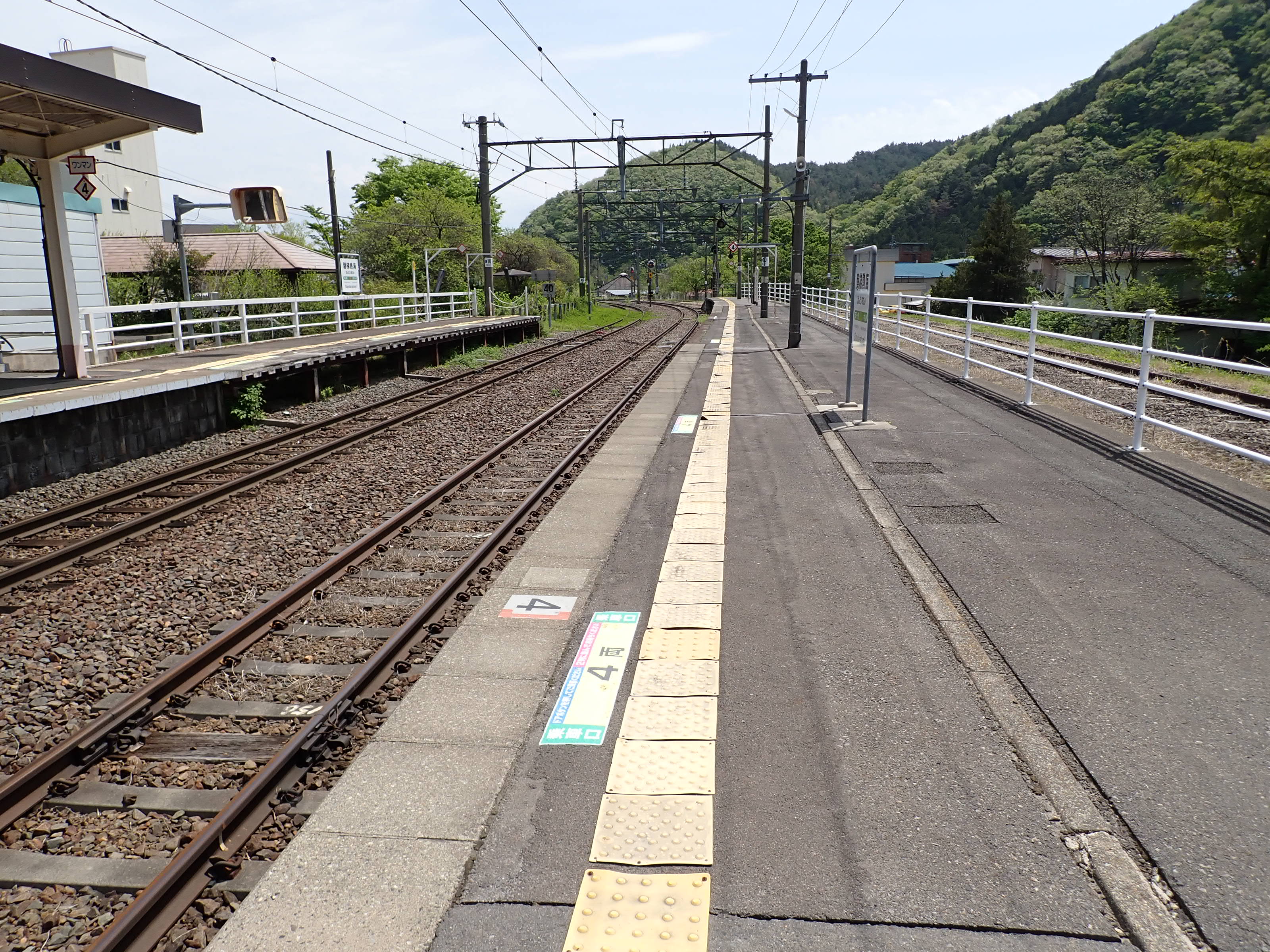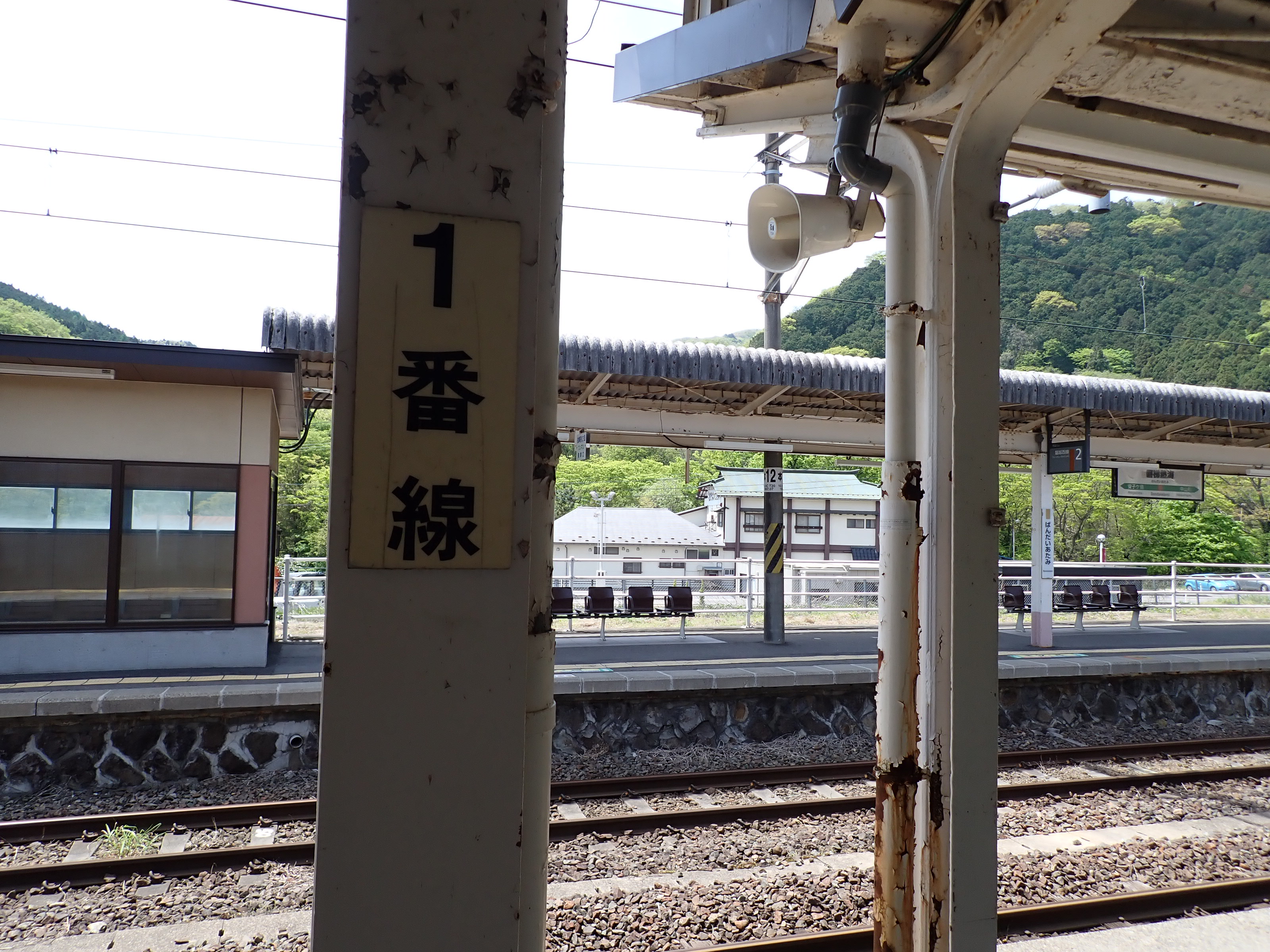 会津若松駅から来ると、この駅近くから開けてきて、この駅を過ぎると急激に広がってくる印象です。駅のそばに磐梯熱海温泉の温泉街が少しありますが、さらに中山宿駅側に進んだ五百川沿いに温泉街が広がっています。跨線橋が印象的な駅です。