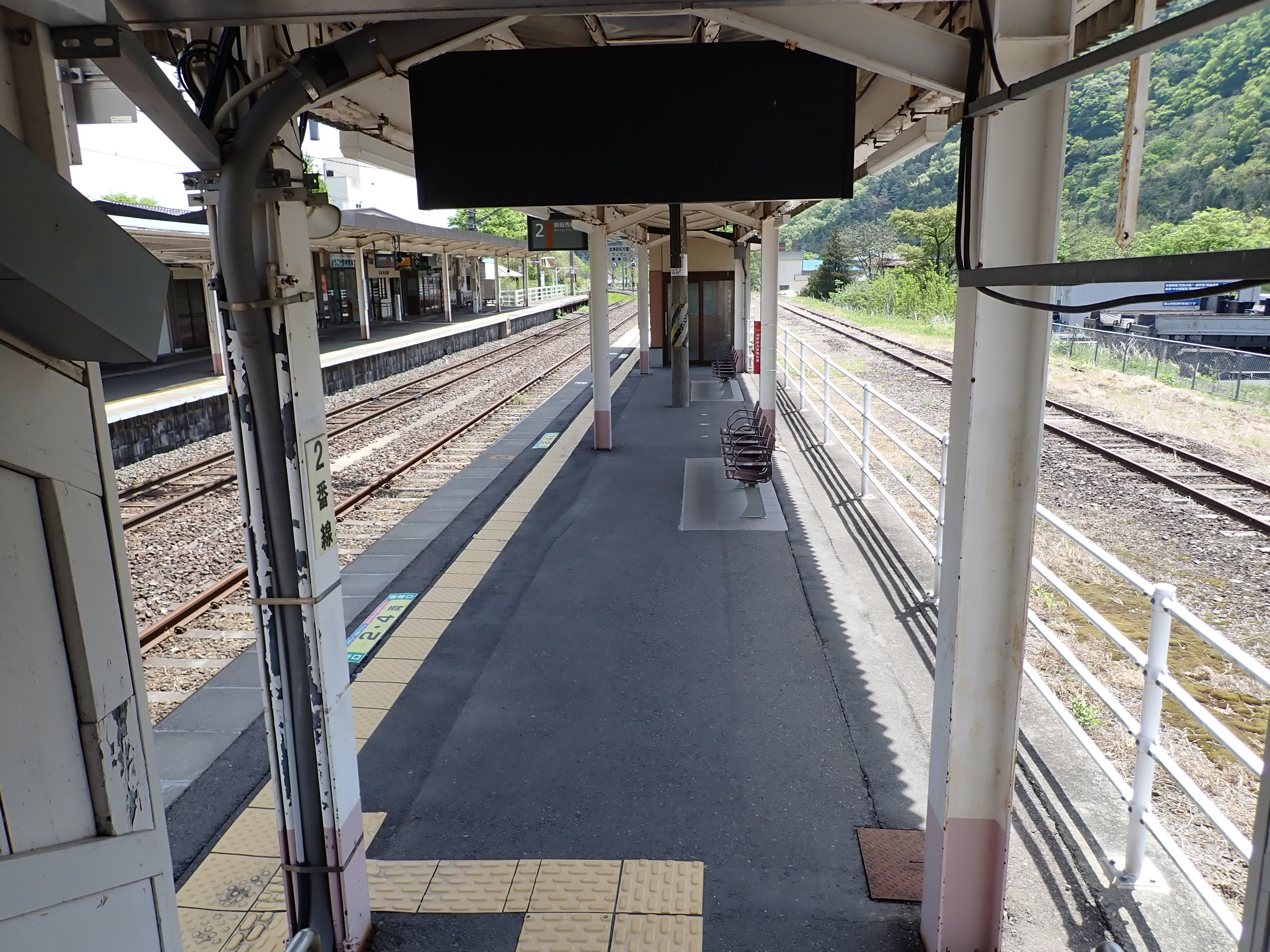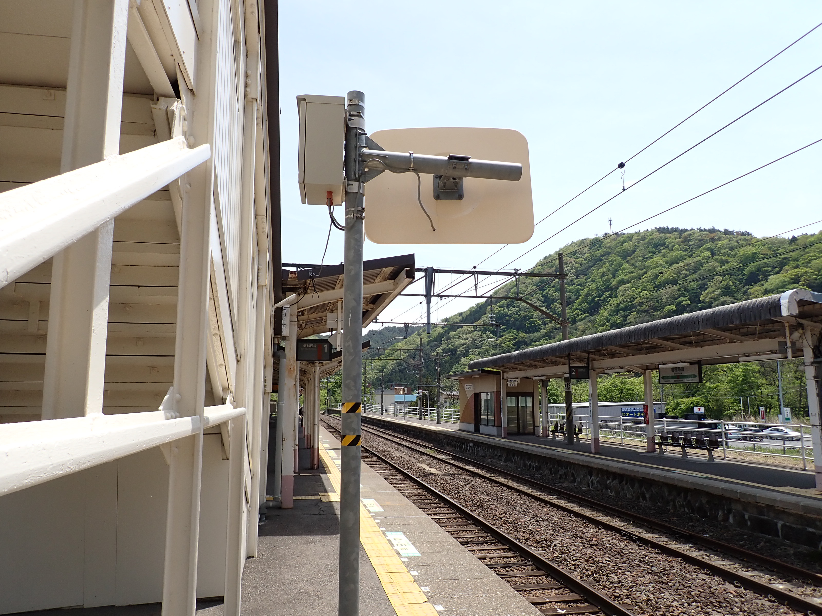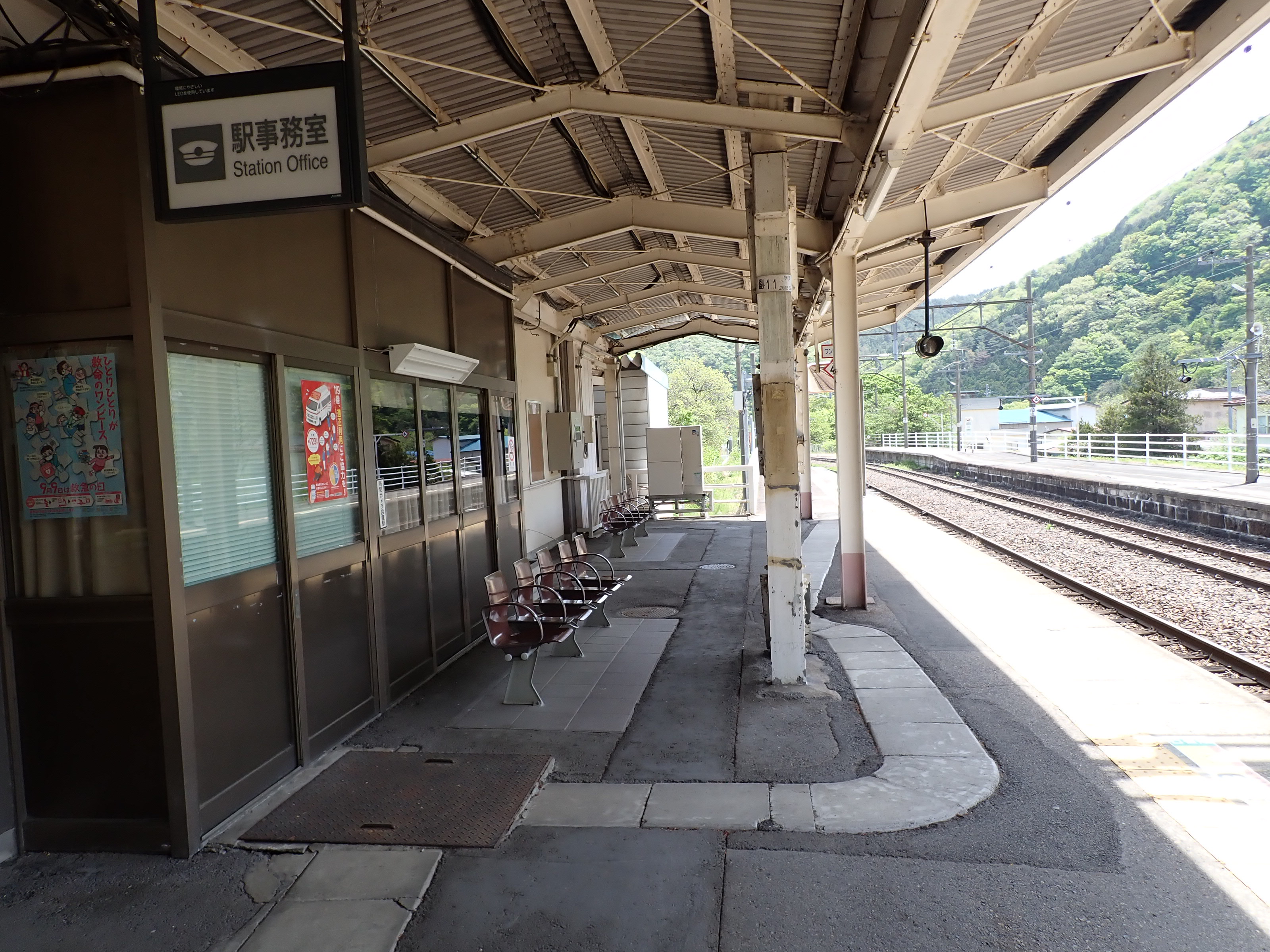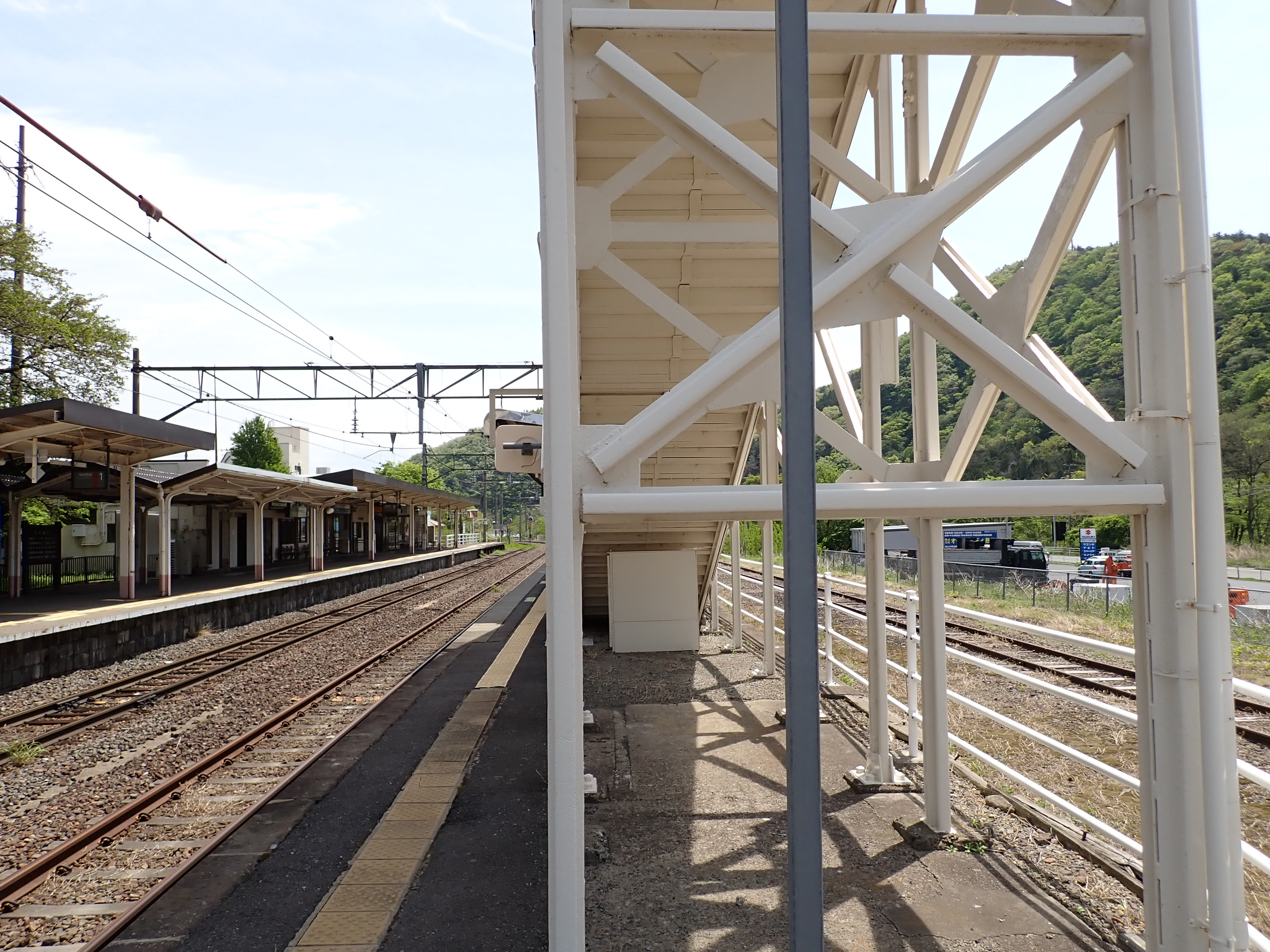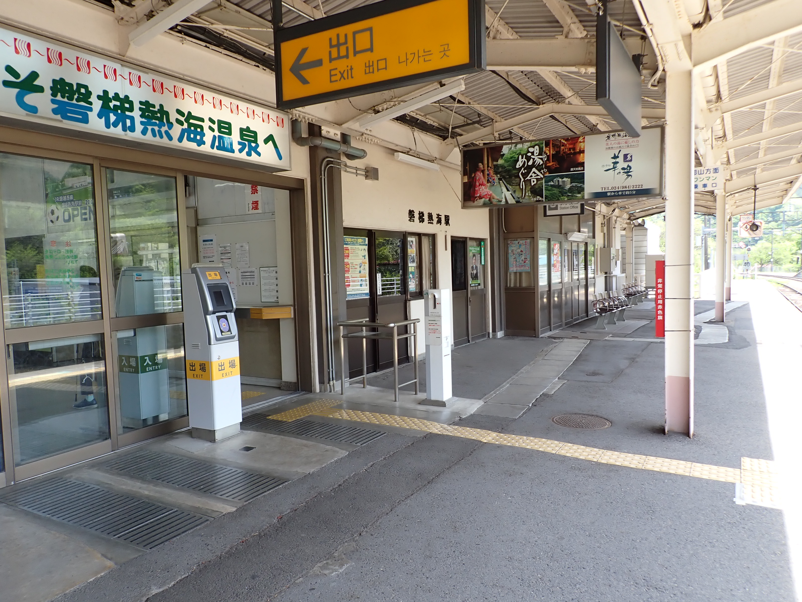 会津若松駅から来ると、この駅近くから開けてきて、この駅を過ぎると急激に広がってくる印象です。駅のそばに磐梯熱海温泉の温泉街が少しありますが、さらに中山宿駅側に進んだ五百川沿いに温泉街が広がっています。跨線橋が印象的な駅です。