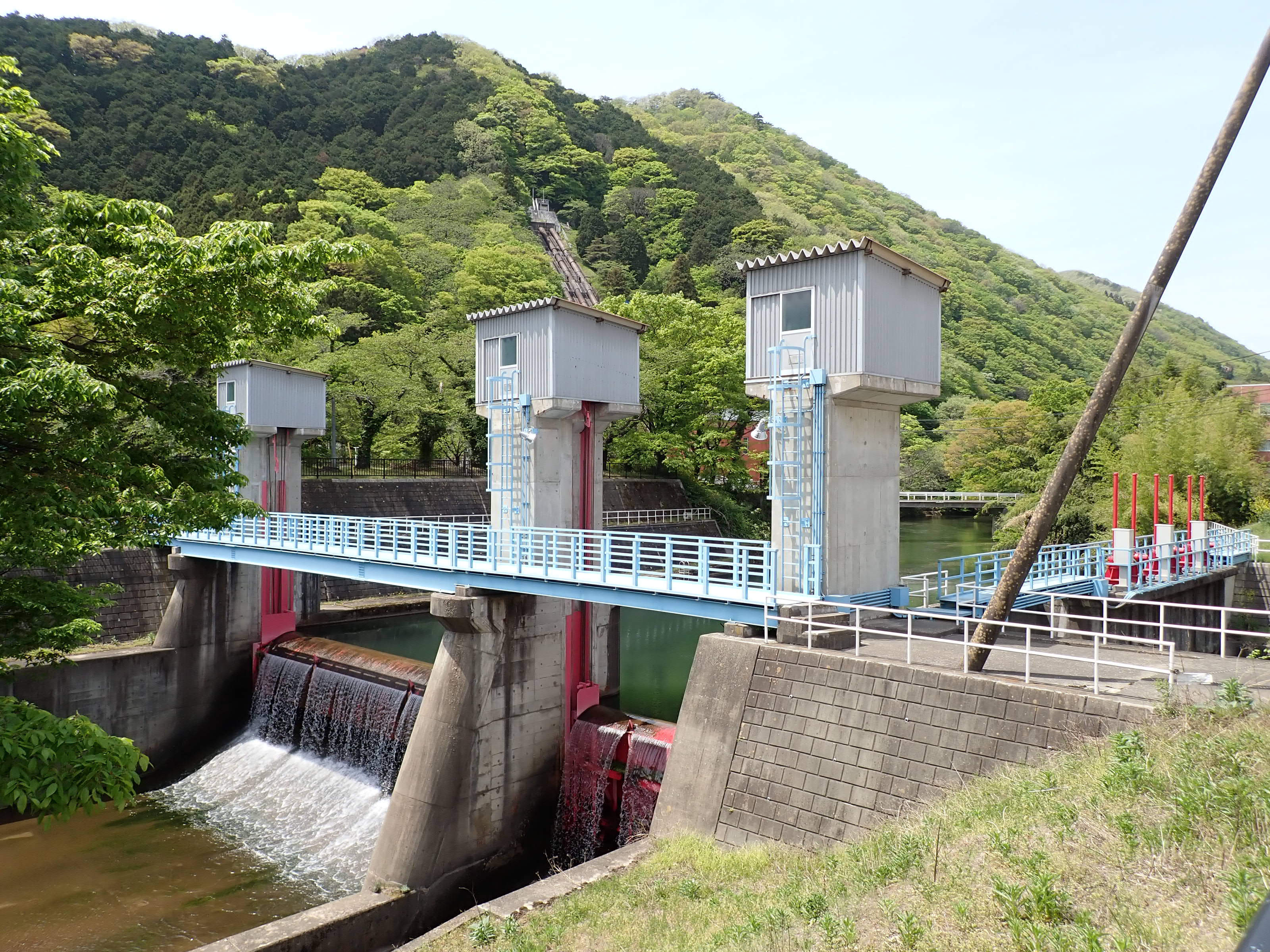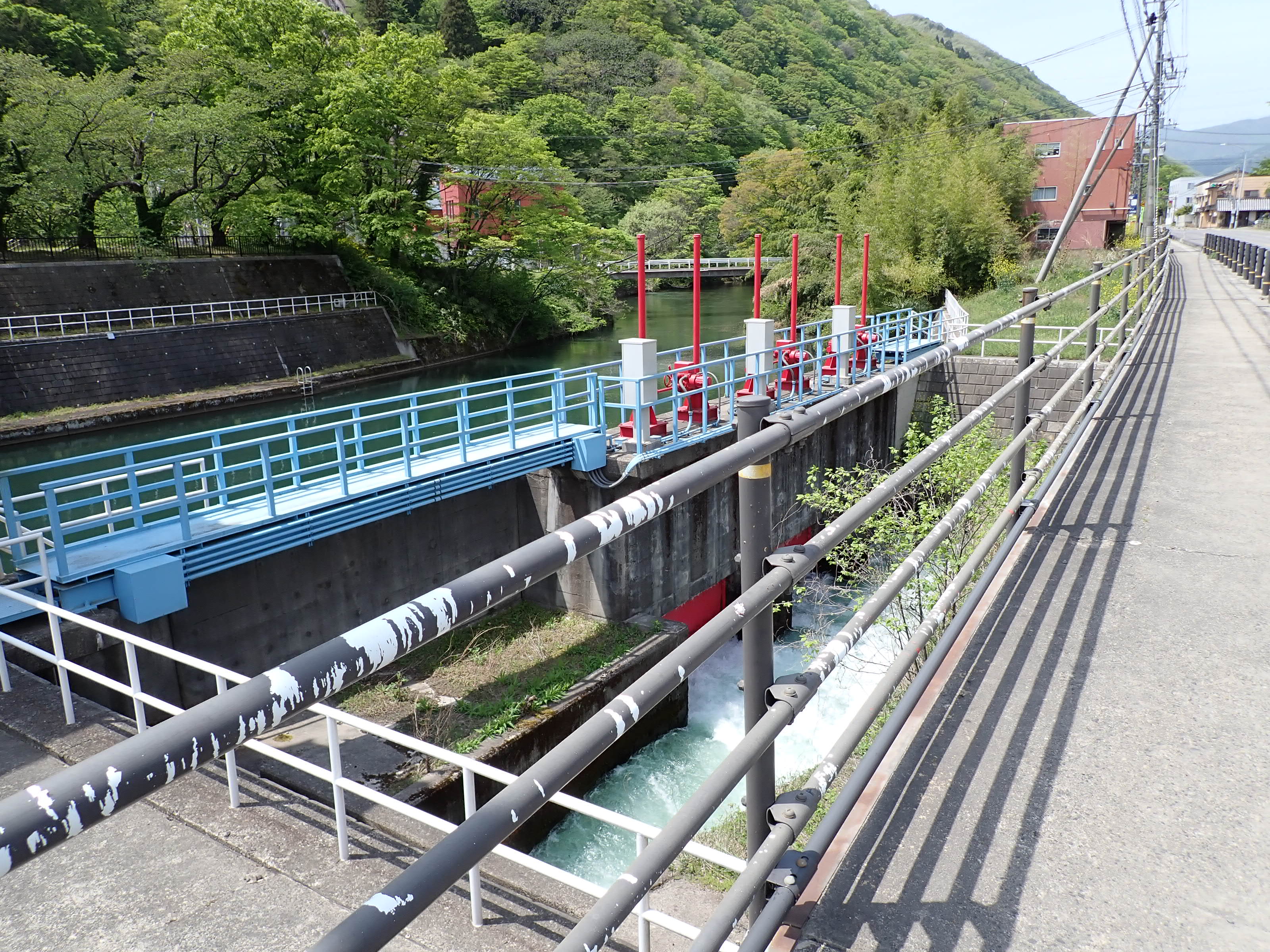 五百川が道路のそばを流れていて、熱海頭首工があります。
