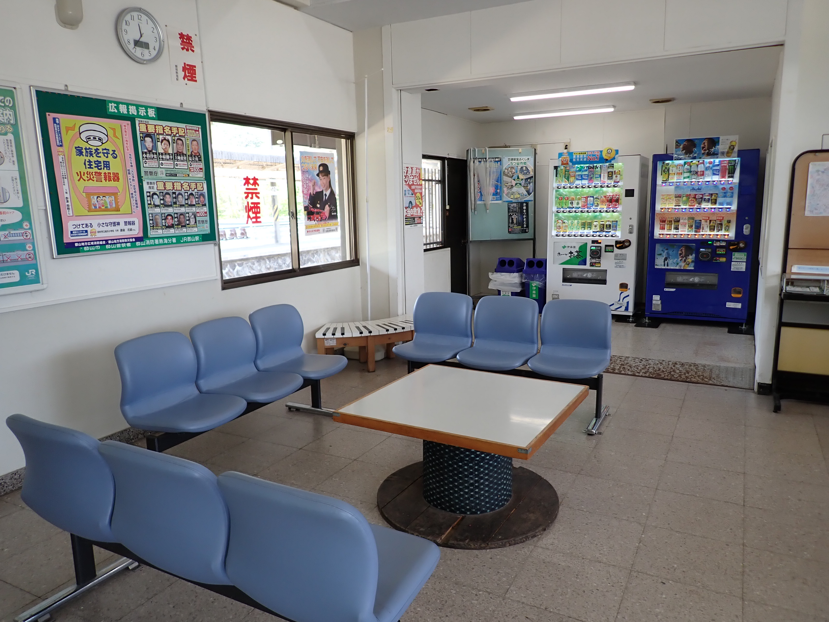 2番線の待合室とその付近の乗車位置案内・柱の駅名標、待合室内の様子。