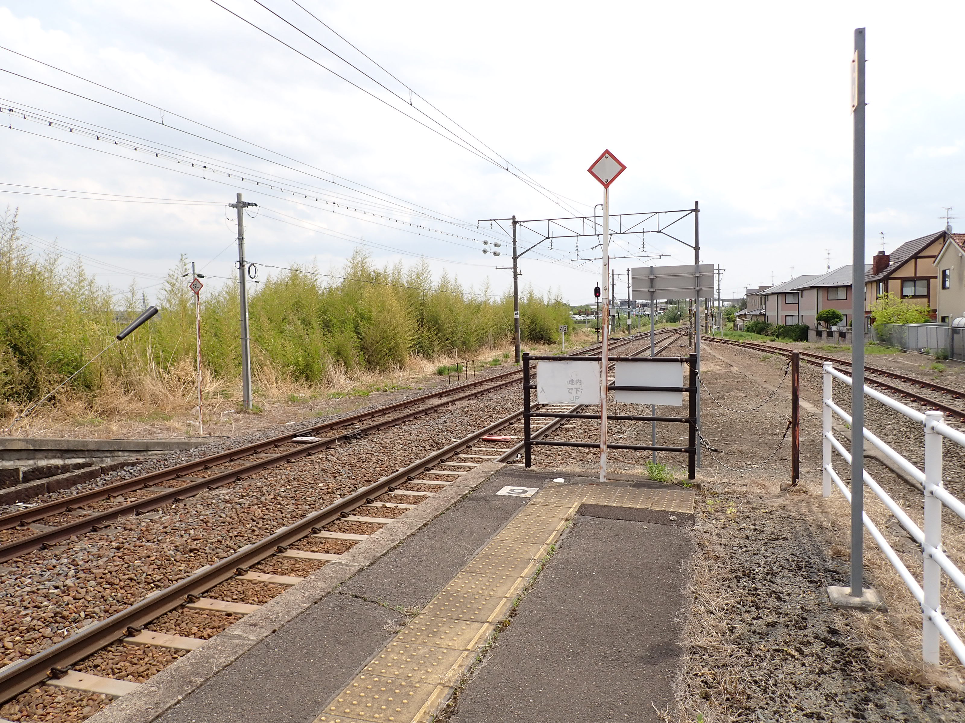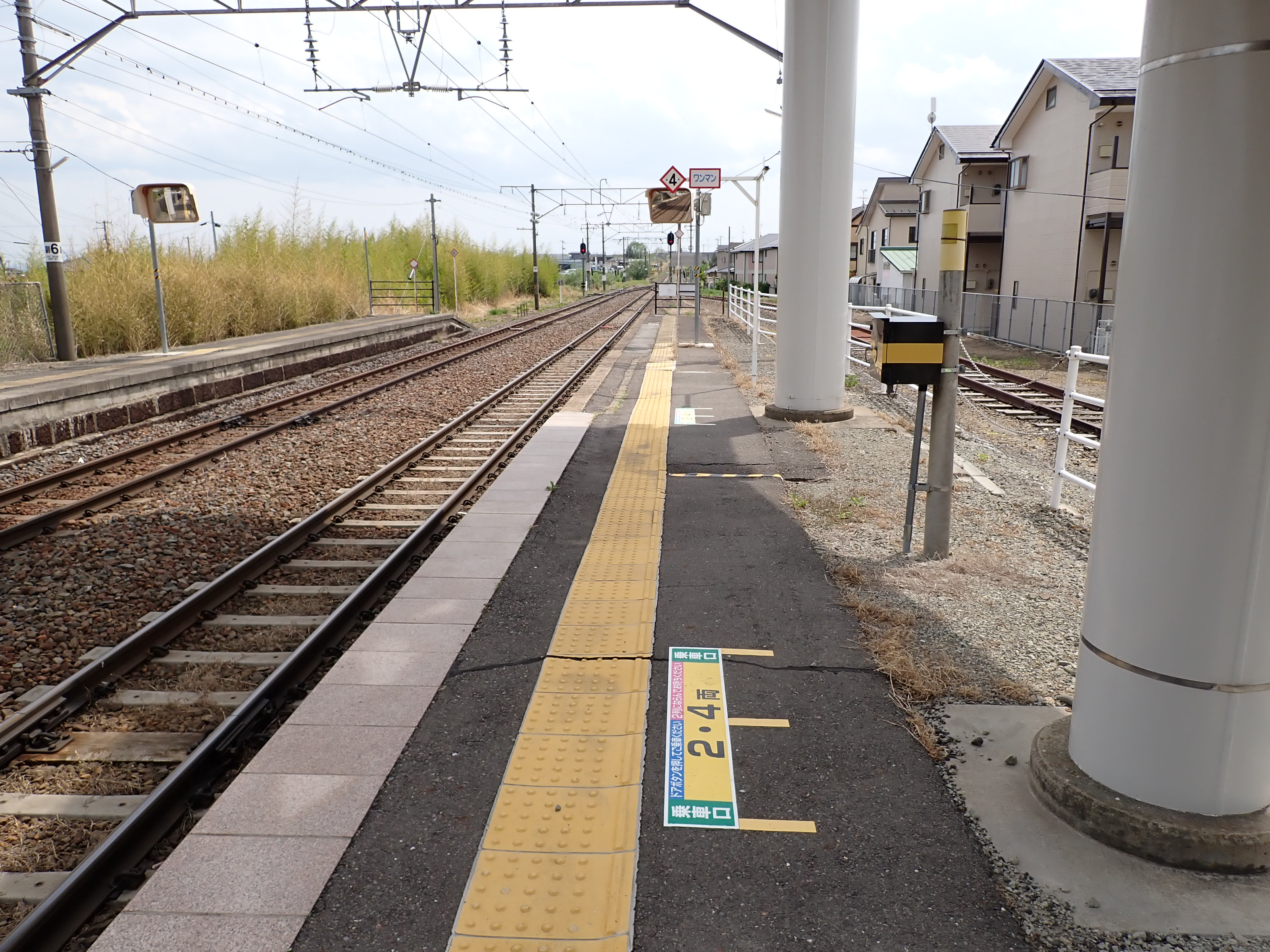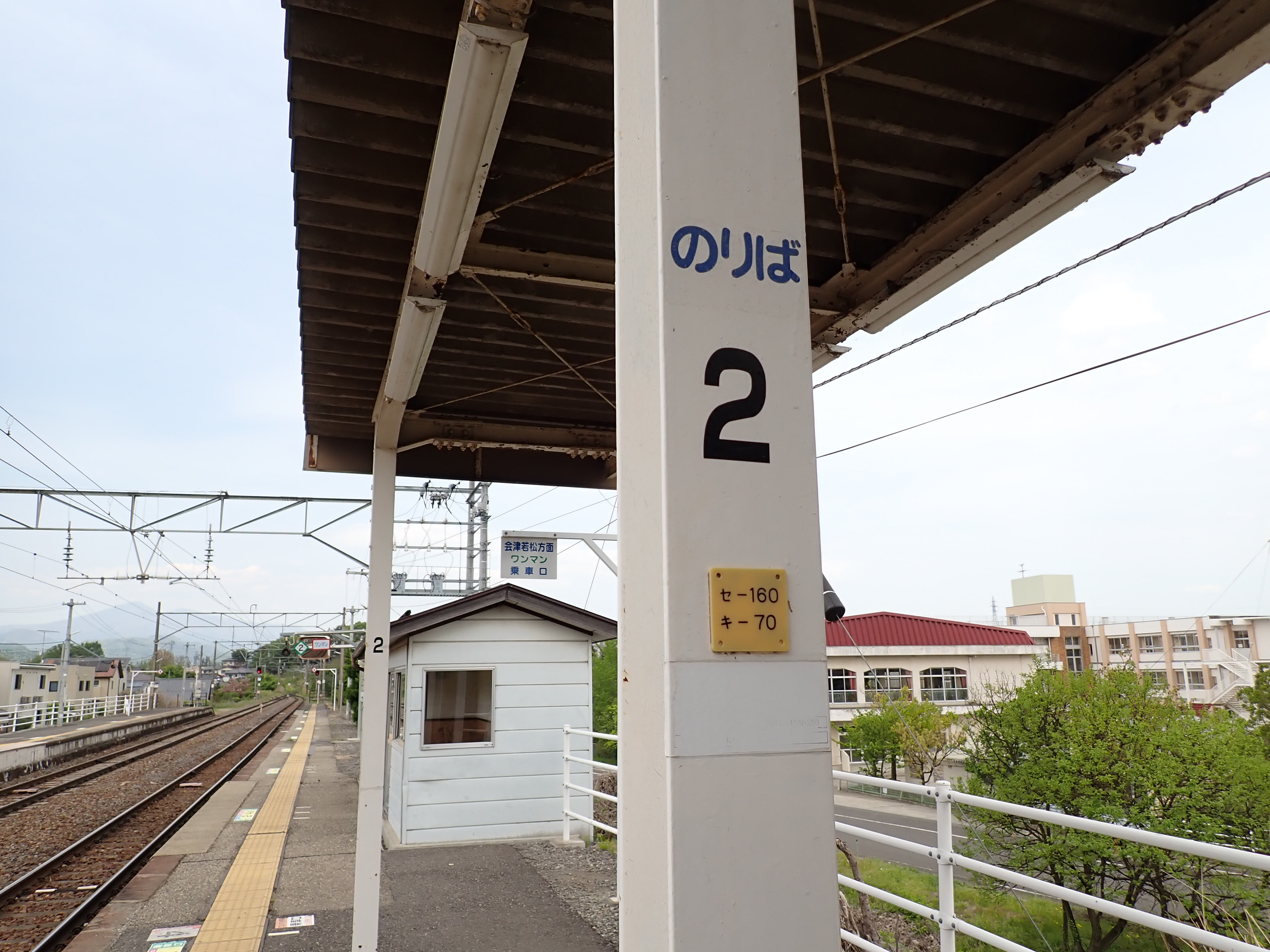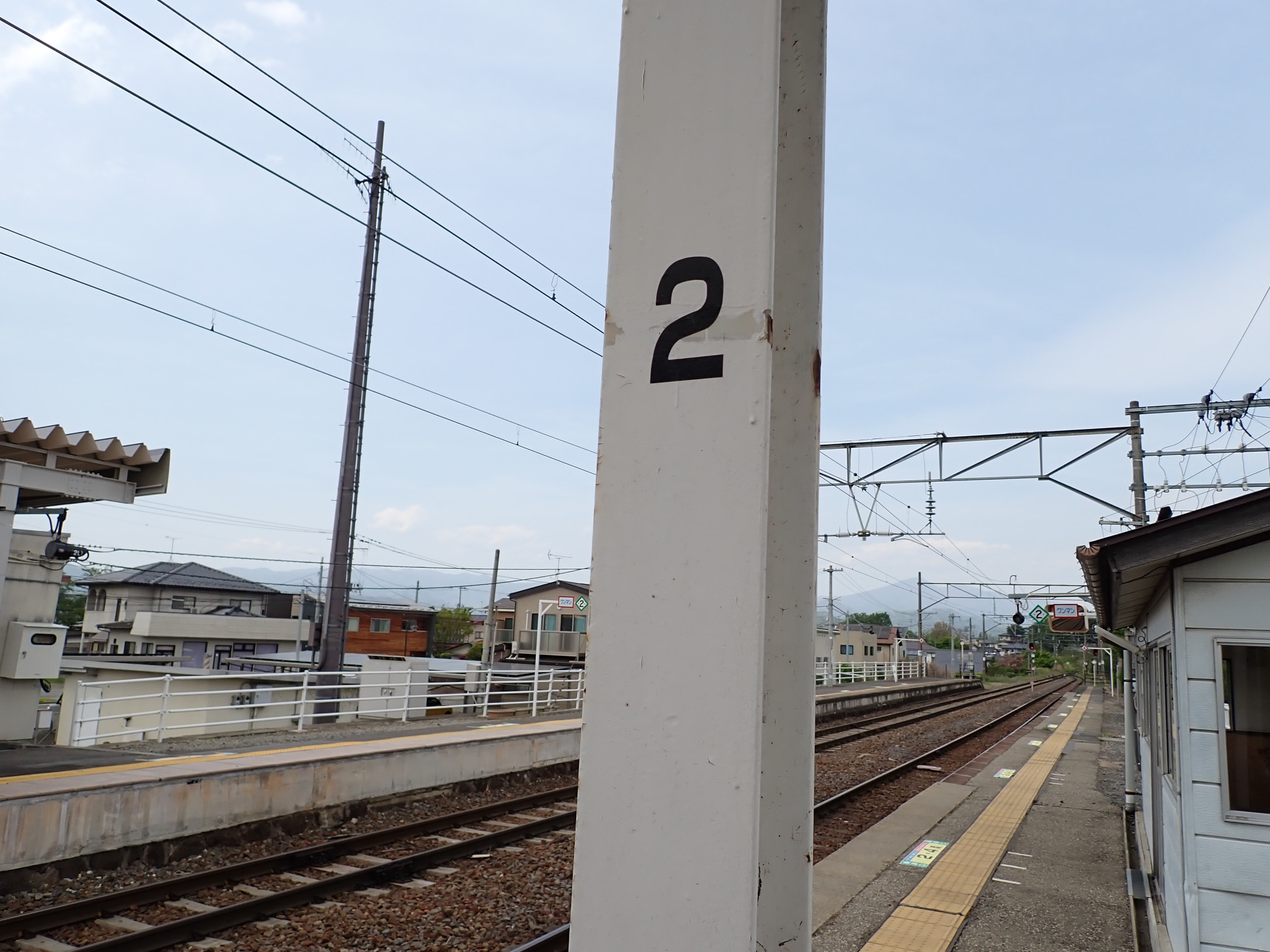 駅舎のホーム側、番線標と柱の駅名標。