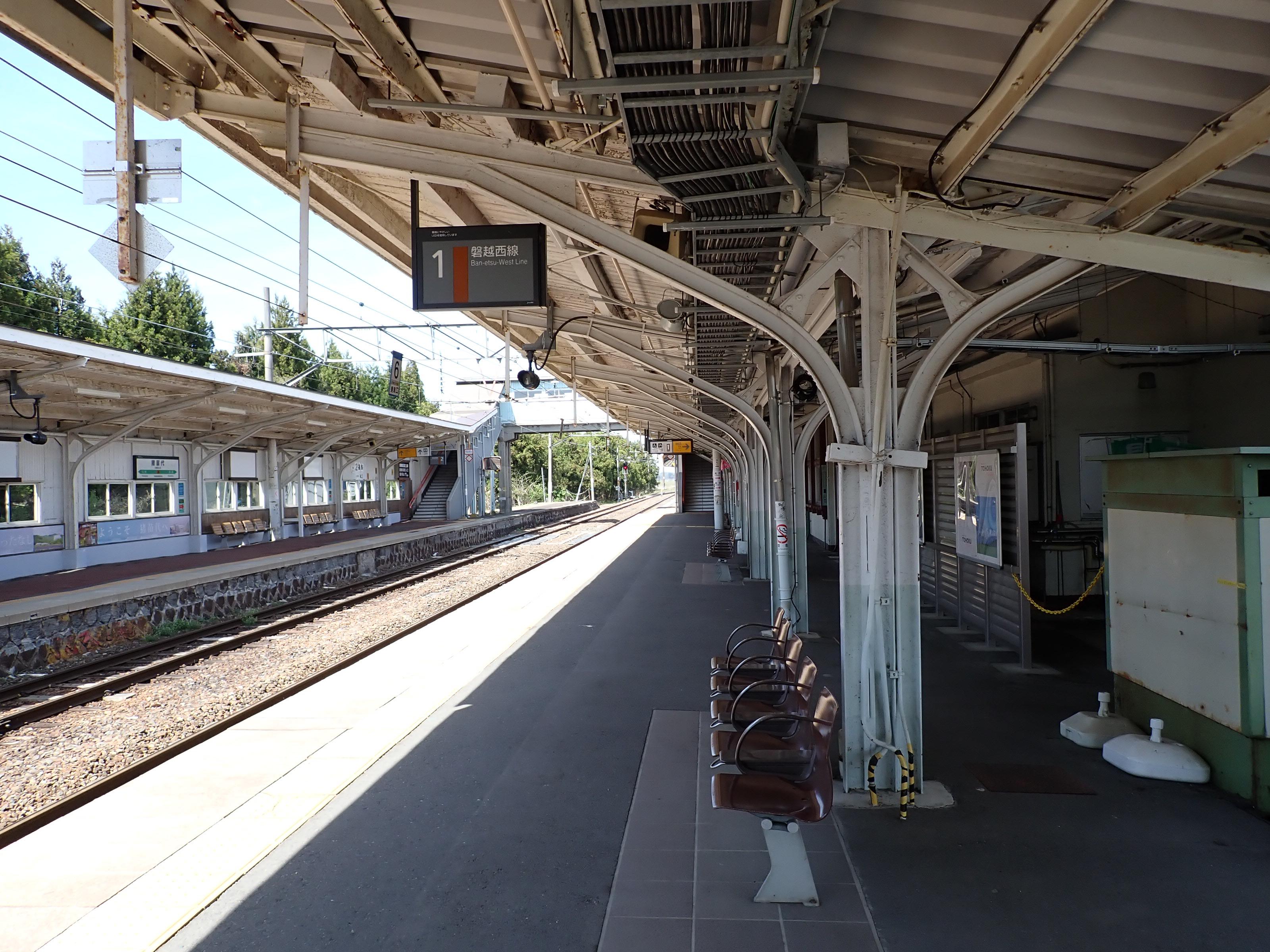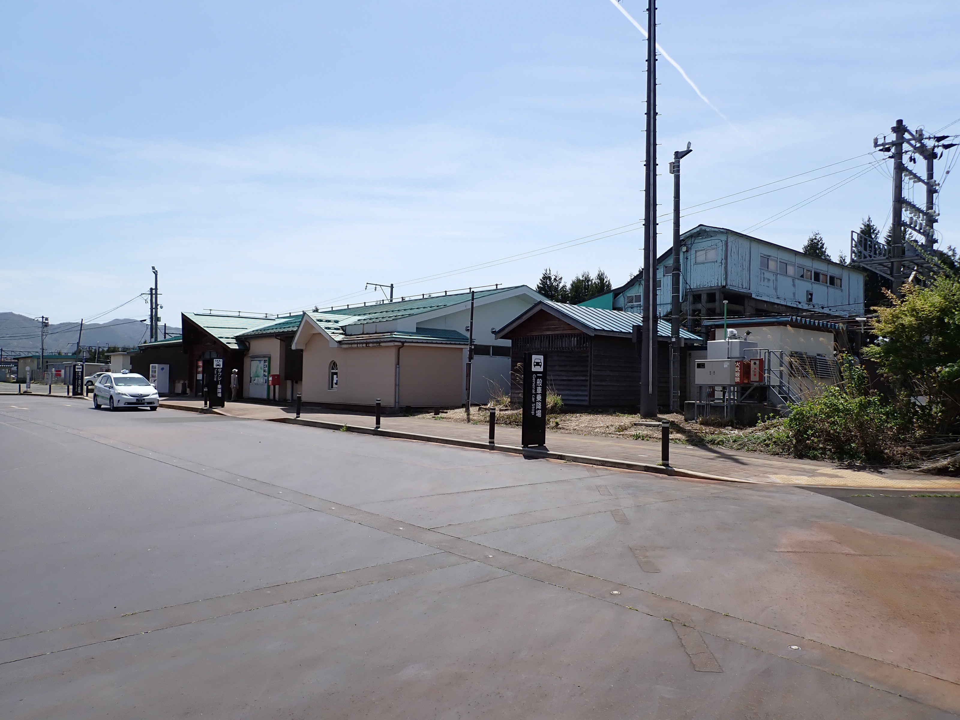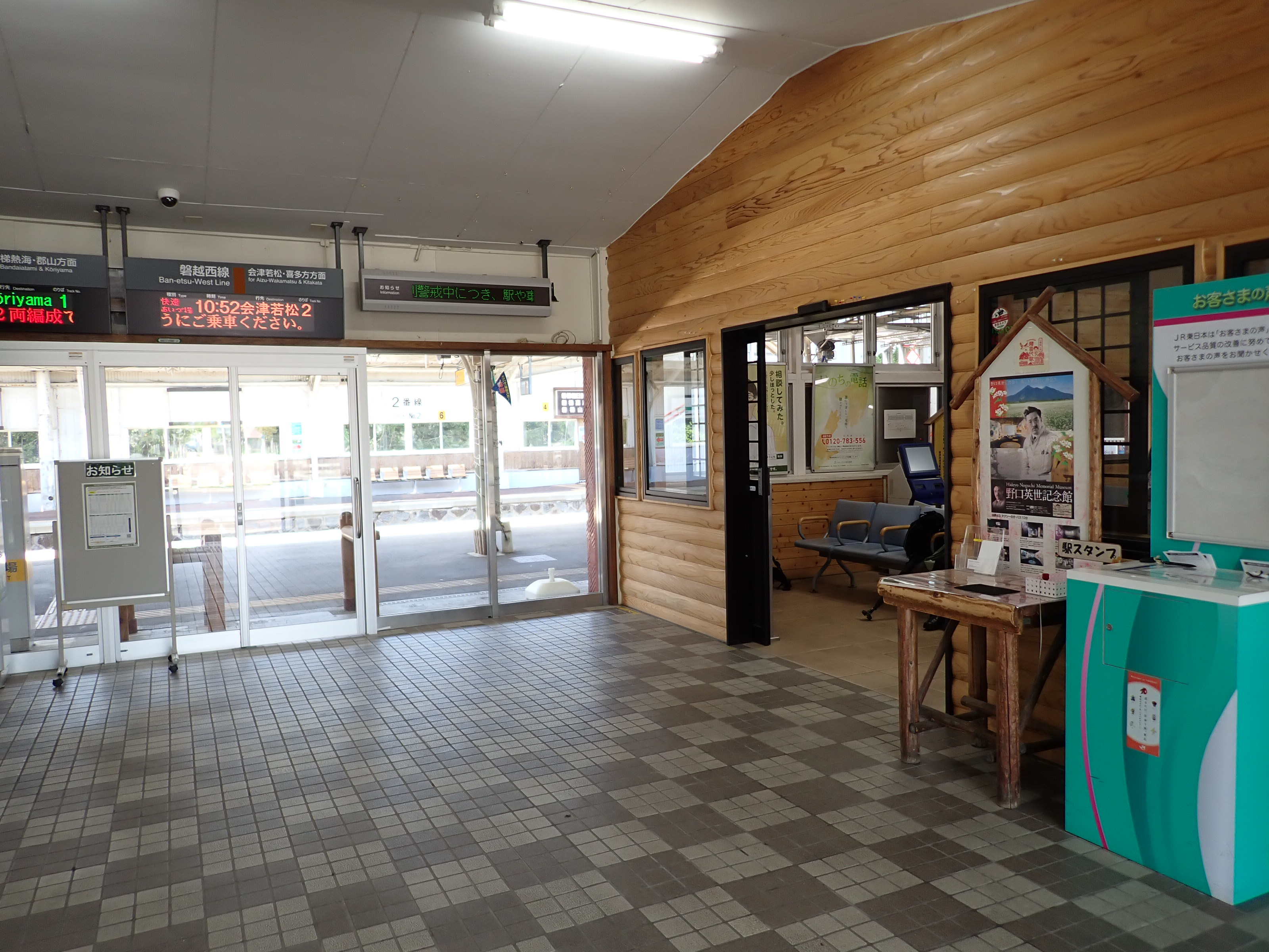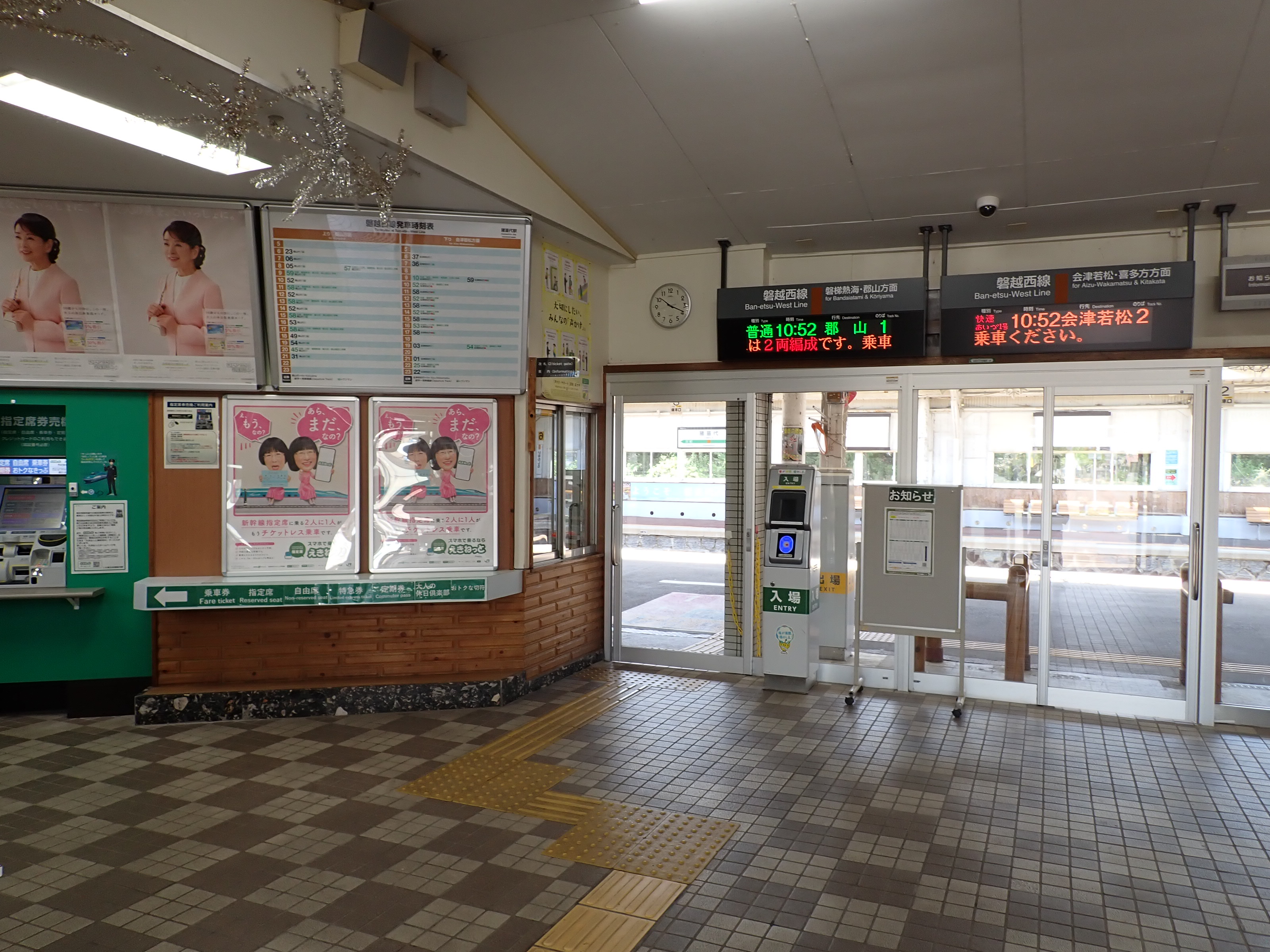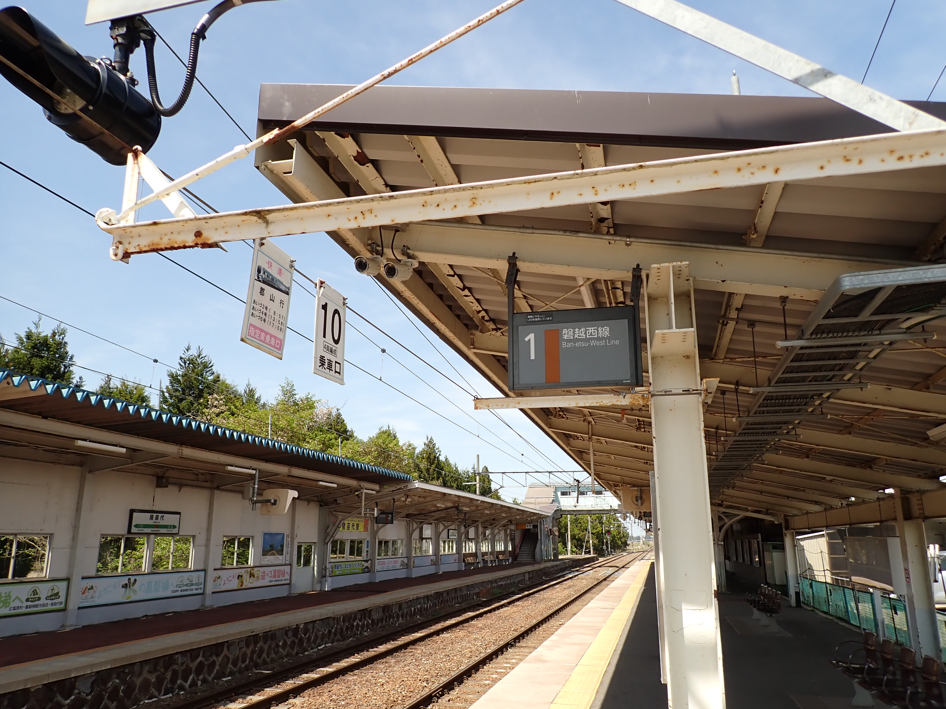 猪苗代湖に近く、また、磐梯朝日国立公園・磐梯高原・磐梯山などへの多くの観光客で賑わう駅です。駅前は観光地らしい佇まいです。両ホームとも上屋と跨線橋の接続部分に特徴がある造りです。