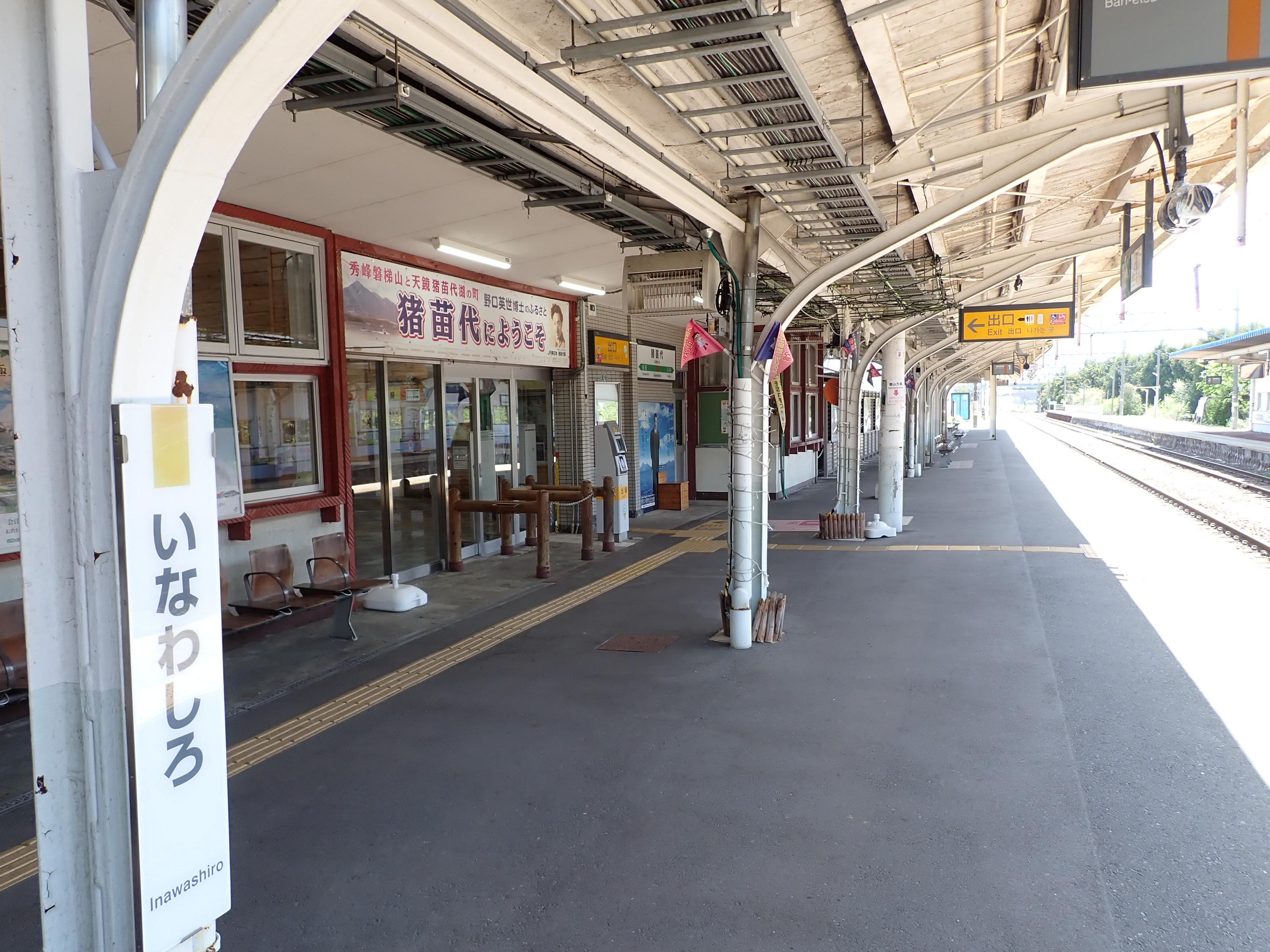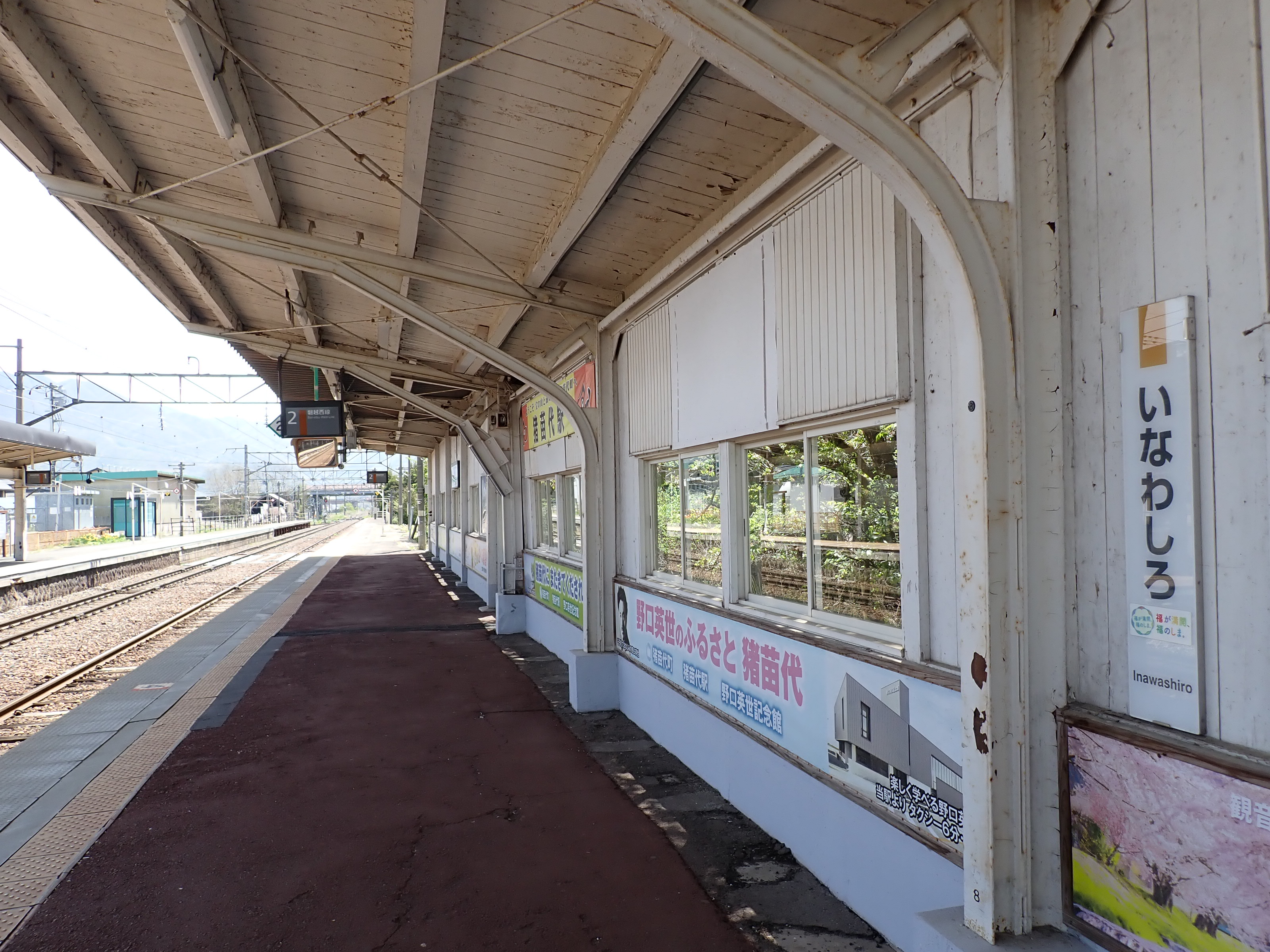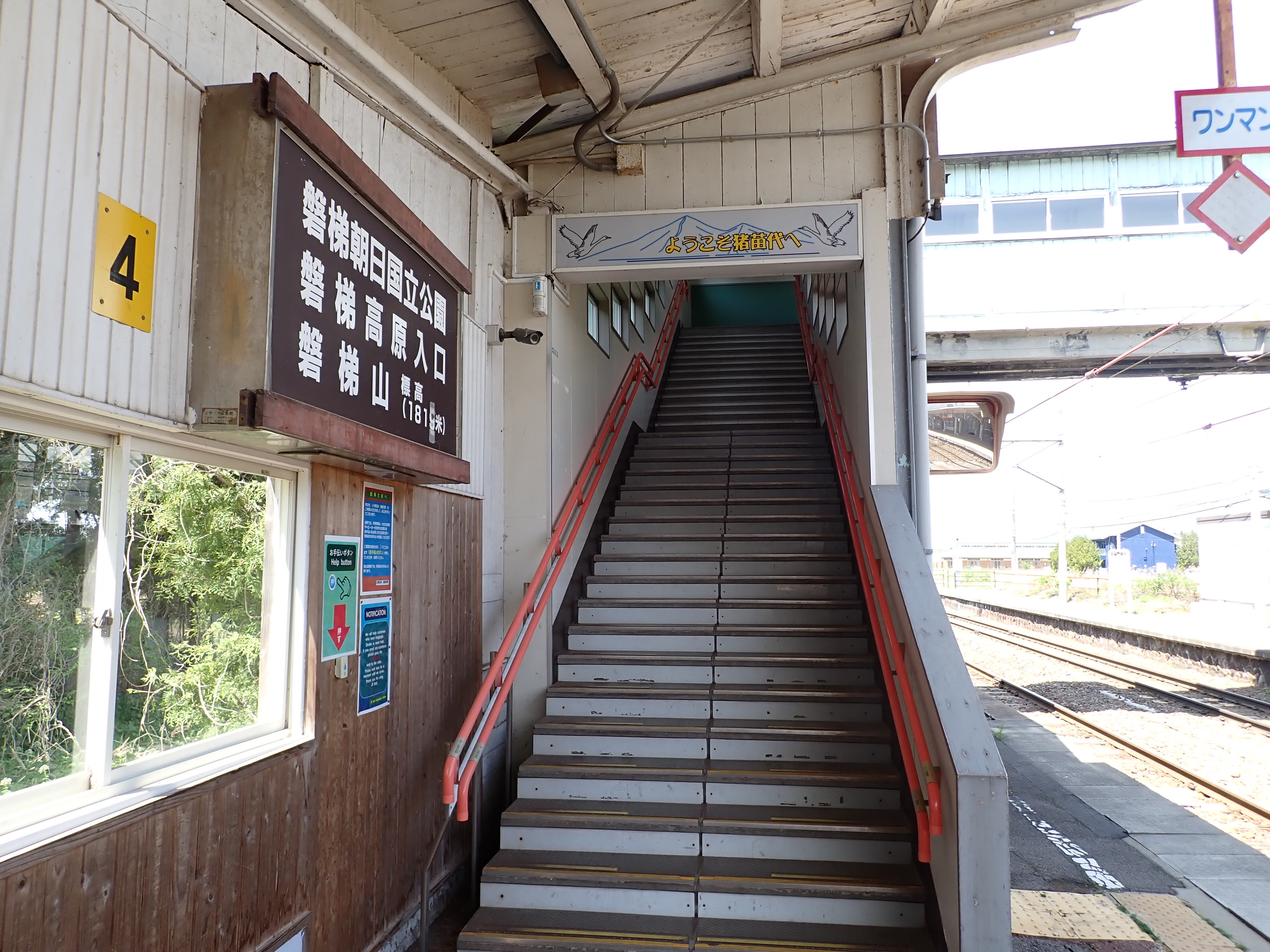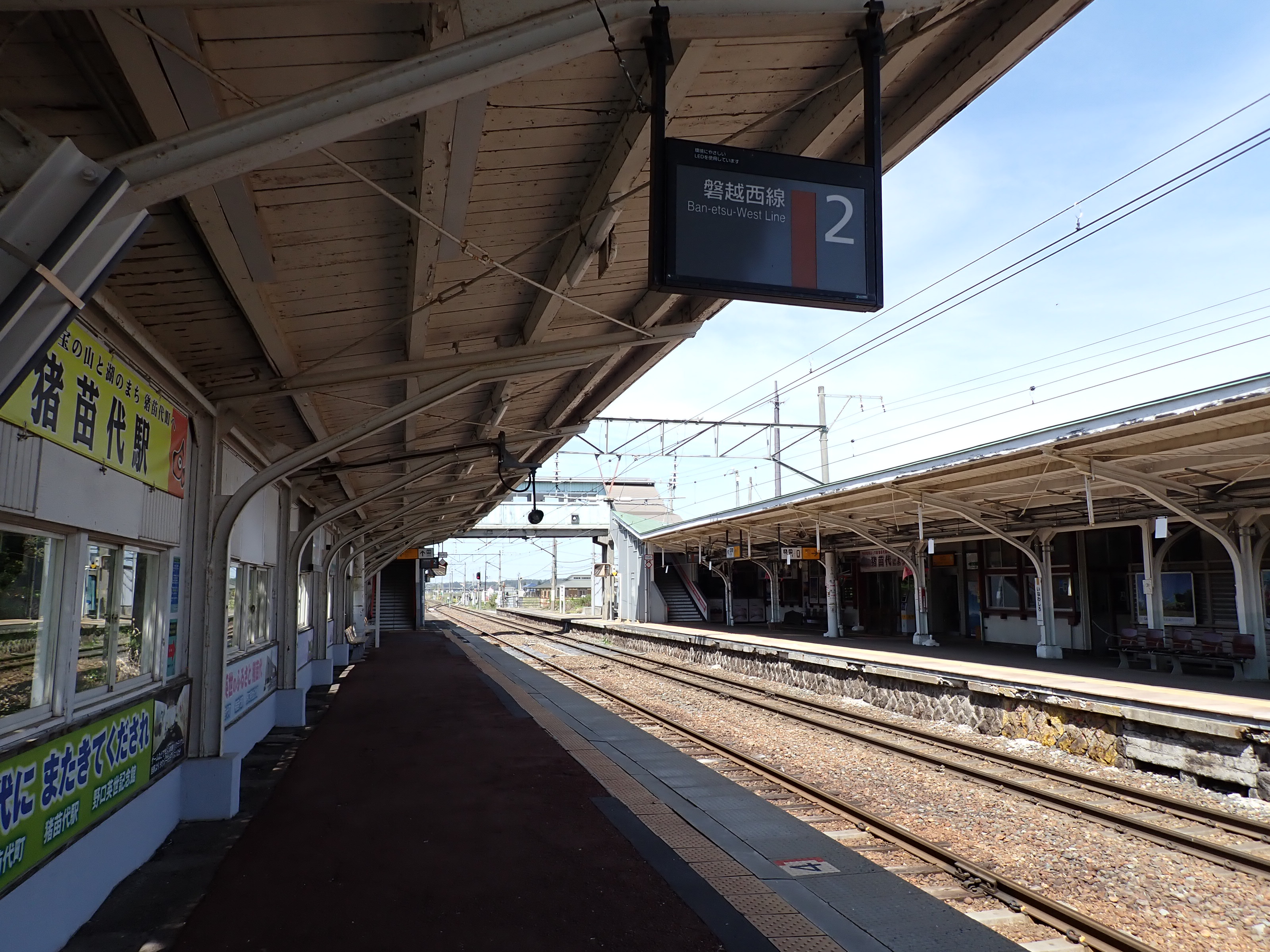 猪苗代湖に近く、また、磐梯朝日国立公園・磐梯高原・磐梯山などへの多くの観光客で賑わう駅です。駅前は観光地らしい佇まいです。両ホームとも上屋と跨線橋の接続部分に特徴がある造りです。