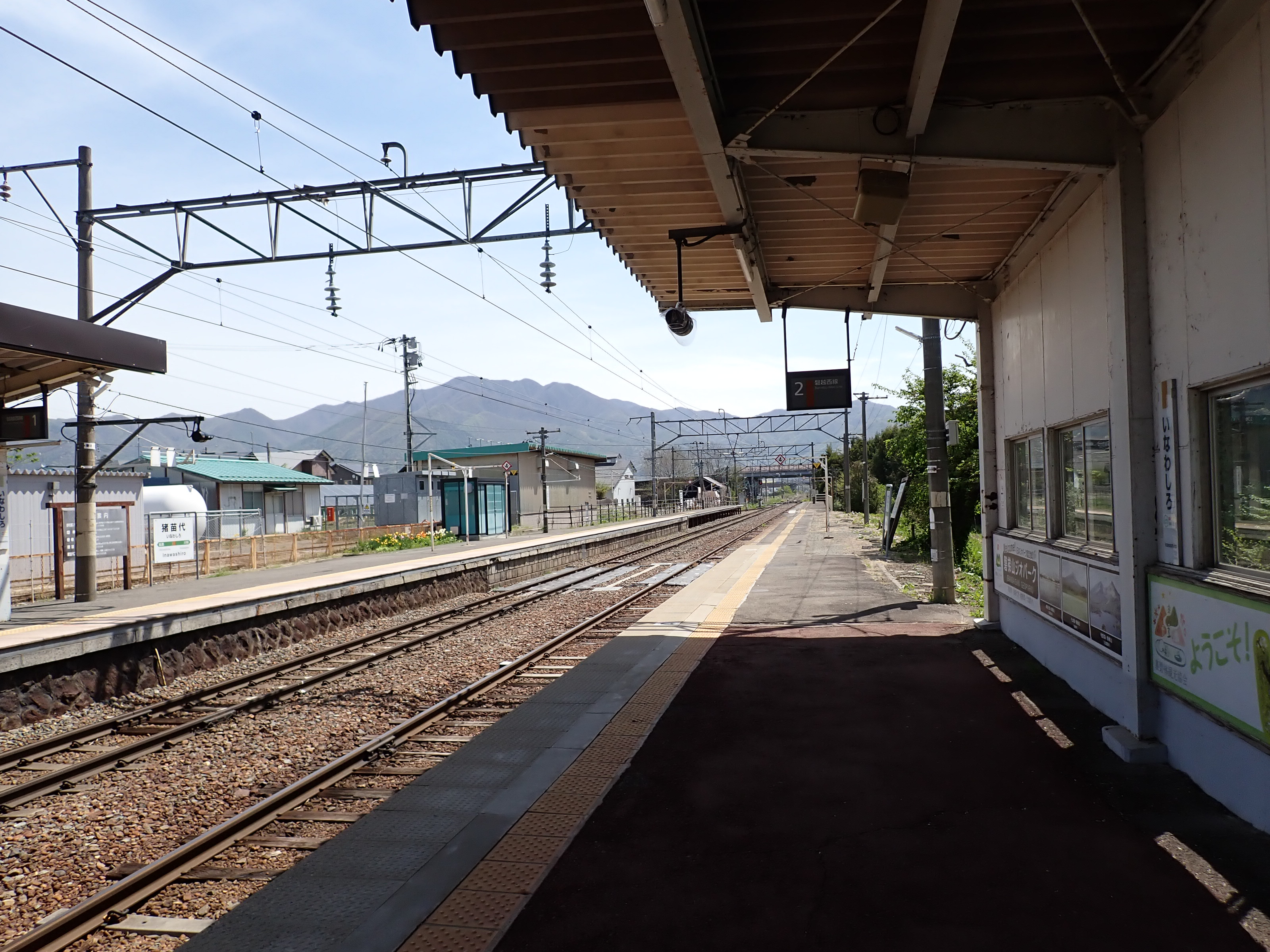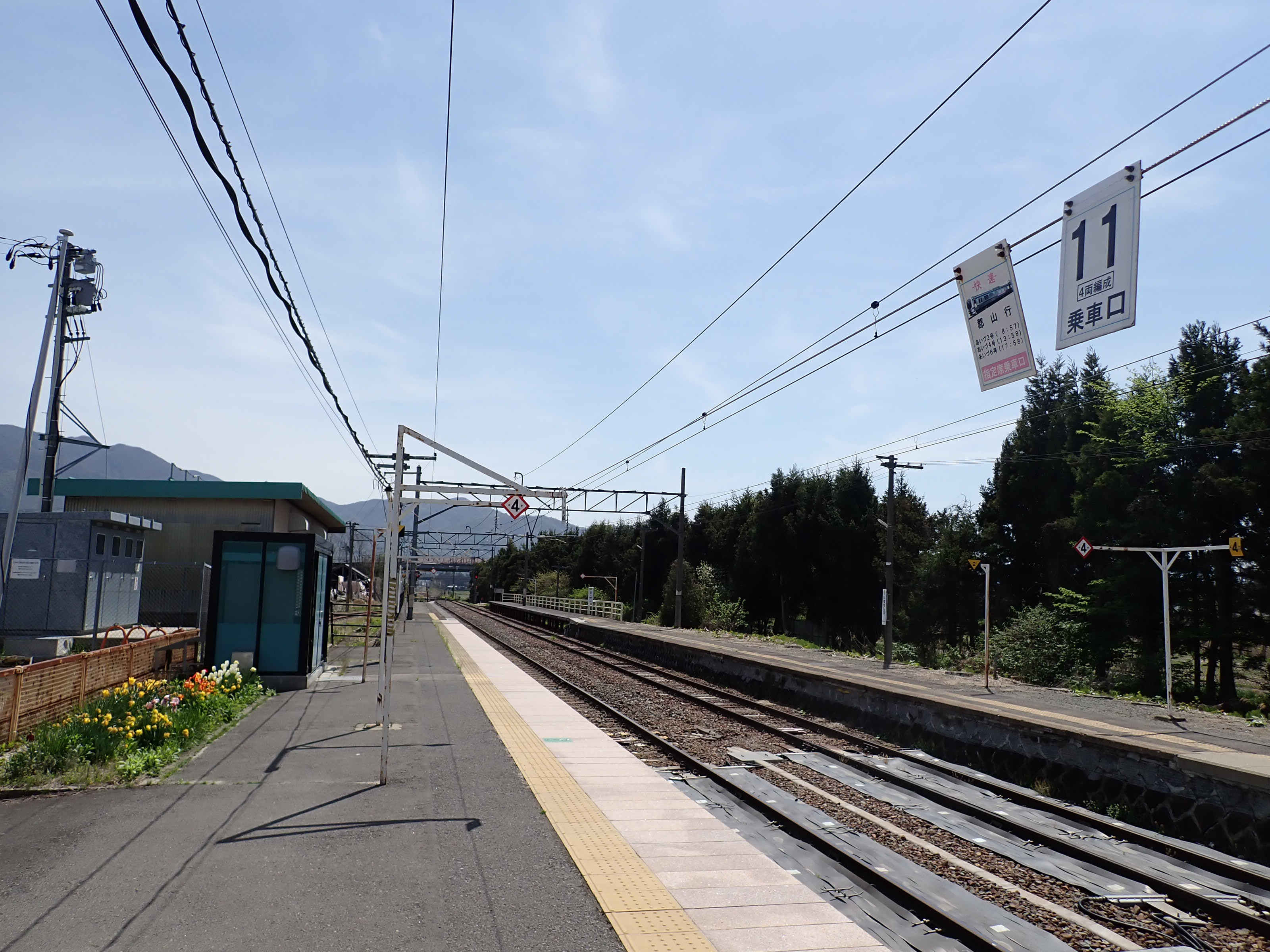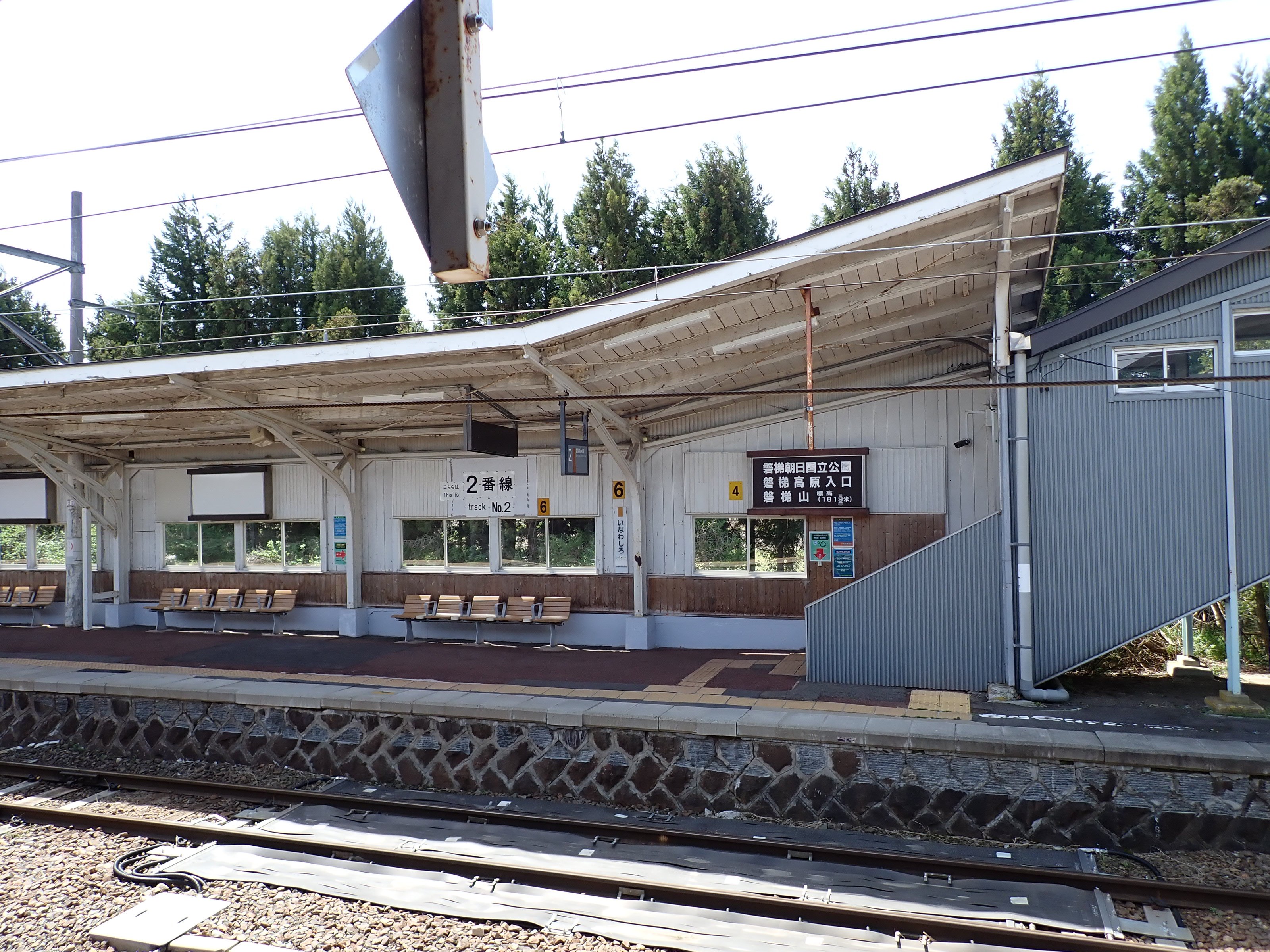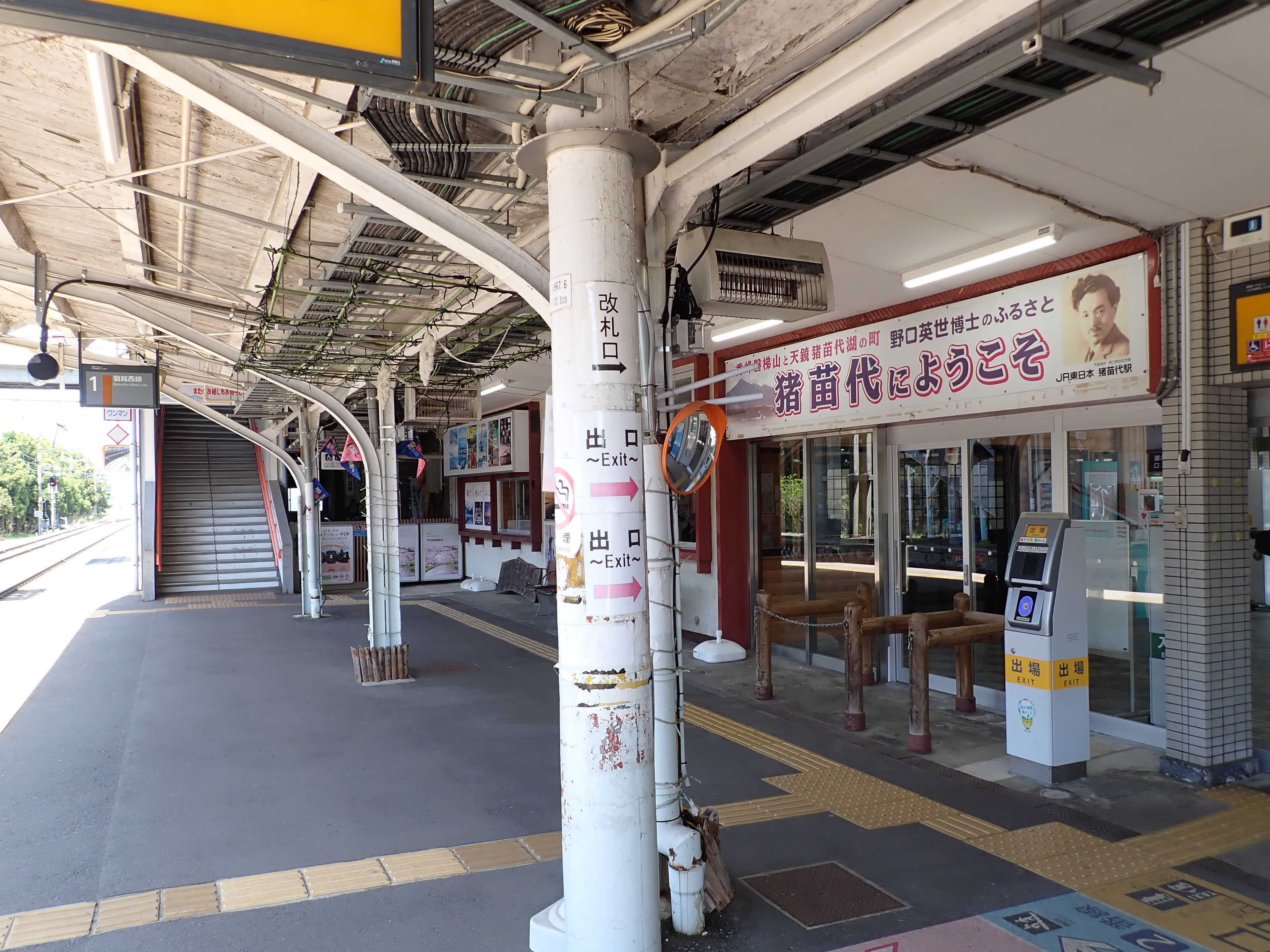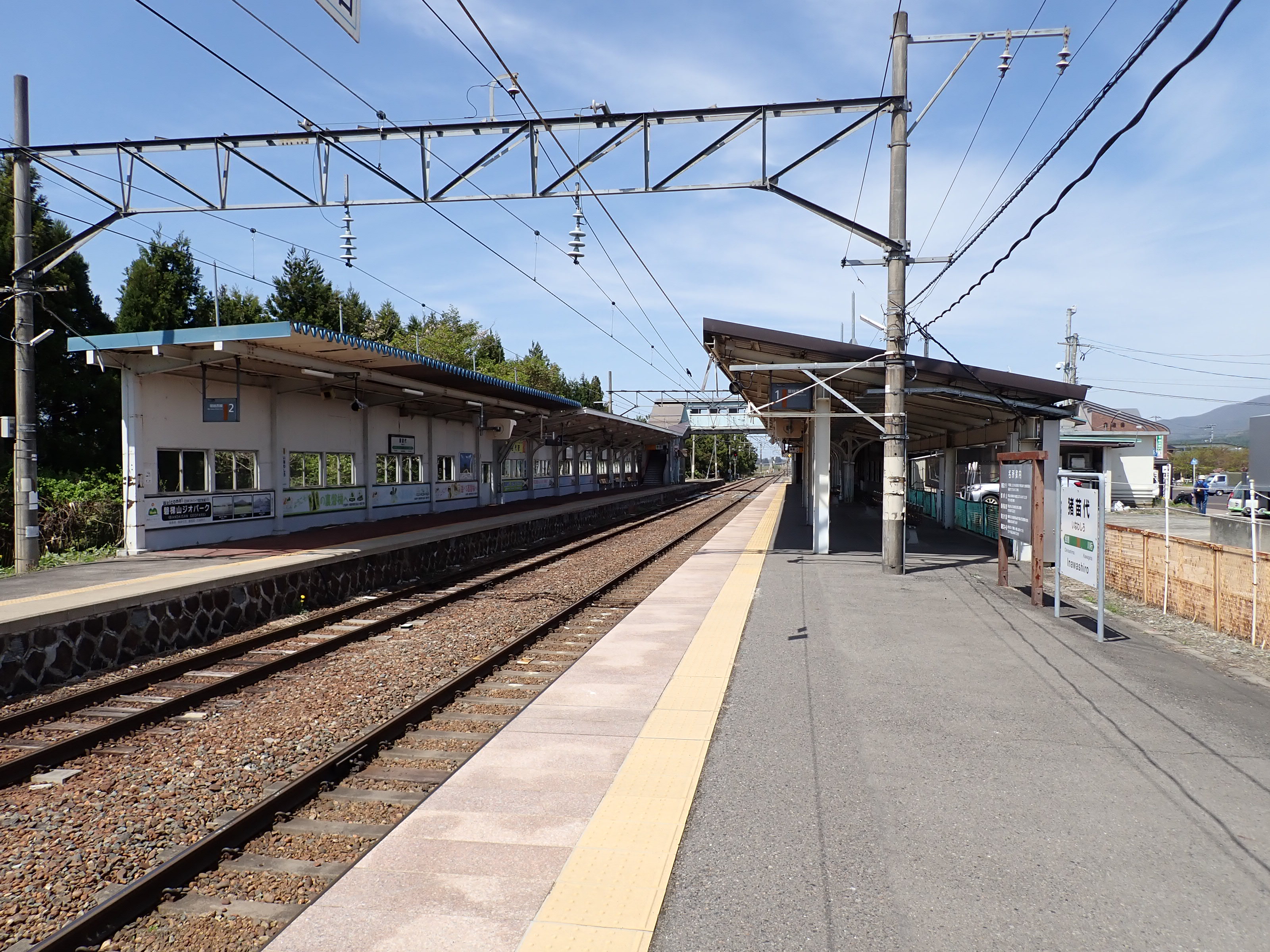 猪苗代湖に近く、また、磐梯朝日国立公園・磐梯高原・磐梯山などへの多くの観光客で賑わう駅です。駅前は観光地らしい佇まいです。両ホームとも上屋と跨線橋の接続部分に特徴がある造りです。