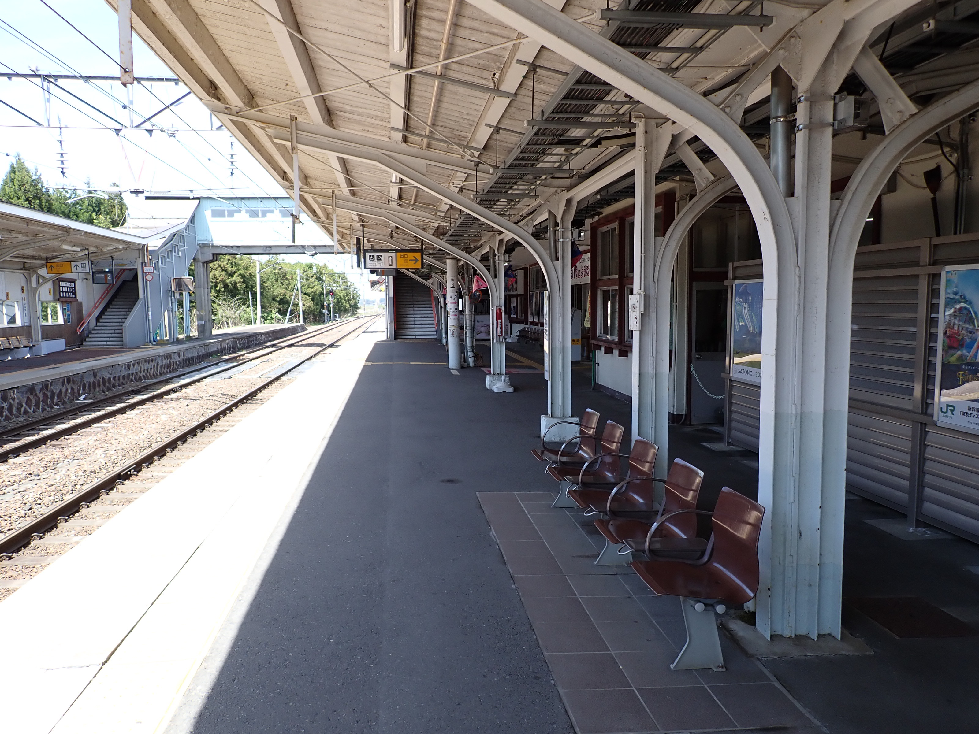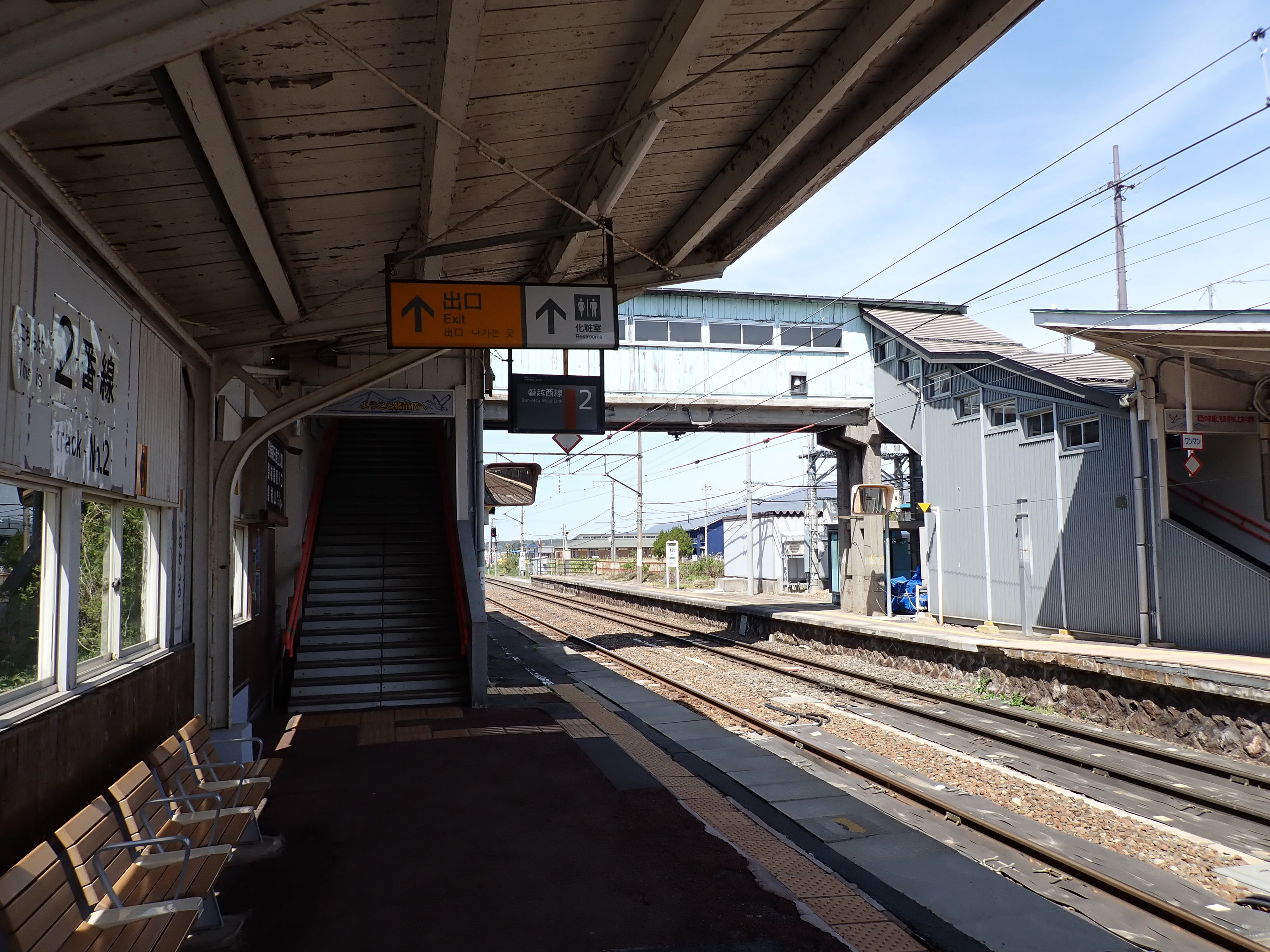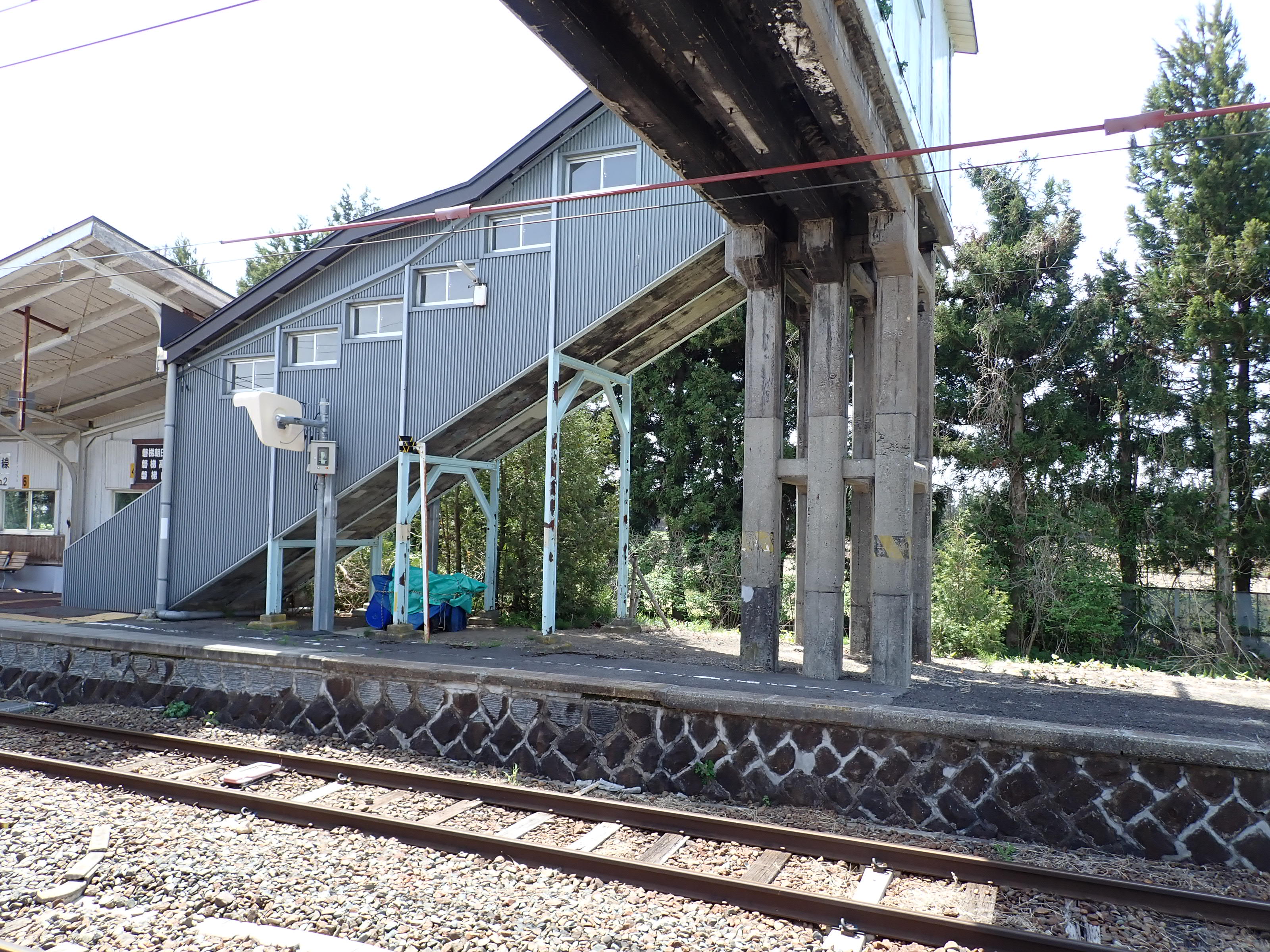 2番線から見た駅舎。上屋が跨線橋に向かって高くなっています。