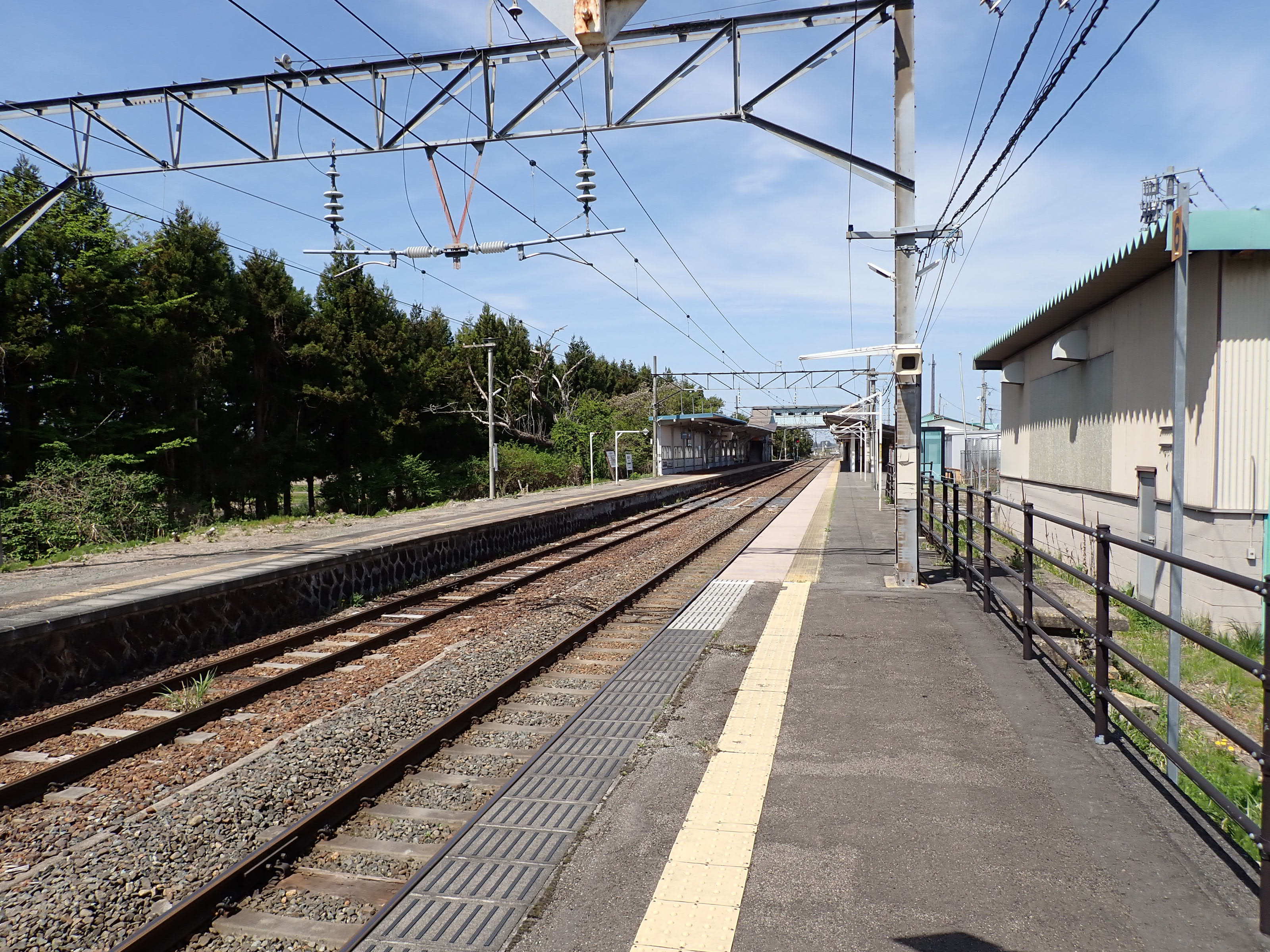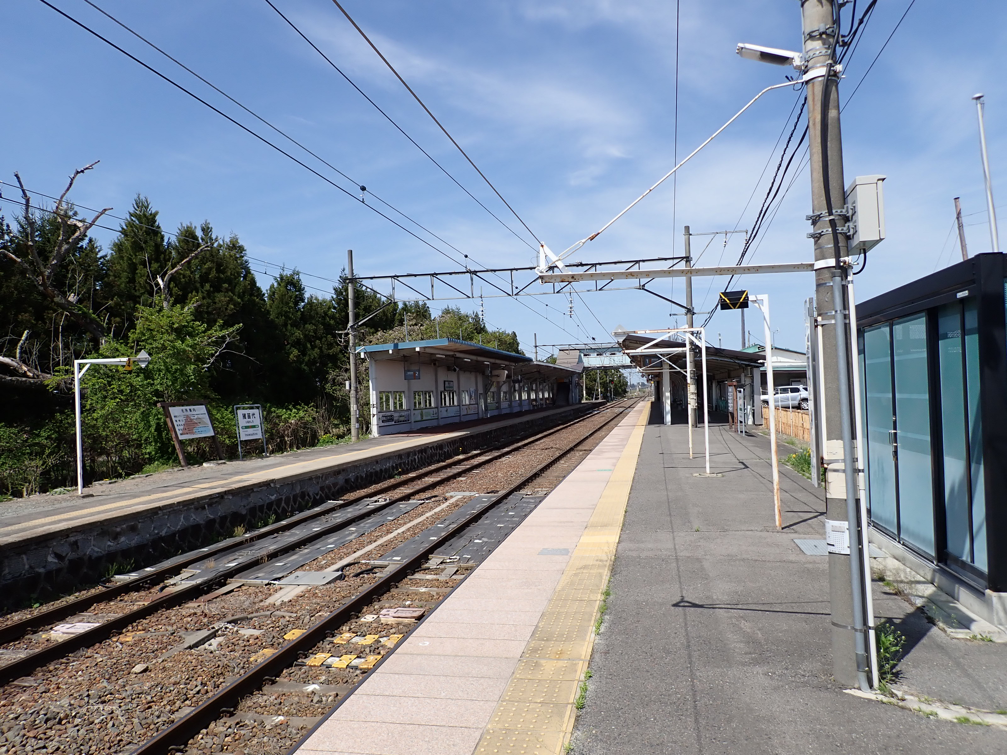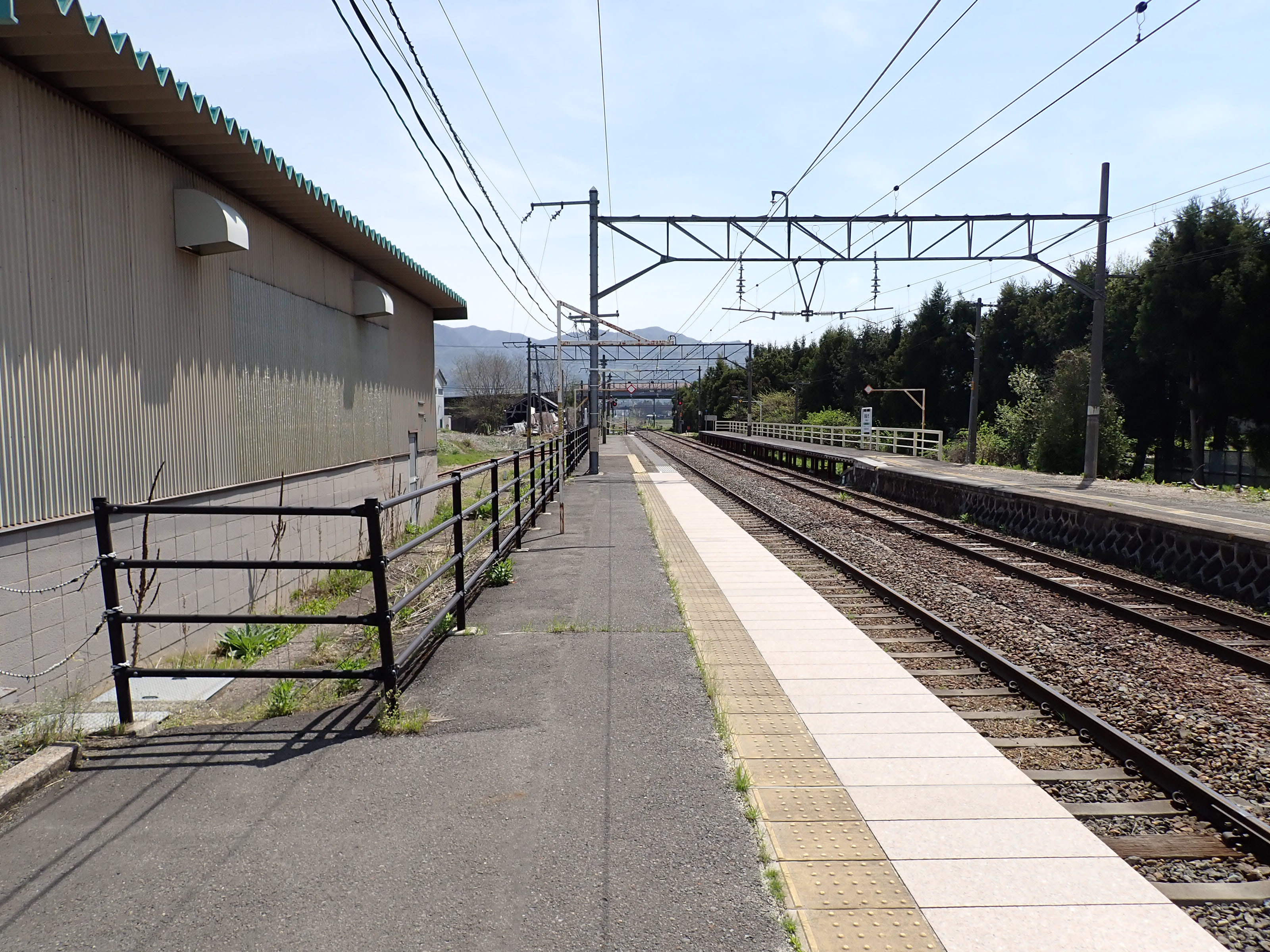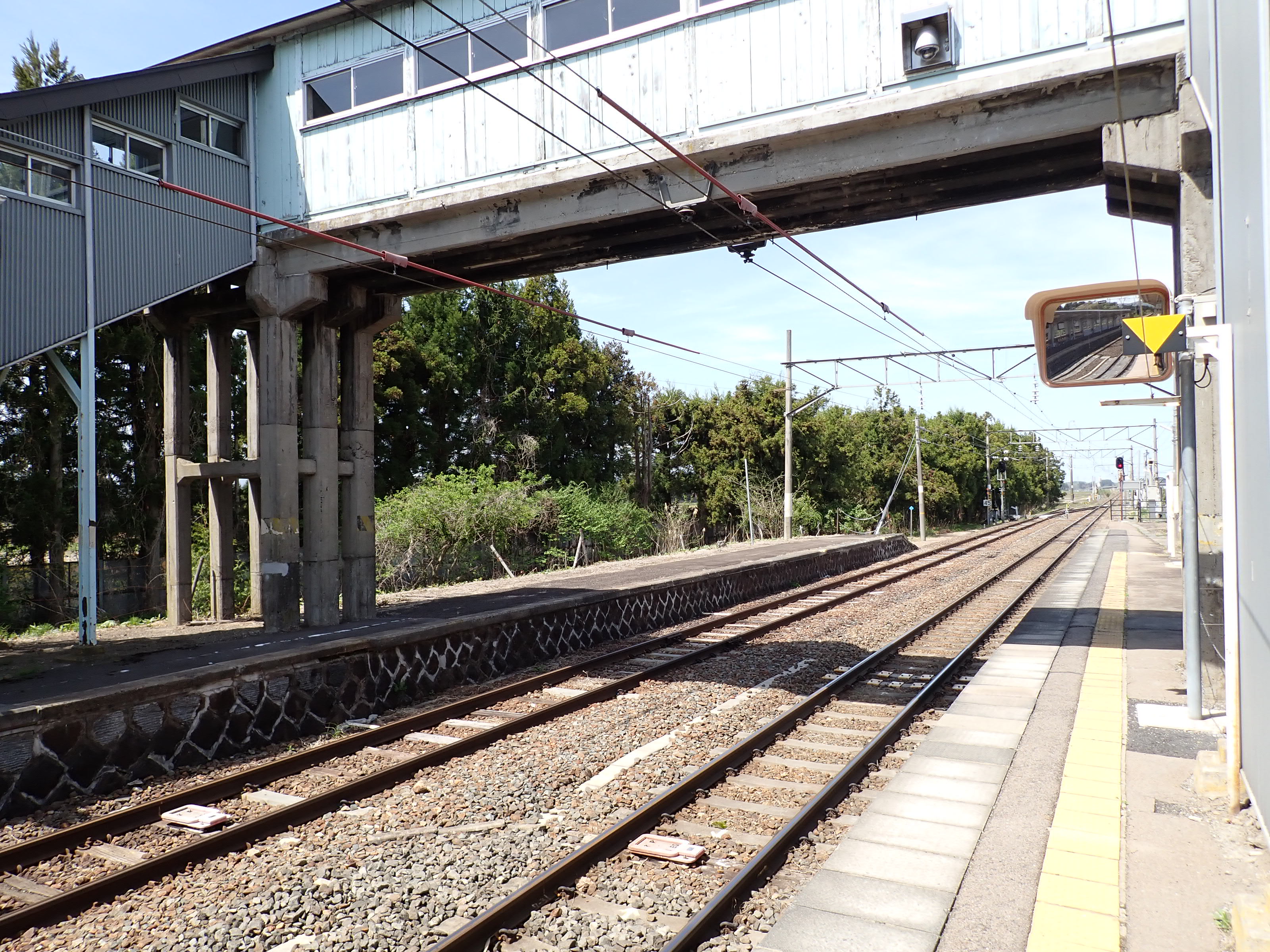 2番線から見た駅舎。上屋が跨線橋に向かって高くなっています。