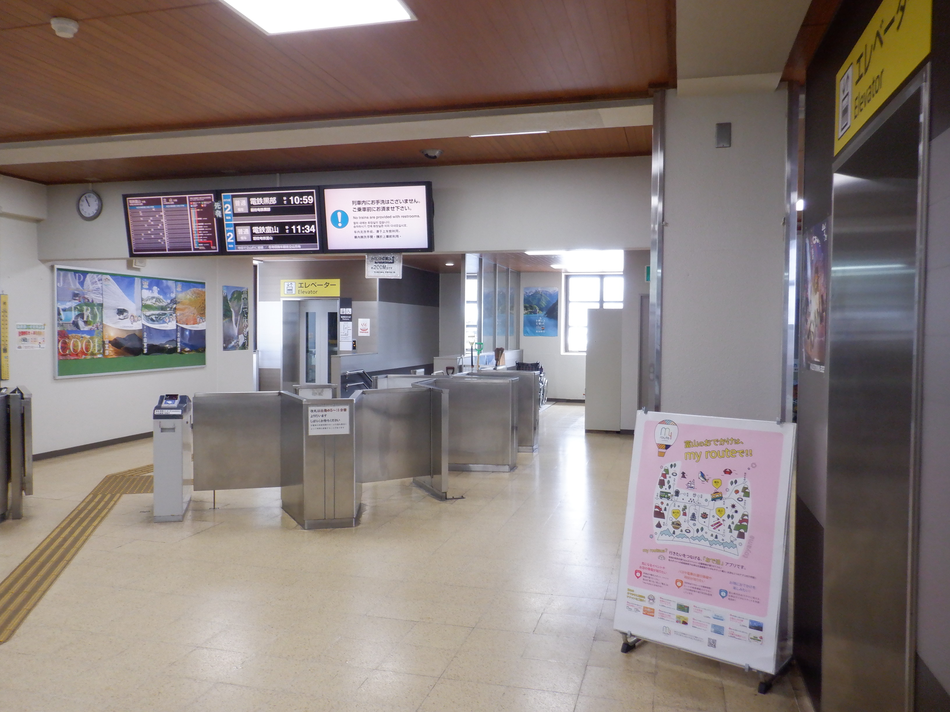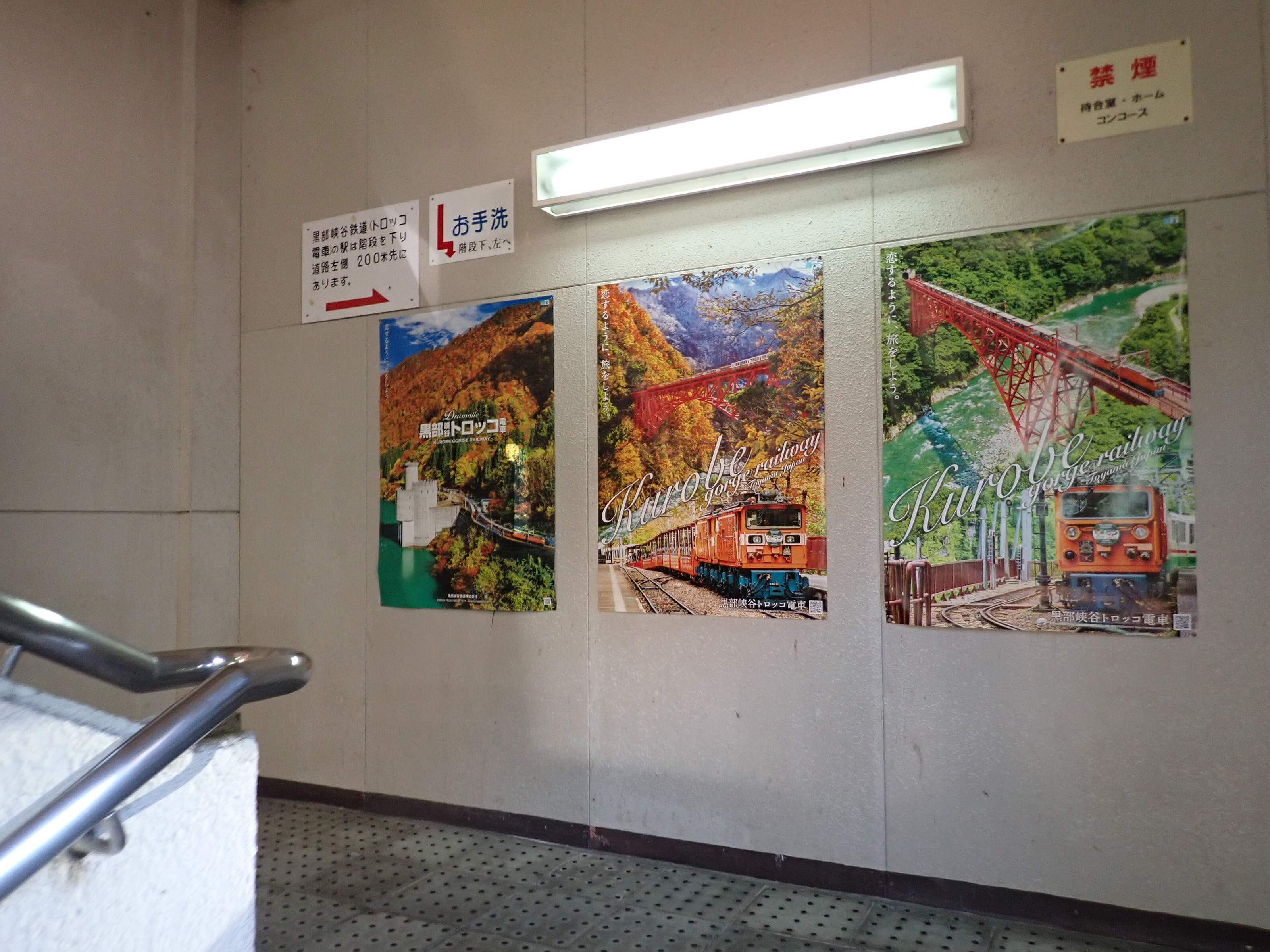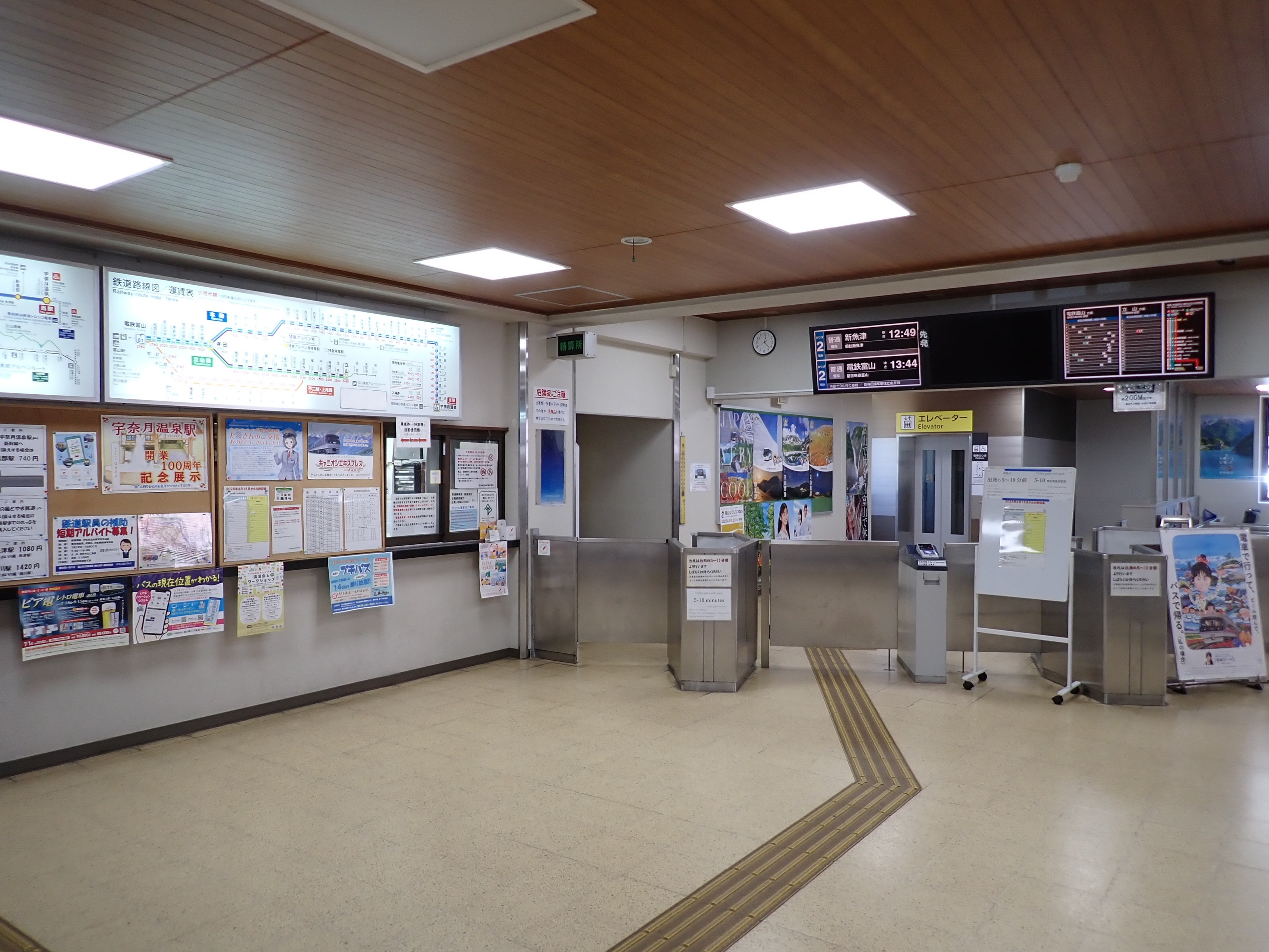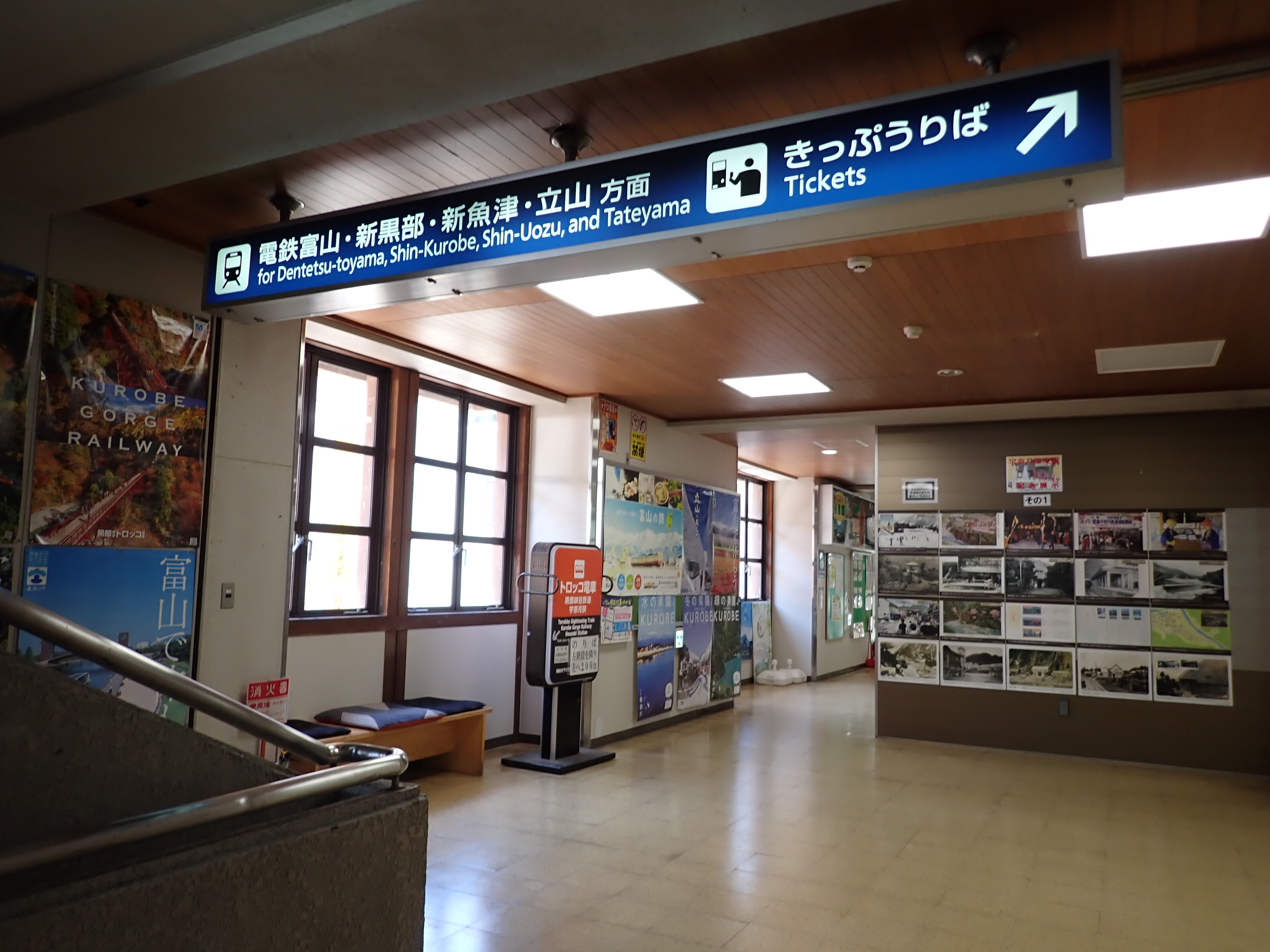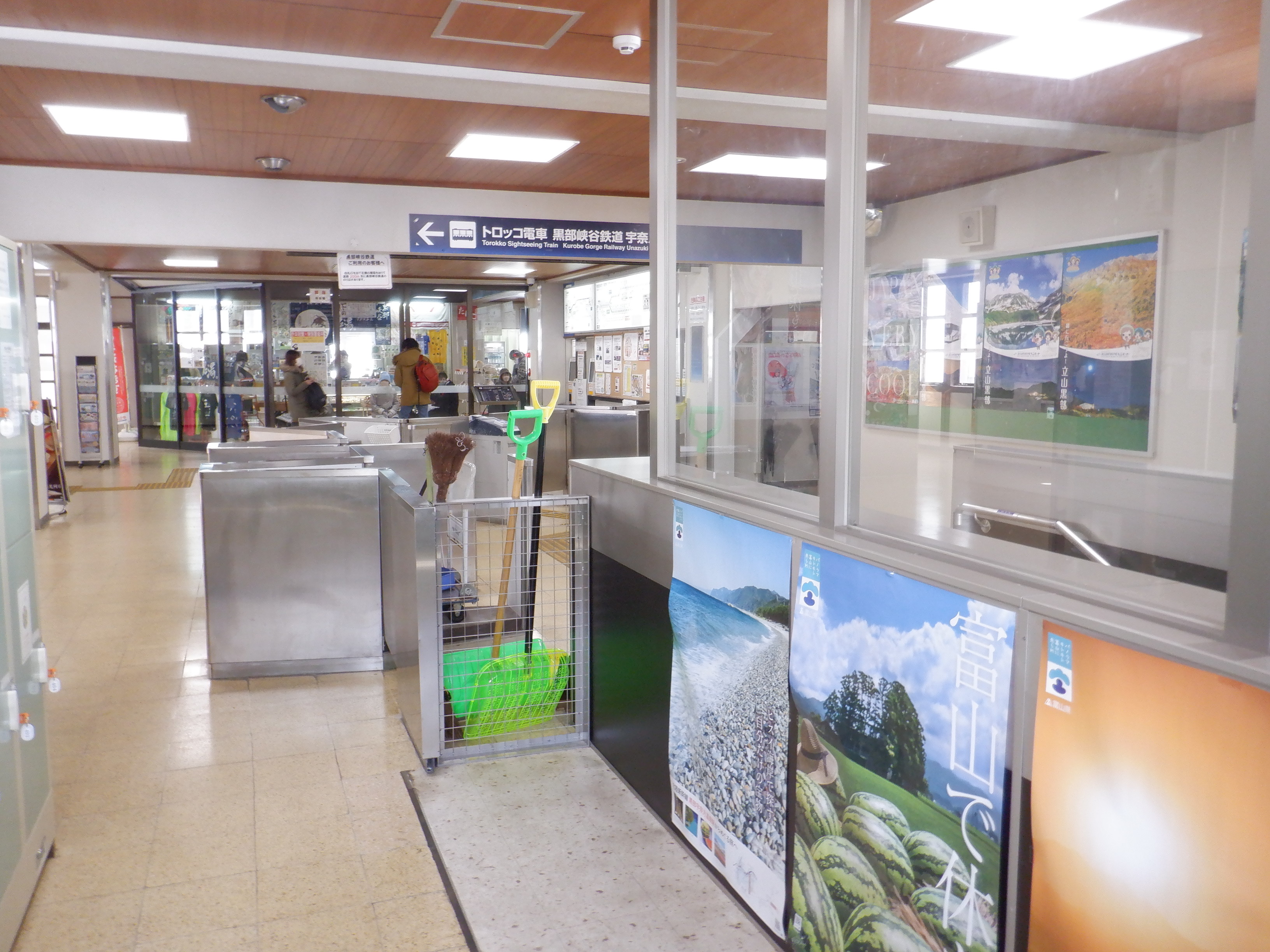 富山地方鉄道本線としては終点であり、この先黒部峡谷鉄道への乗り換えの駅です。駅は階段・エレベーターを上がって行ったところに改札等があり、橋上駅の構造です。駅前は温泉街としての趣があります。