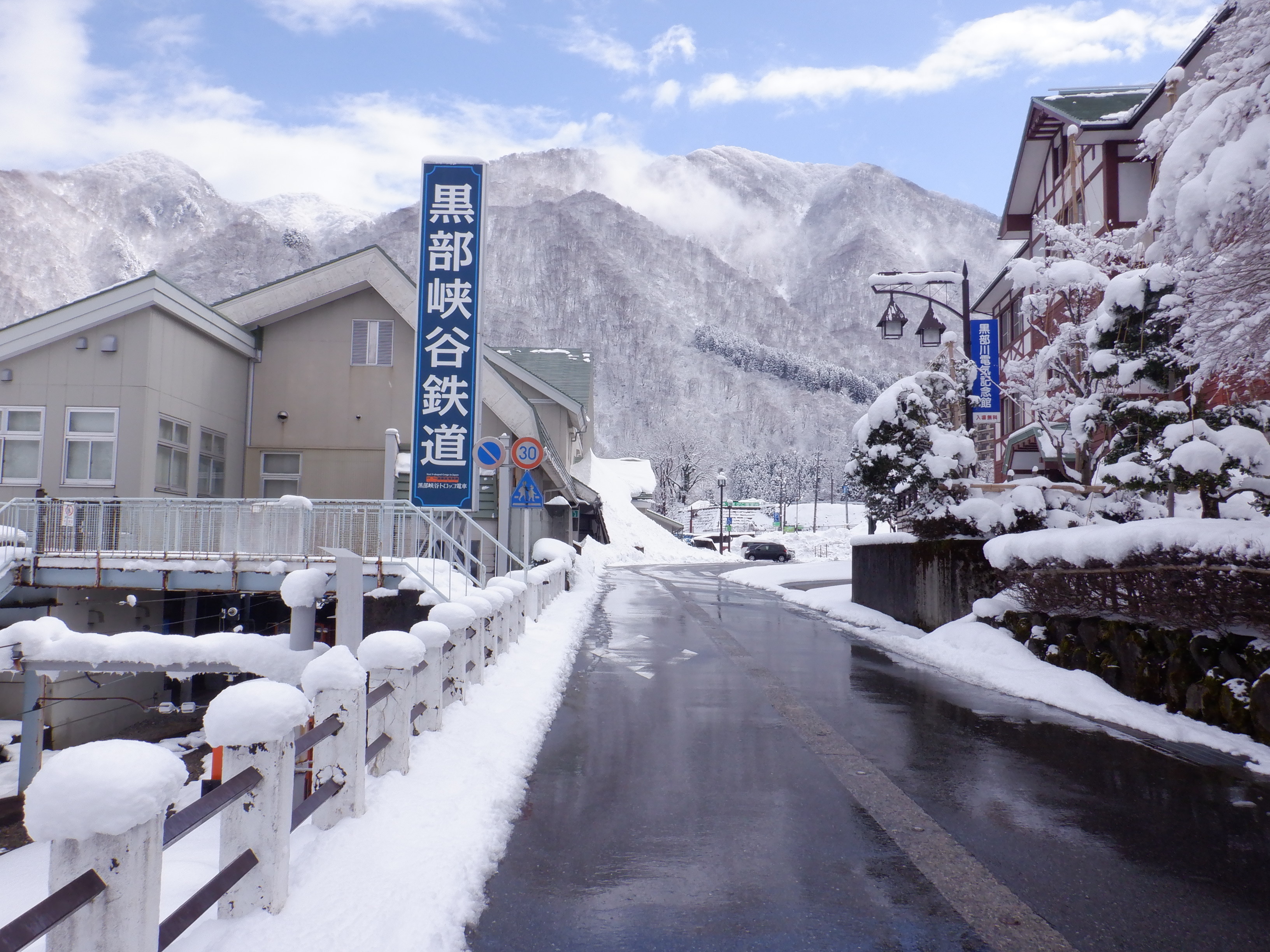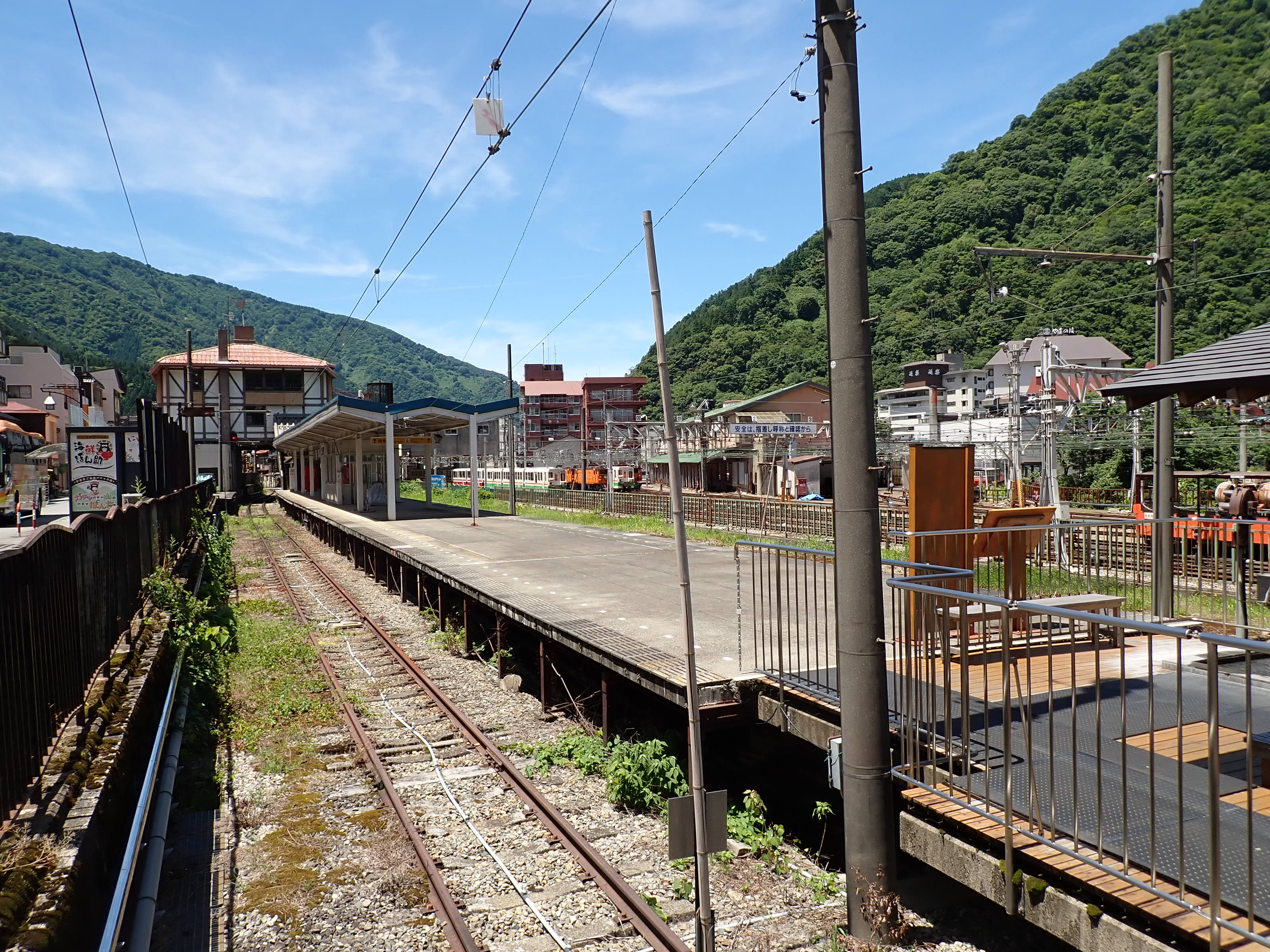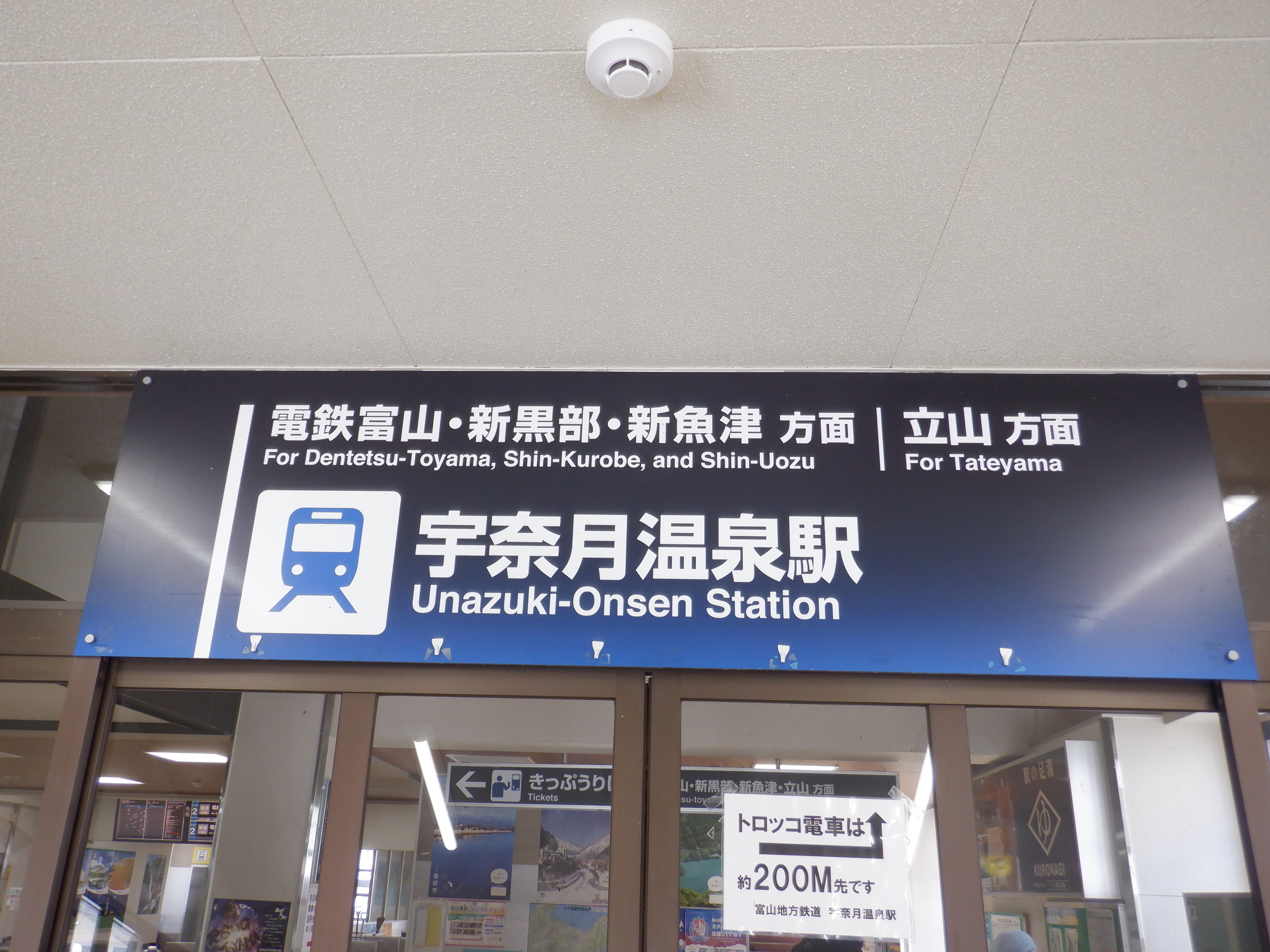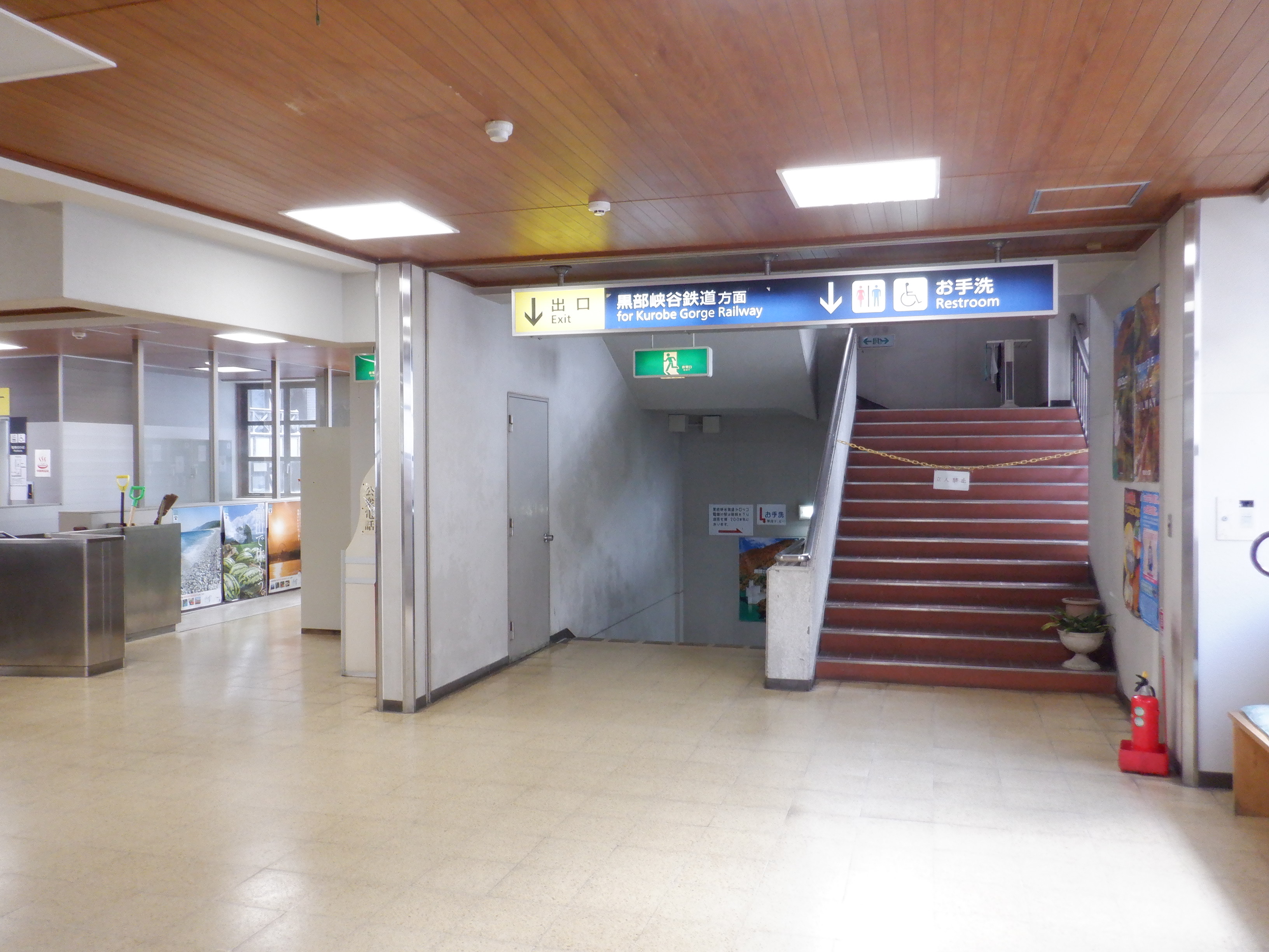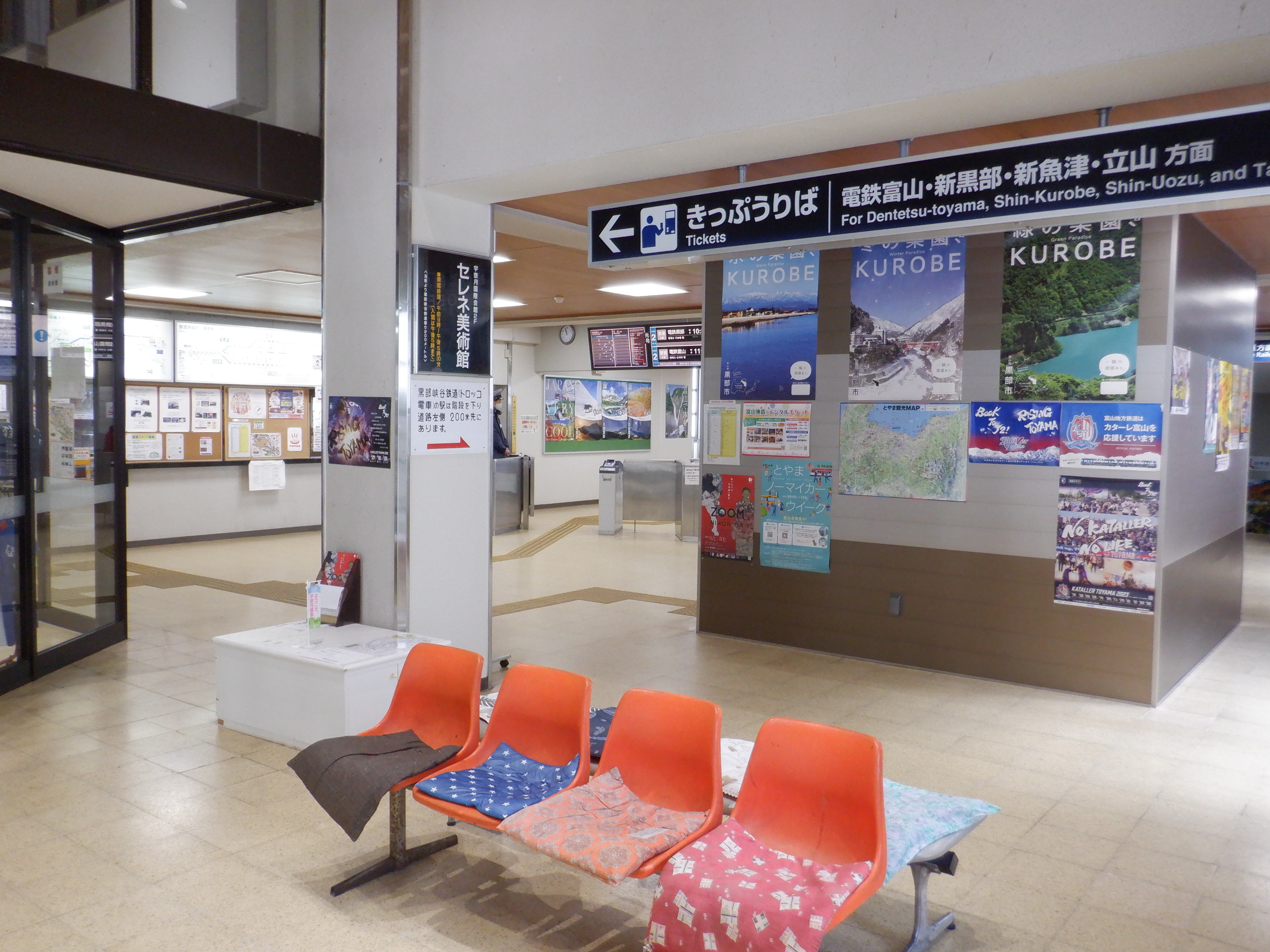 富山地方鉄道本線としては終点であり、この先黒部峡谷鉄道への乗り換えの駅です。駅は階段・エレベーターを上がって行ったところに改札等があり、橋上駅の構造です。駅前は温泉街としての趣があります。
