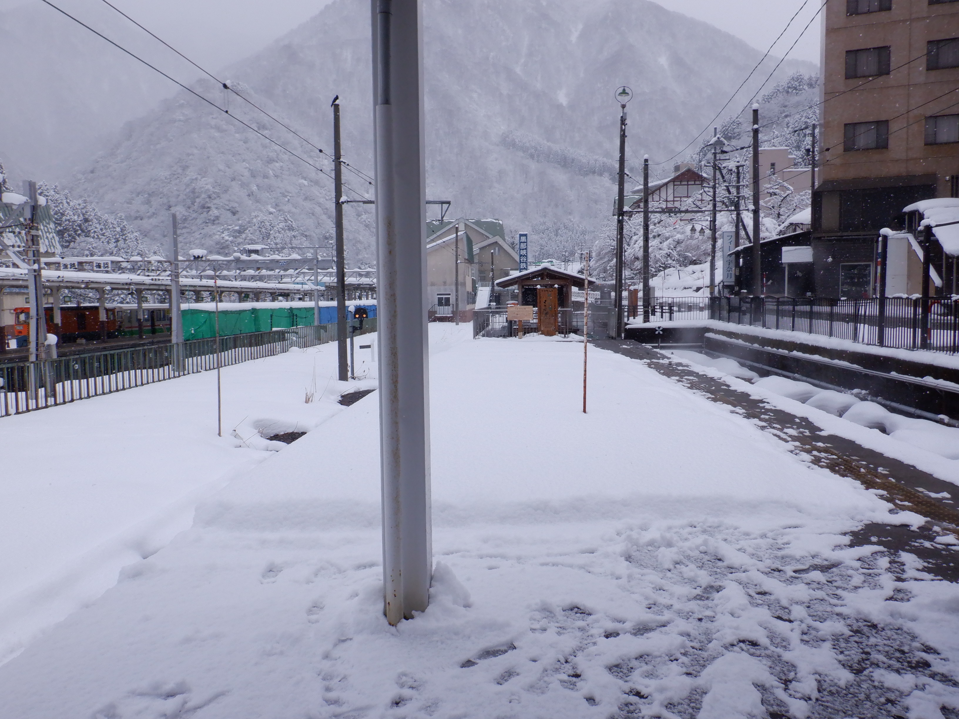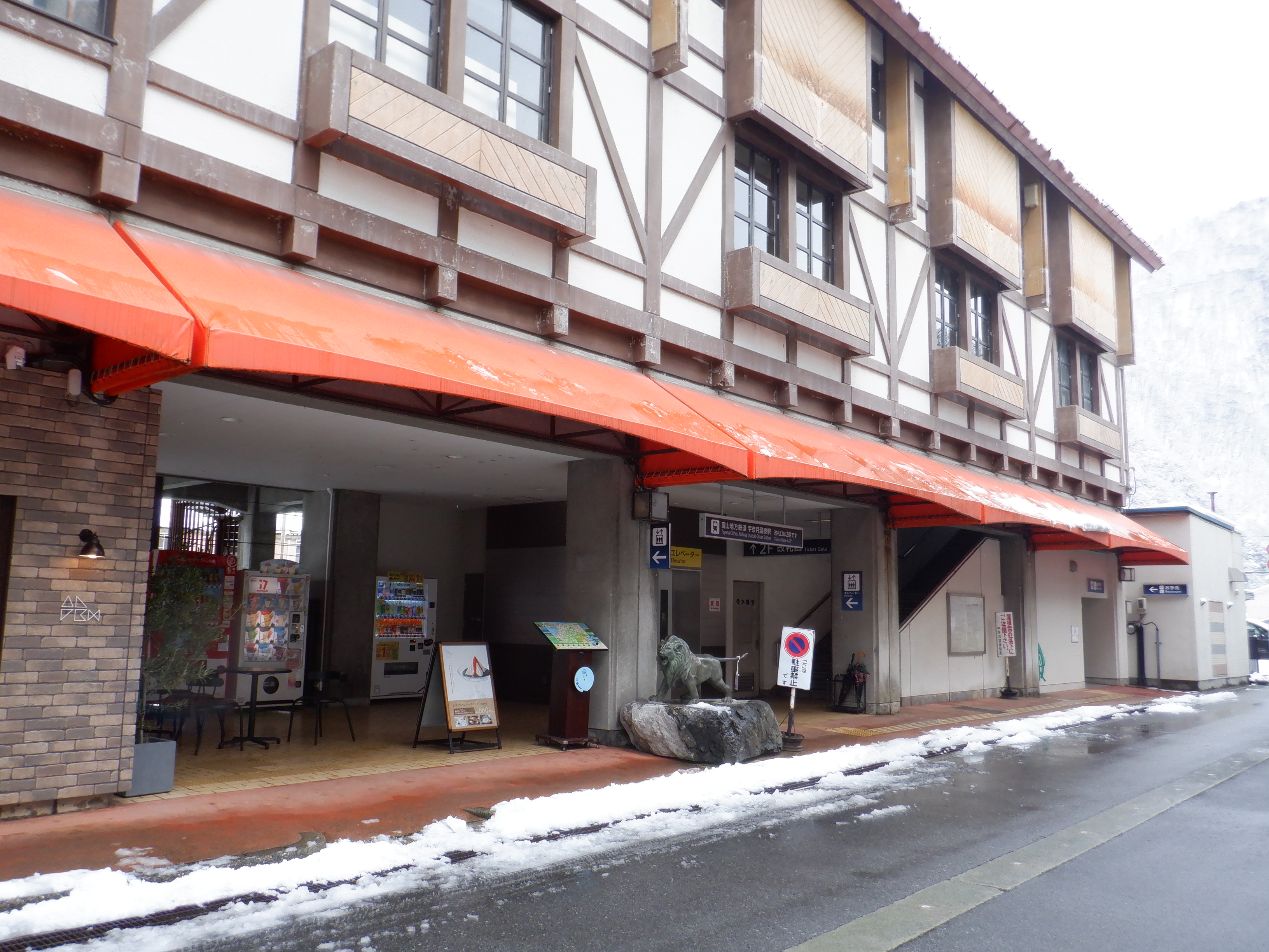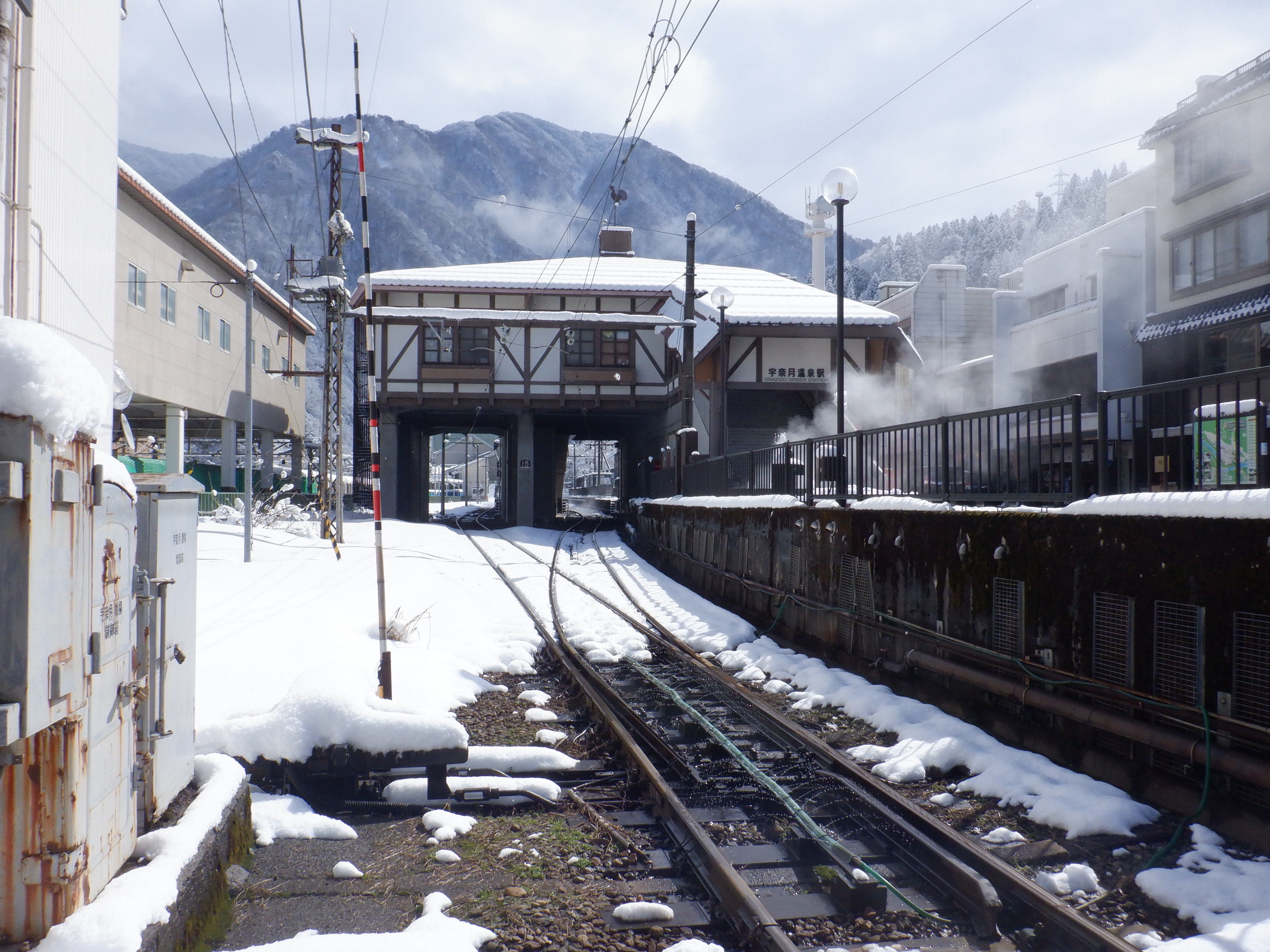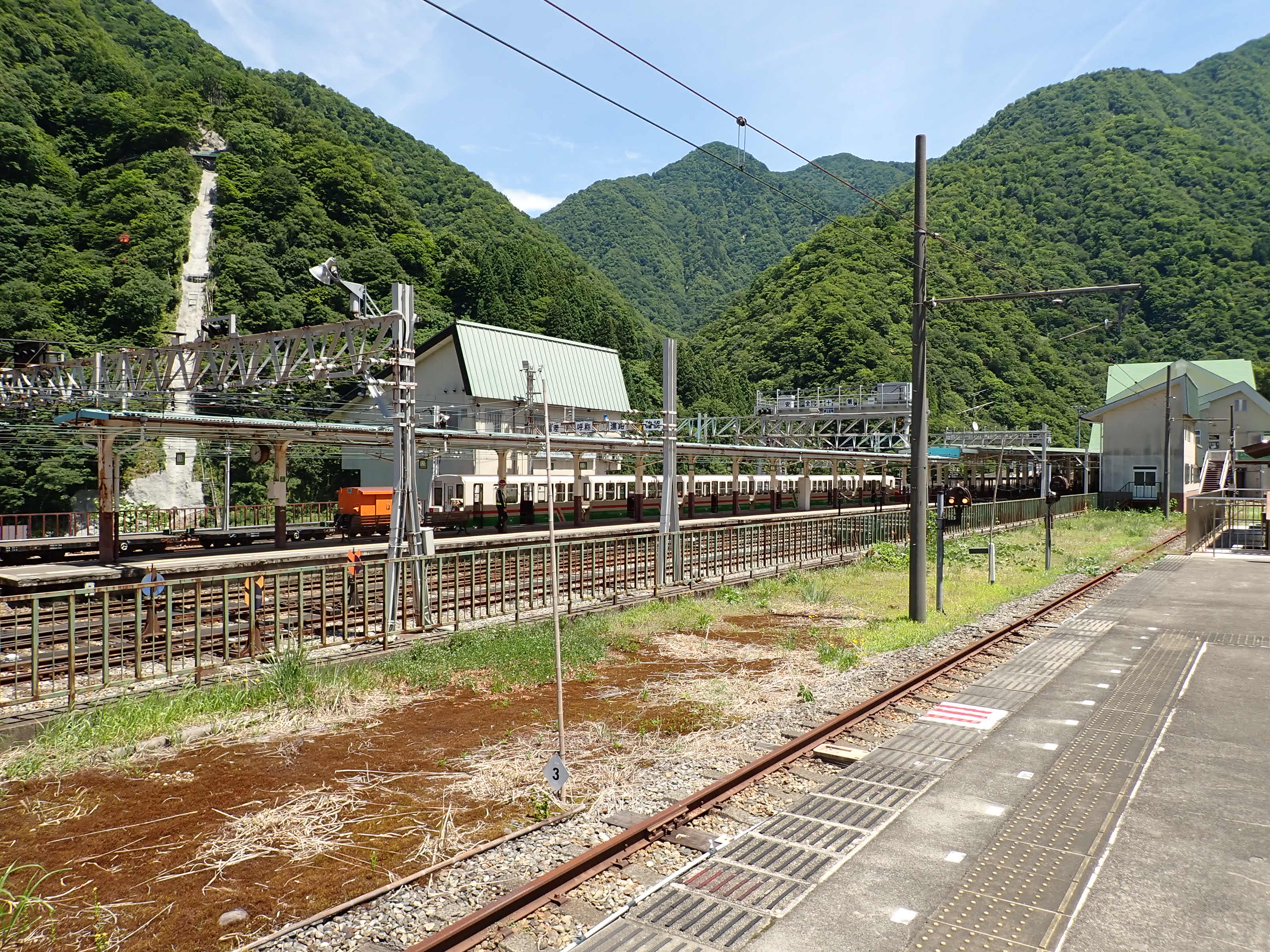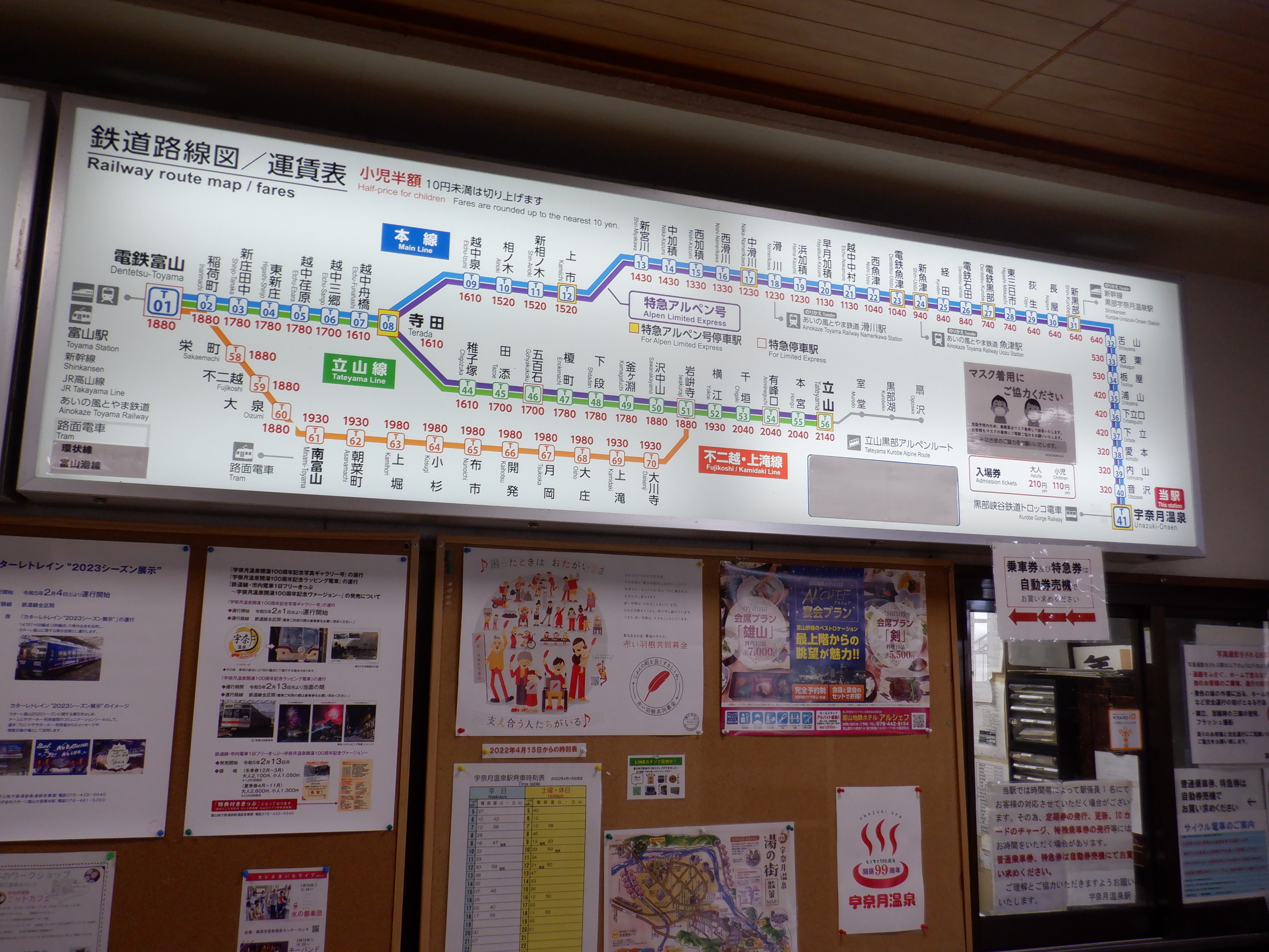 富山地方鉄道本線としては終点であり、この先黒部峡谷鉄道への乗り換えの駅です。駅は階段・エレベーターを上がって行ったところに改札等があり、橋上駅の構造です。駅前は温泉街としての趣があります。