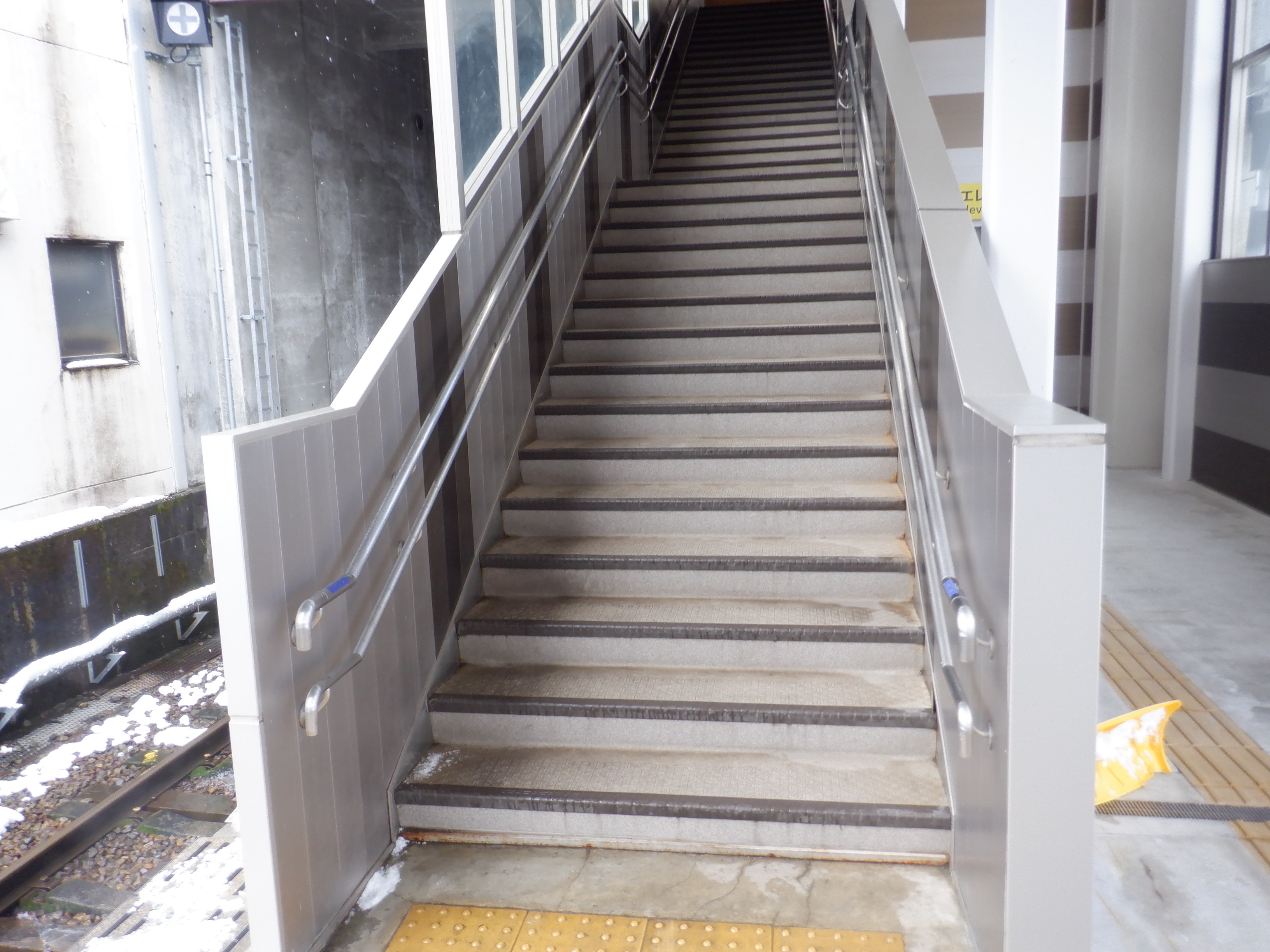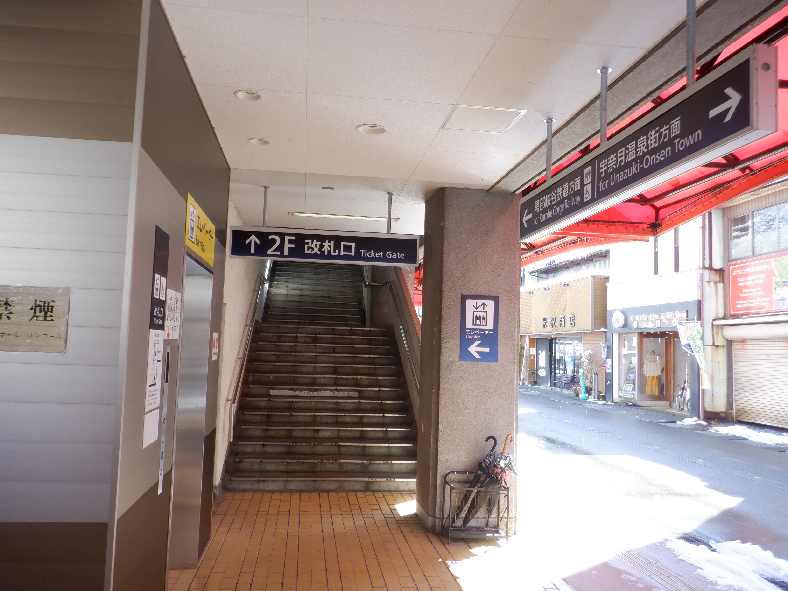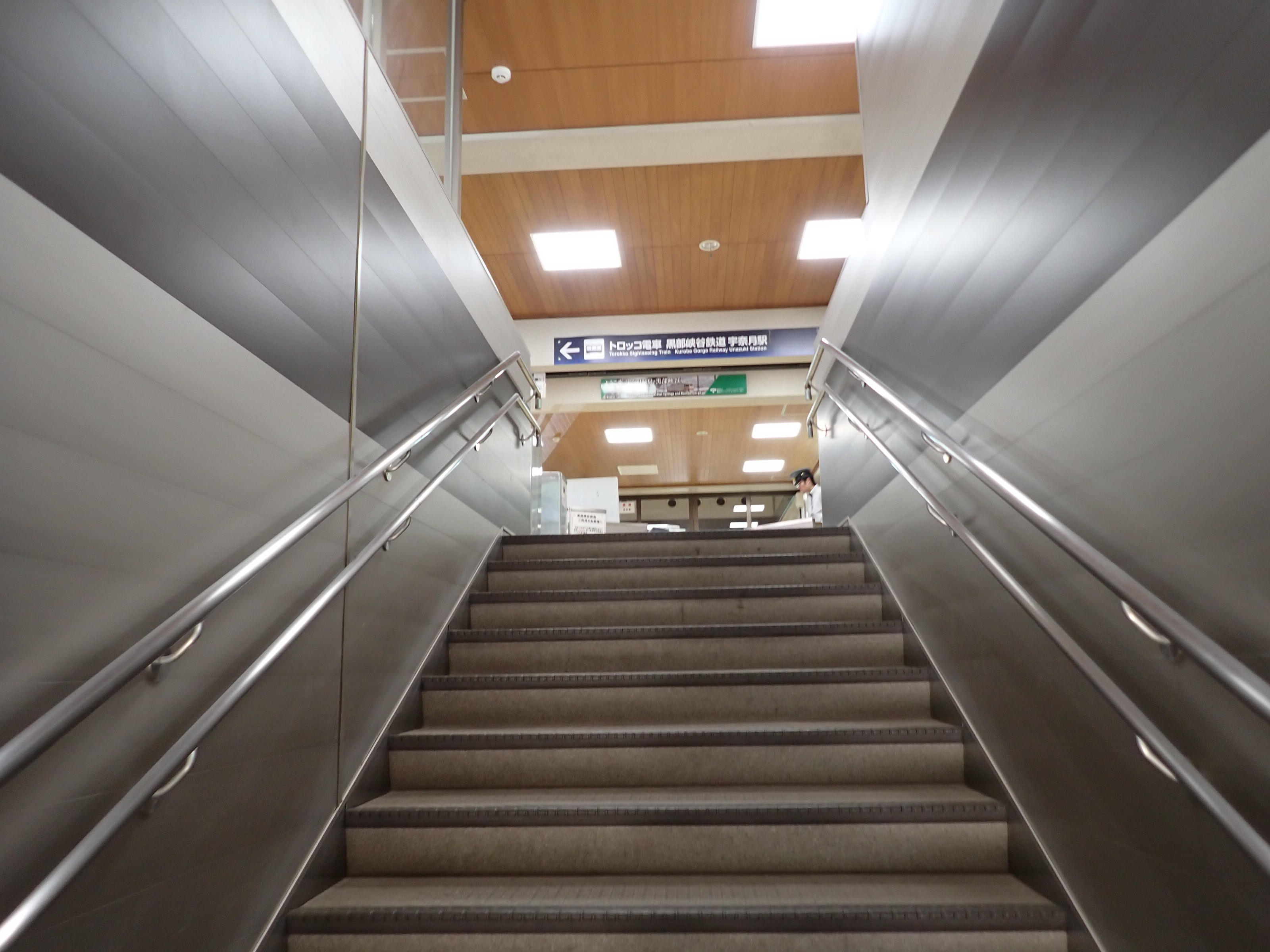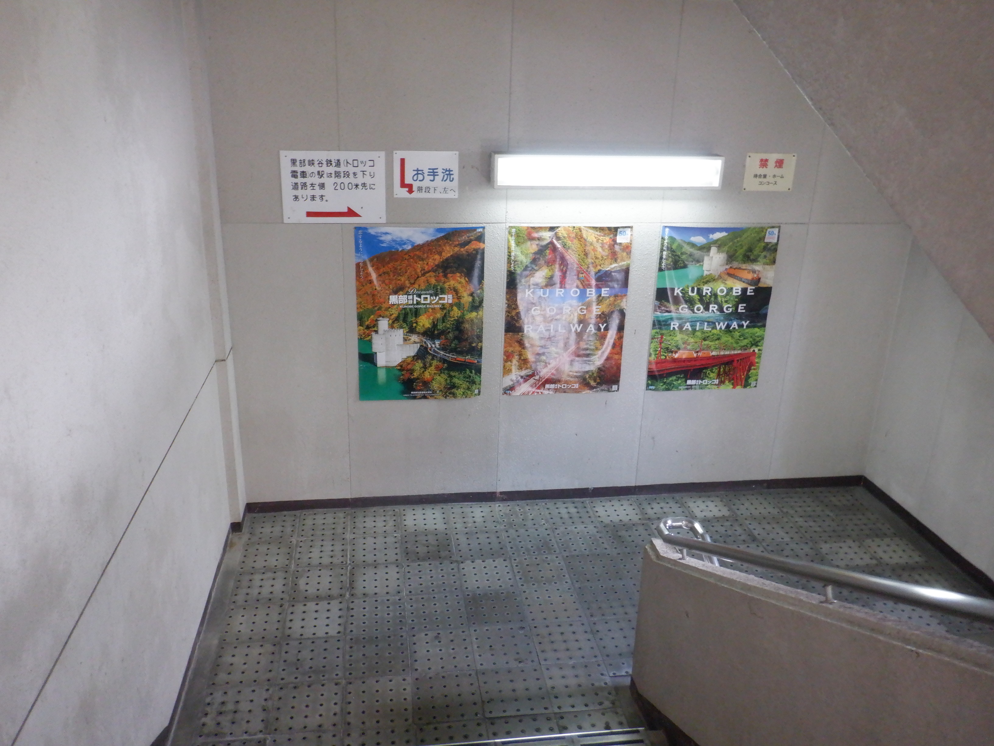 正面ではなく、駅の横側への階段。黒部峡谷鉄道の宇奈月駅はこちらの方が近くなります。