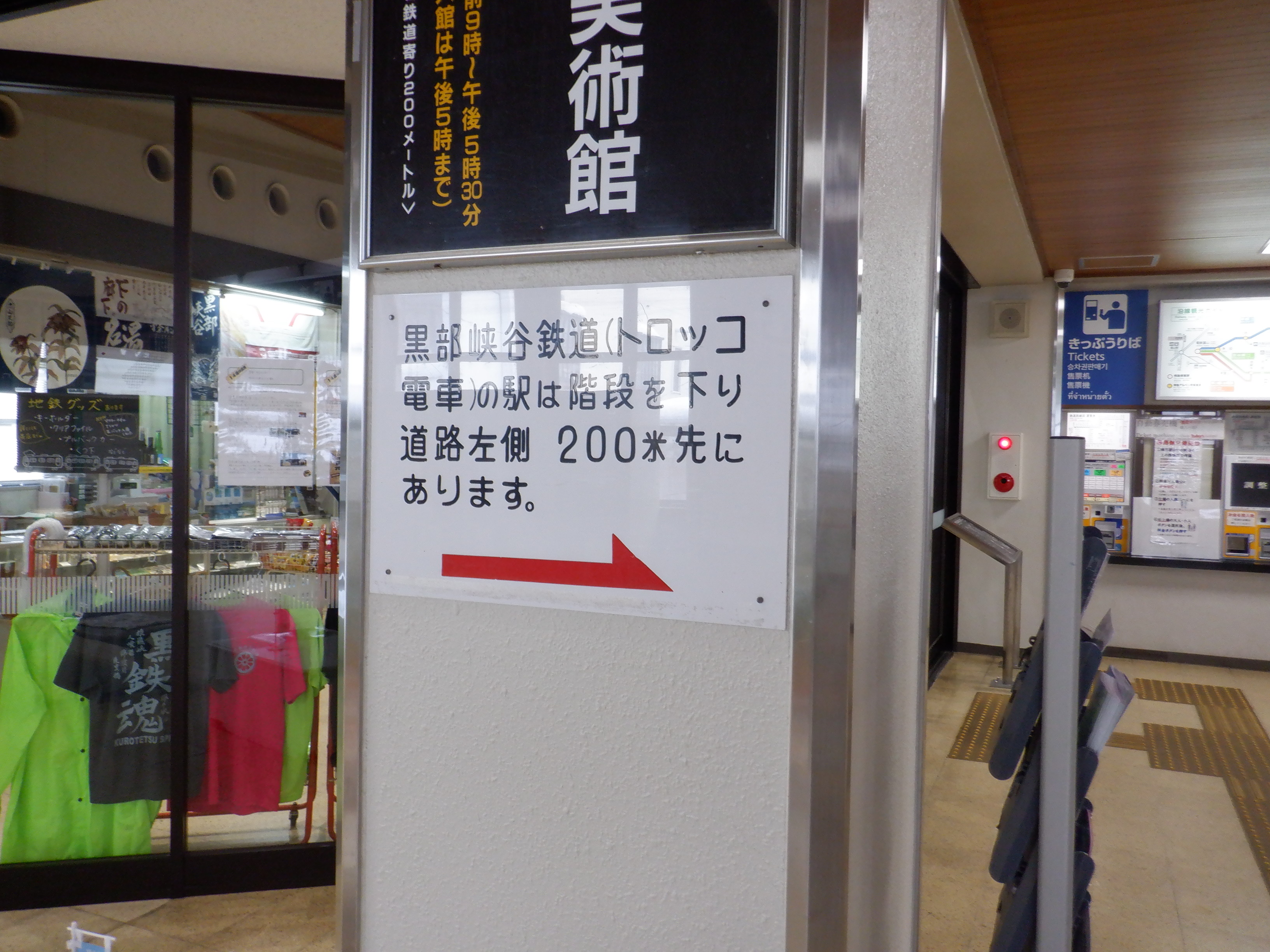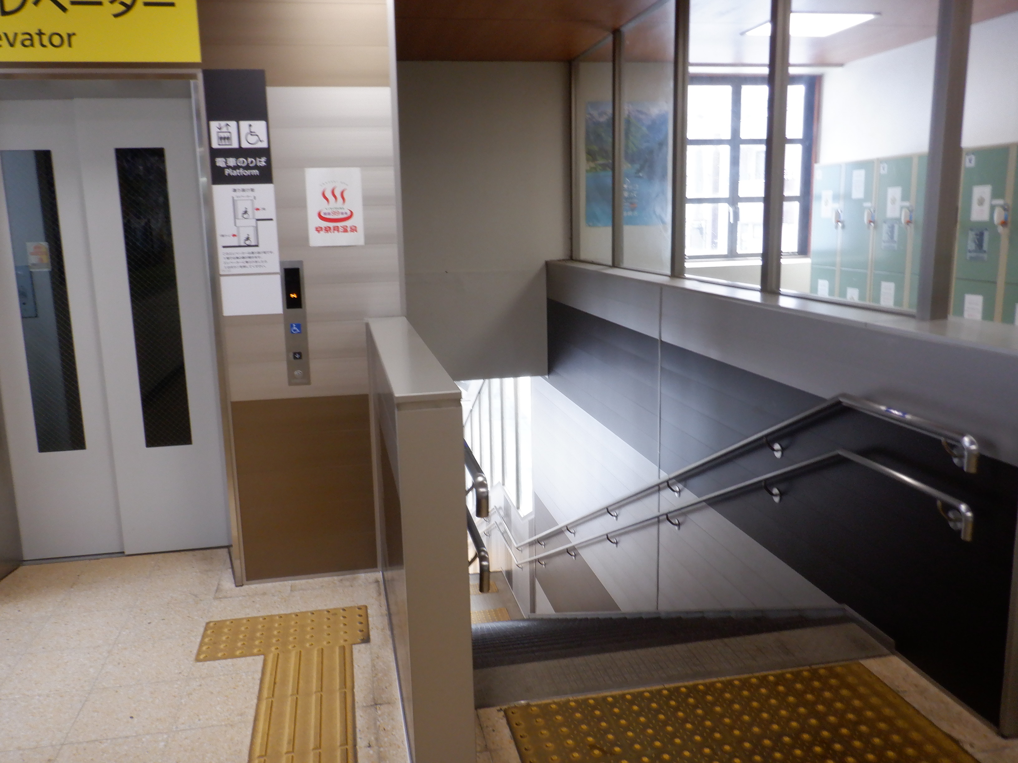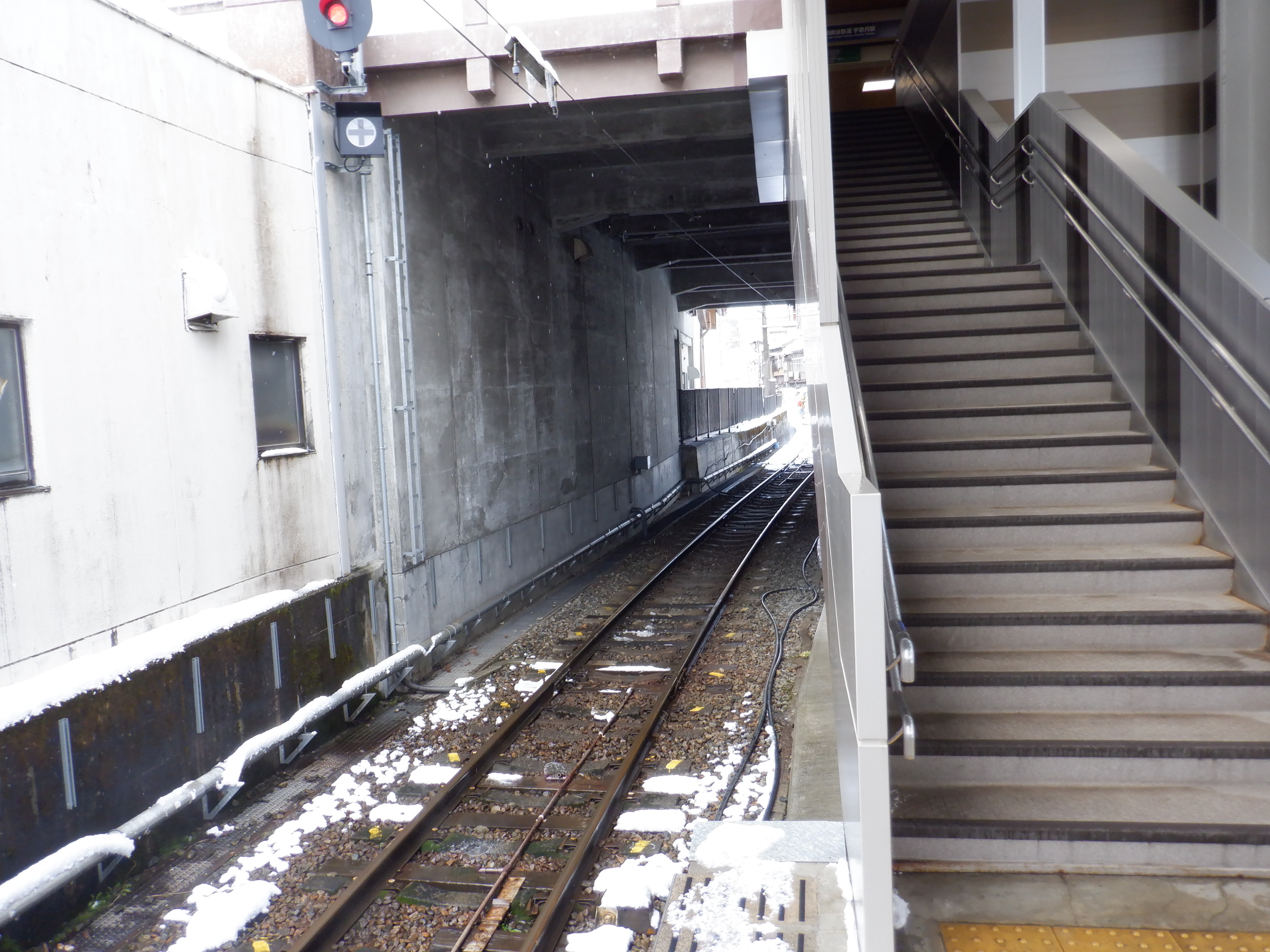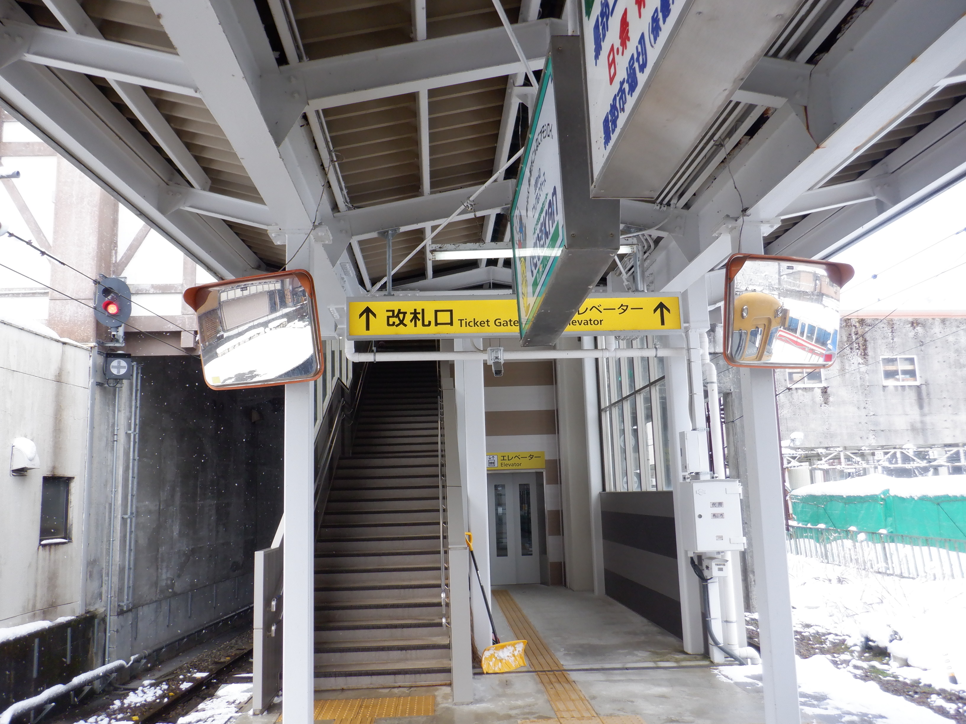 正面ではなく、駅の横側への階段。黒部峡谷鉄道の宇奈月駅はこちらの方が近くなります。