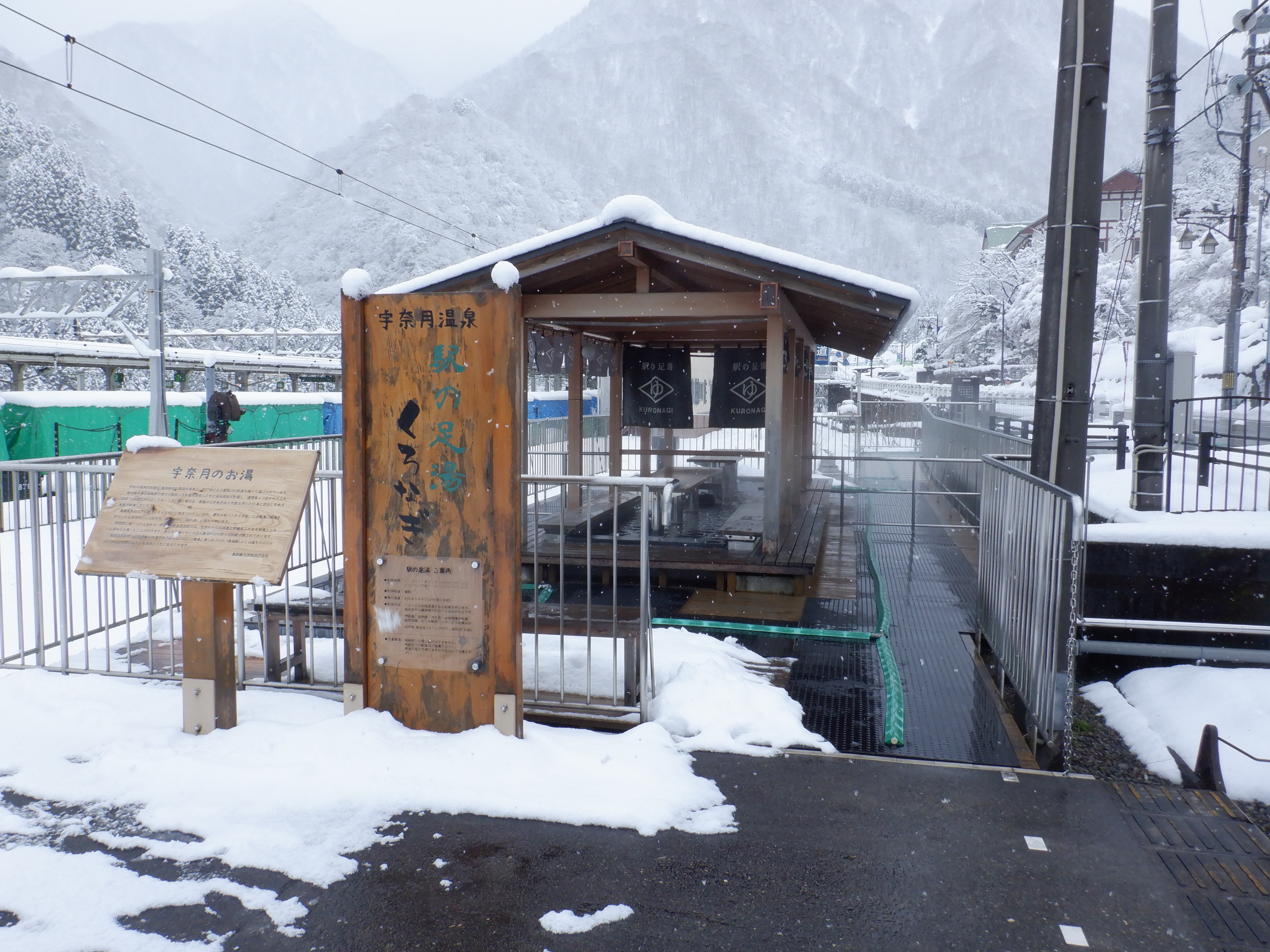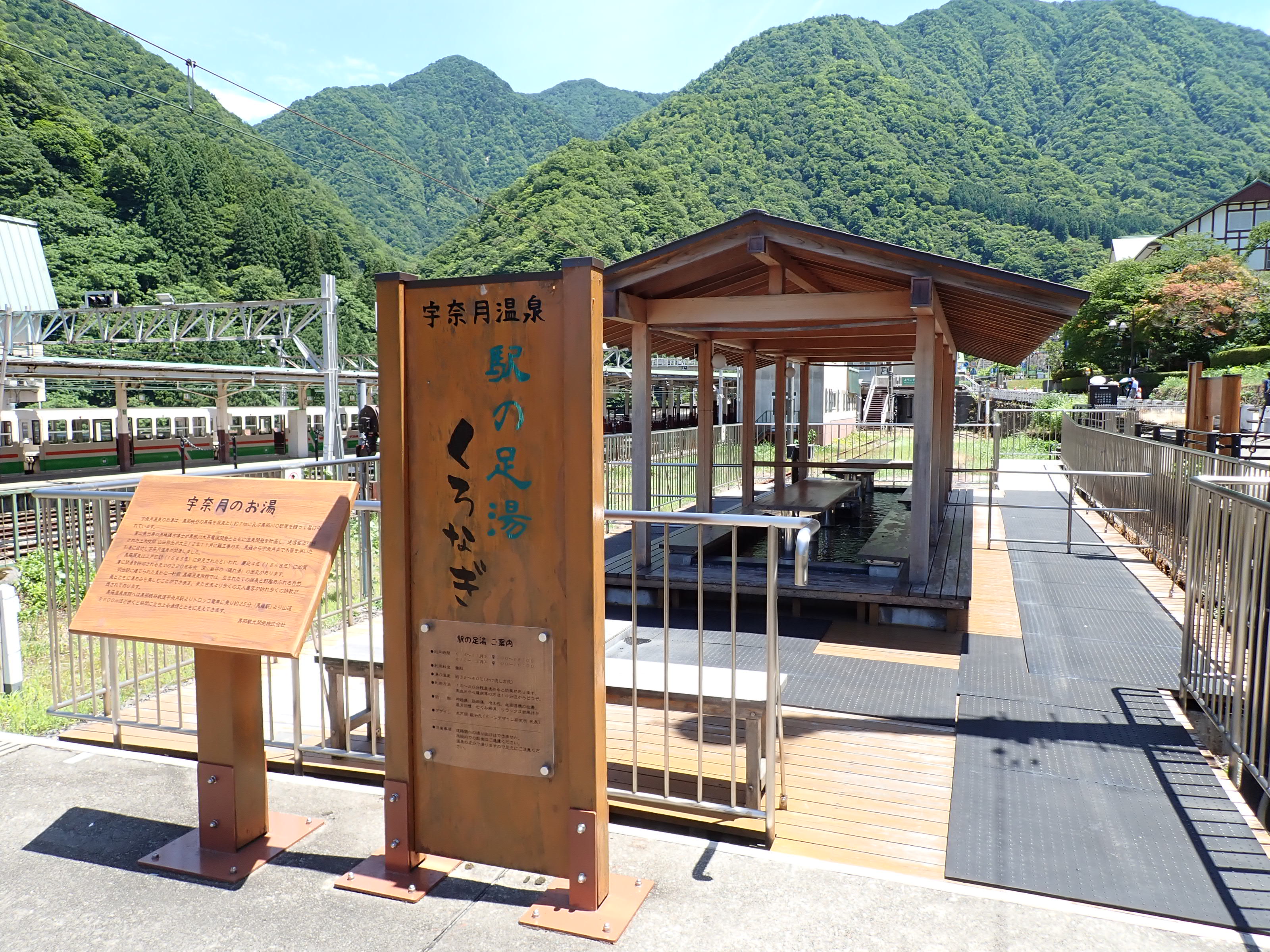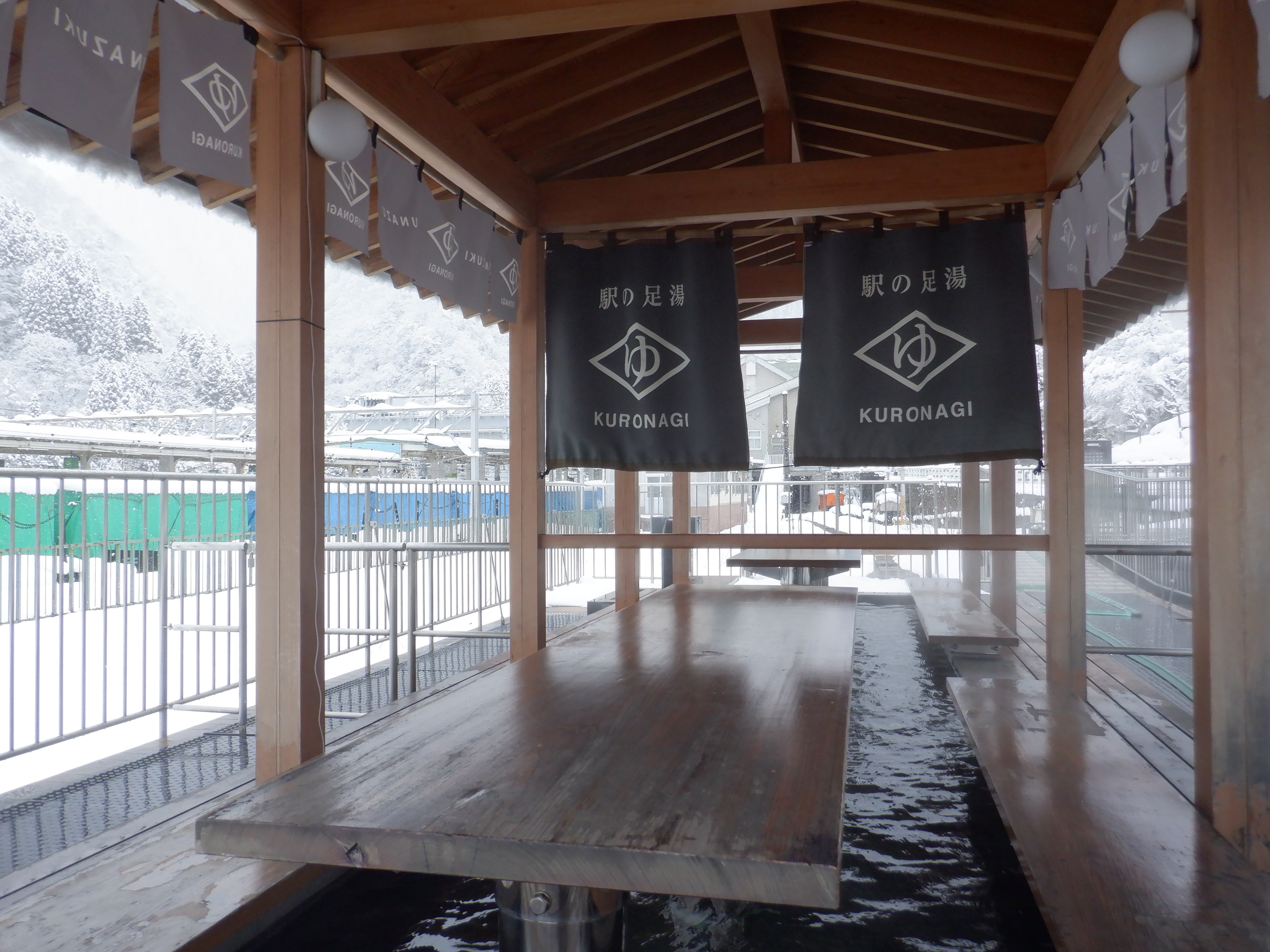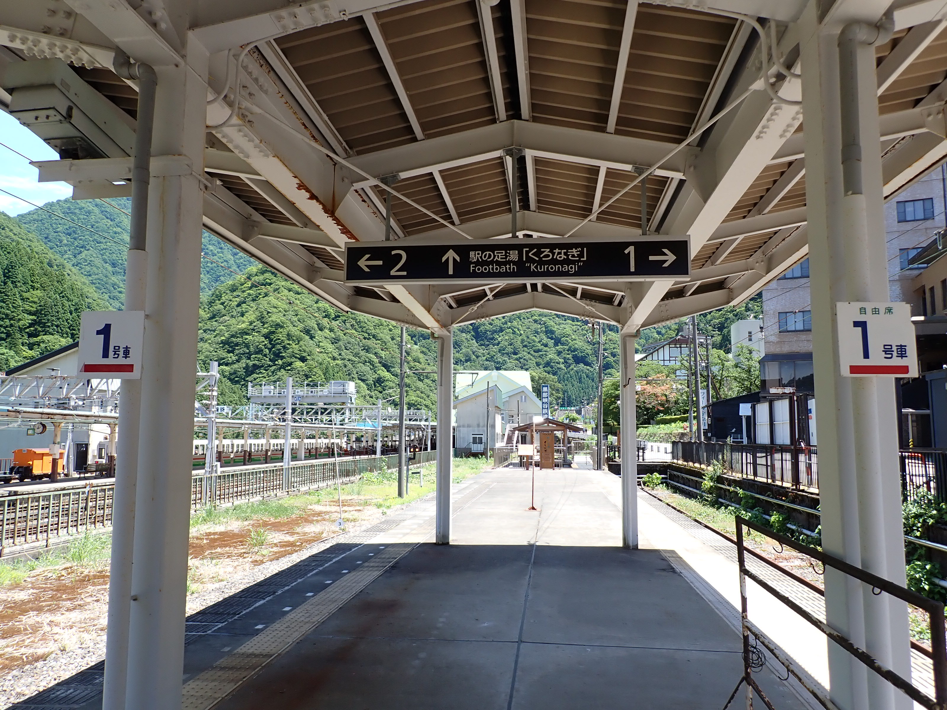 ホームの終端方向を見たところ。足湯があり、改札内外から利用が可能です。