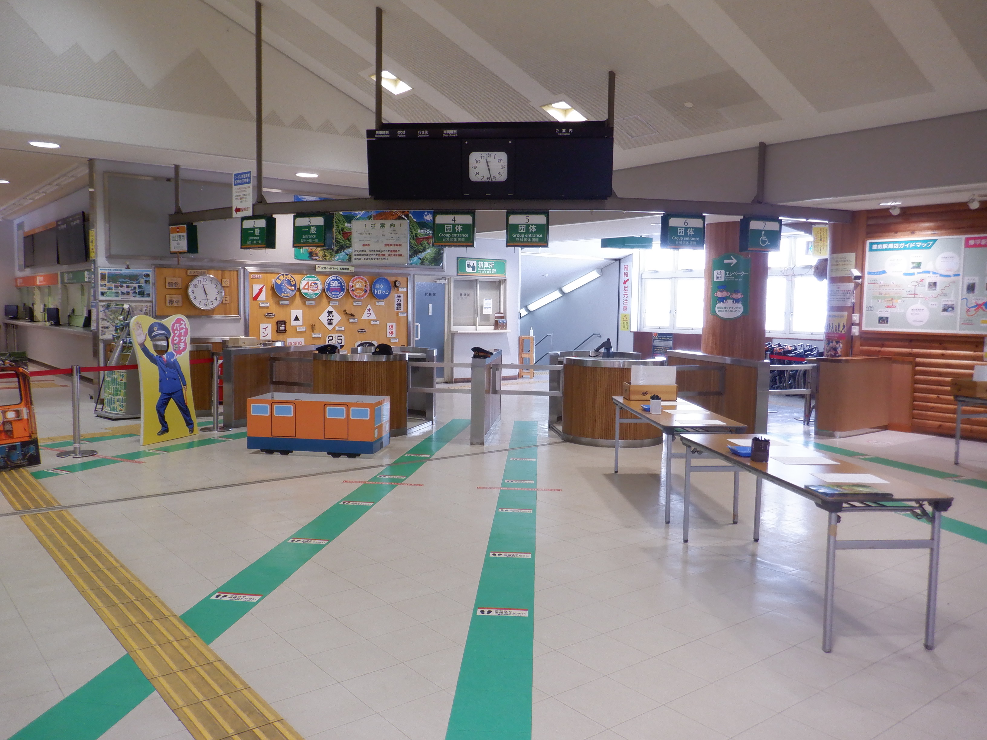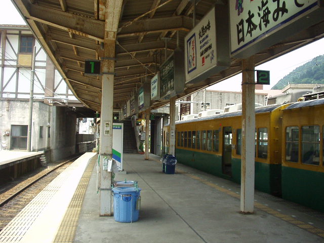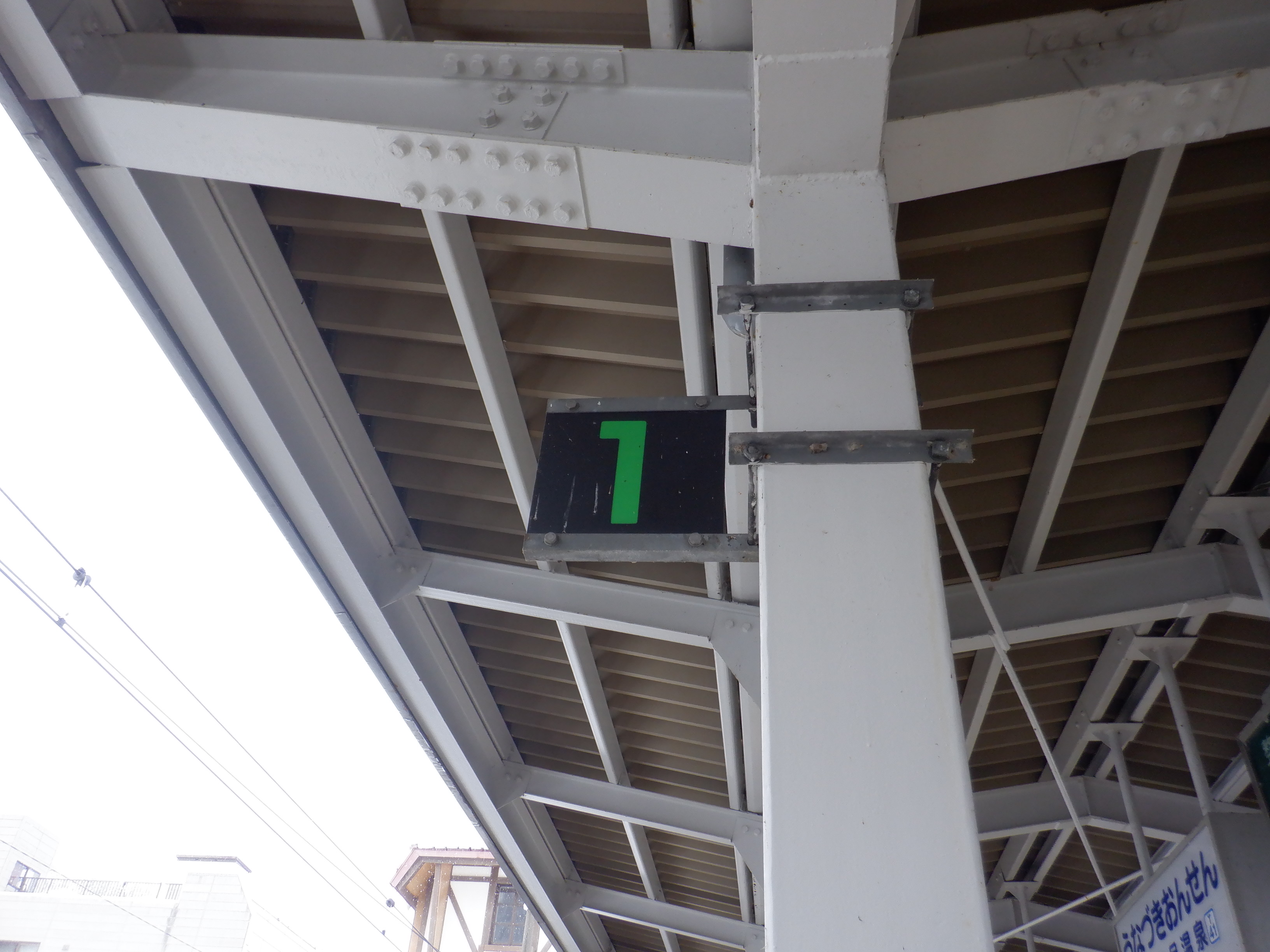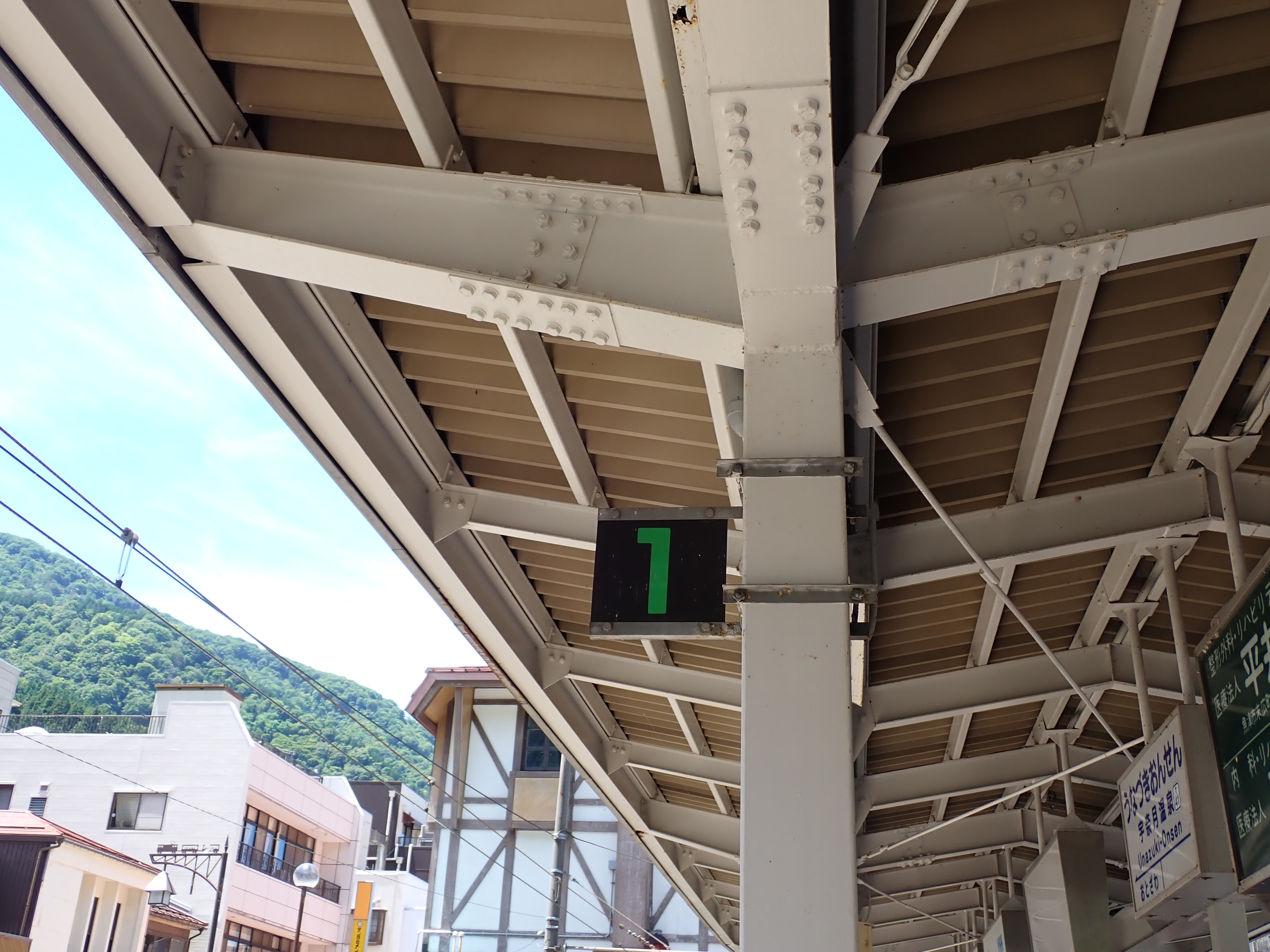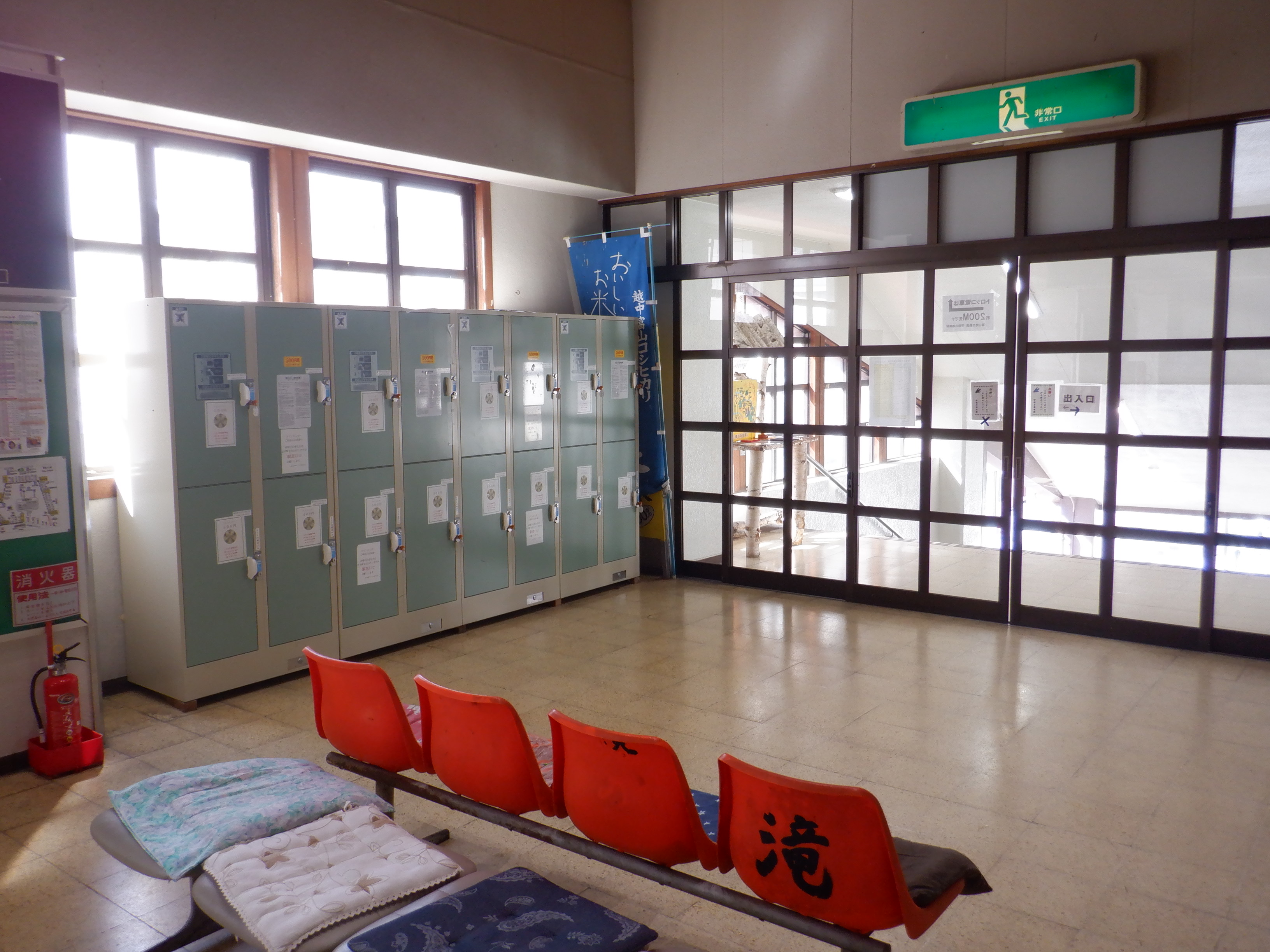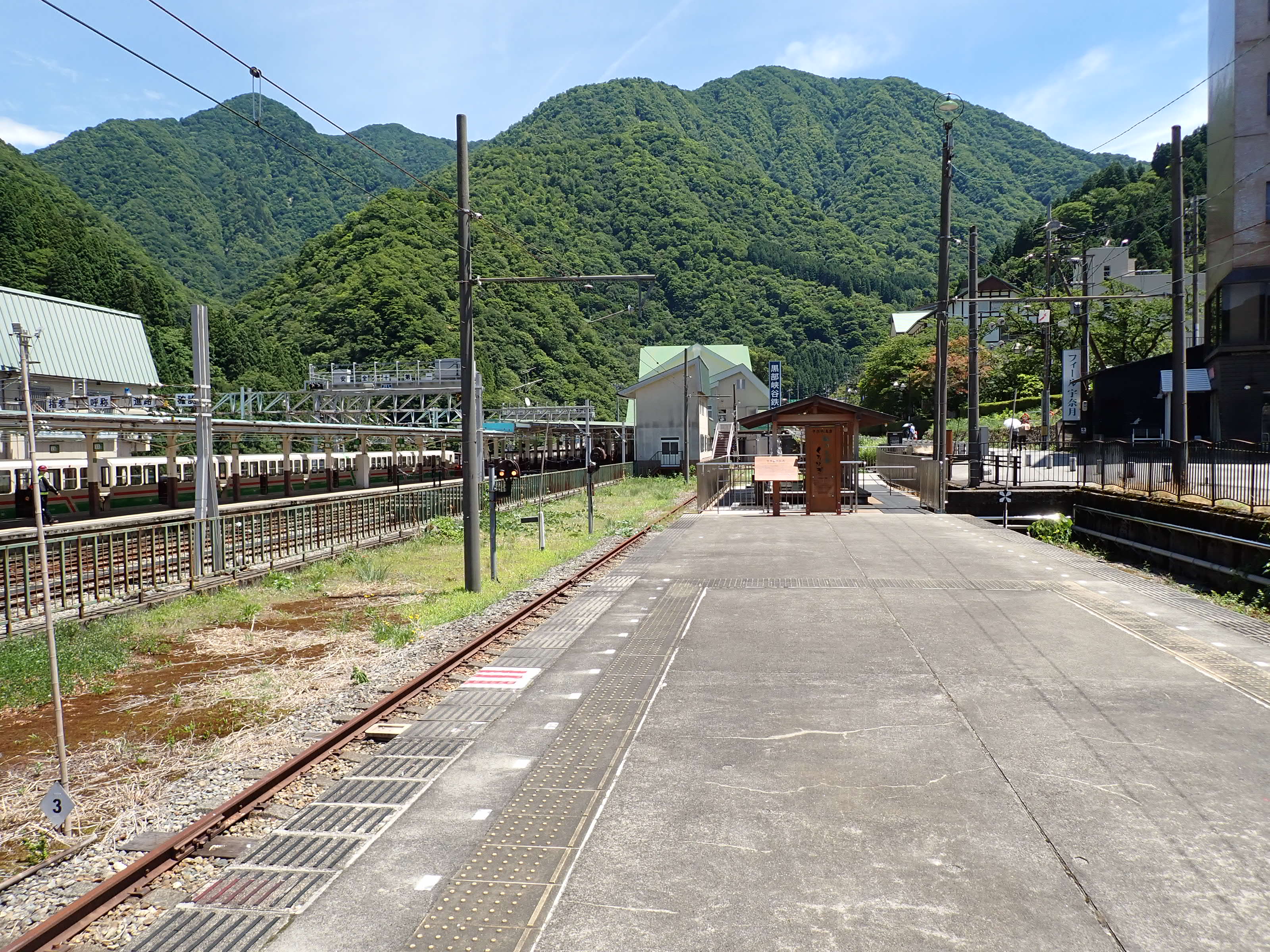 ホームの終端方向を見たところ。足湯があり、改札内外から利用が可能です。