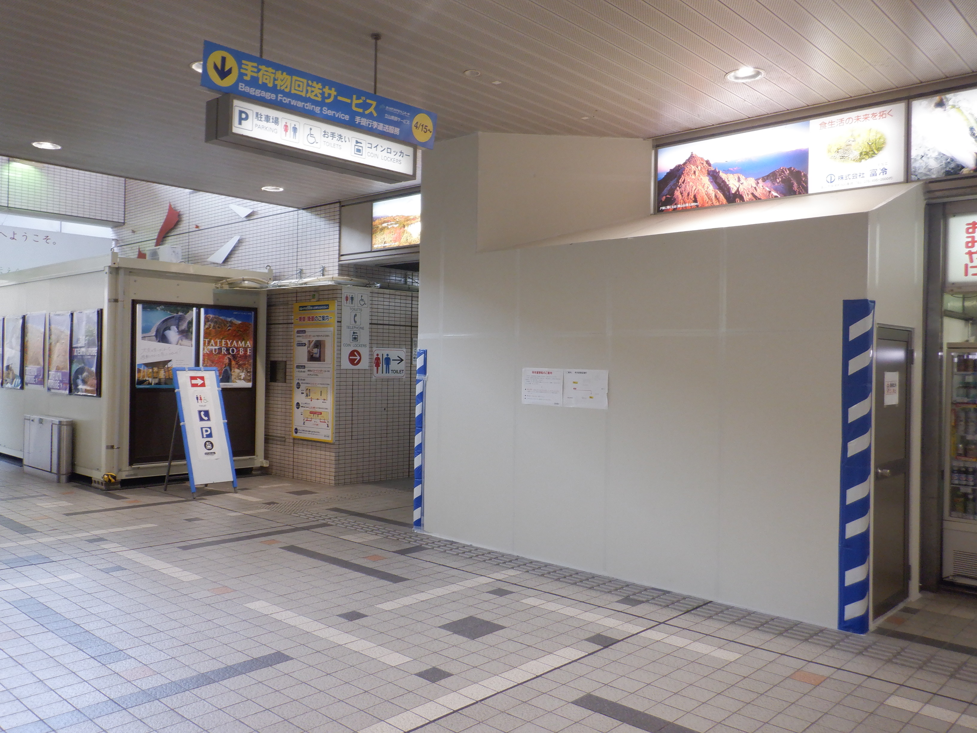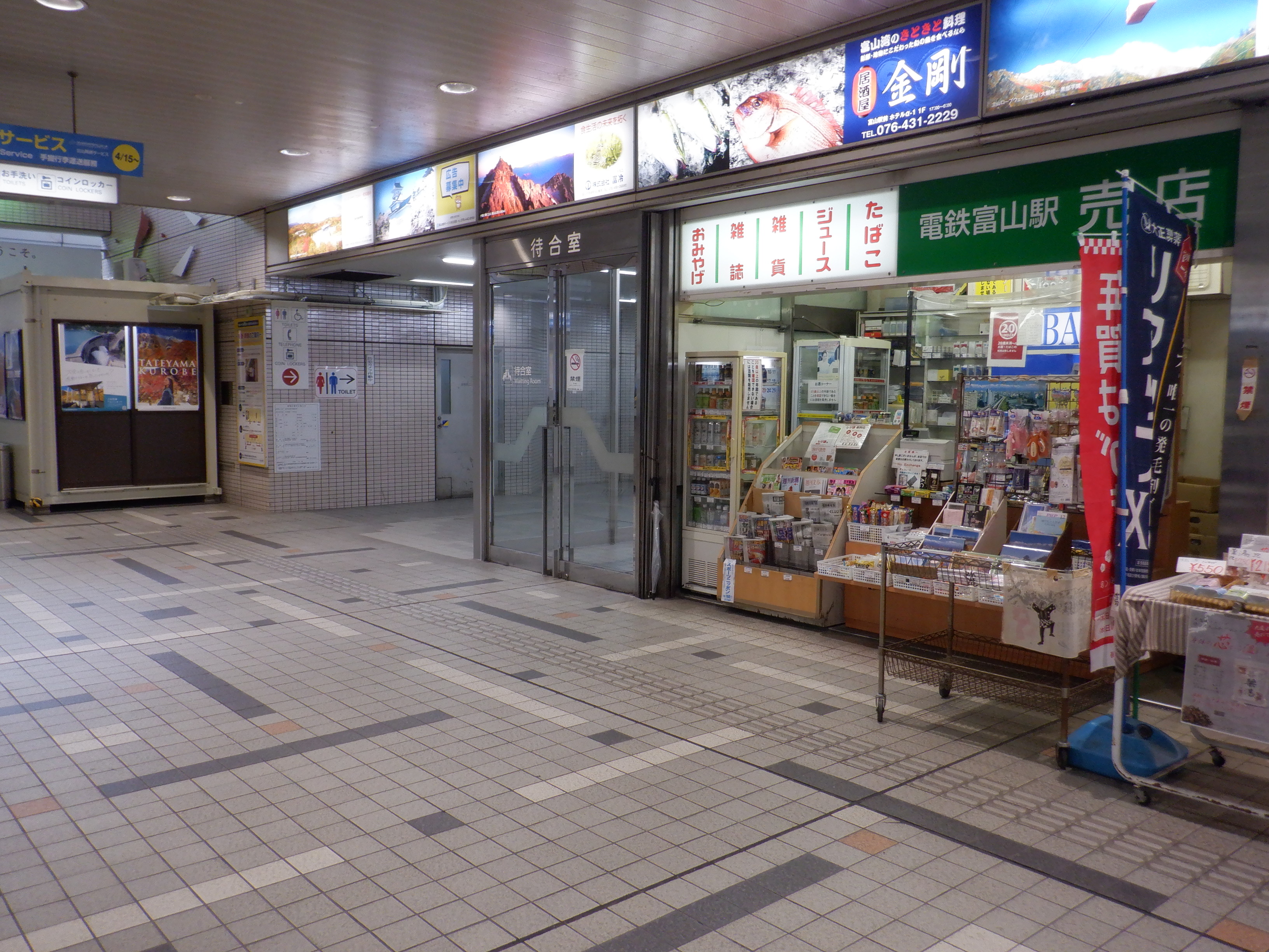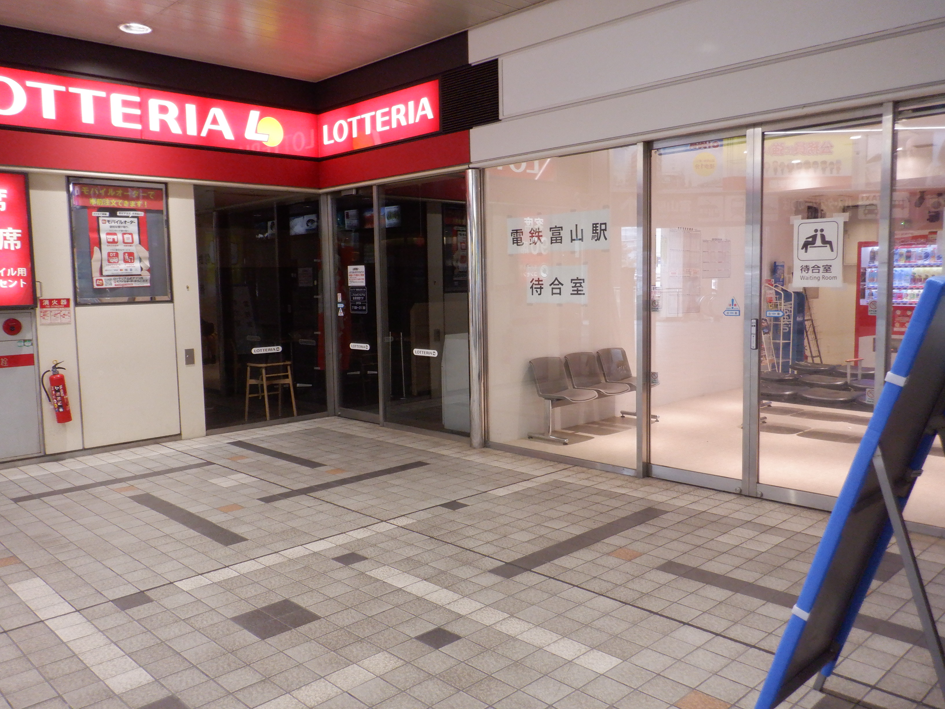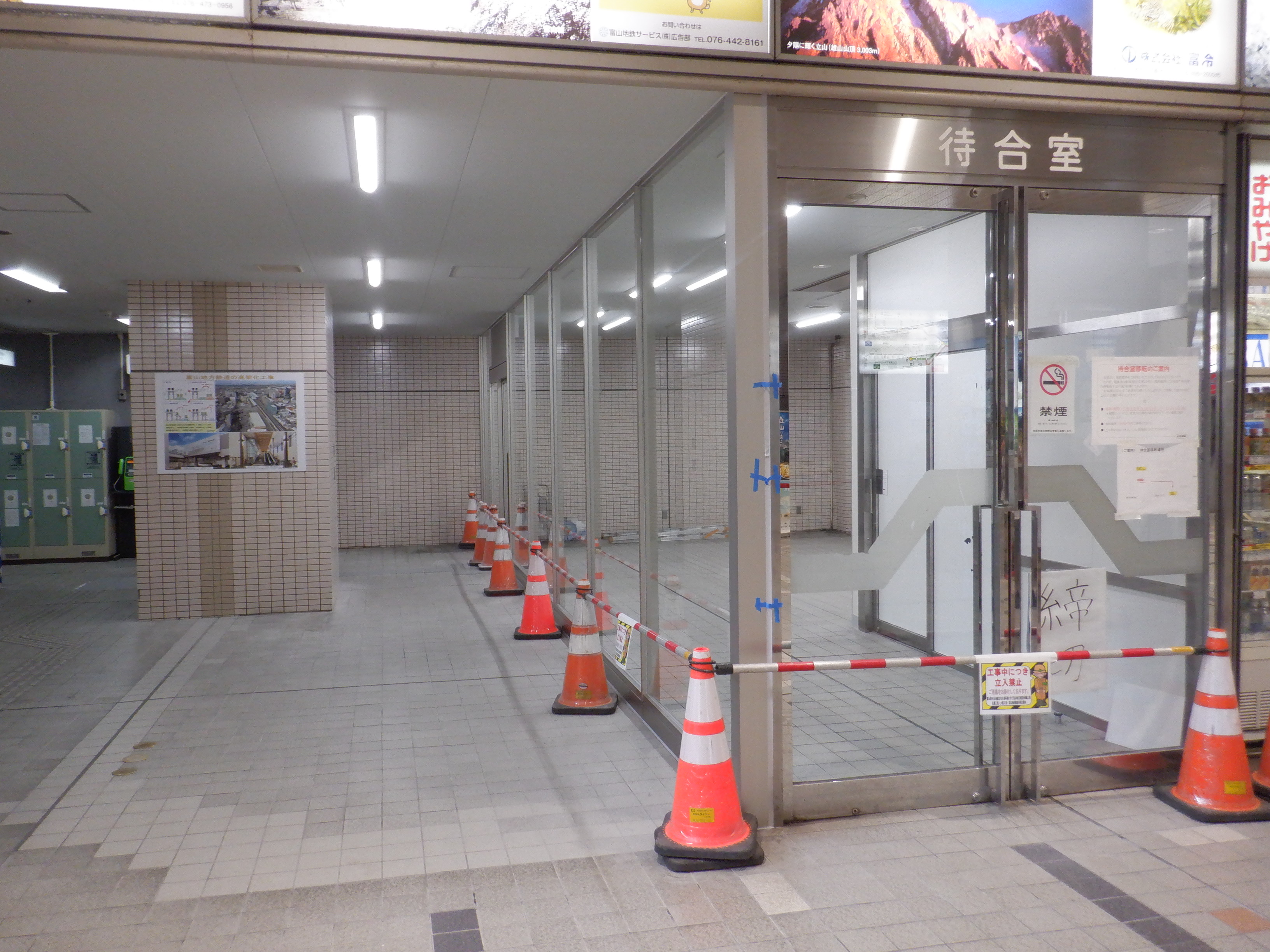 電鉄富山駅に入ってすぐのところの店舗跡が待合室になる旨の案内が貼られていました。
