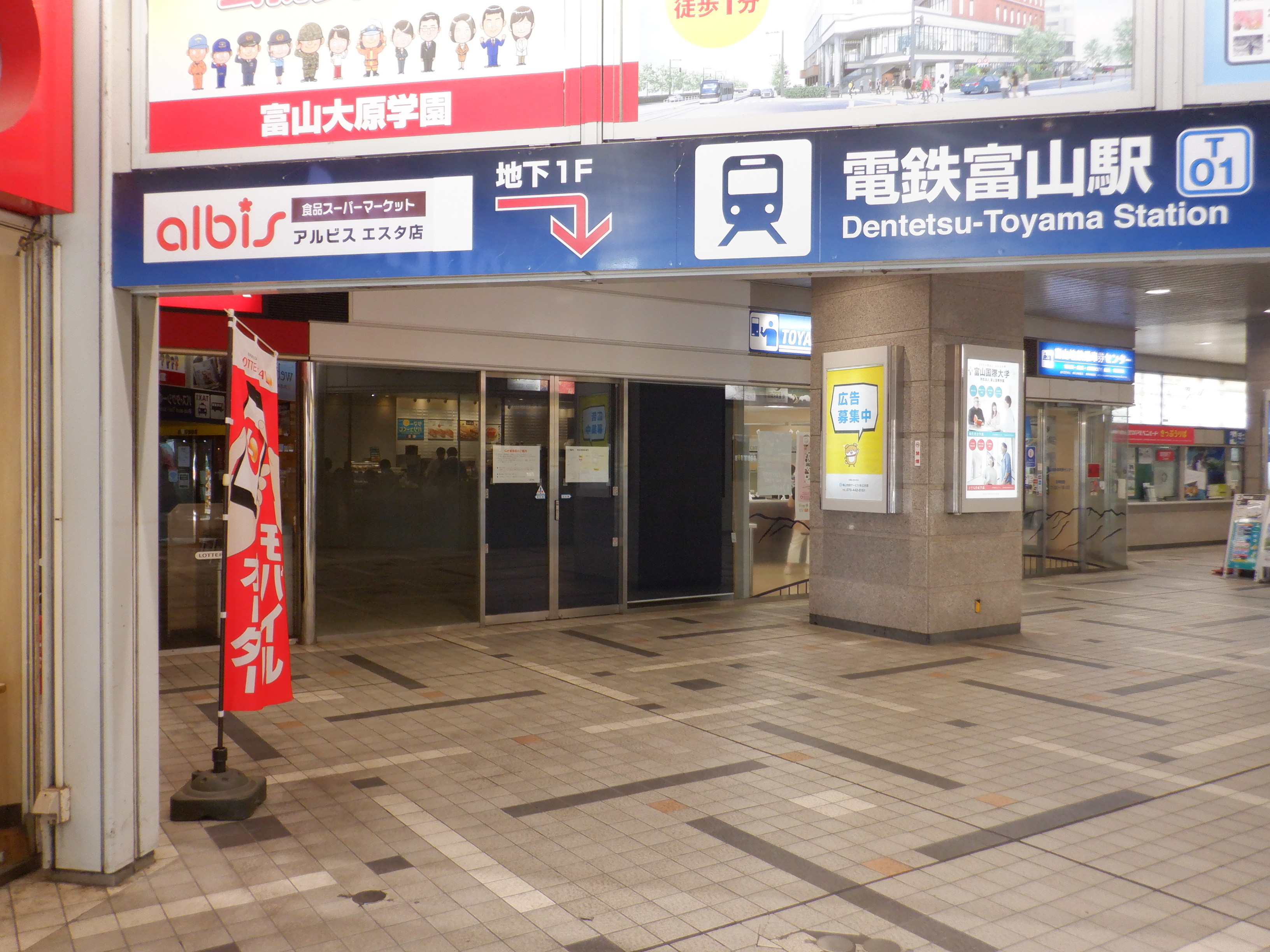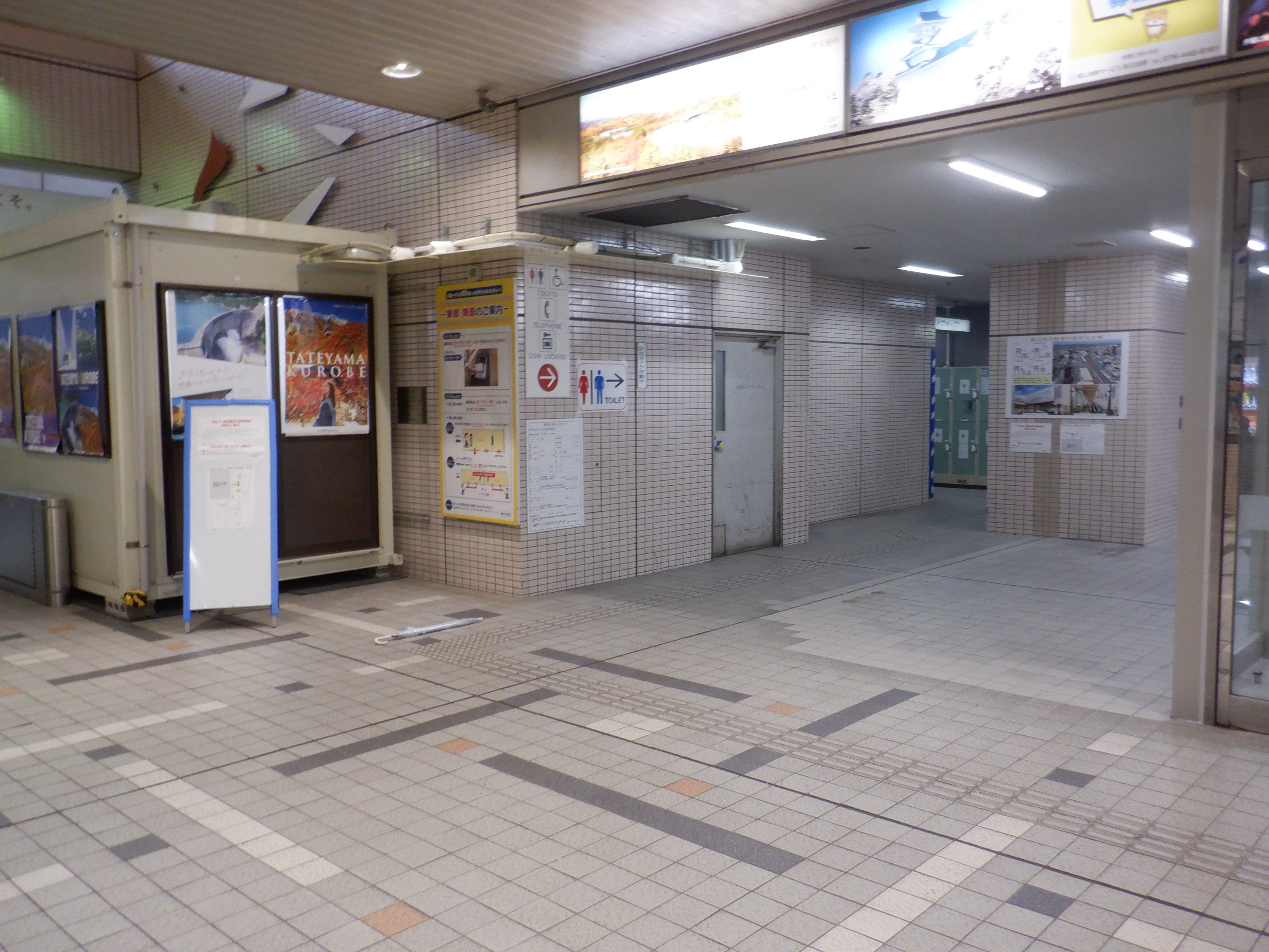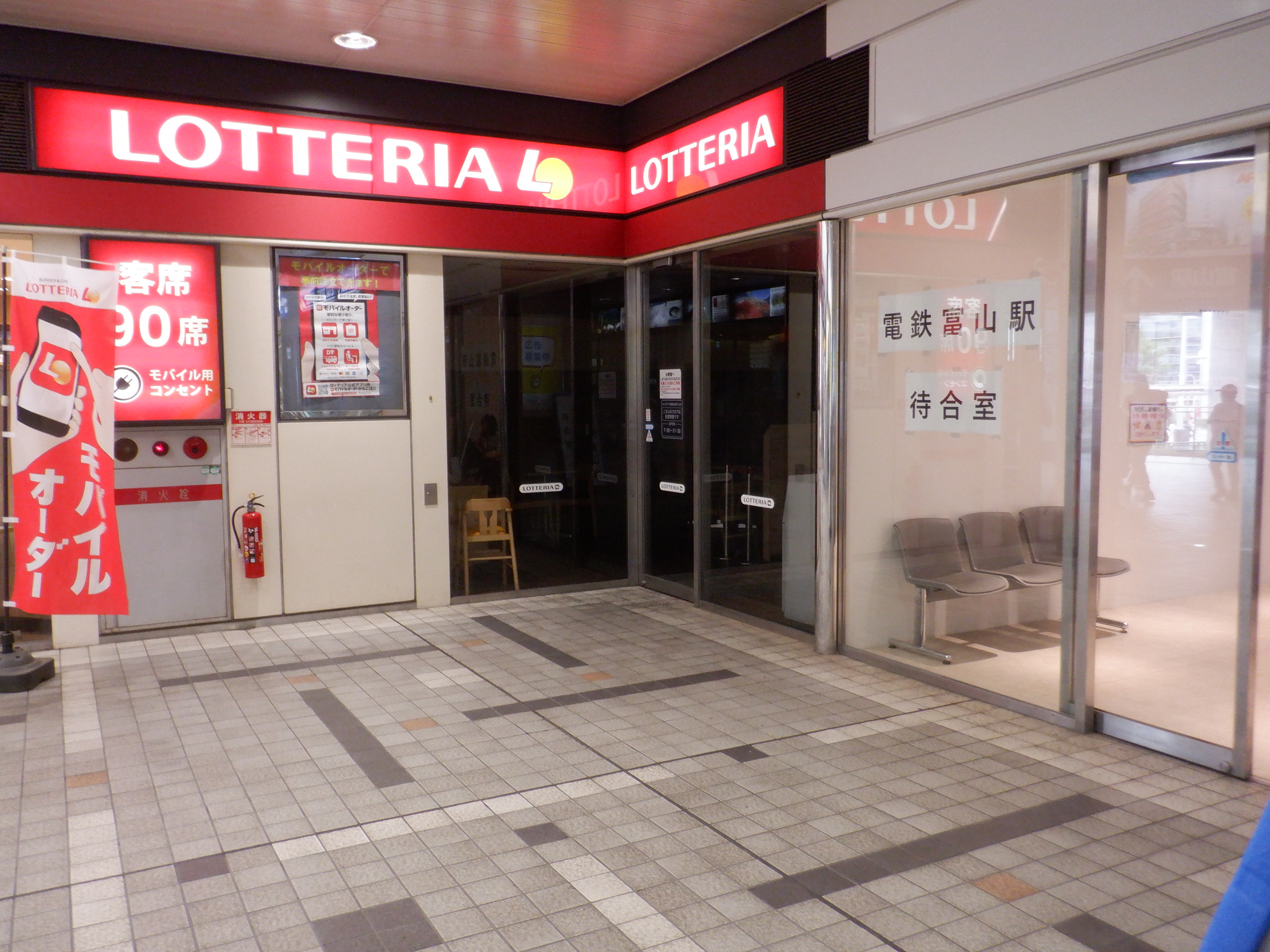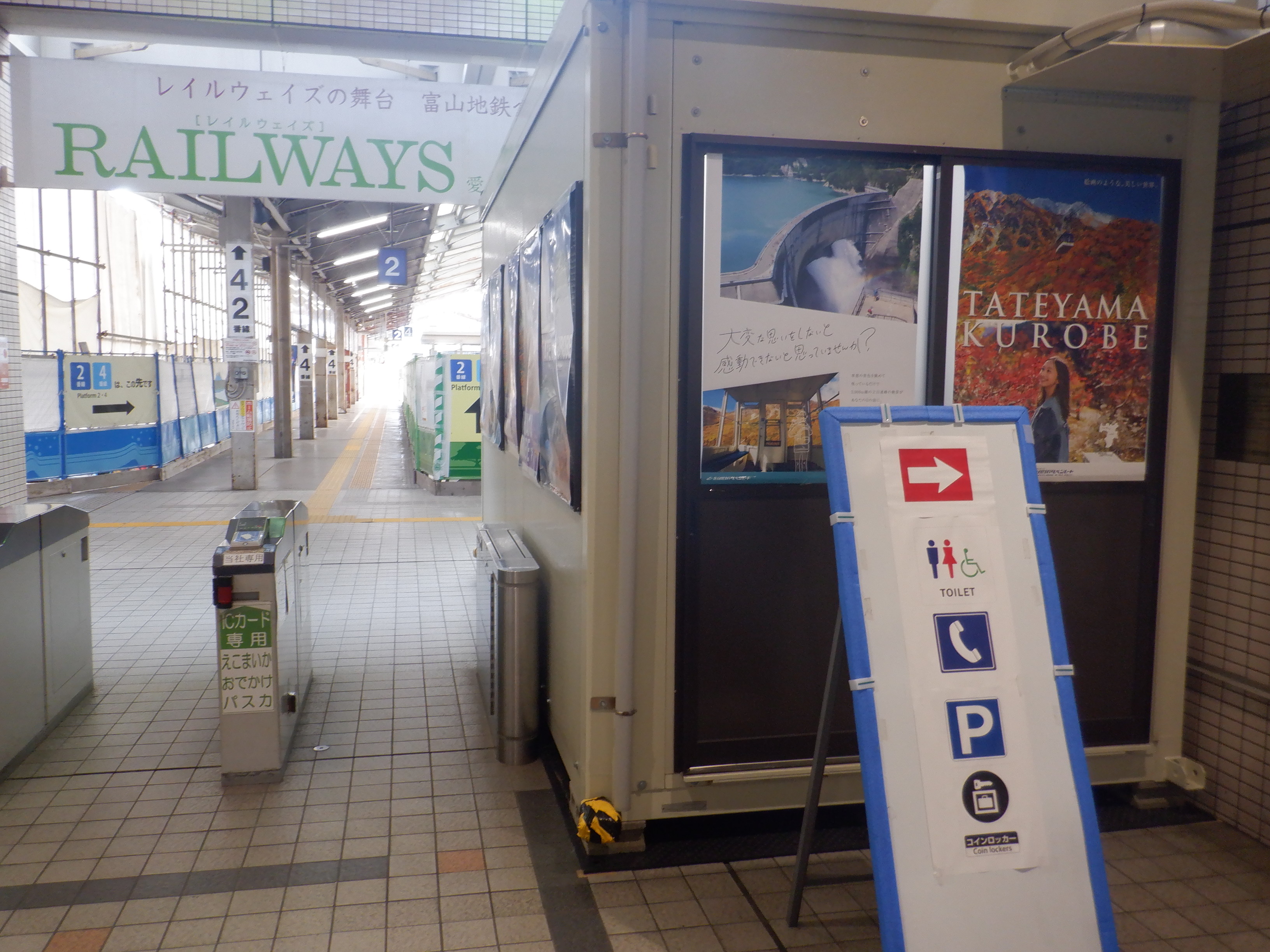 電鉄富山駅に入ってすぐのところの店舗跡が待合室になる旨の案内が貼られていました。