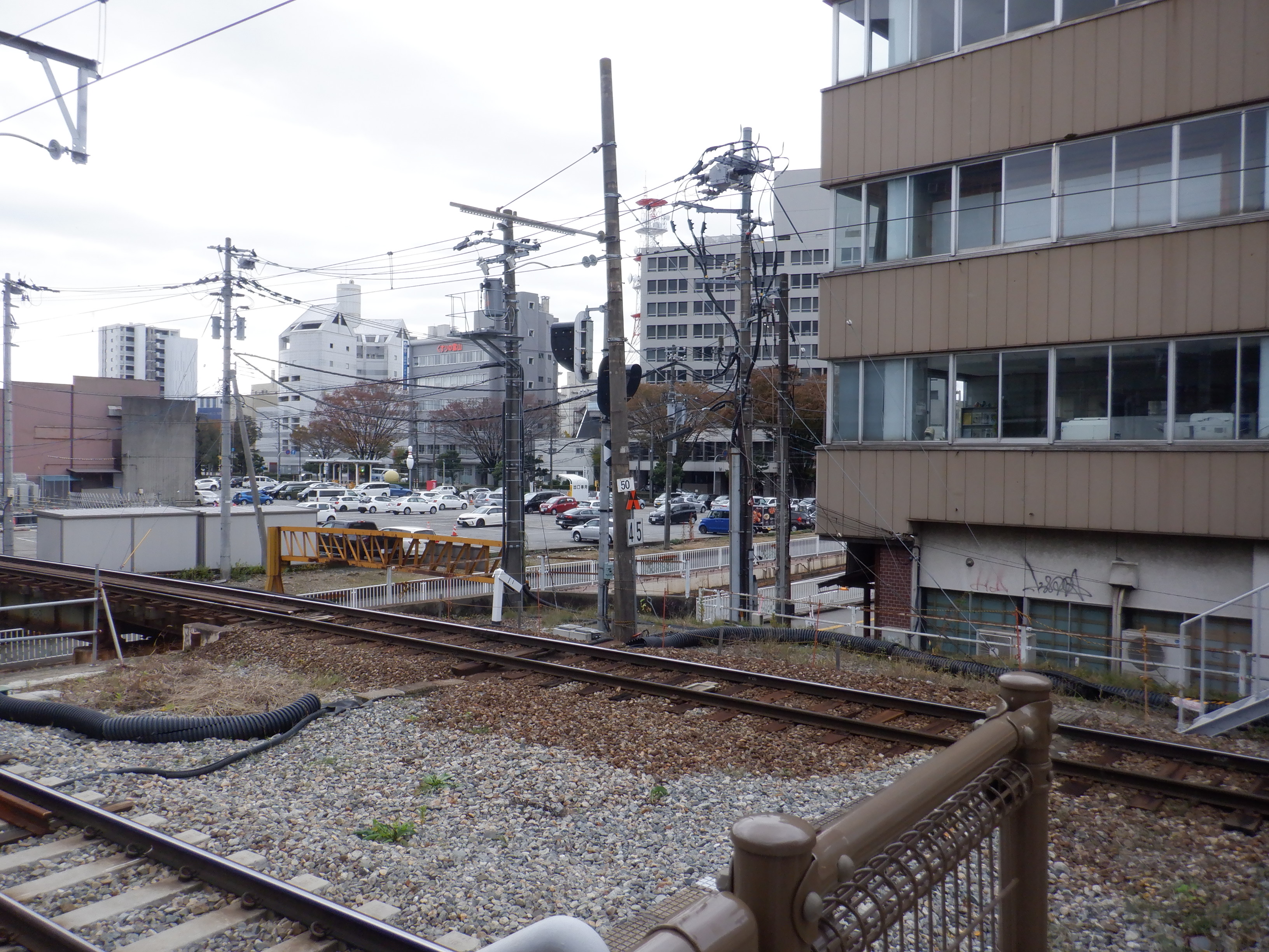 各ホームの入口から改札口の方を見る形でかつての線路跡。