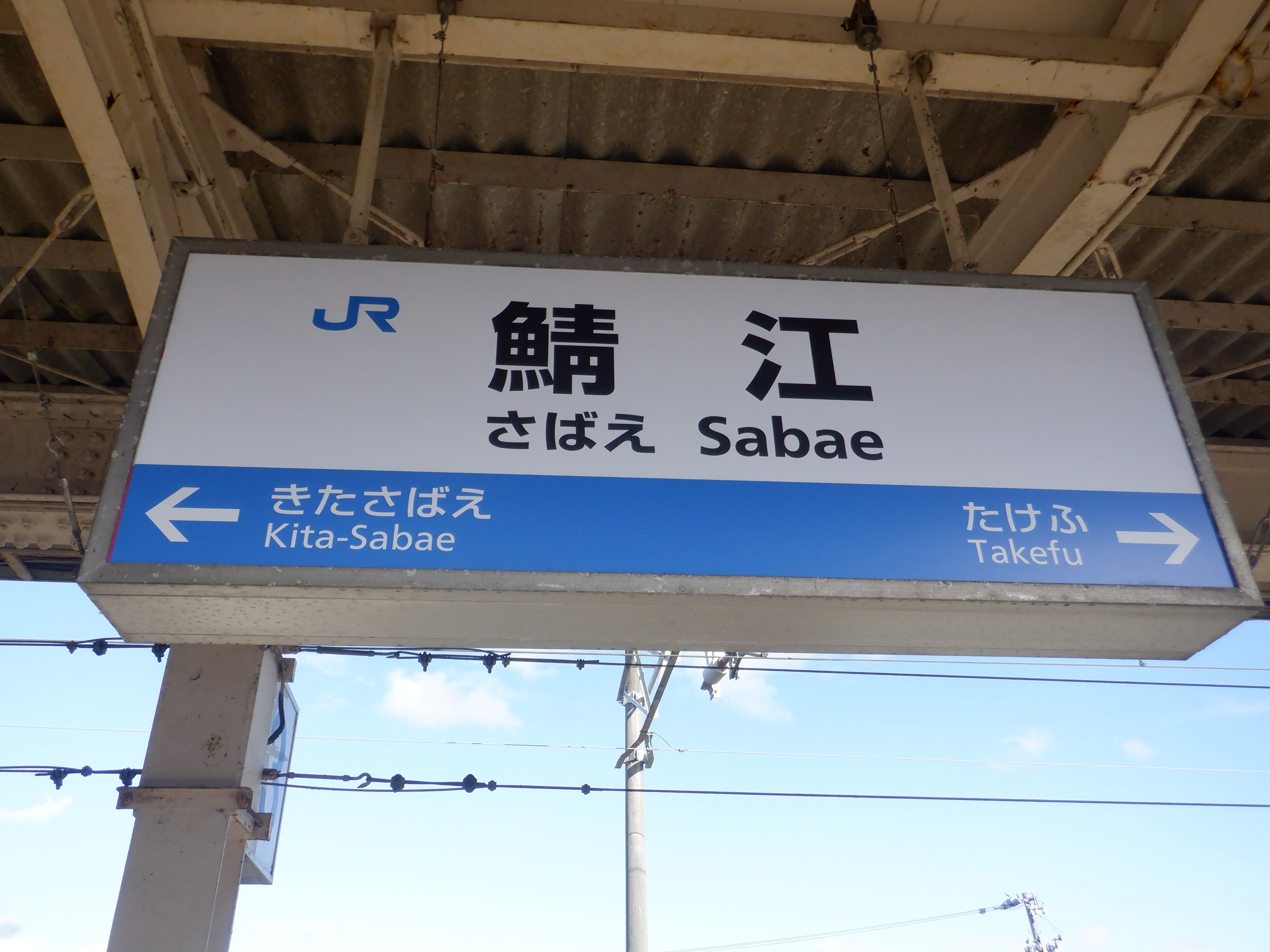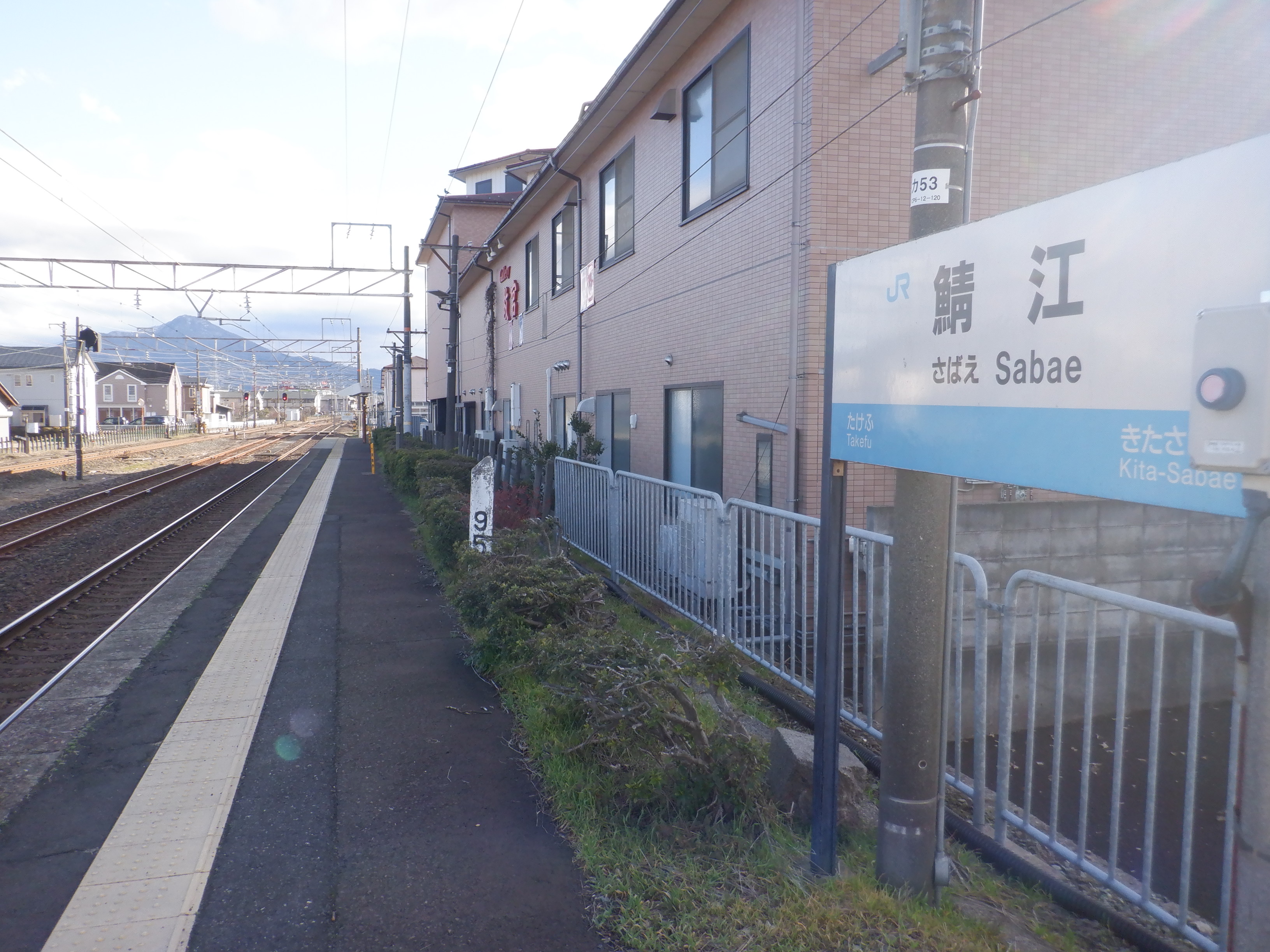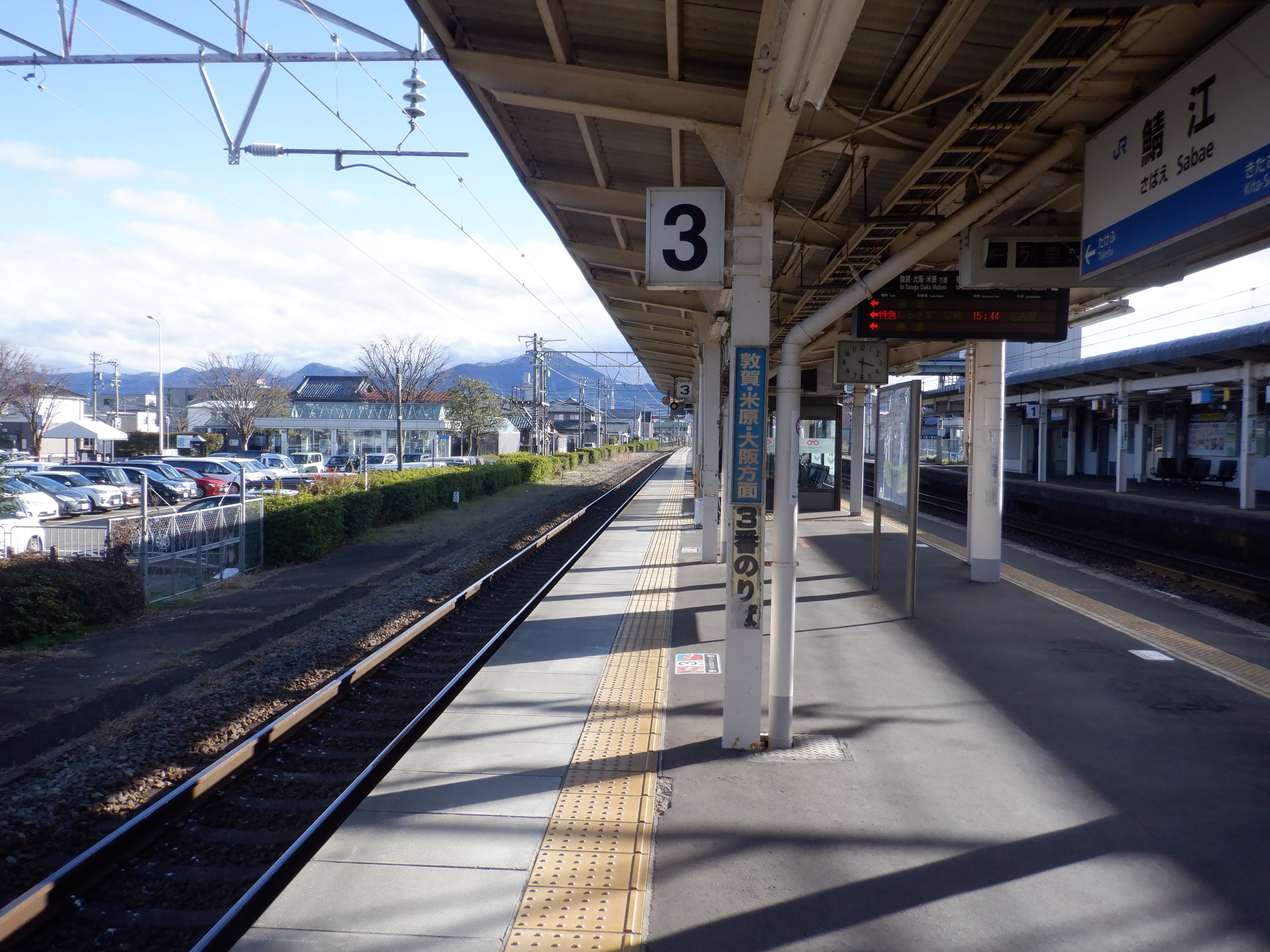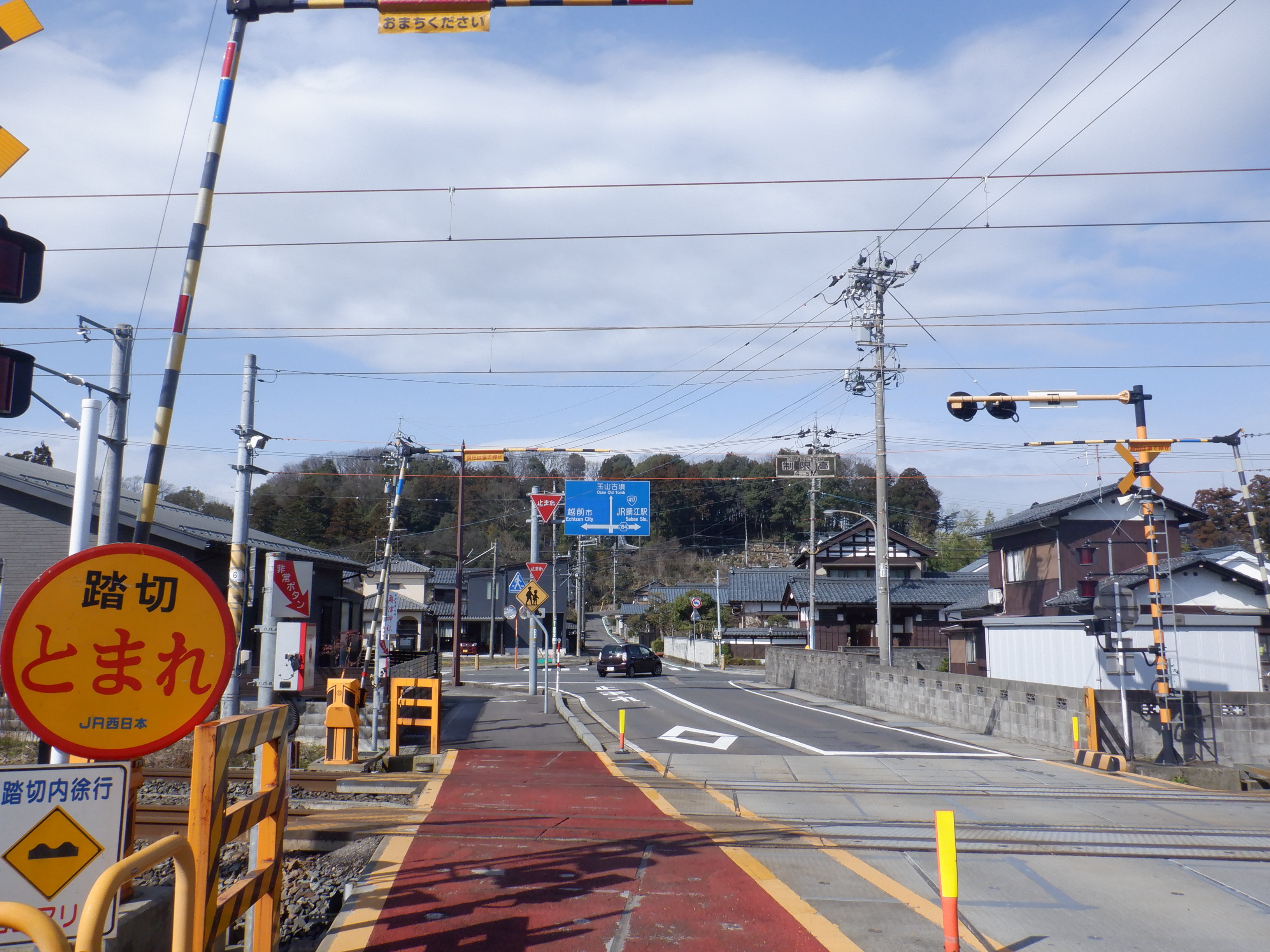 武生駅側の踏切近くから。JR鯖江駅の案内になっています。