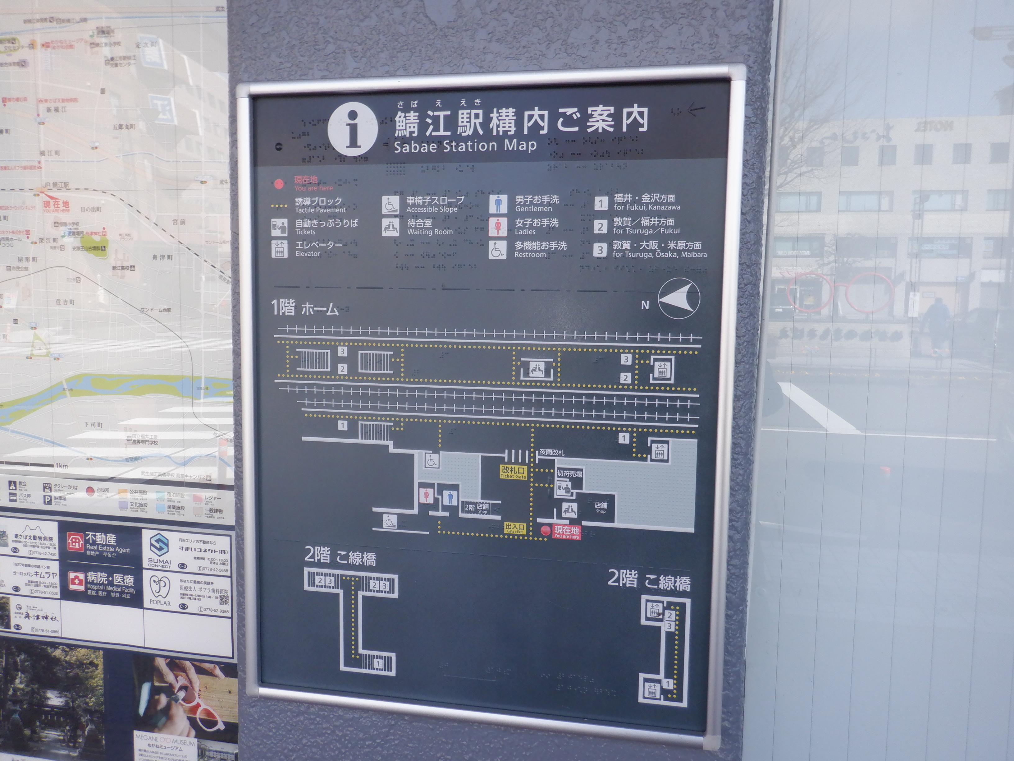 駅舎から出たところのトイレ等への案内看板。