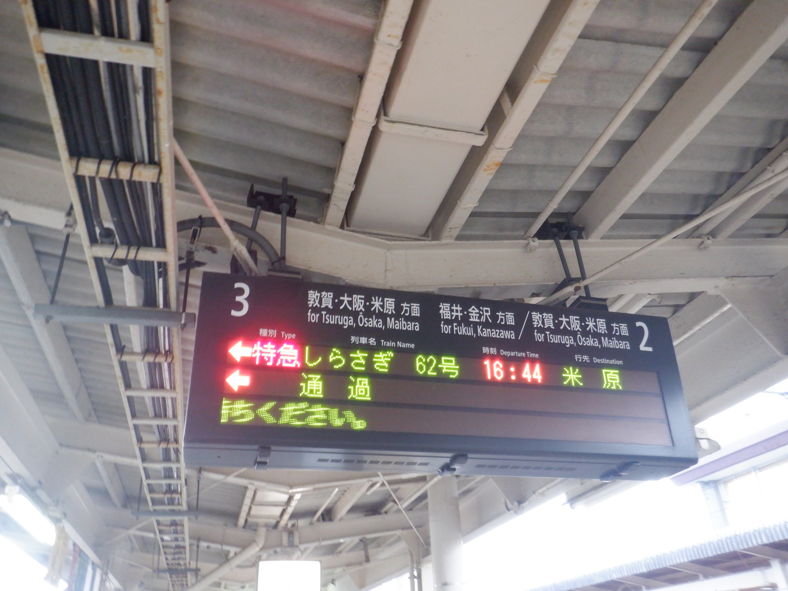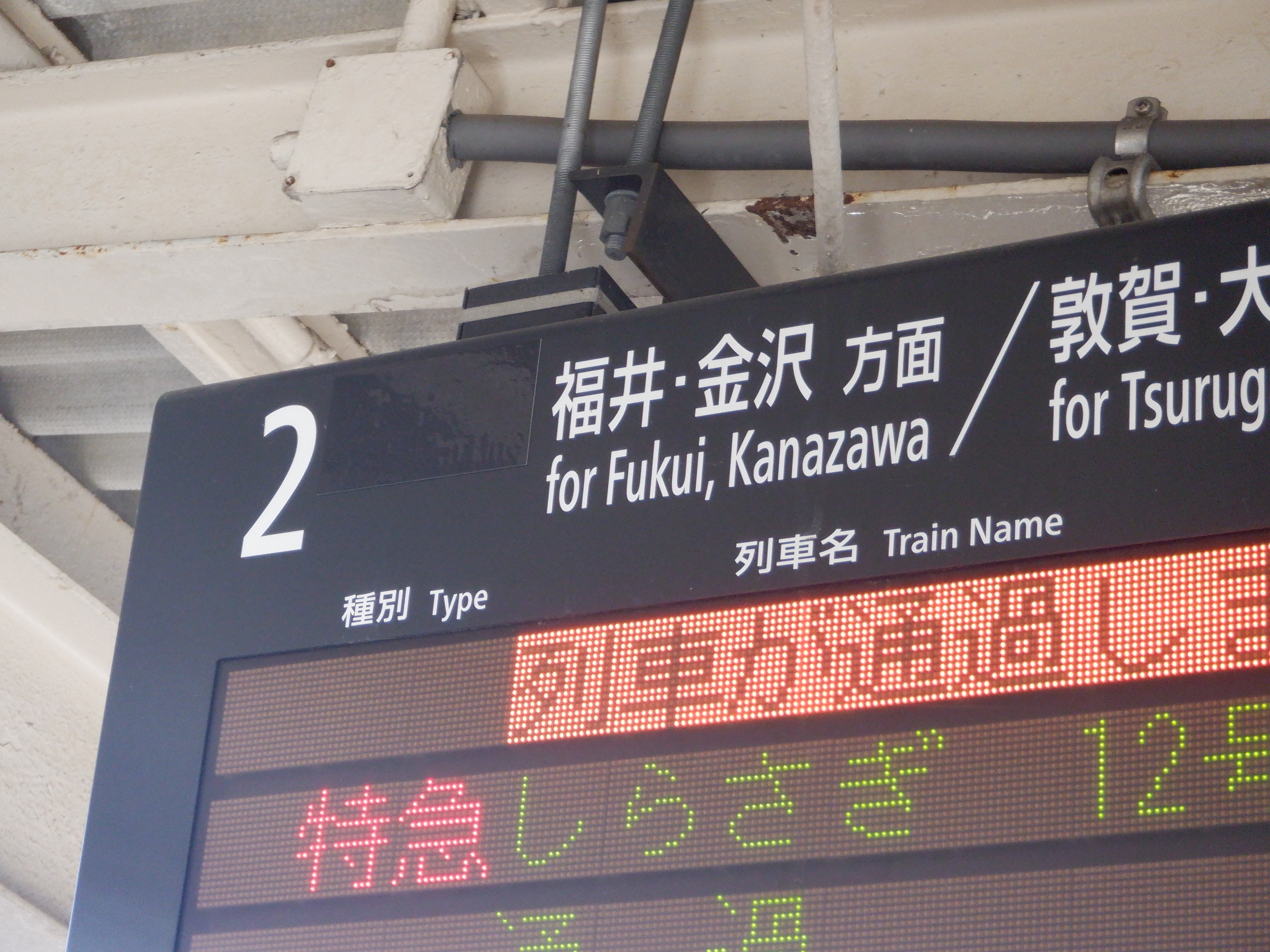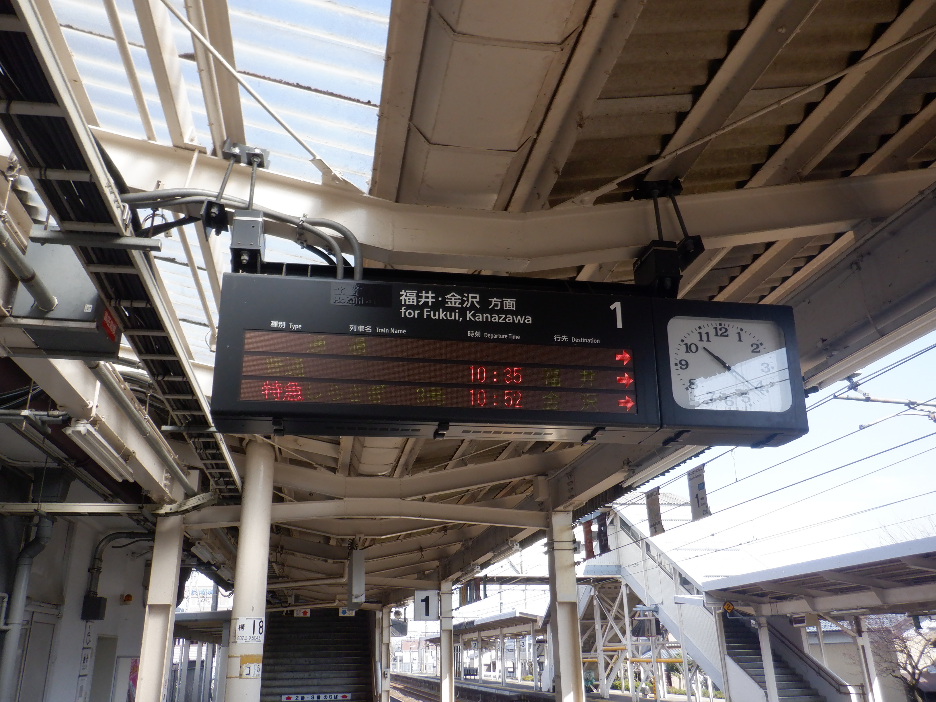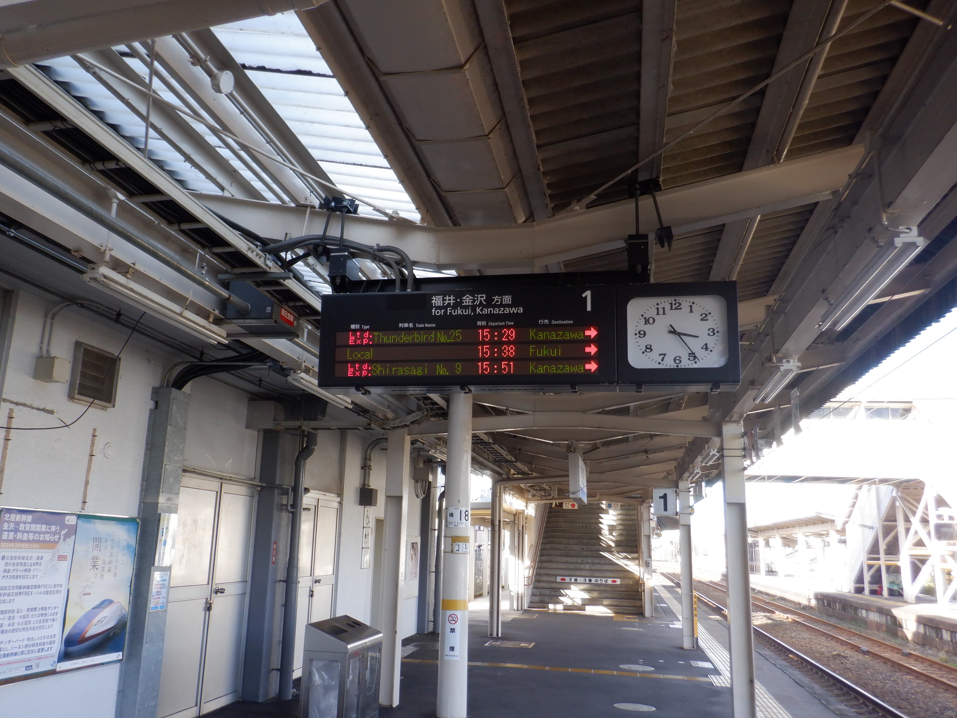 この時点で建植式の駅名標は特に変化がありませんでしたが、吊下式の駅名標はハピラインふくいの駅名標の上に仮のJR駅名標が貼られた状態になっていました。また、発車標も「北陸線」の部分が隠されていました。時間の関係で改札内のみとなりました。