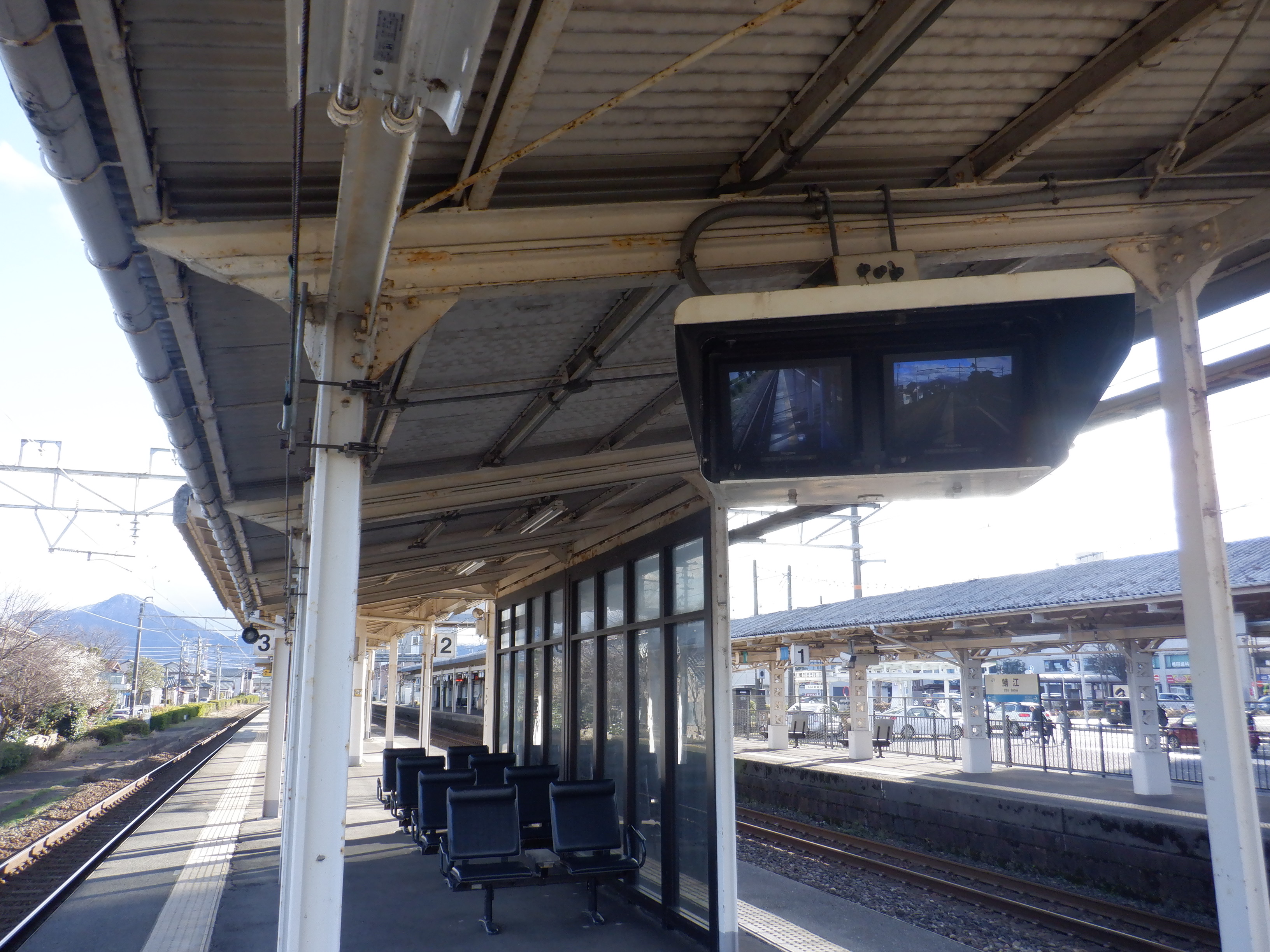 鯖江駅の2024年2月と3月の移管前の様子です。この時期になると駅名標や発車標に変化が出てきました。