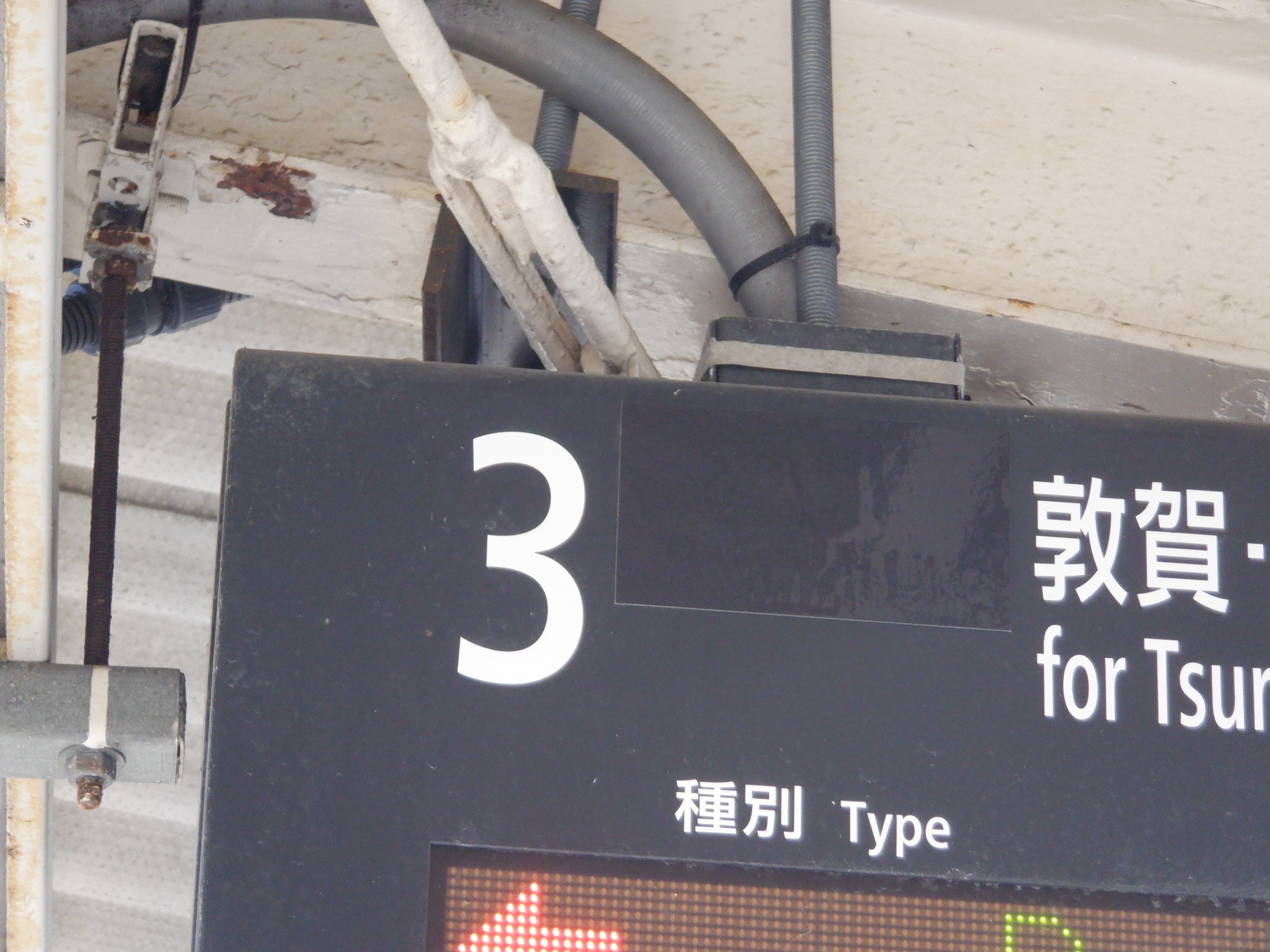 跨線橋の特急列車の乗車位置案内。この時点で電球が抜かれていました。