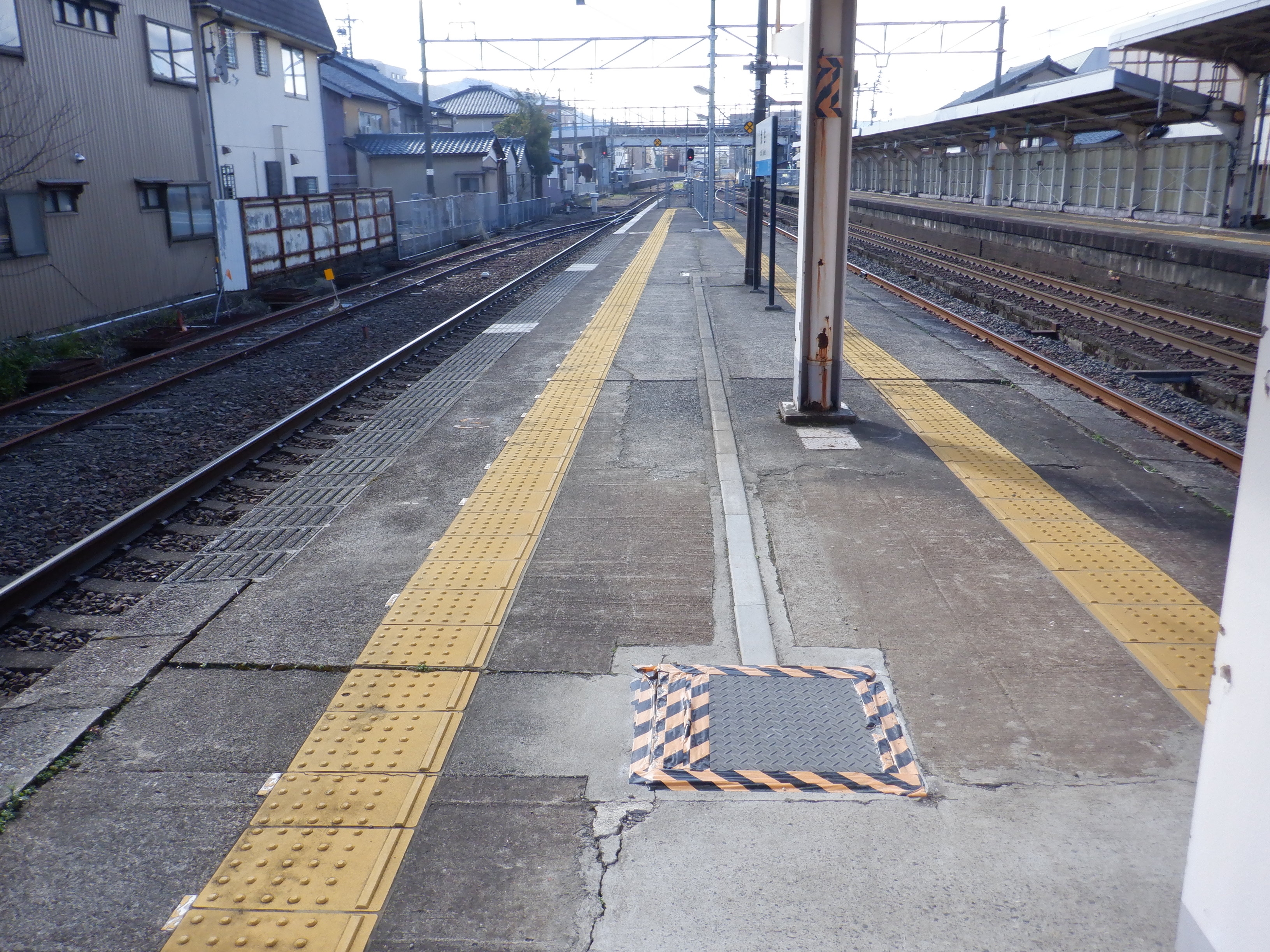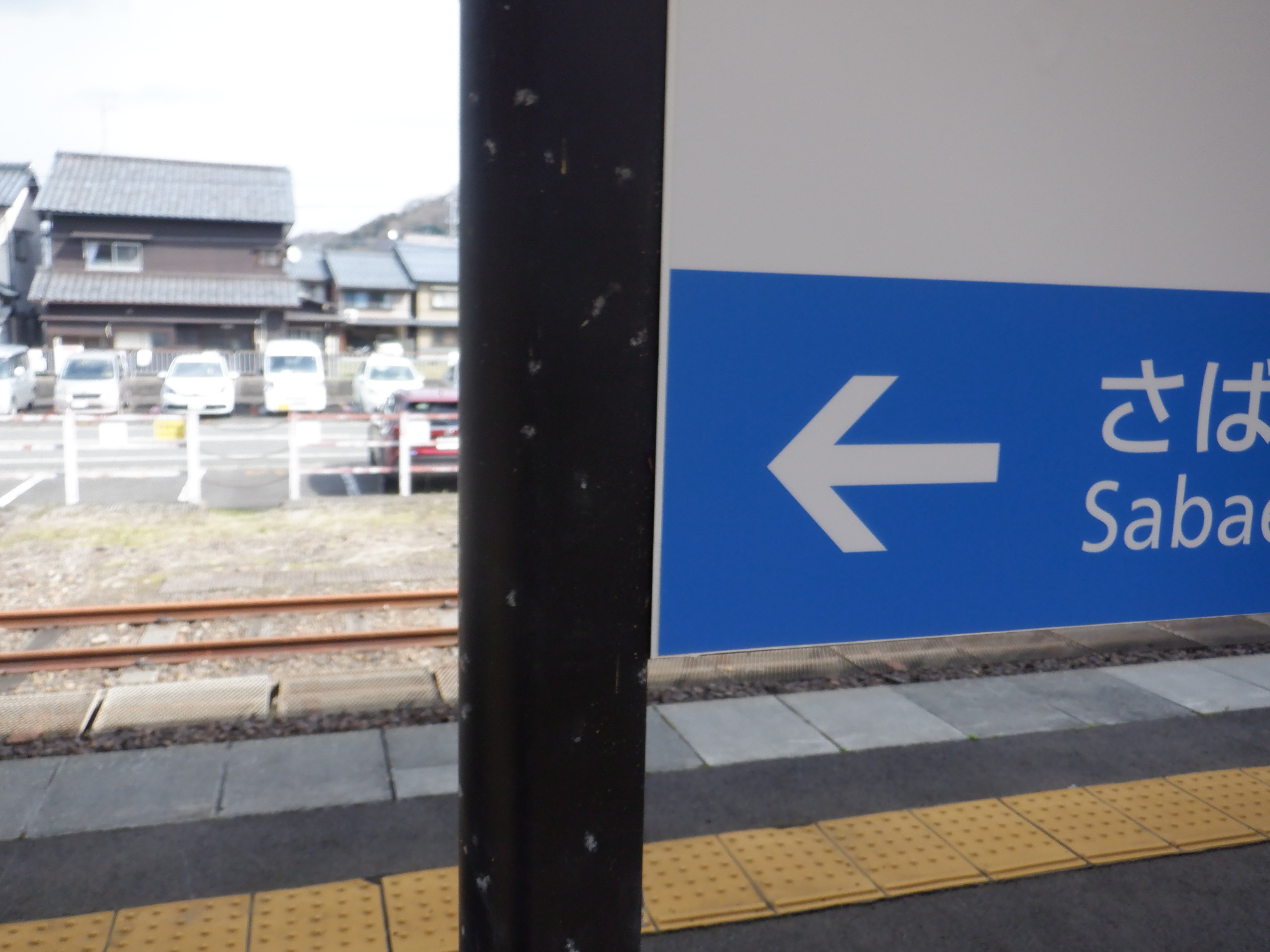 2・3番のりば鯖江駅側の駅名標。白い板の上に仮のJR駅名標が貼られた状態です。