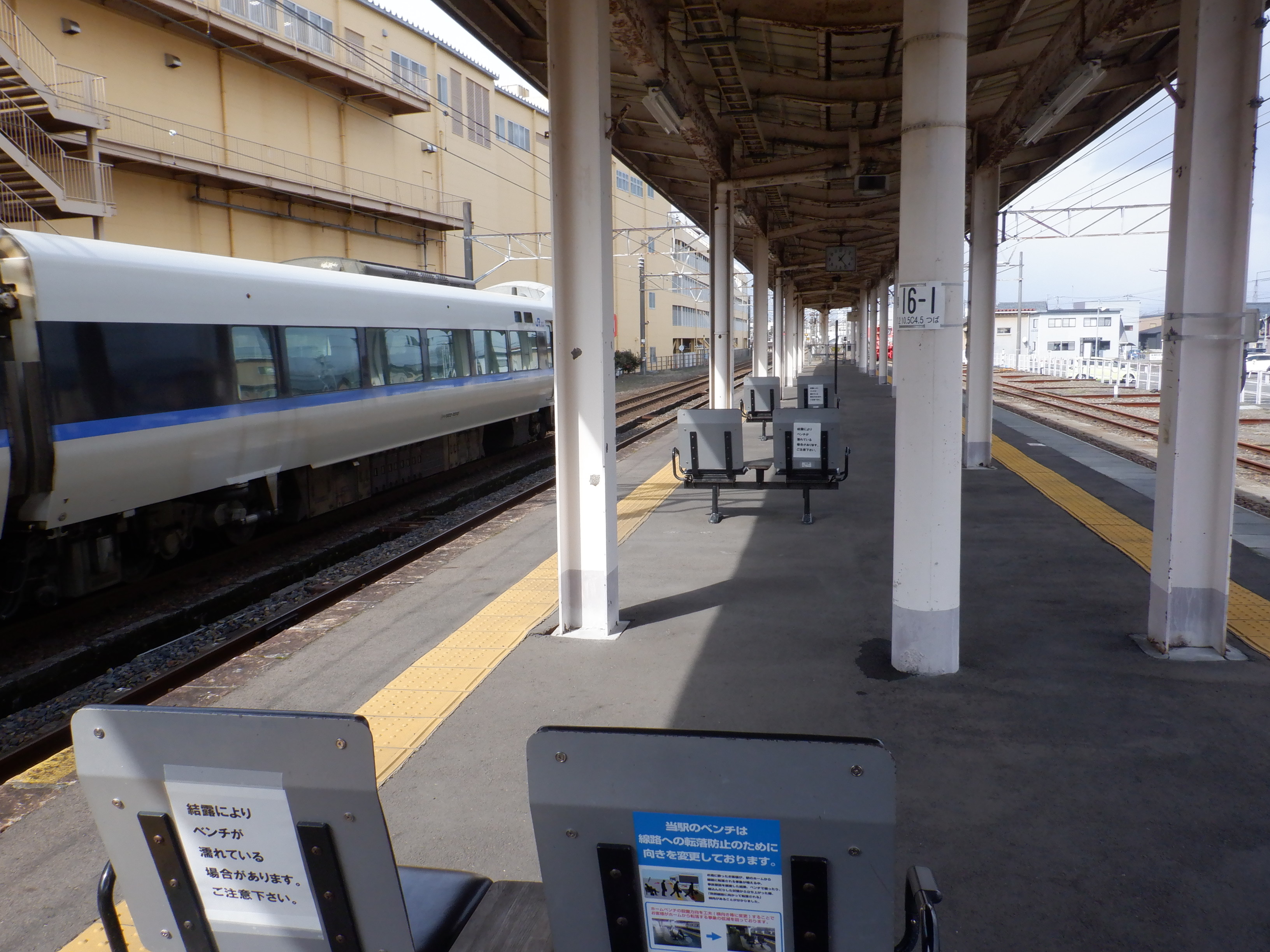 1番のりばの駅舎に付いている駅名標。こちらもハピラインふくいの駅名標の上に仮のJR駅名標が貼られています。