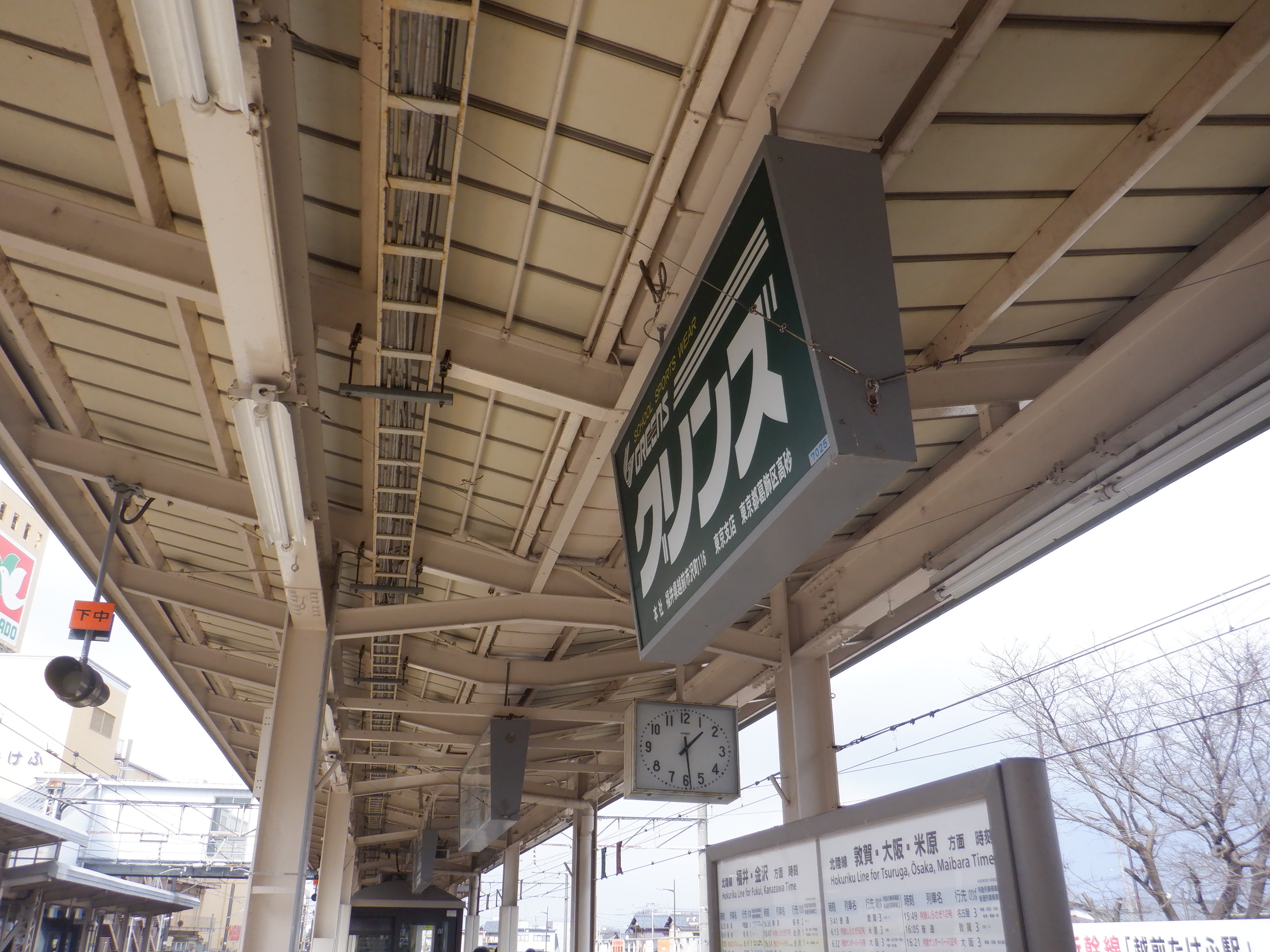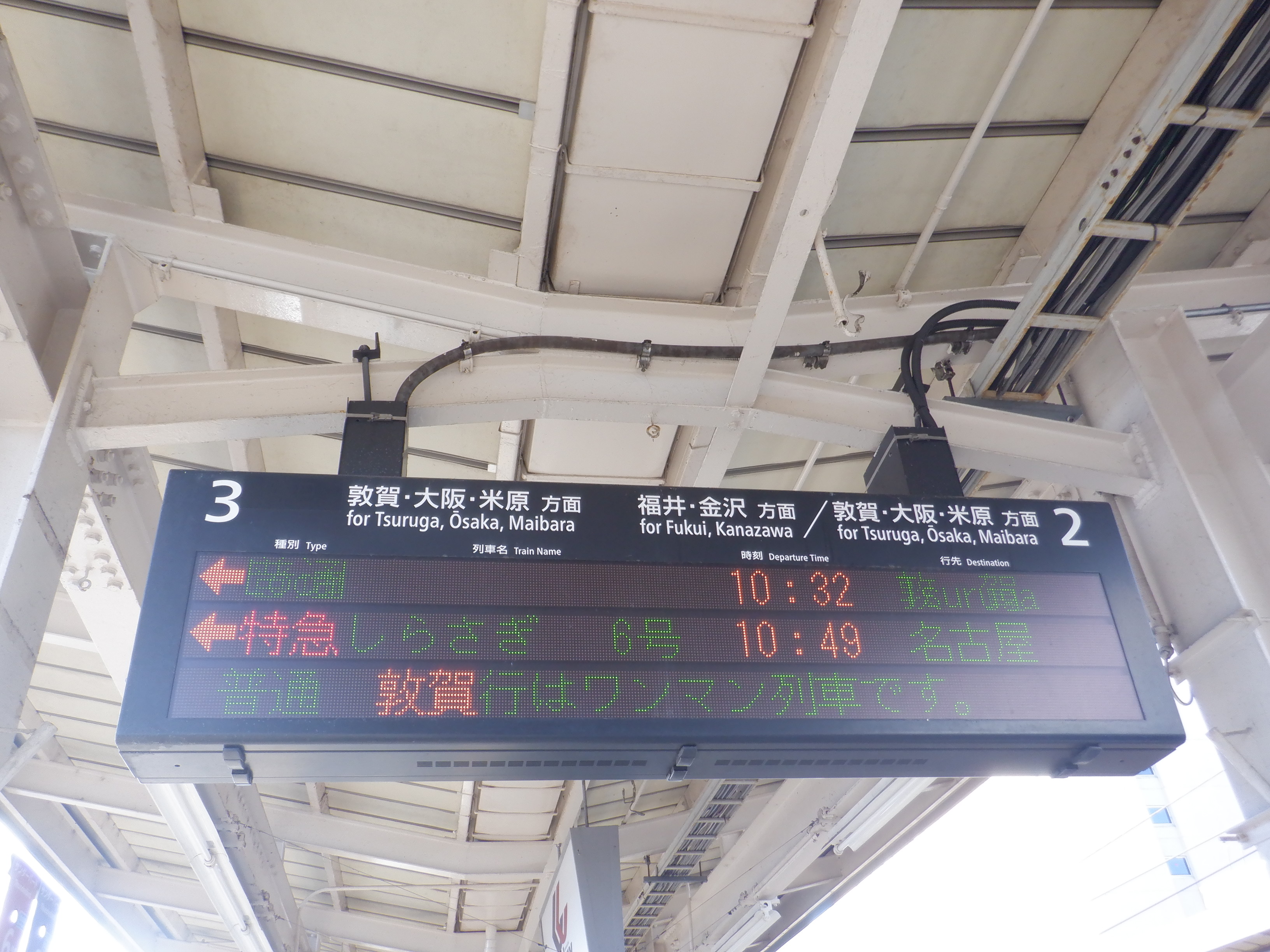 2・3番のりば上屋付近の吊り下げ式駅名標。ハピラインふくいの駅名標の上に仮のJR駅名標が貼られています。