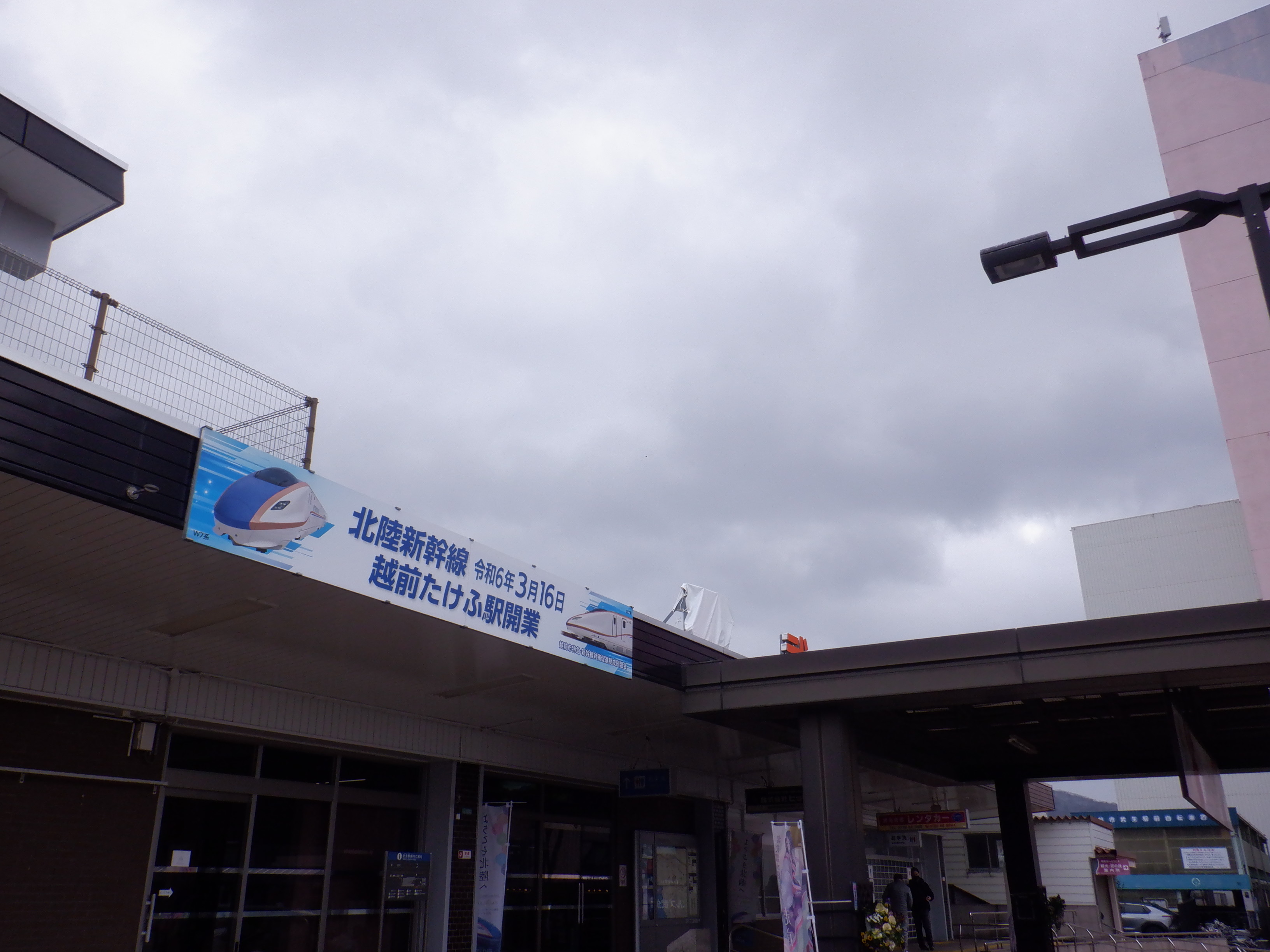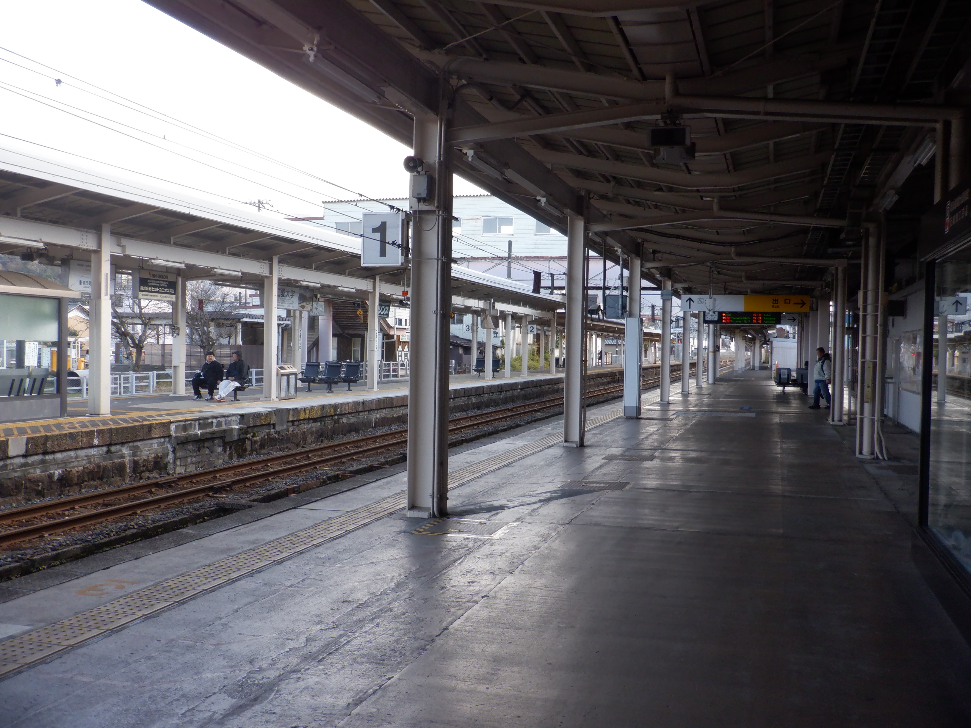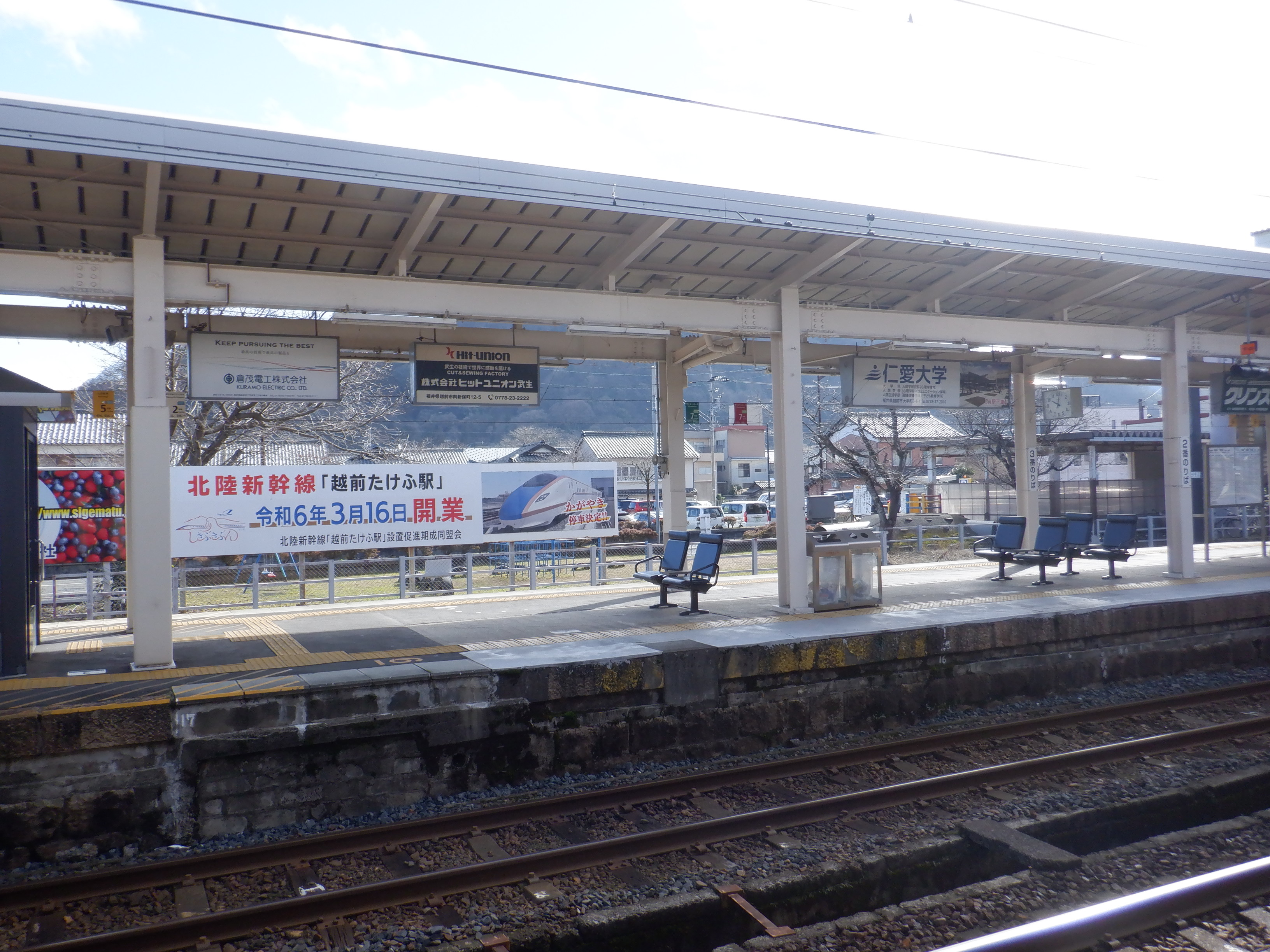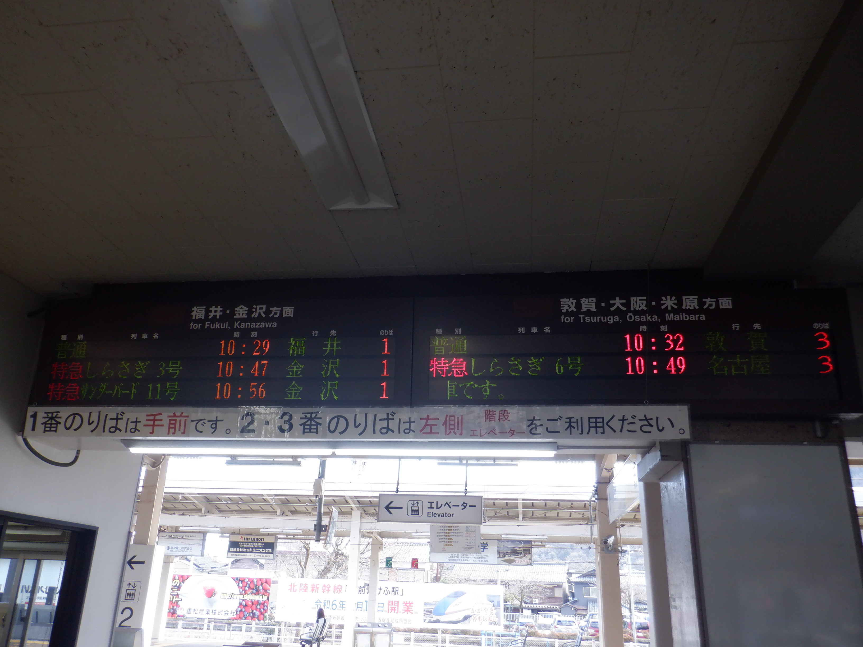武生駅の2024年2月〜3月の移管前の様子です。駅名標等が他の駅同様、ハピラインふくいの駅名標の上に仮のJR駅名標が貼られるなどの様子が見られました。