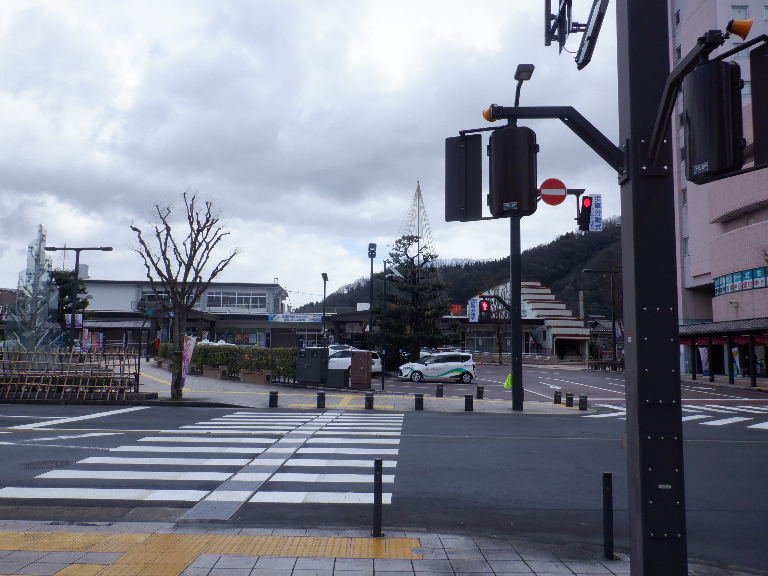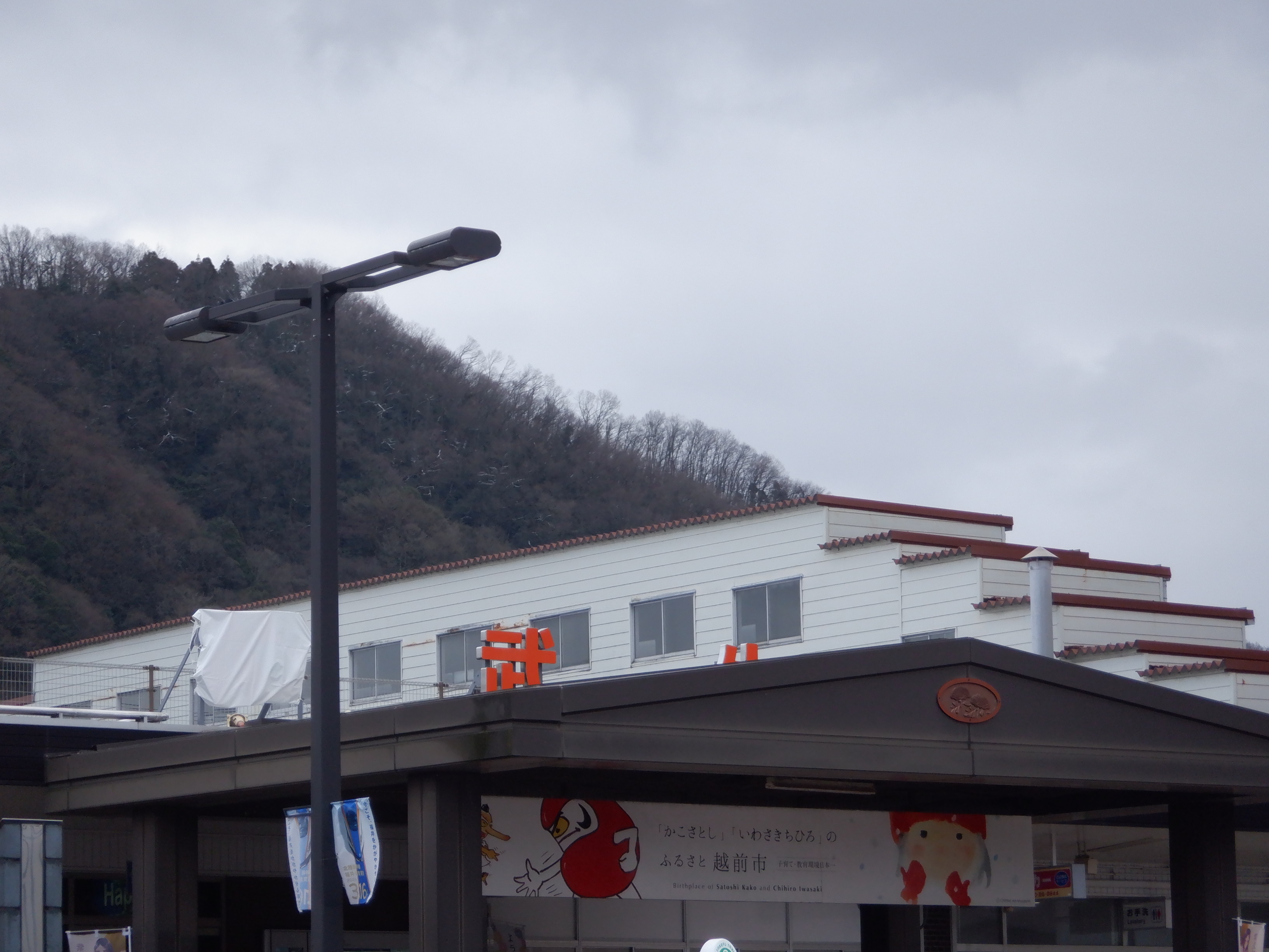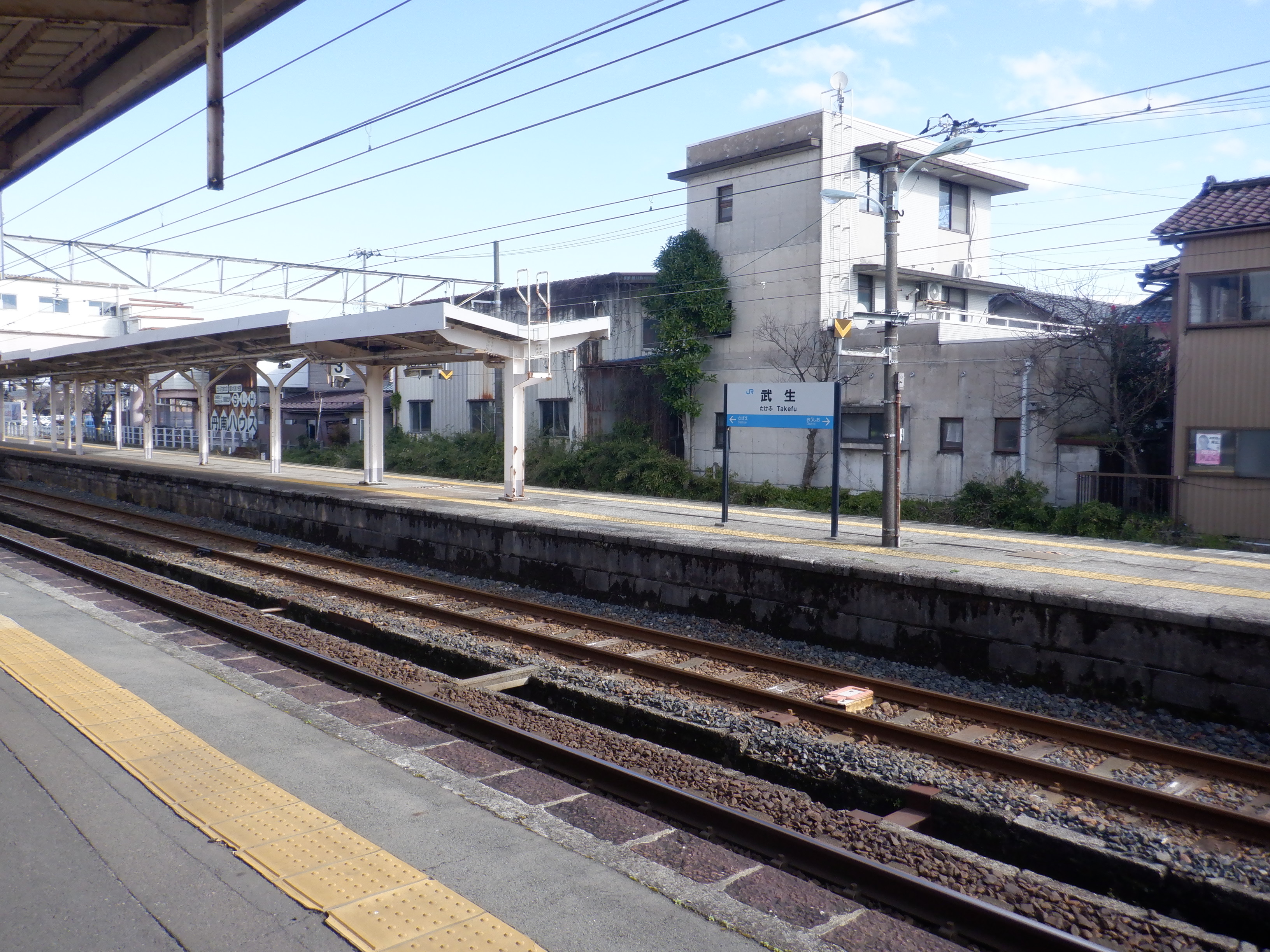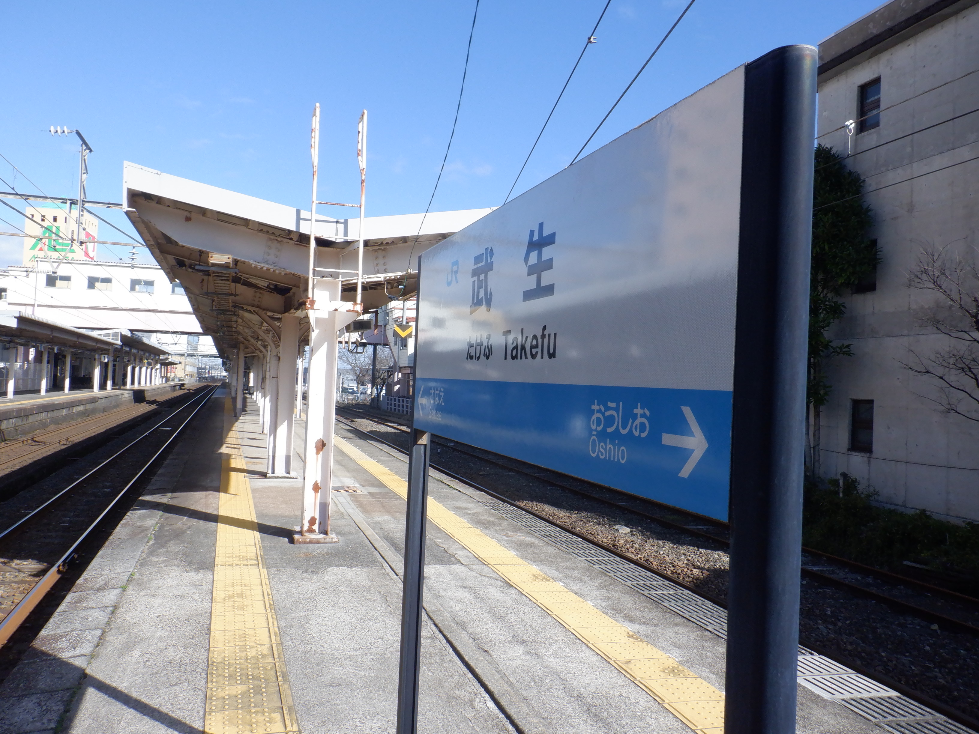 武生駅の2024年2月〜3月の移管前の様子です。駅名標等が他の駅同様、ハピラインふくいの駅名標の上に仮のJR駅名標が貼られるなどの様子が見られました。