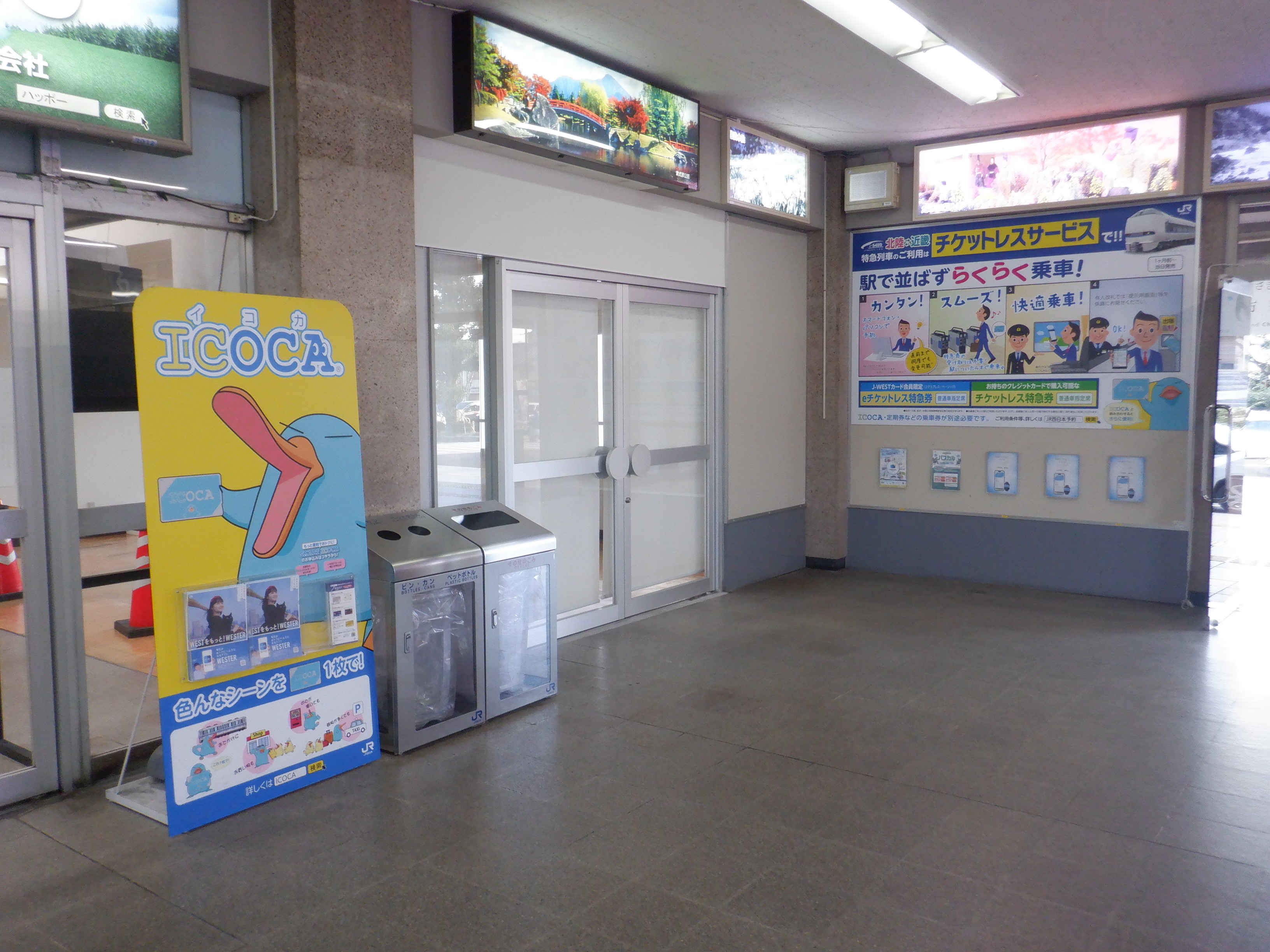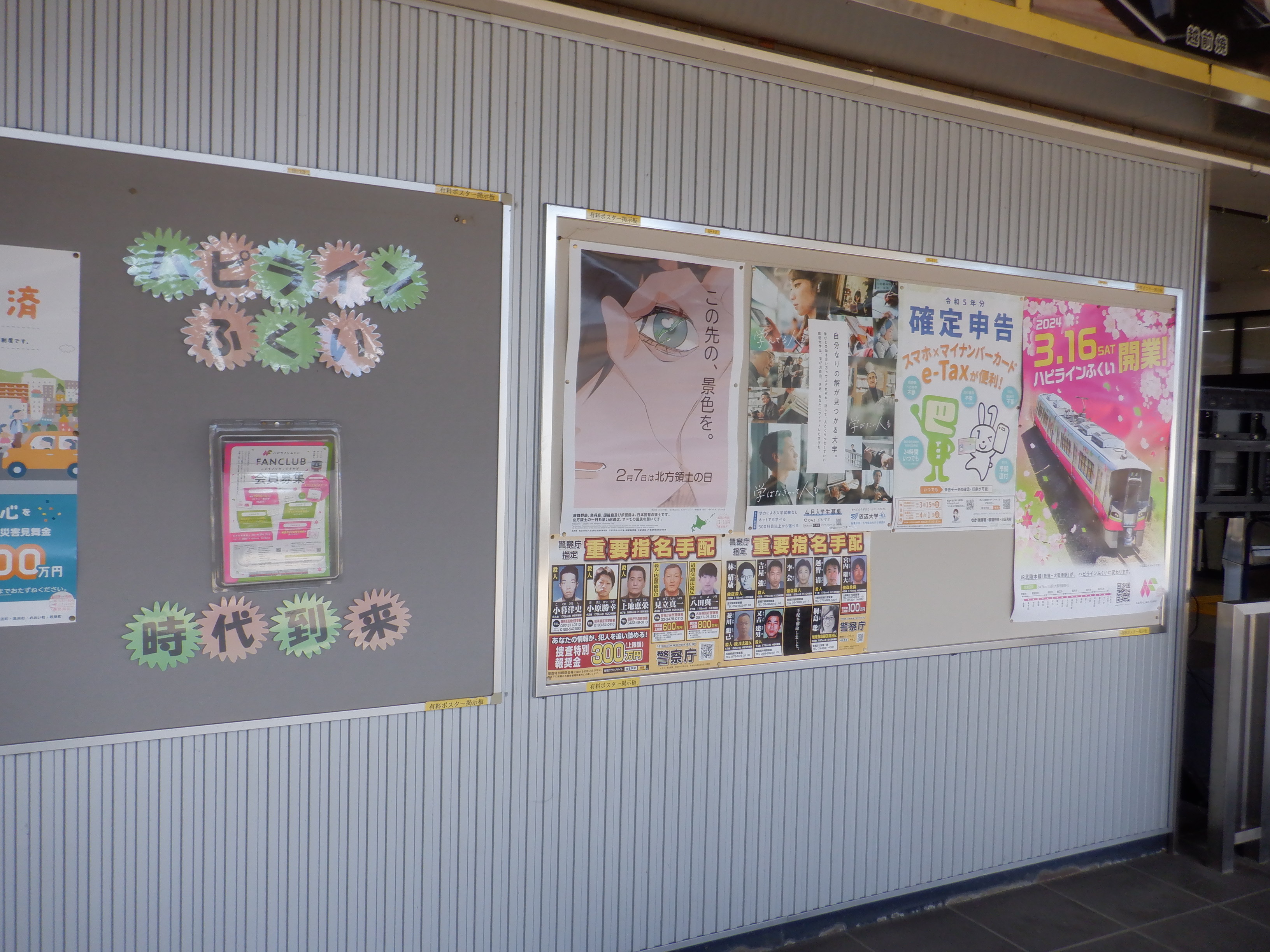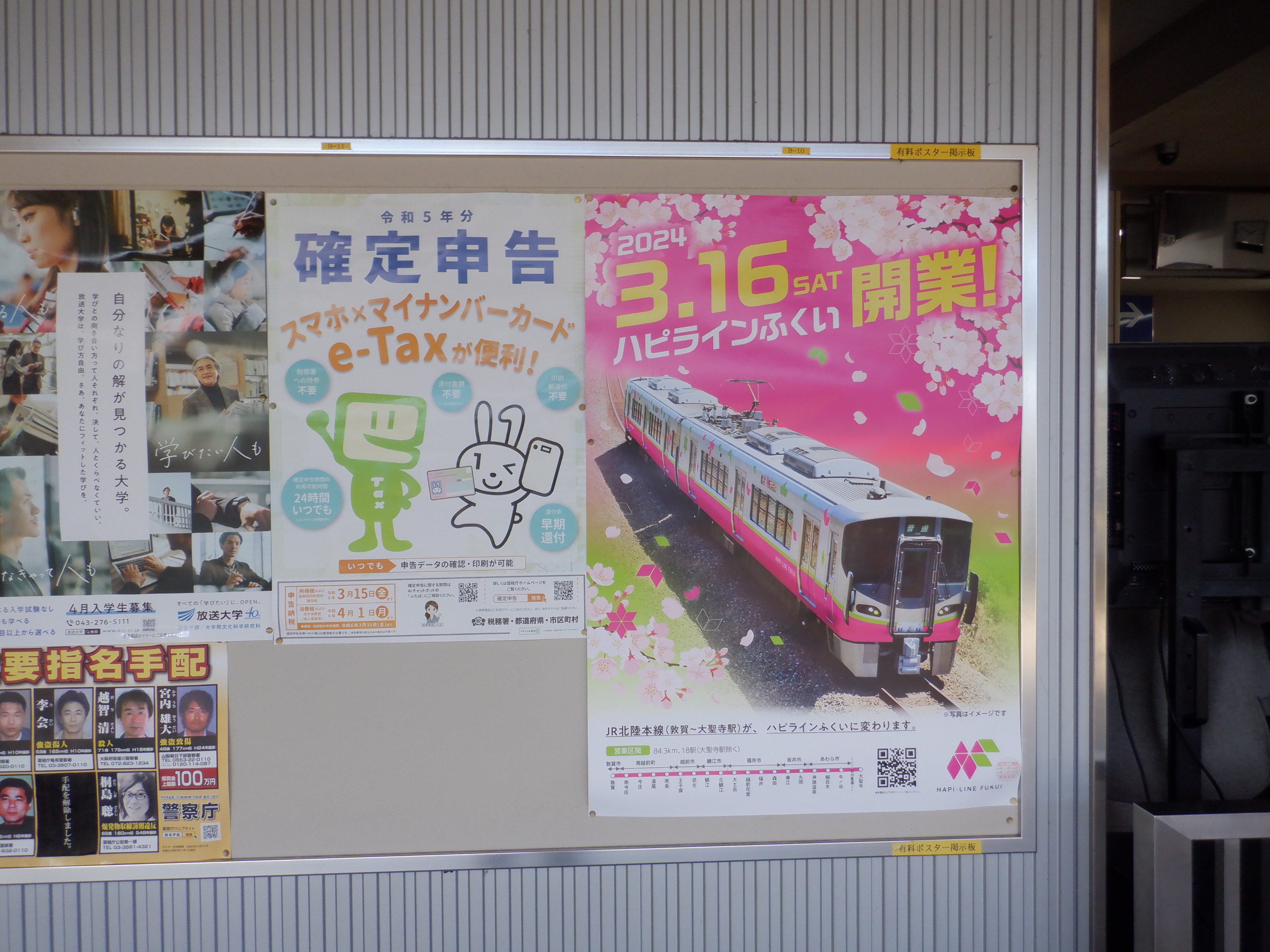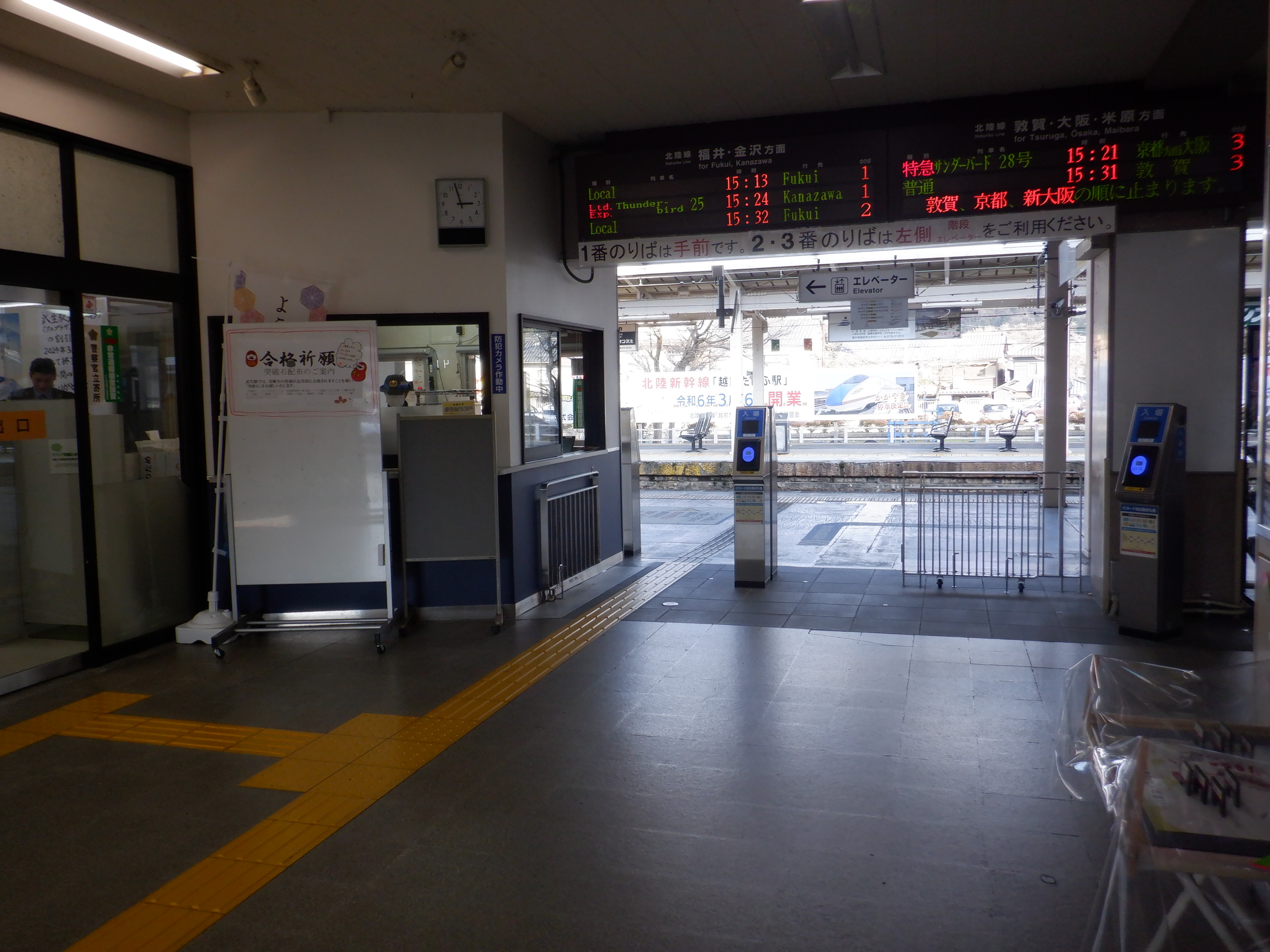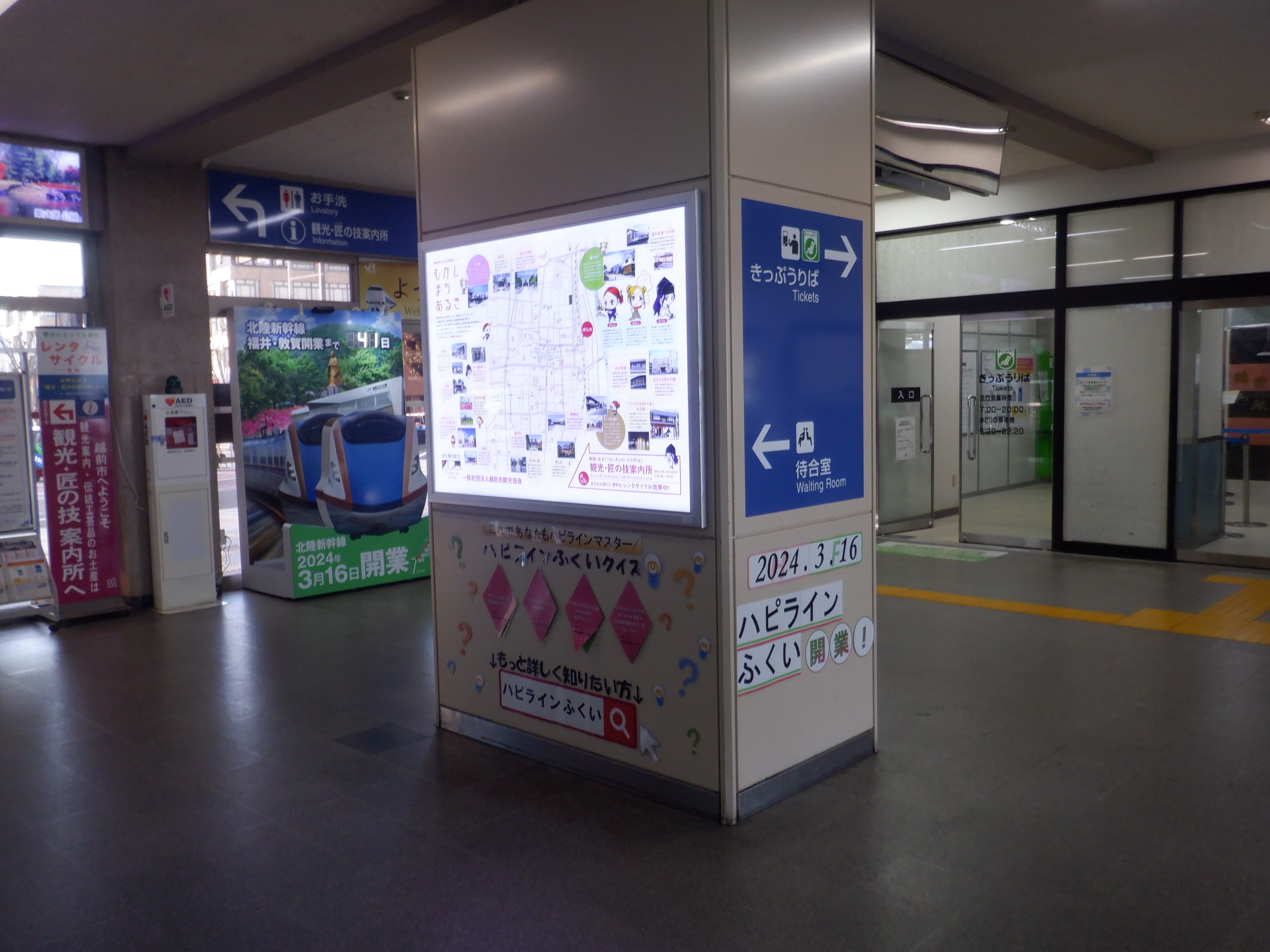 改札口横のハピラインふくいのポスターなど。