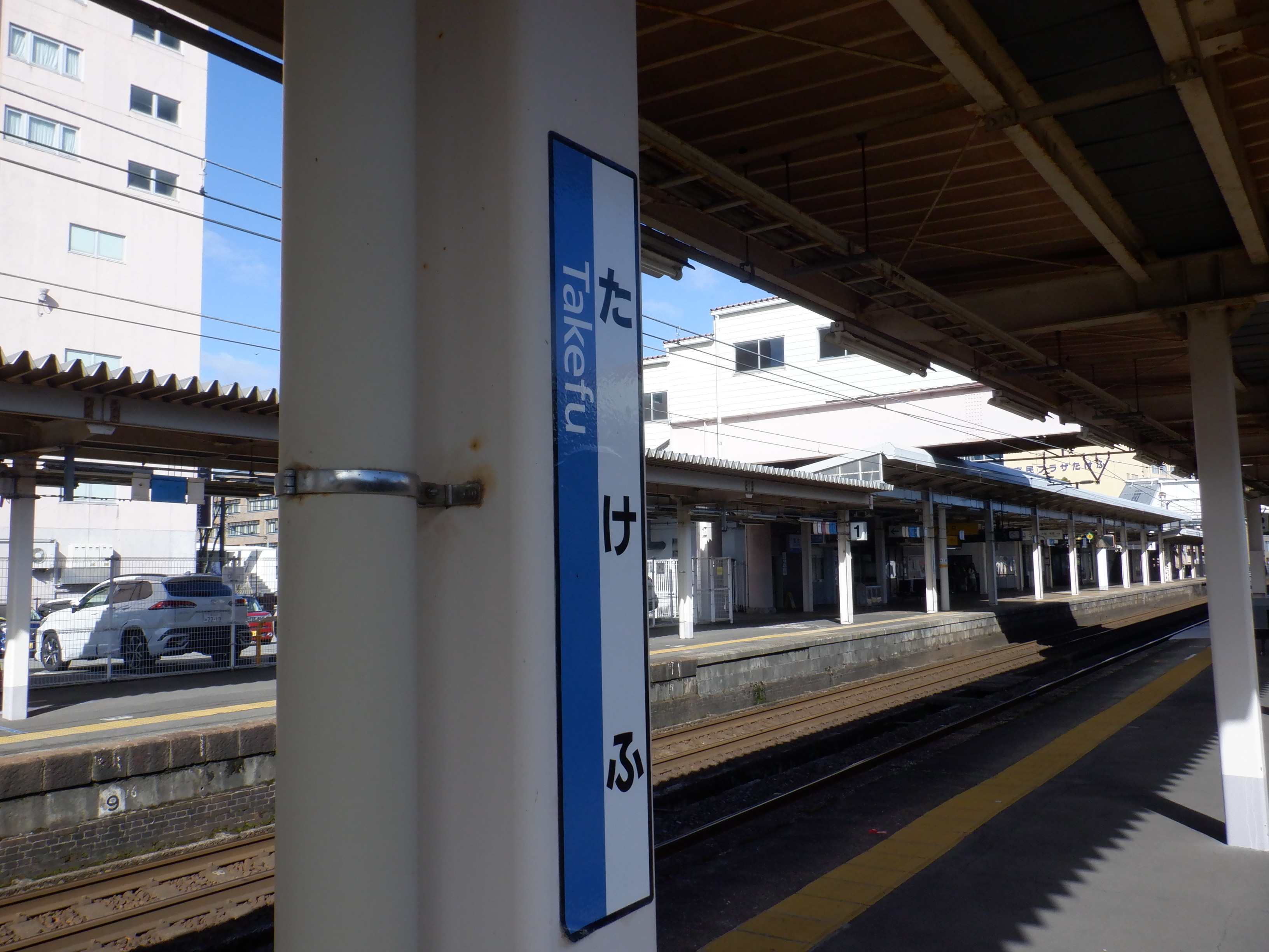 1番のりば駅舎に付いている駅名標。前回と比べて少し剥がれているようです。