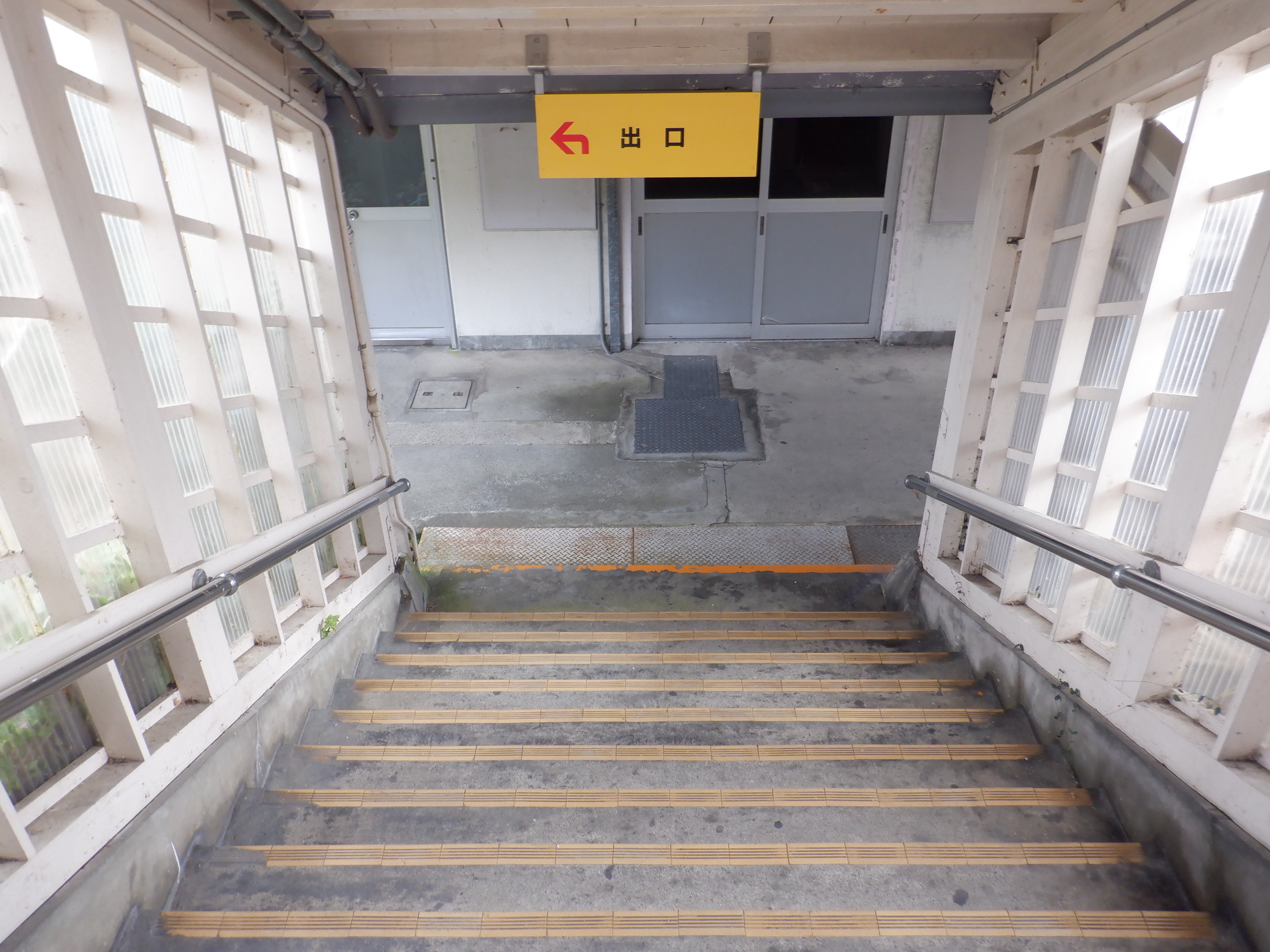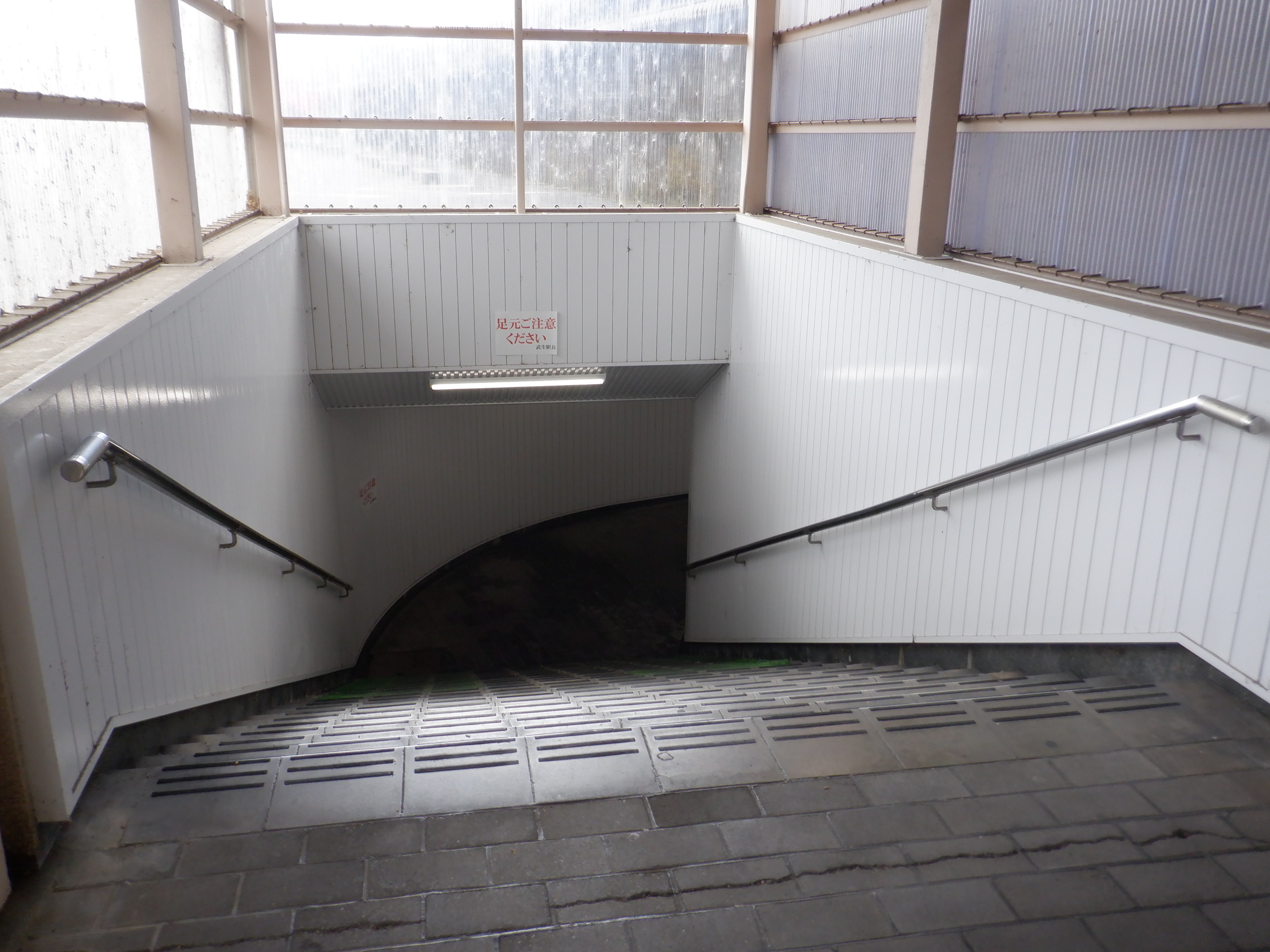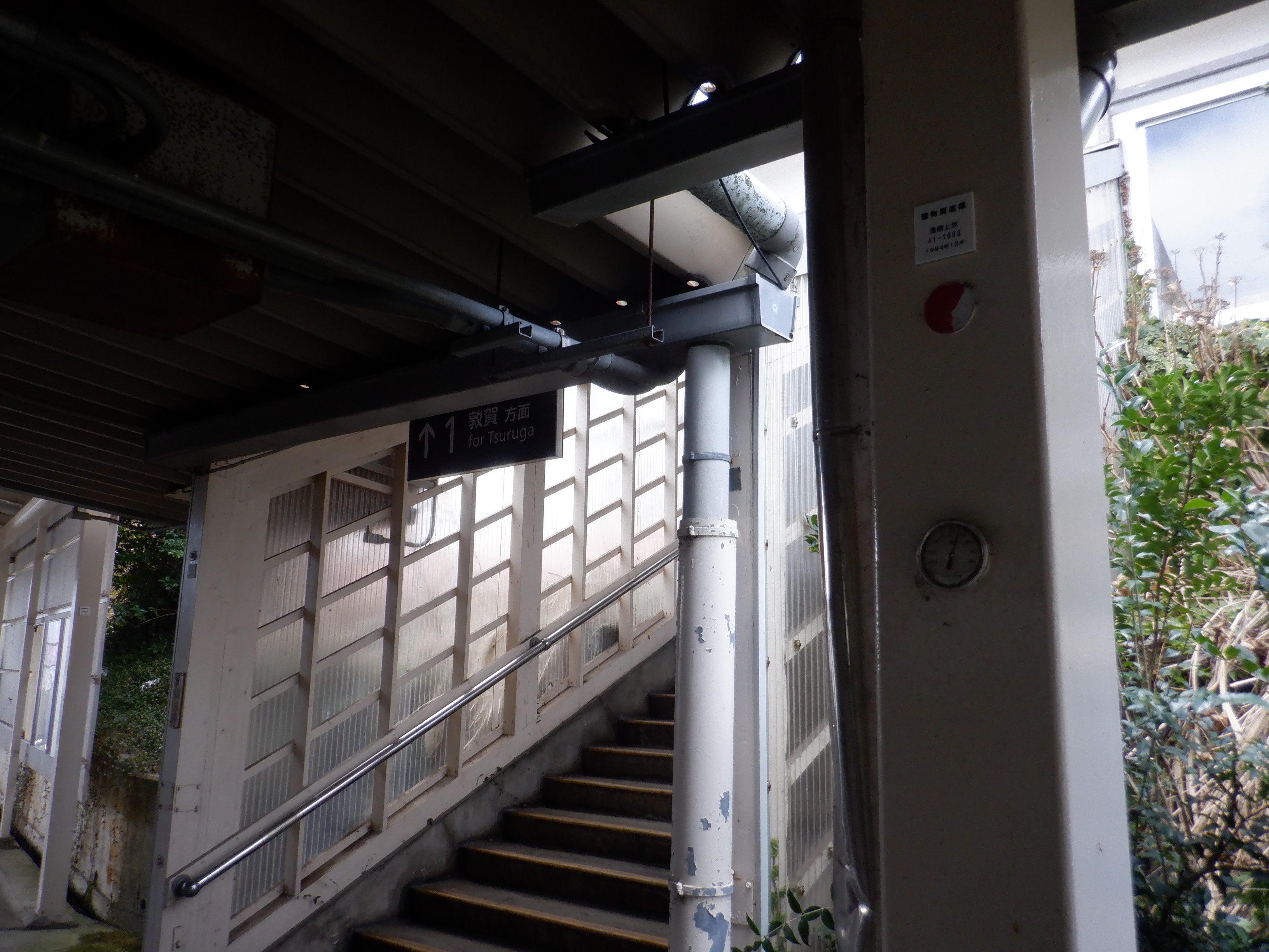 再び駅に入り、階段の横、通路上屋の資産標とそこにある温度計。